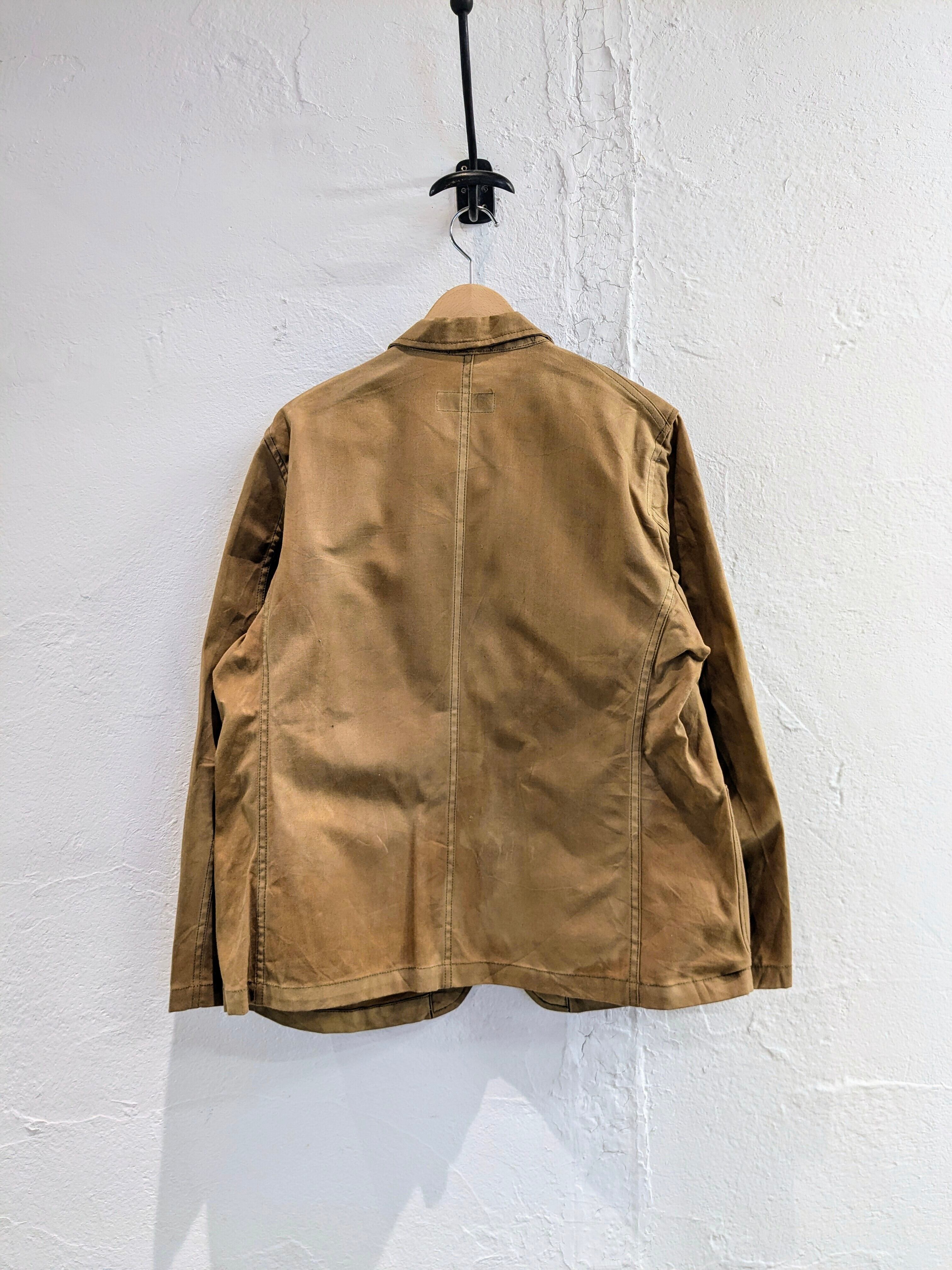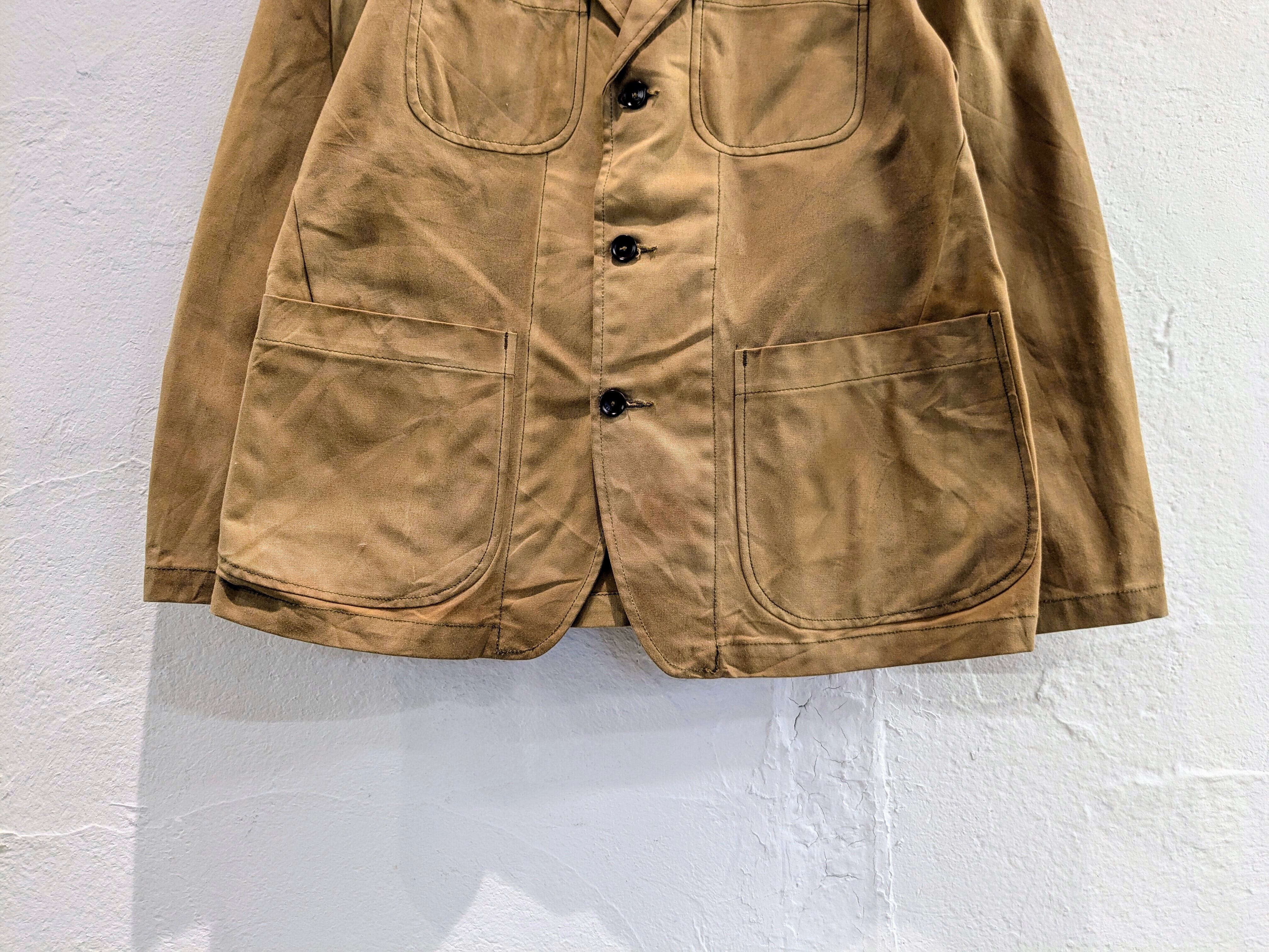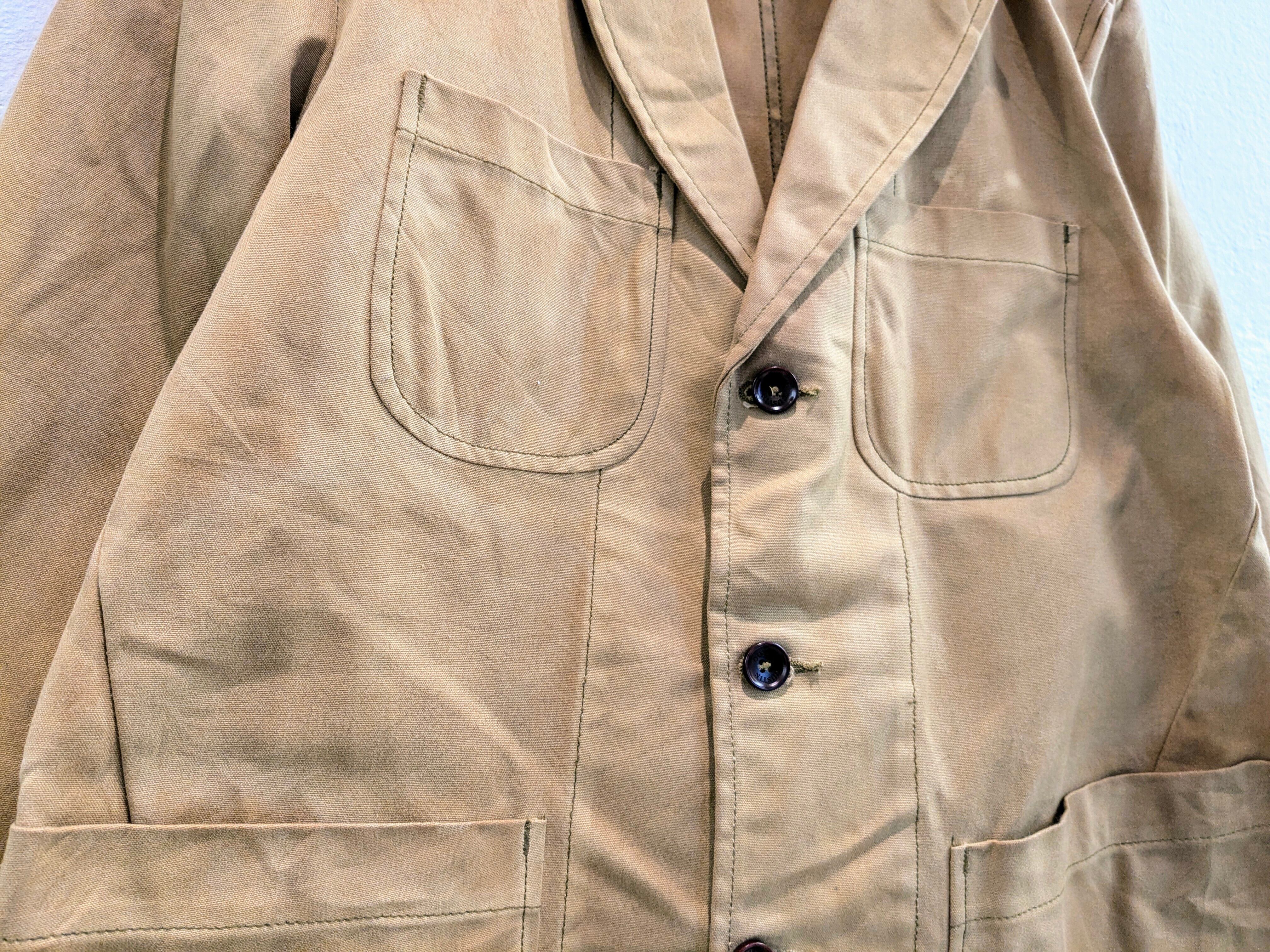 かなりハリ感のある素材で、着れば着るほど馴染んでくるレザーのような生地。ワックスコットンになることで、目が詰まり風を通さない、雨などの水を中に通さないようになっています。バブアーのようにオイルドだと匂いなどが気になるケースが多いですが、ワックスコットンだとそれがないのもいいところ。形、色は普遍的なモノになるので長い間お使いいただけます。