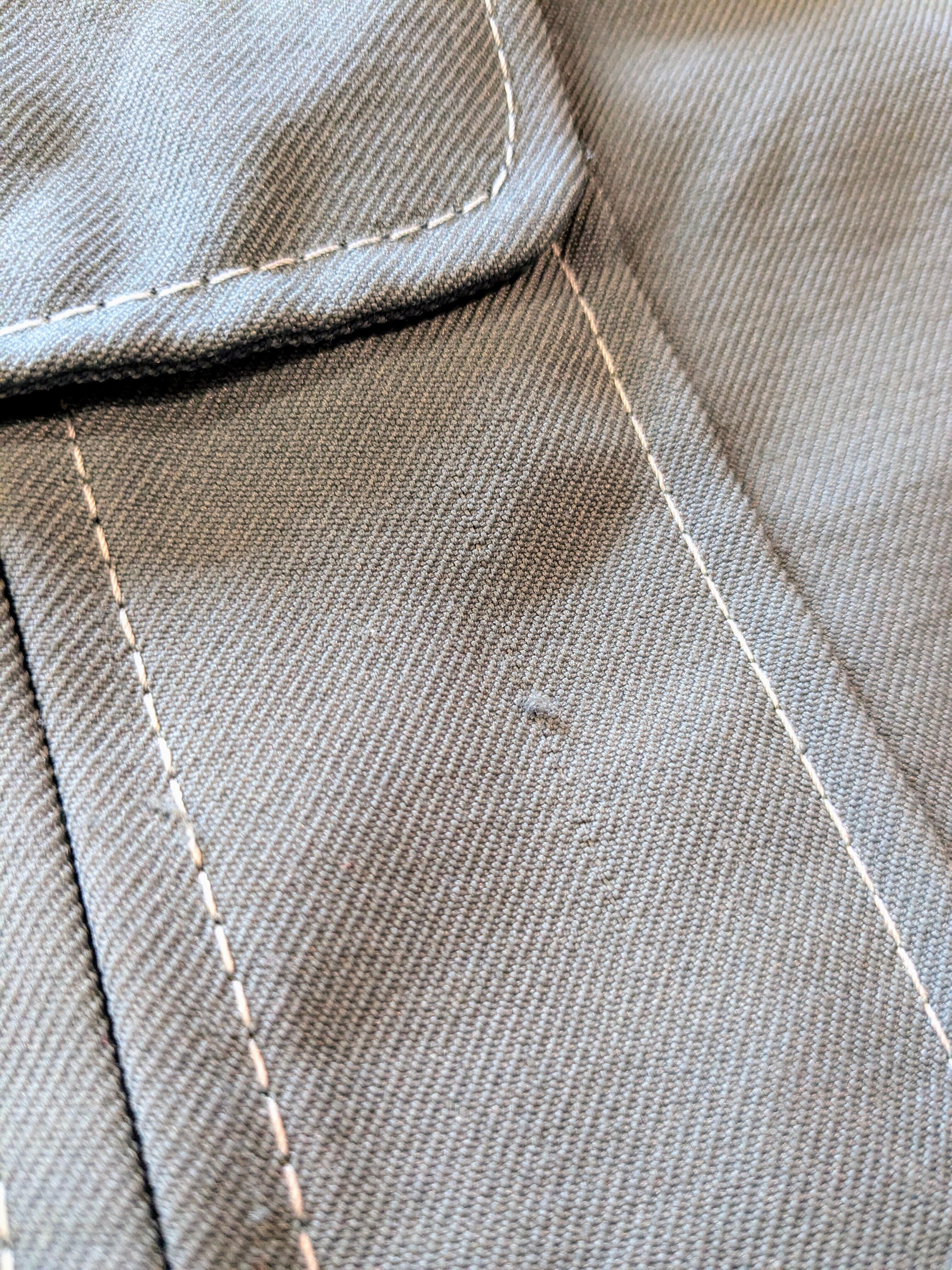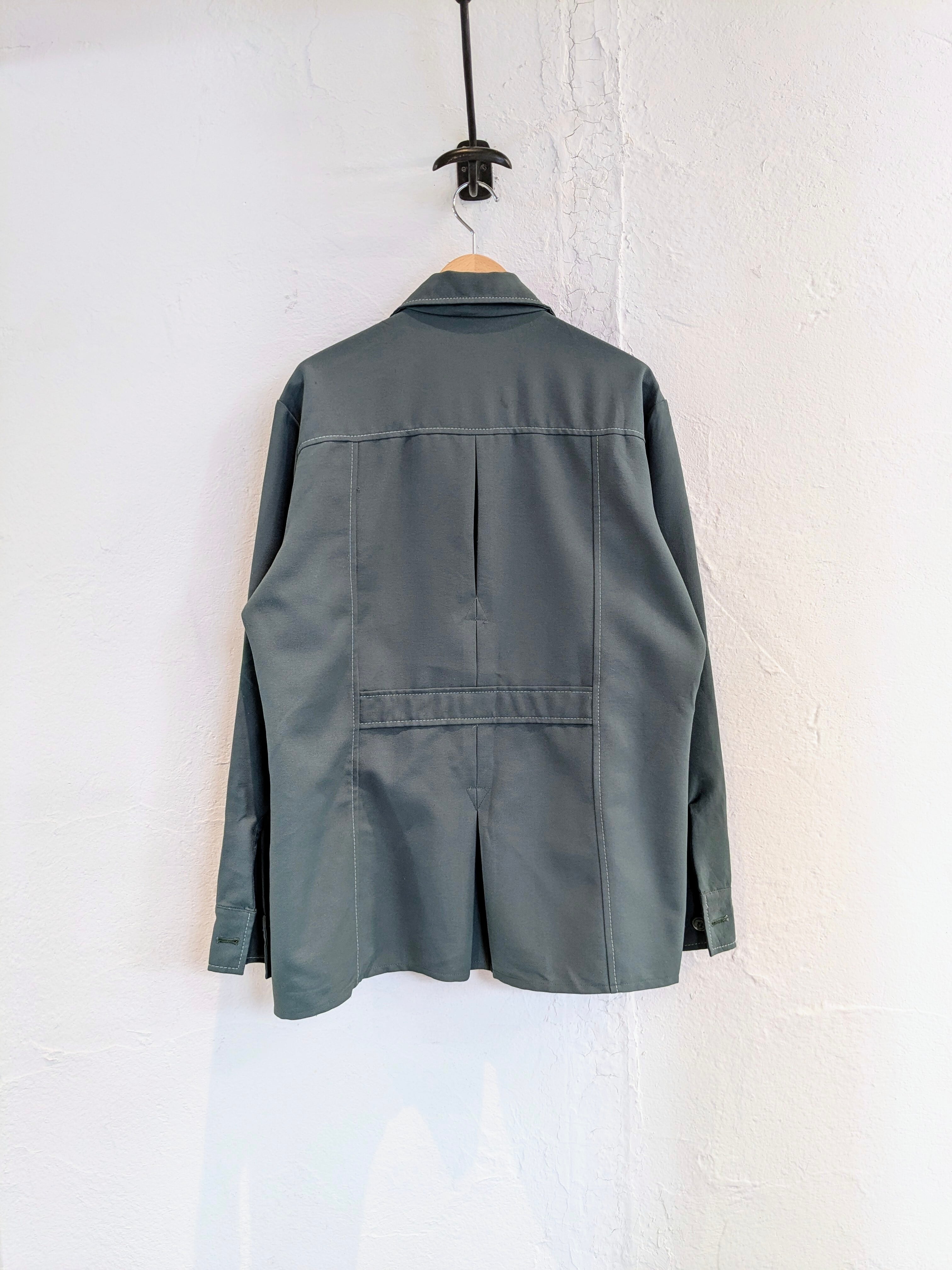 白のステッチが効いているデザイン。バックスタイルのタックの入り方など微妙にデザインが効いています。タグにもありますが、「No Iron」シワなどにも強くなっています。シャツとしてもブルゾンとしても使える汎用性の利く一着。ツリがあります。