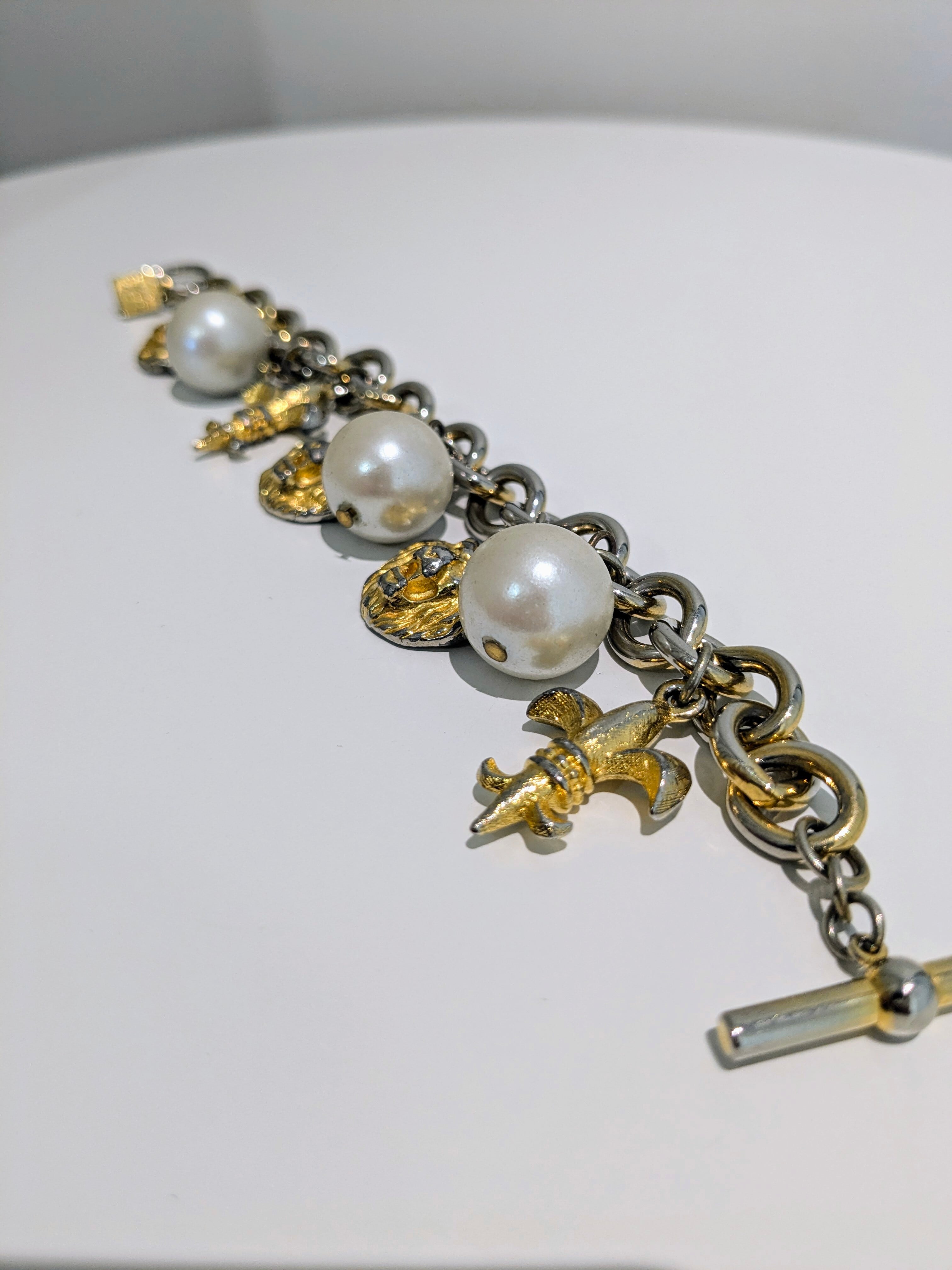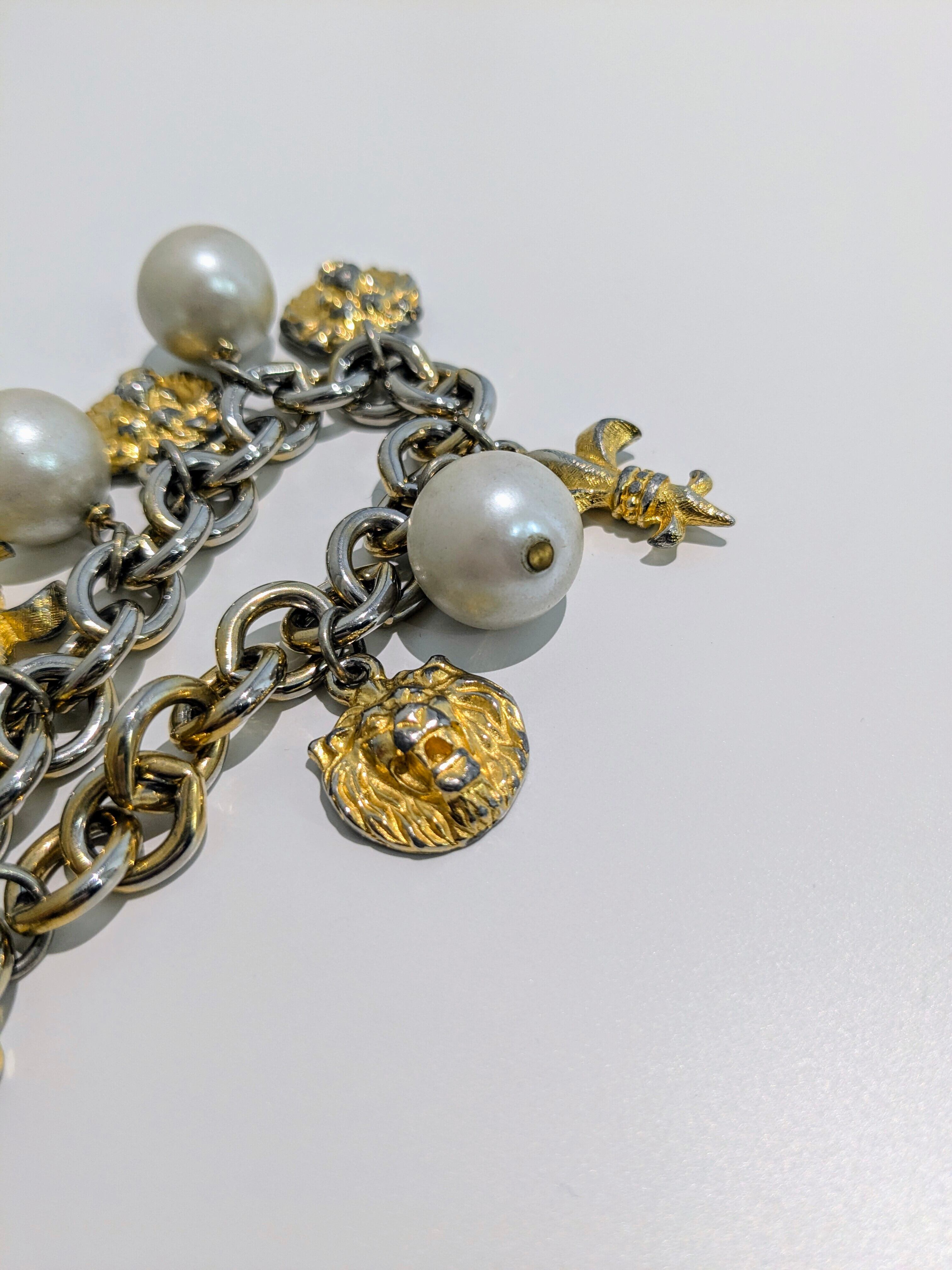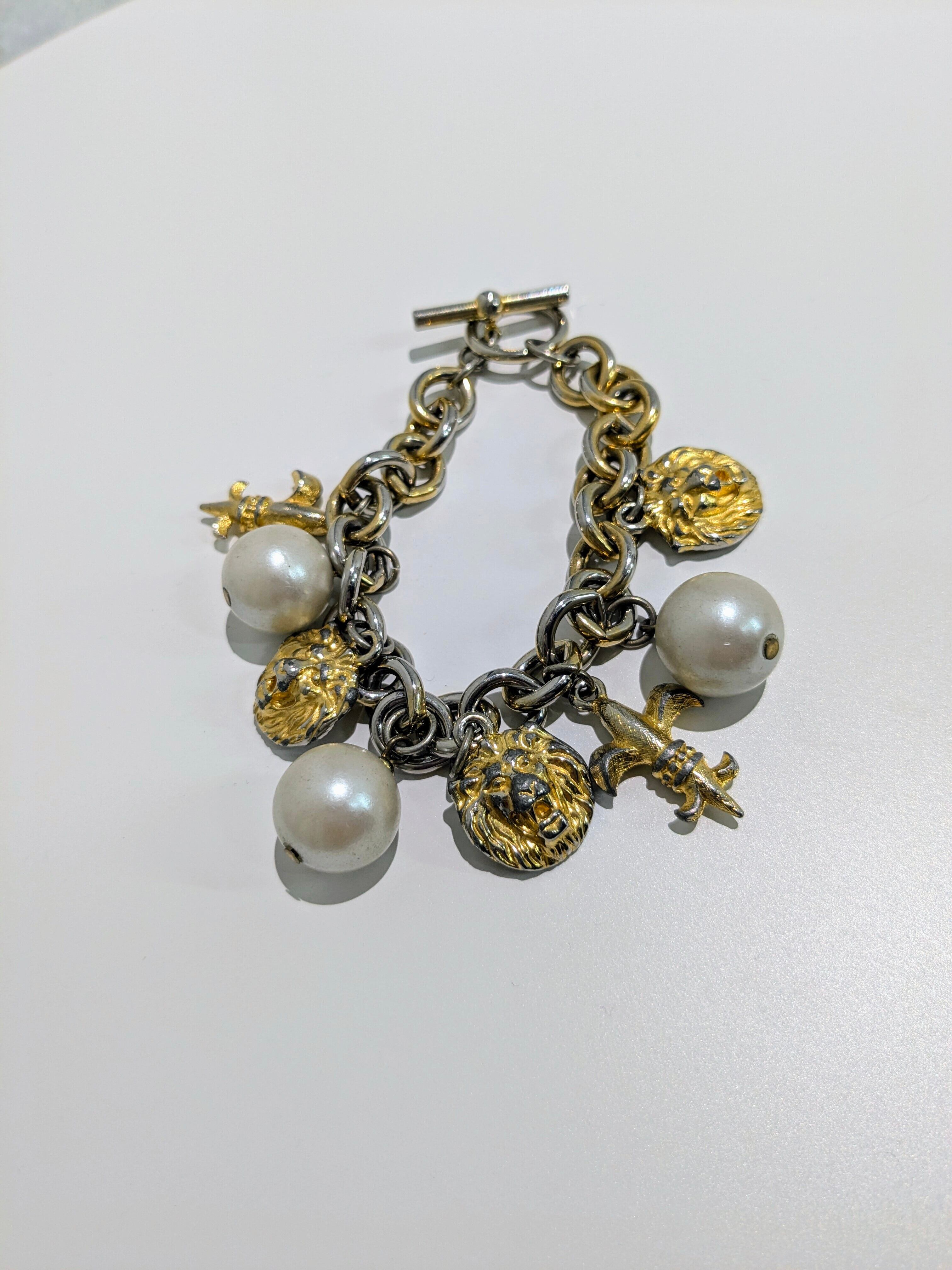 ライオン、パールなどのチャームが付いたブレスレット。全体的にくすんだゴールドが雰囲気抜群なアイテム。チャームが付くことでボリューム感が出て、夏場のTシャツスタイルでも目を引くそんな1点。