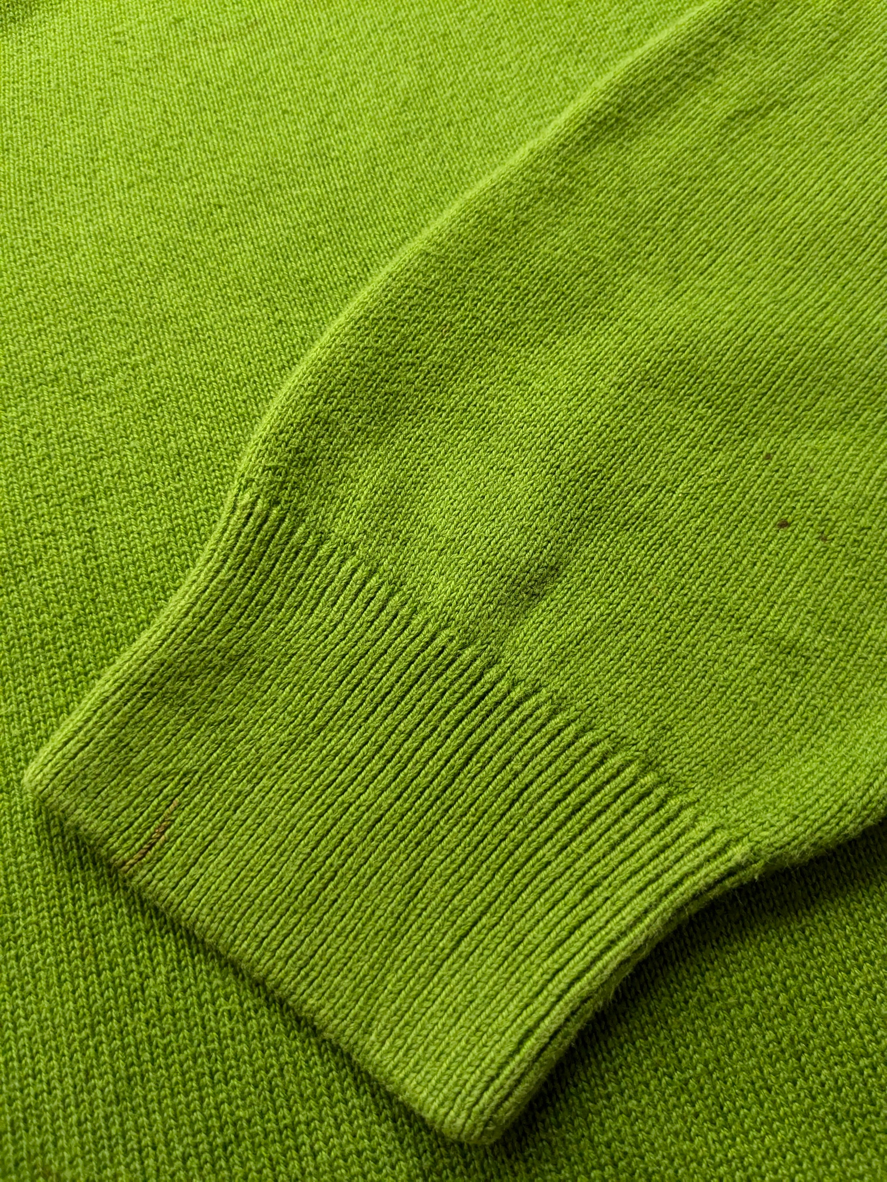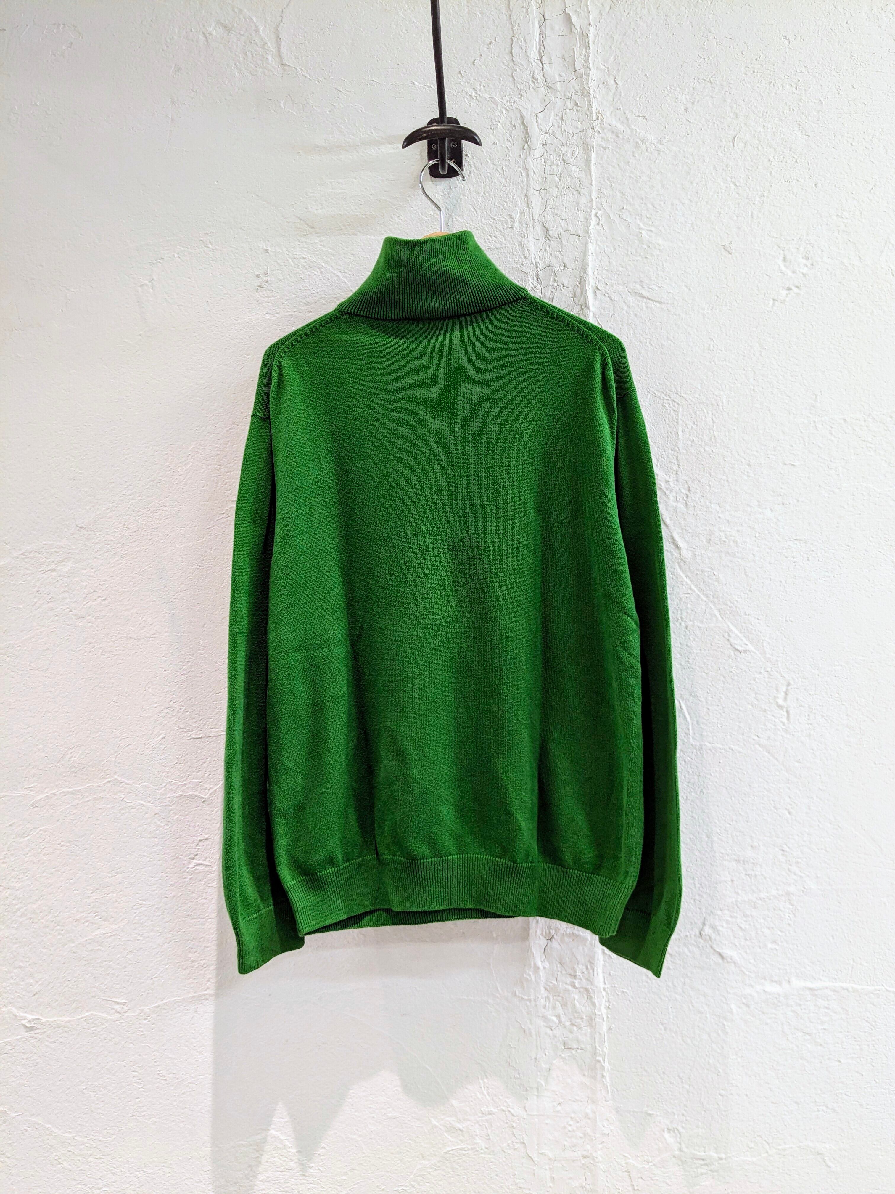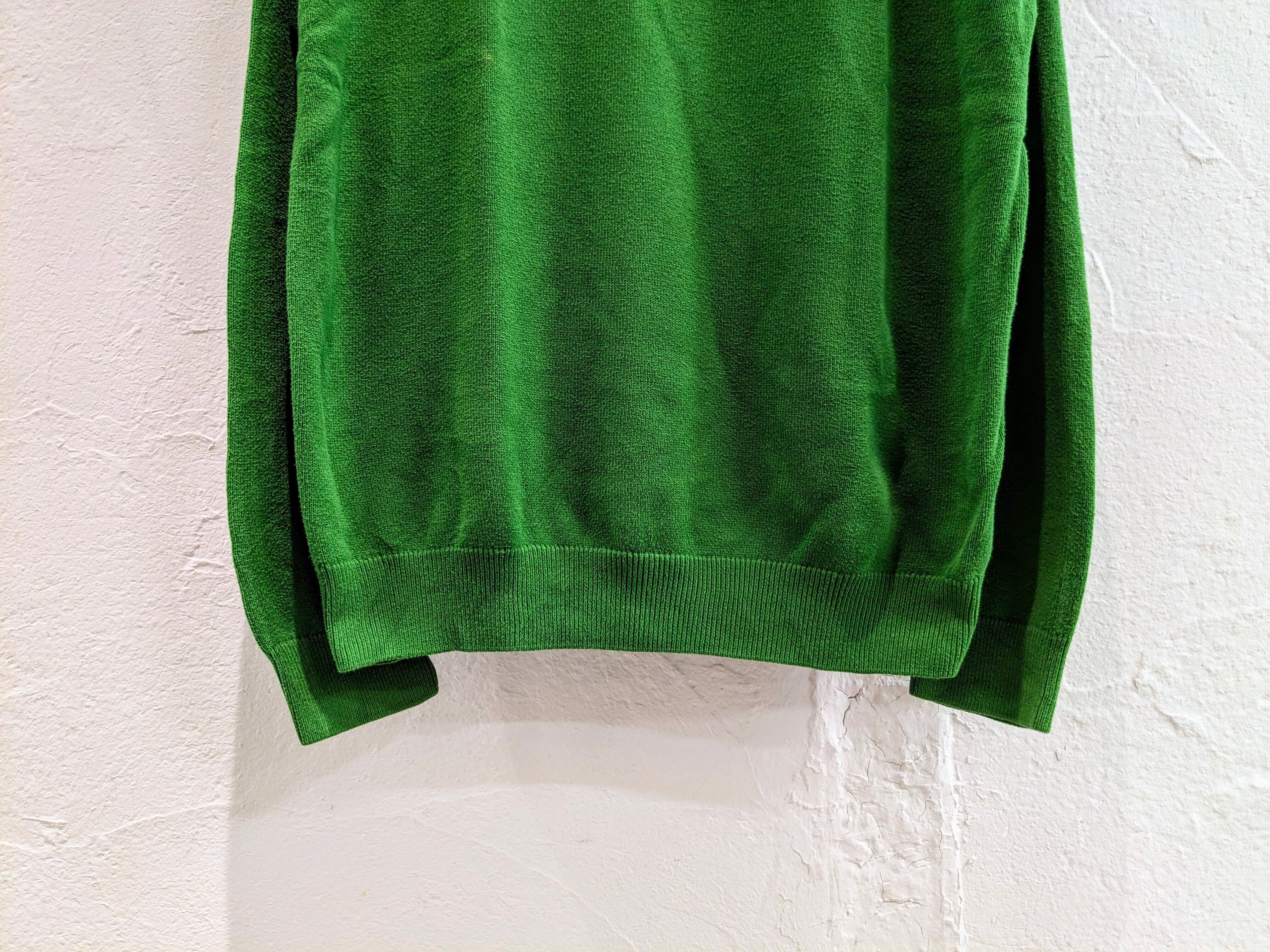 鮮やかなグリーンでとても発色のいい色合いがとてもいいアイテム。生地は、コットンで比較的薄手なのでインナーとしても使いやすいサイズ感。ハイネックでも、襟を作ってもどちらでも使える優秀な一着。