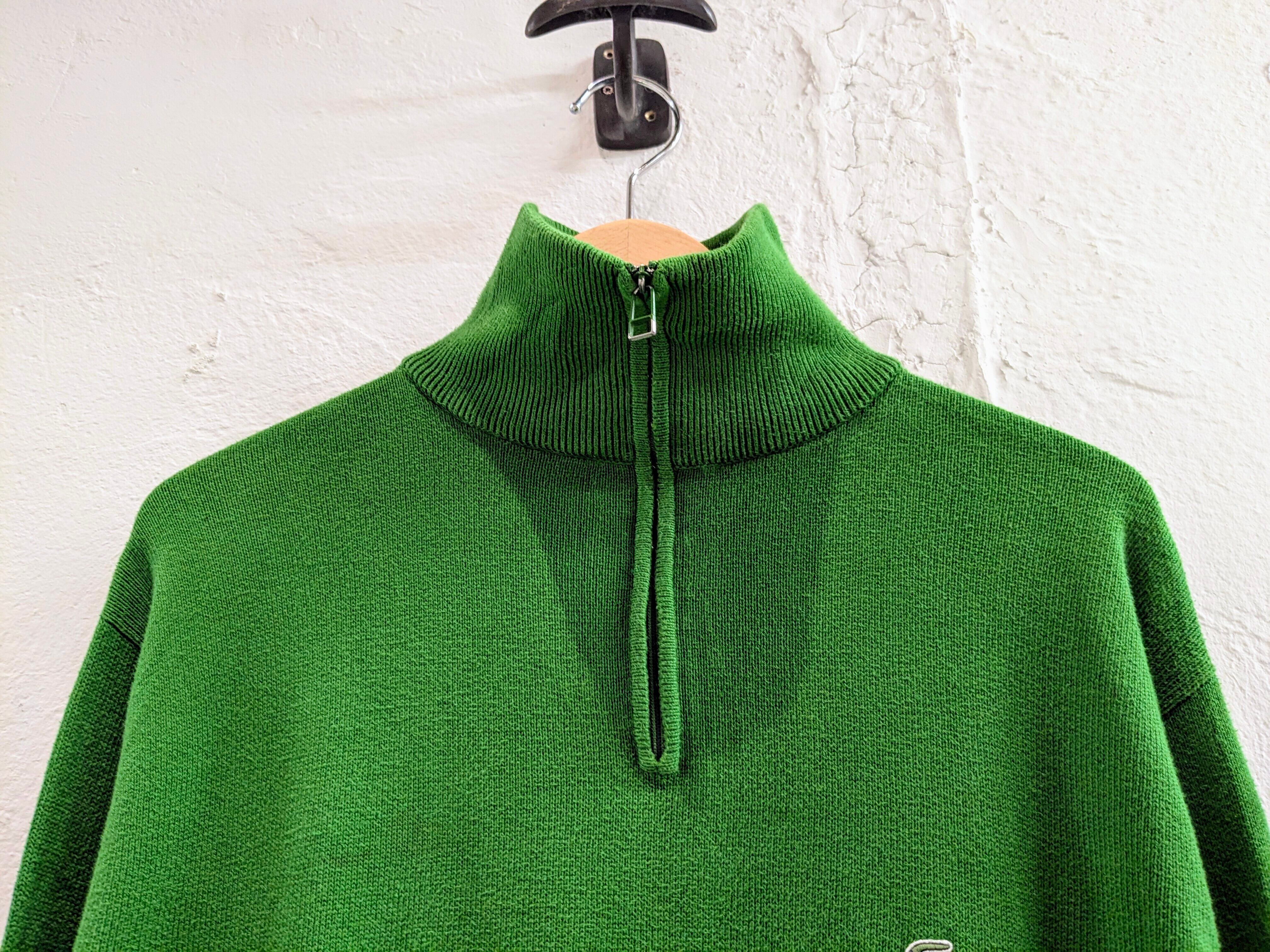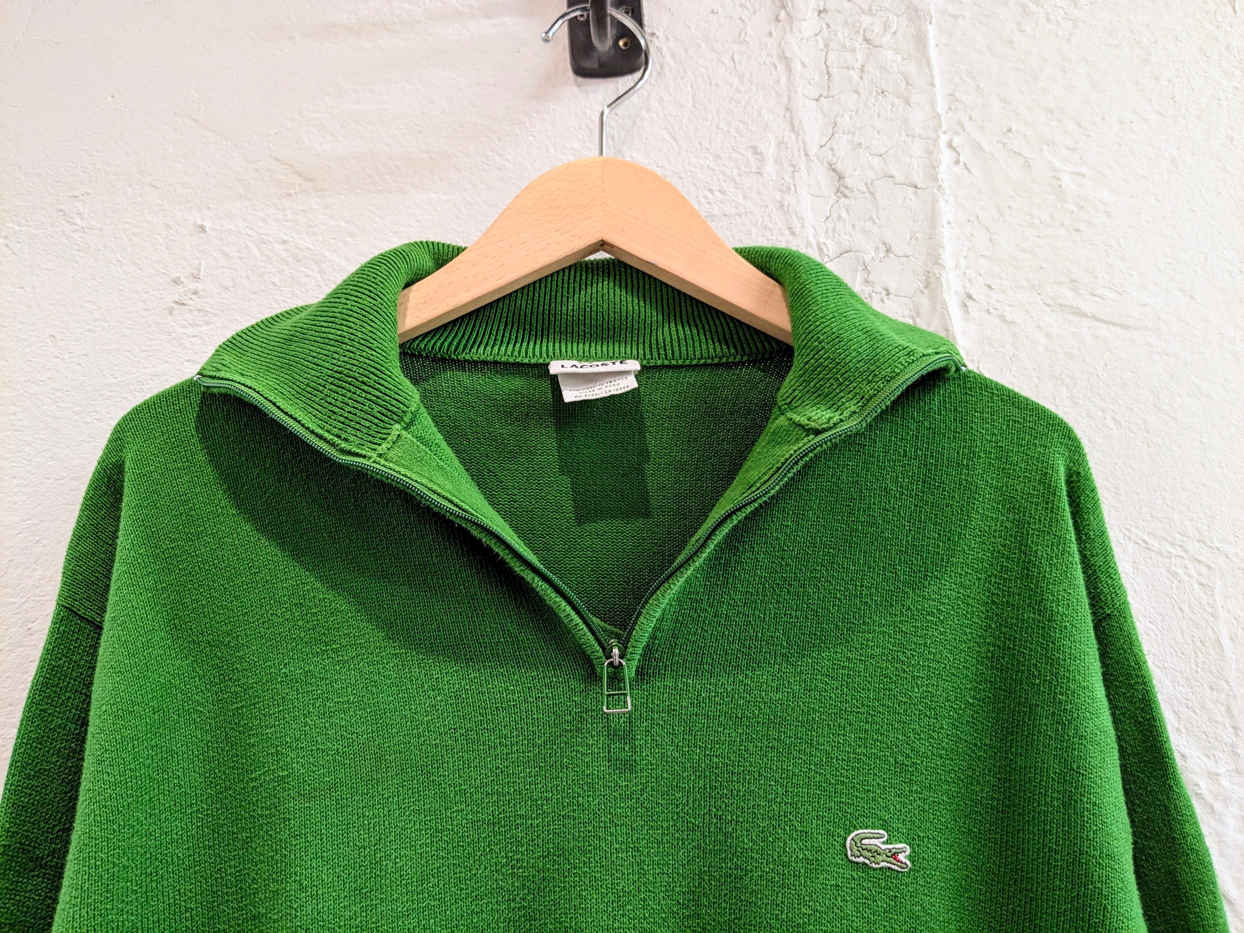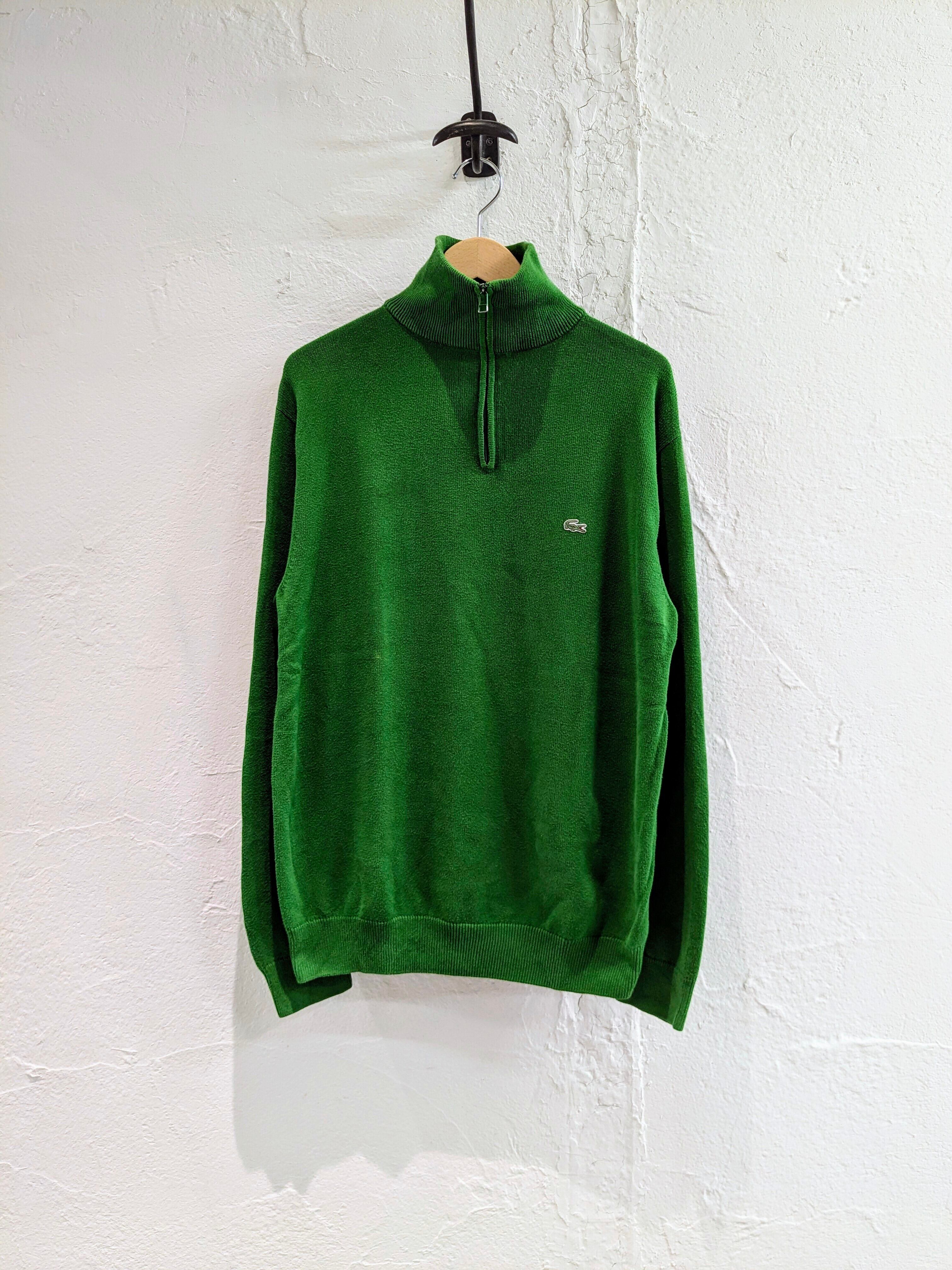 鮮やかなグリーンでとても発色のいい色合いがとてもいいアイテム。生地は、コットンで比較的薄手なのでインナーとしても使いやすいサイズ感。ハイネックでも、襟を作ってもどちらでも使える優秀な一着。