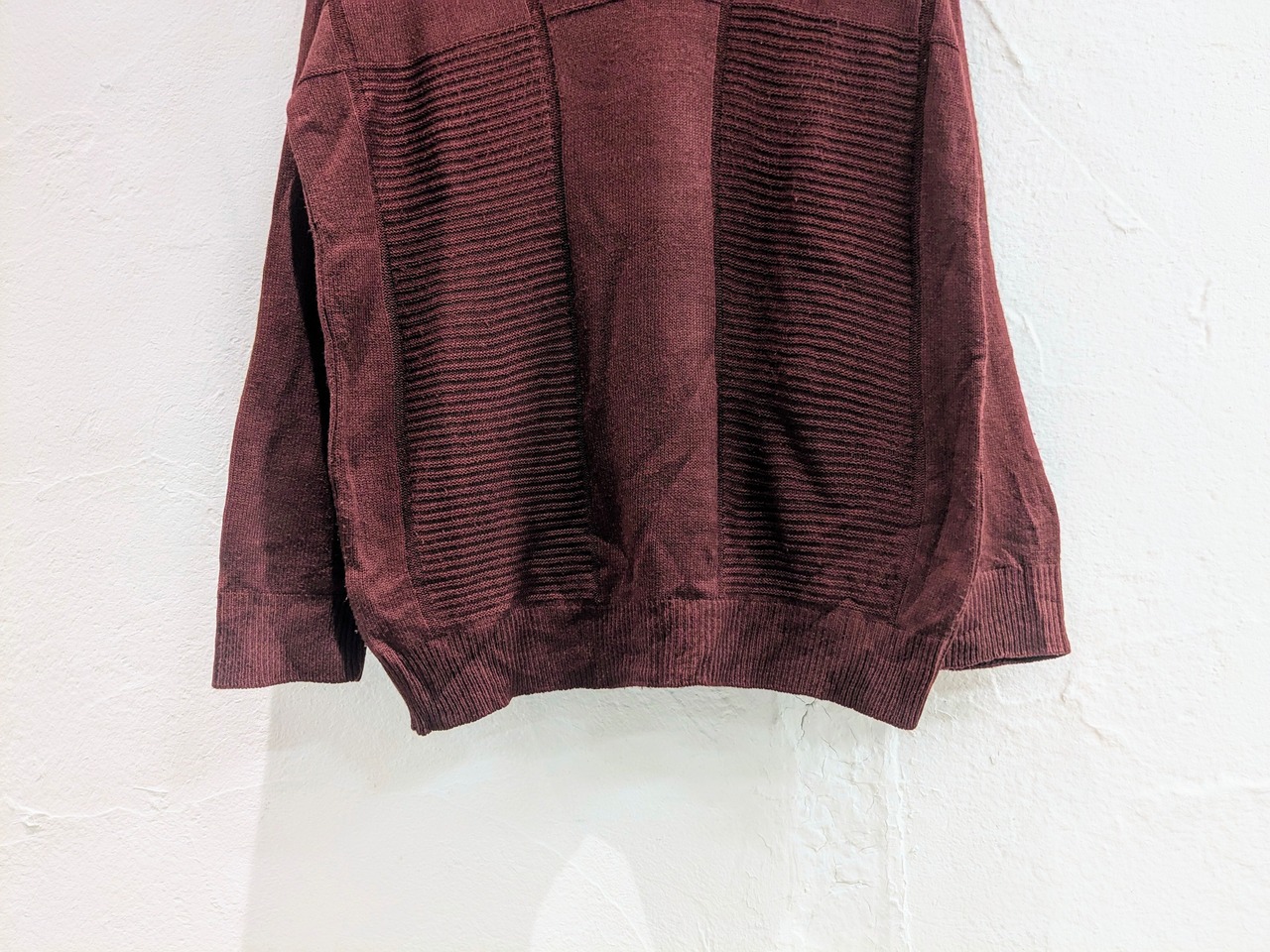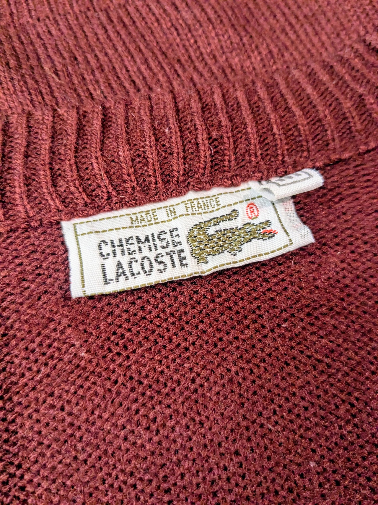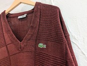 フランス製のラコステ。編み柄で凹凸感があるデザインニット。色が、バーガンディと深い色となっており、カジュアルさより上品さの方がにじみ出ているようなアイテム。定番アイテムだからこそ、ちょっとこだわりたい人にオススメ。