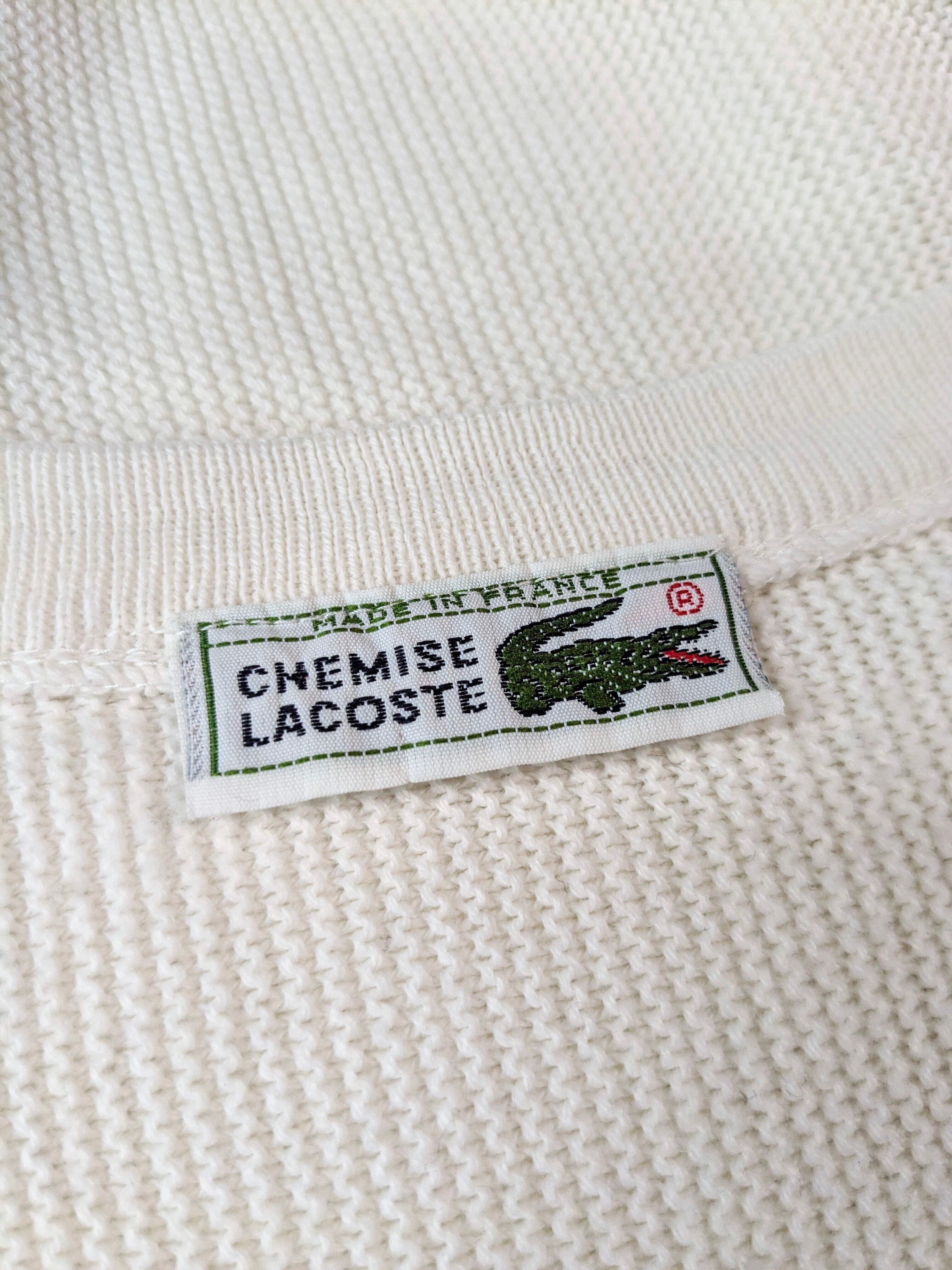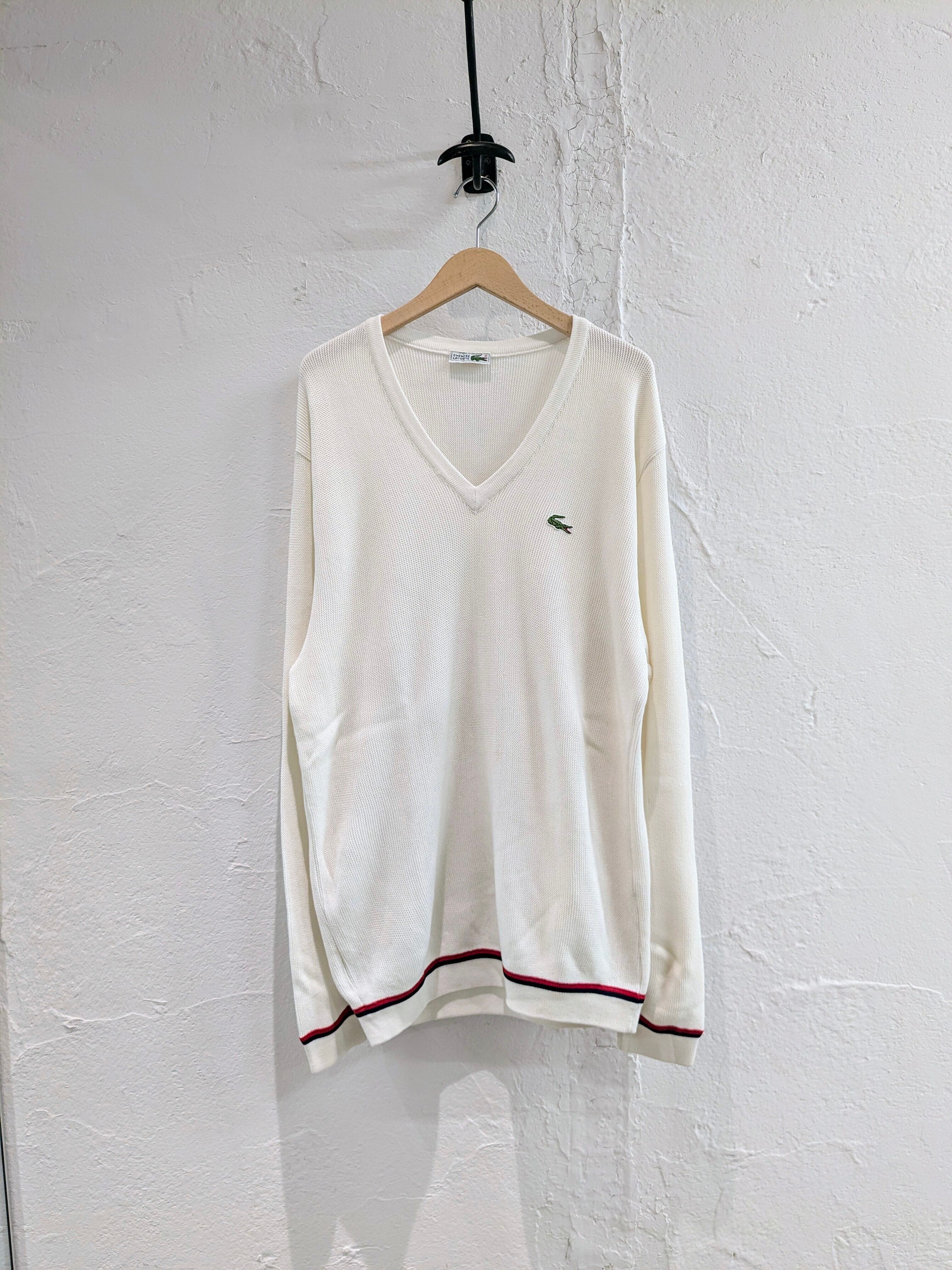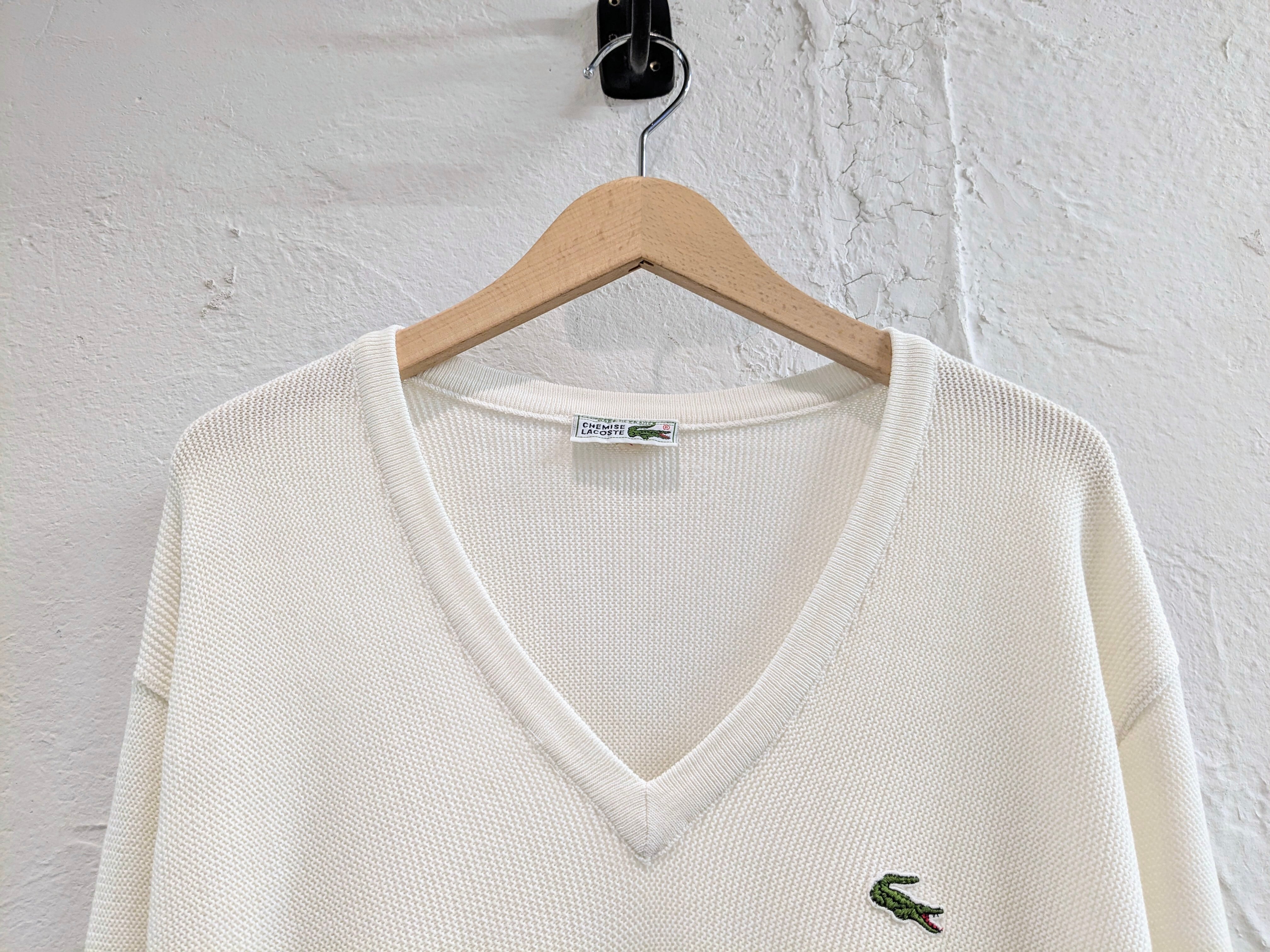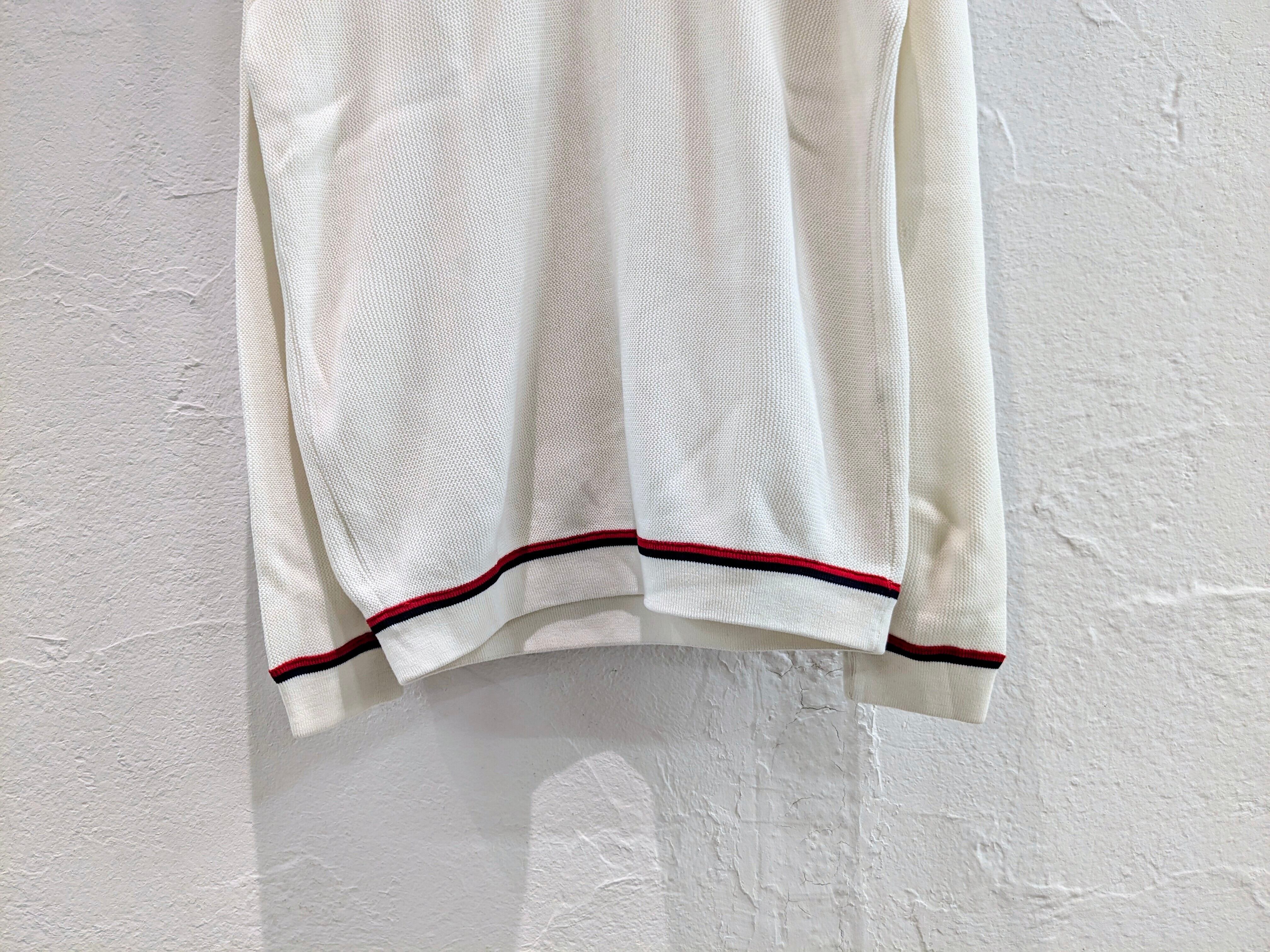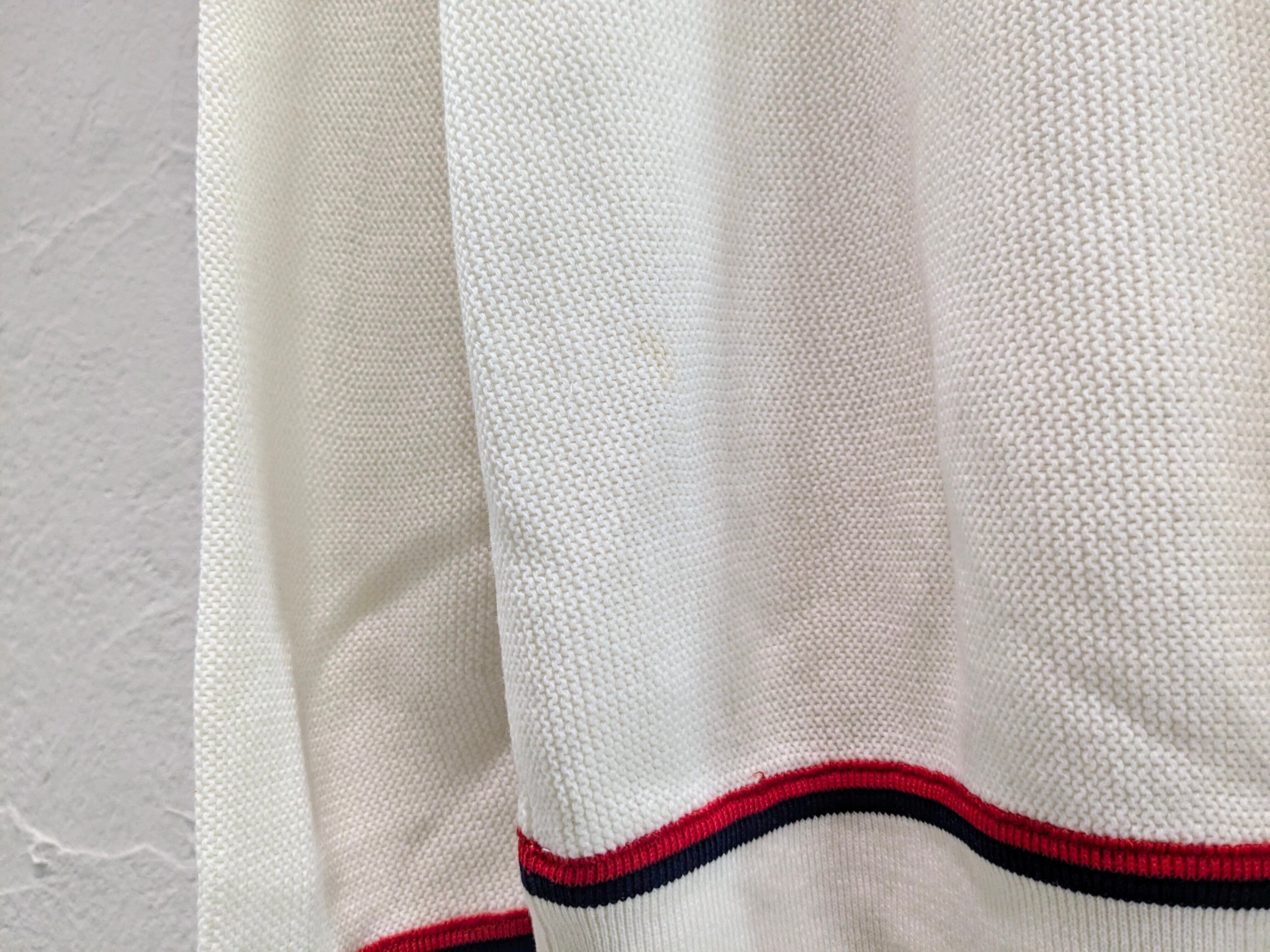 ラコステらしい、トリコロールカラーのラインが裾、袖口に入っています。ジャストサイズで着てもいいですが、個人的にはオーバーサイズに着てもらった方がクラシック感がなくなり、気分なサイズ感になるかと思っています。定番アイテムだからこそこだわりたい人にオススメ。傷あり。
