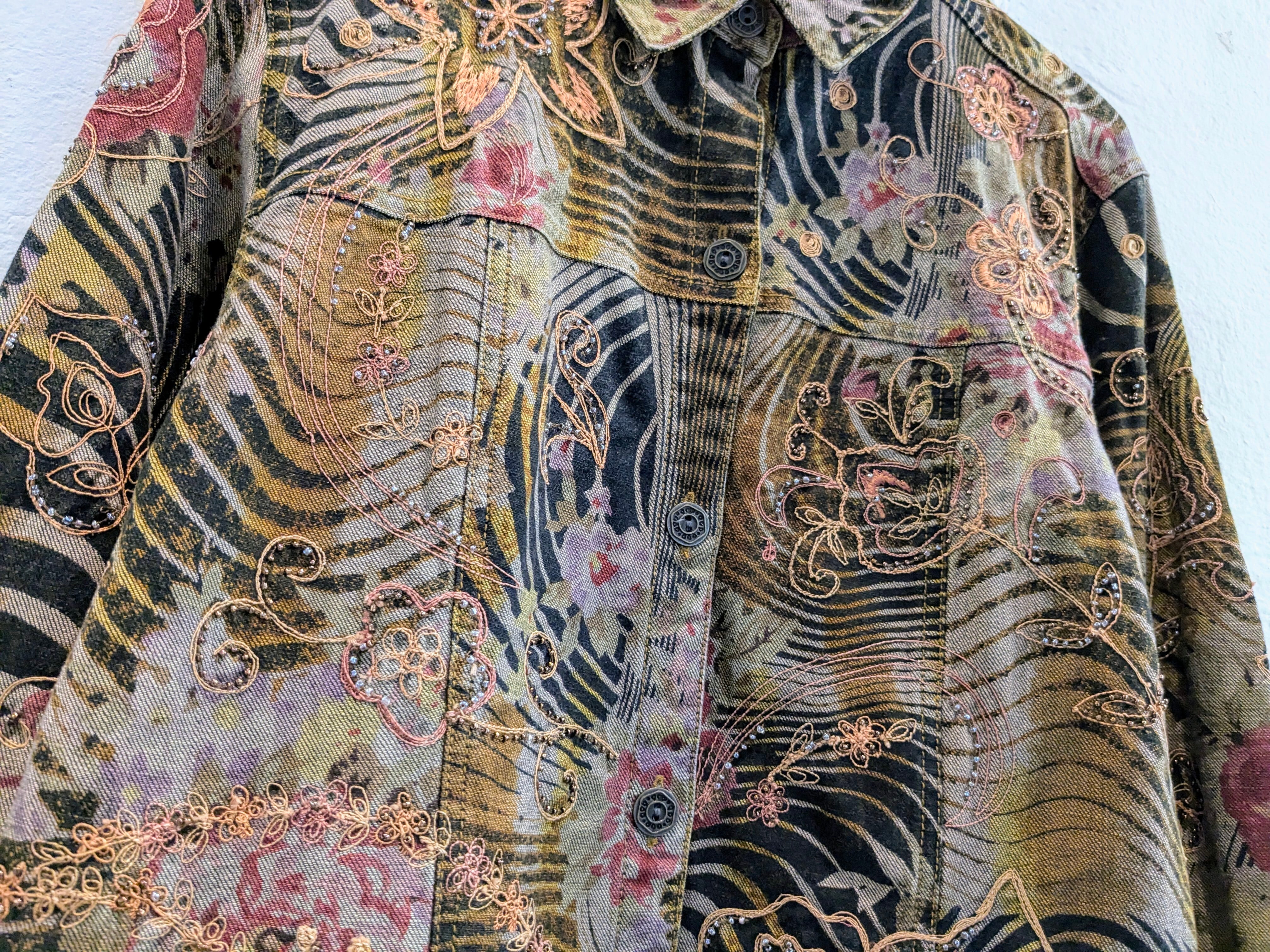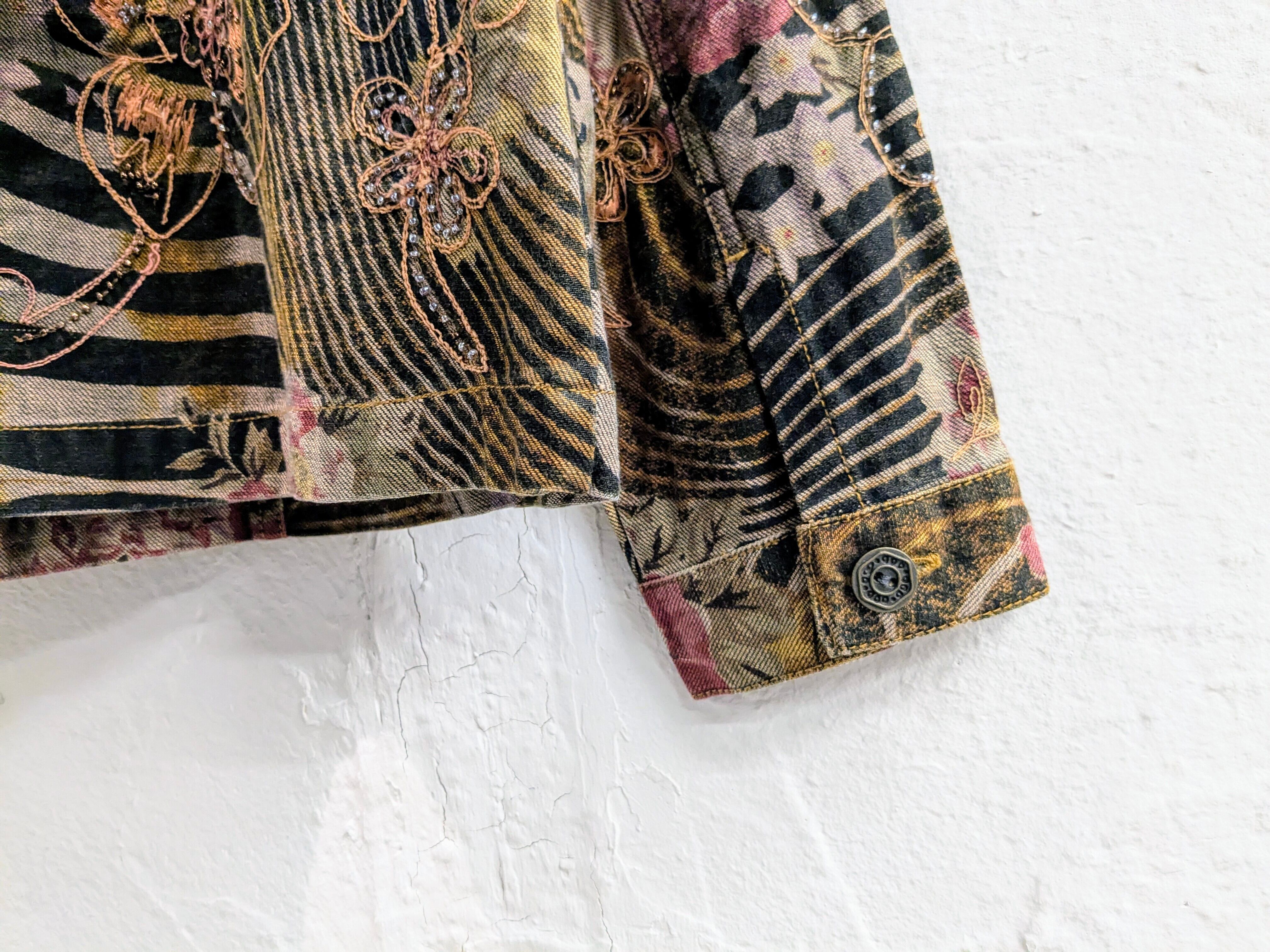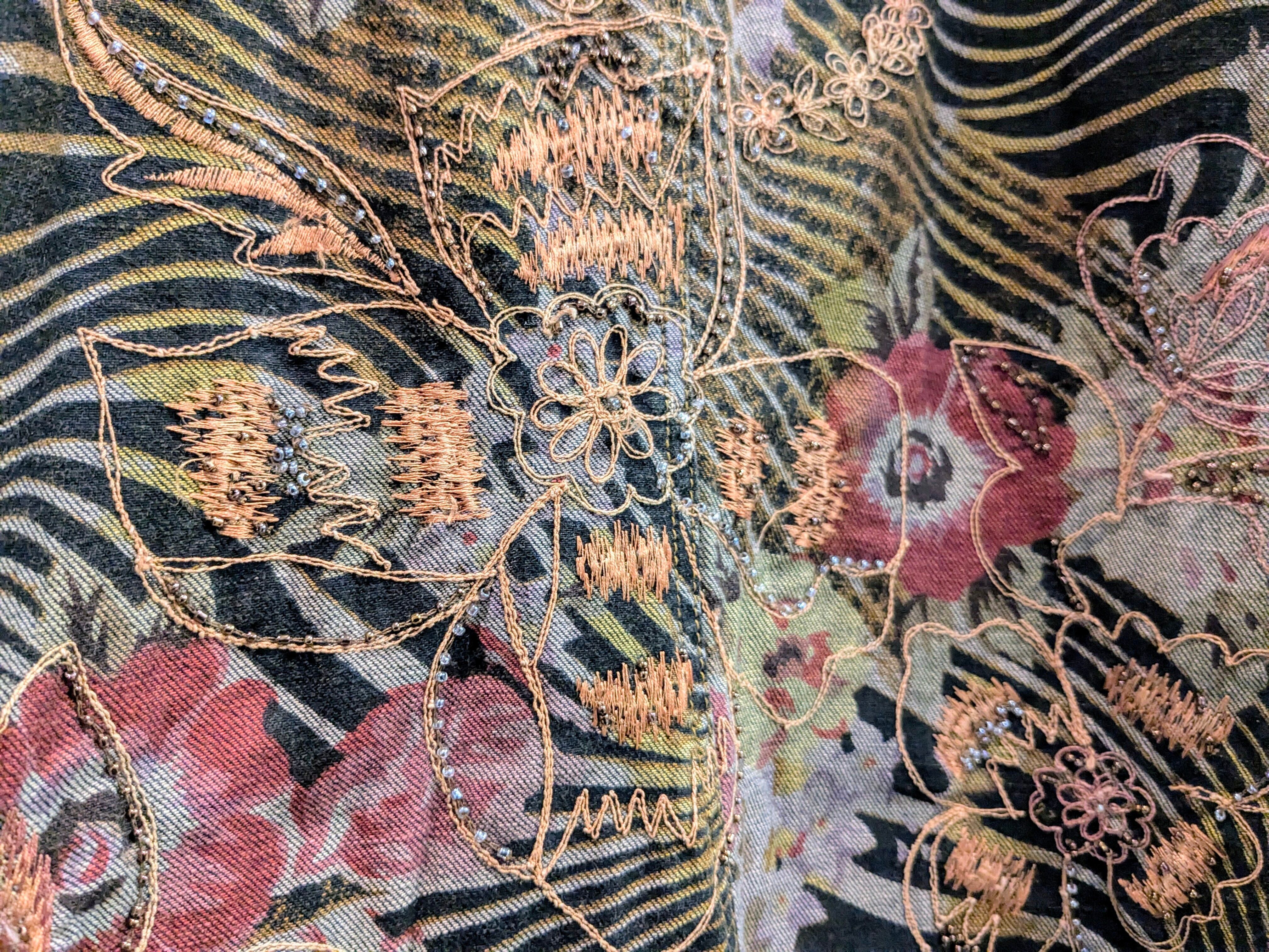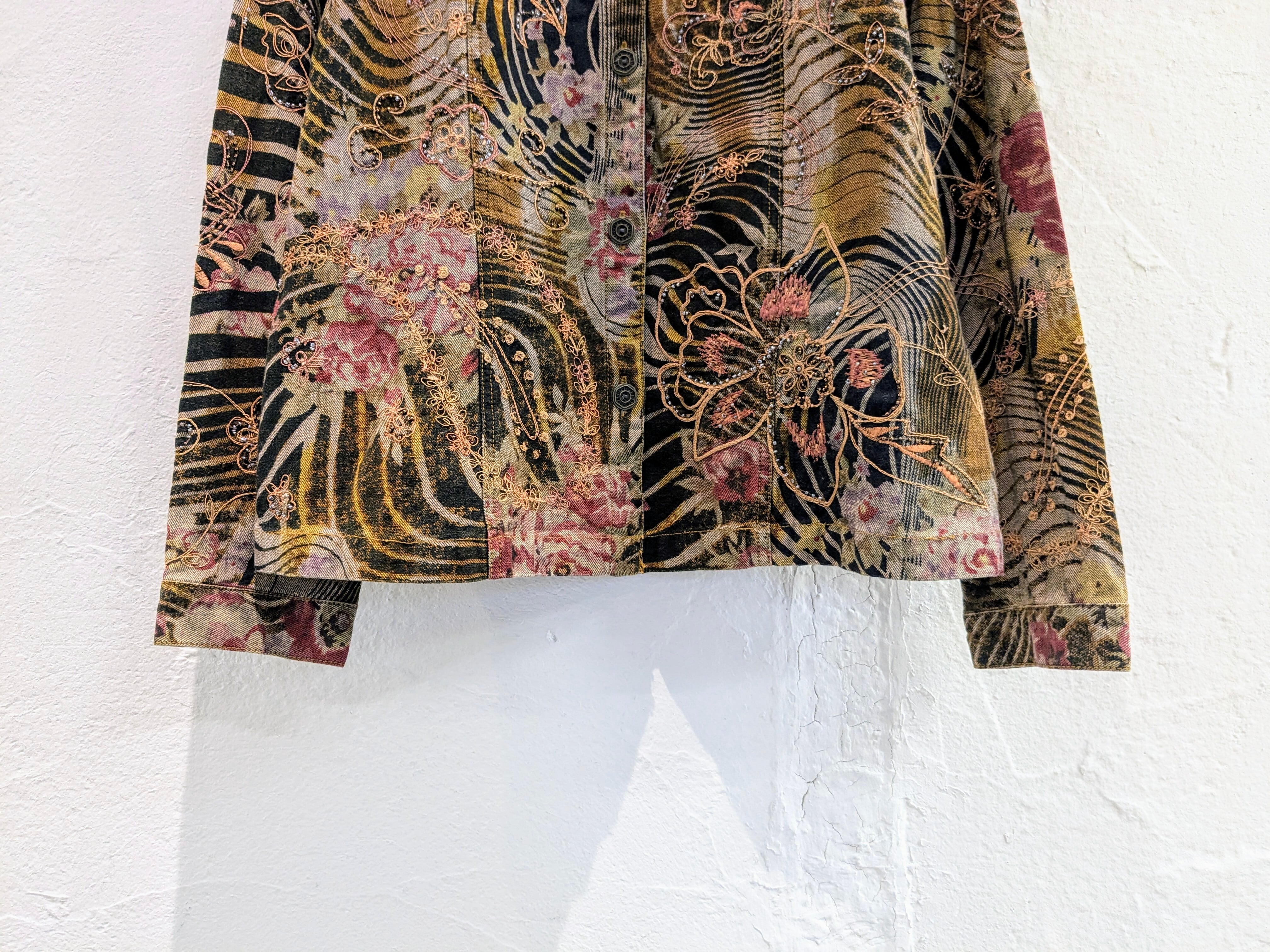 何柄と表現していいか考えてしまうアイテム。ゼブラ柄のようなのもあれば、花柄もあり、そのうえに花モチーフの刺繍、ビーズが付いていたりと一癖も、二癖もあるアイテム。ただ、色味としては落ち着いているので意外と合わせやすい。サイズはオーバーサイズではないので、わりとジャストめに着てもらうようなイメージ。この上に何かを羽織ってもいいですし、使い勝手のいい一着。糸が出ているところがあります。