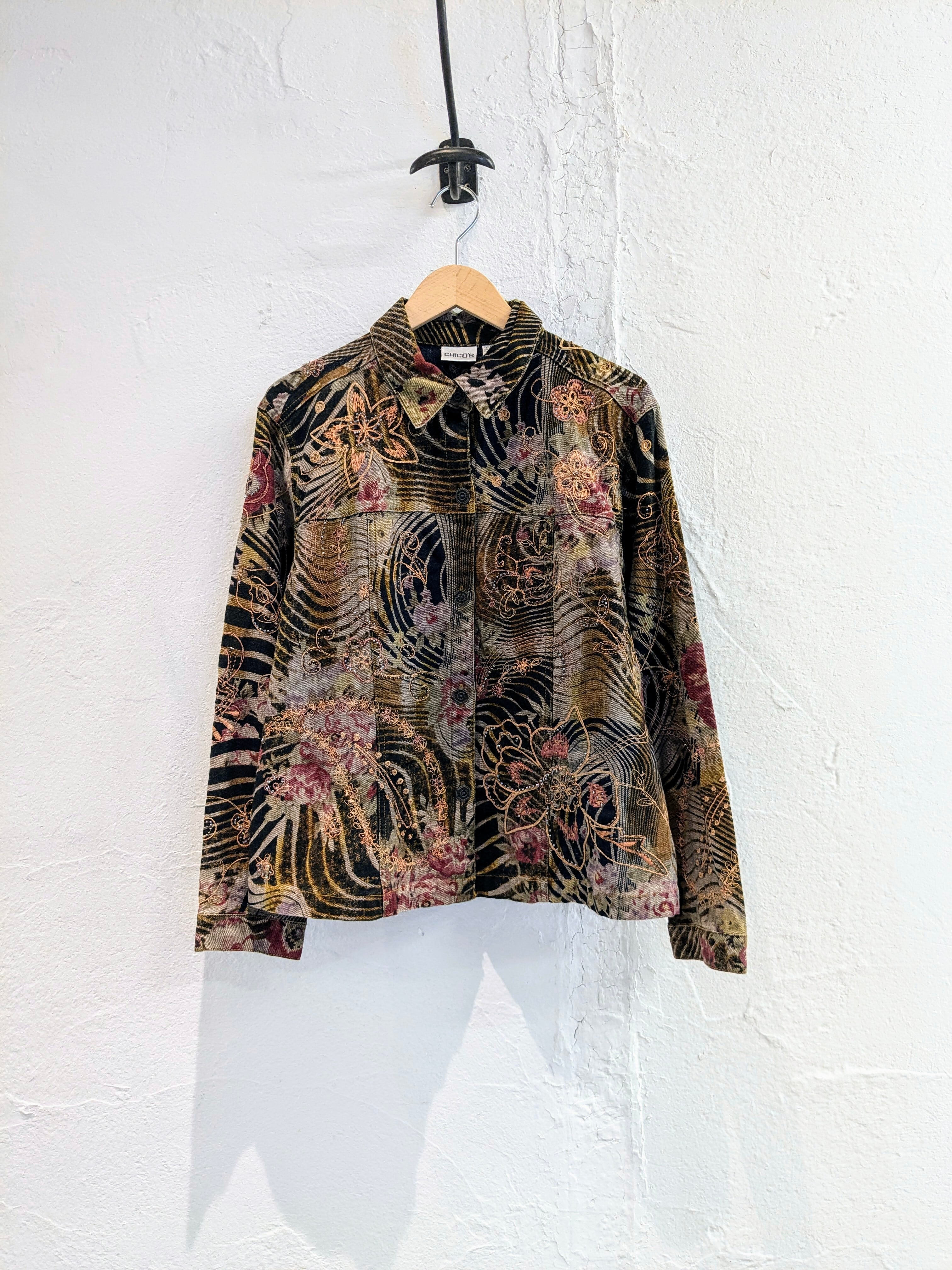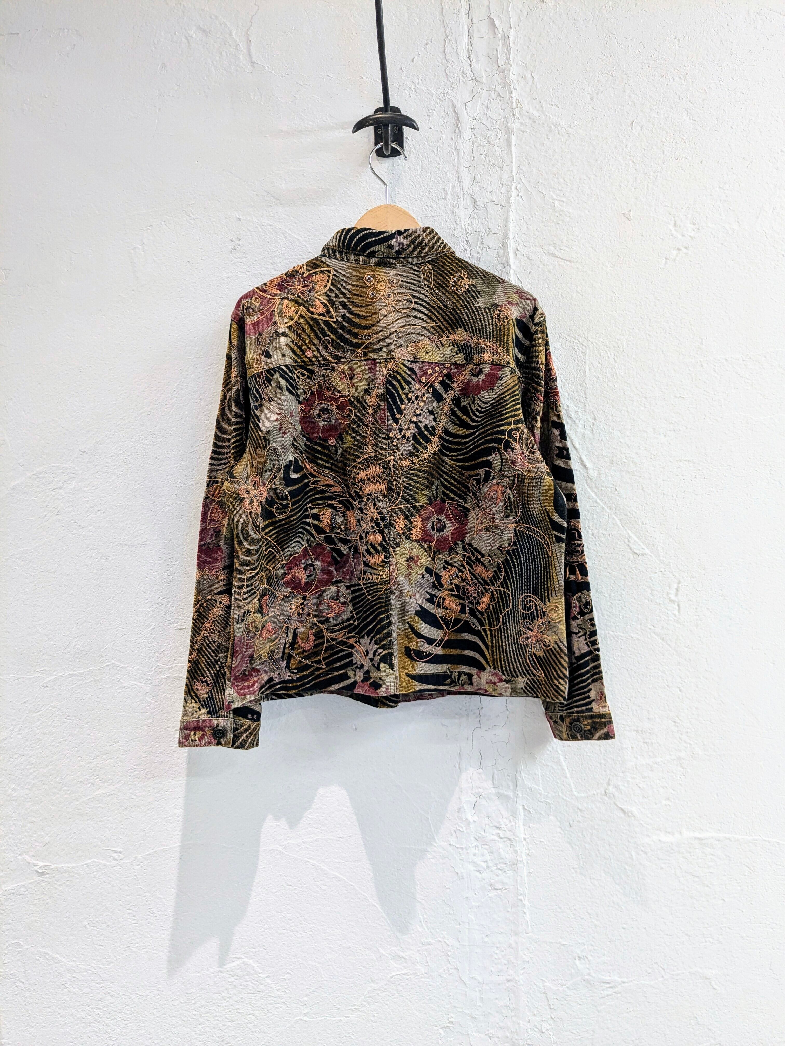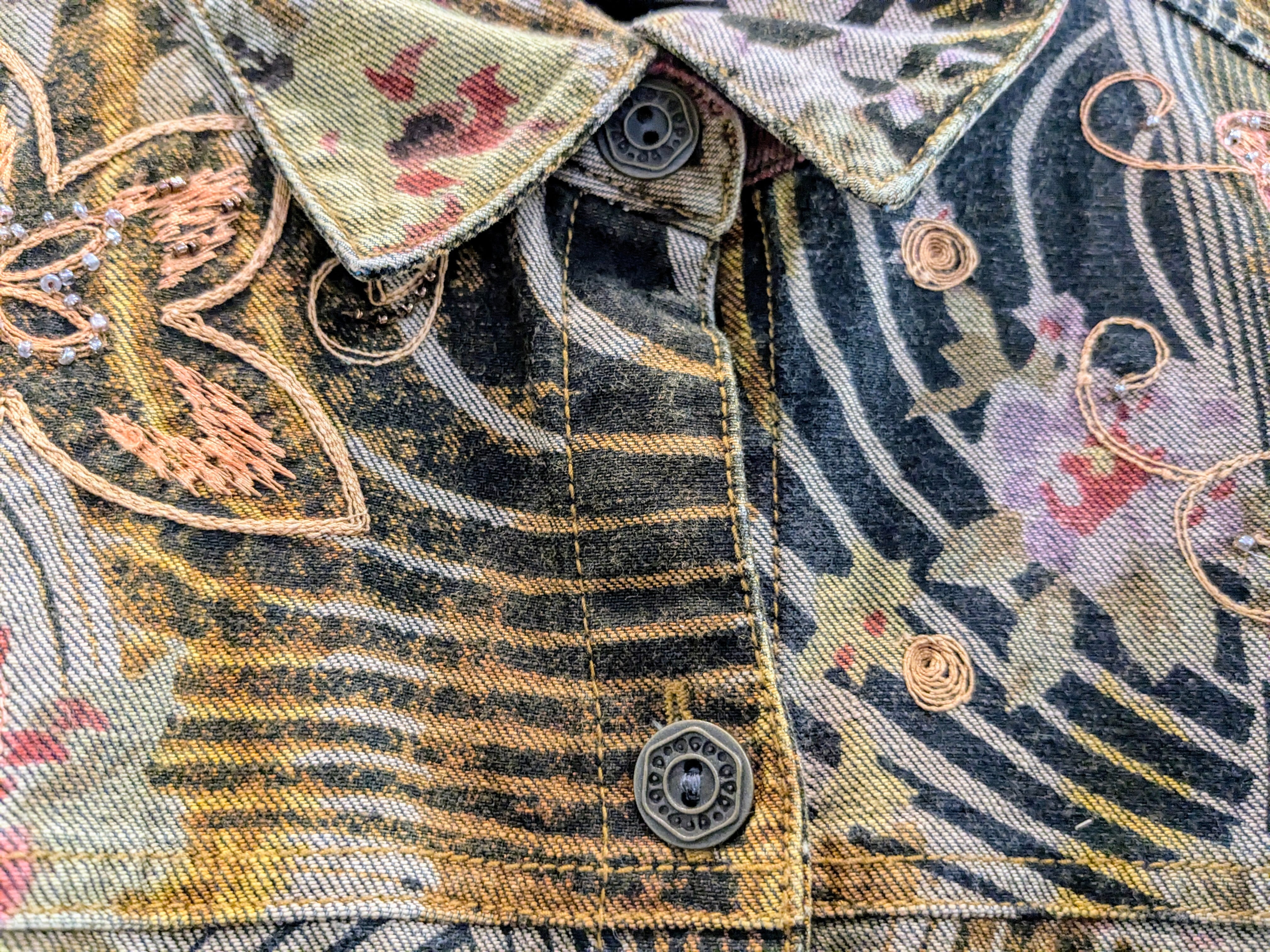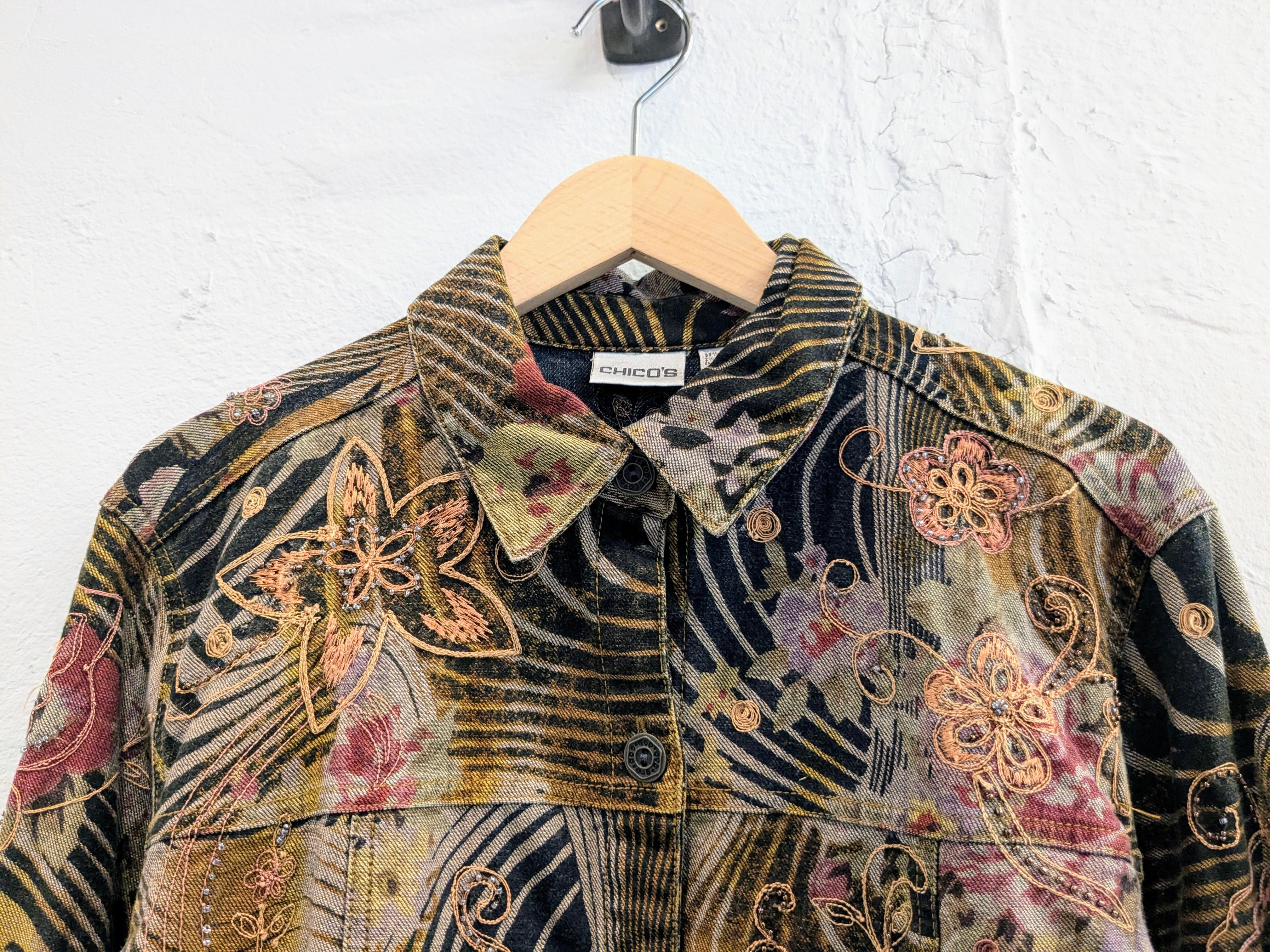 何柄と表現していいか考えてしまうアイテム。ゼブラ柄のようなのもあれば、花柄もあり、そのうえに花モチーフの刺繍、ビーズが付いていたりと一癖も、二癖もあるアイテム。ただ、色味としては落ち着いているので意外と合わせやすい。サイズはオーバーサイズではないので、わりとジャストめに着てもらうようなイメージ。この上に何かを羽織ってもいいですし、使い勝手のいい一着。糸が出ているところがあります。