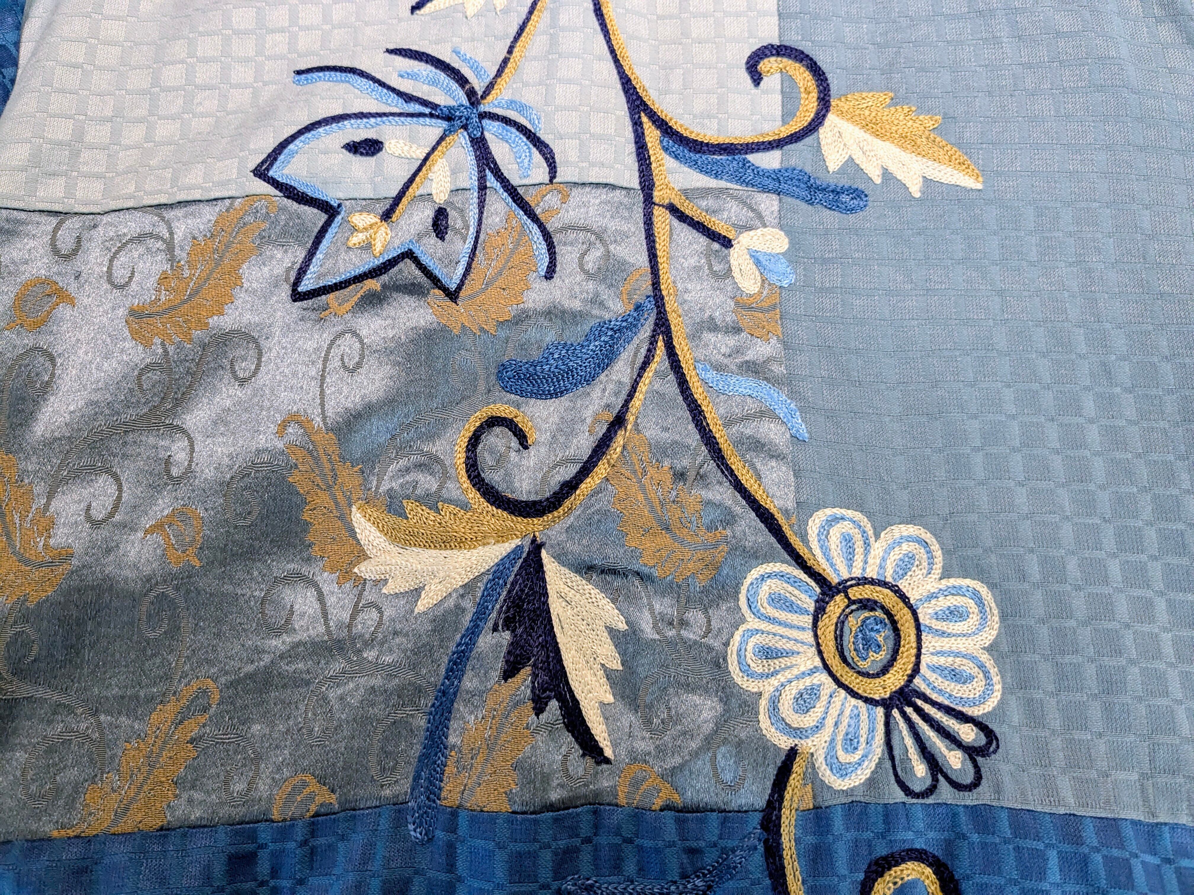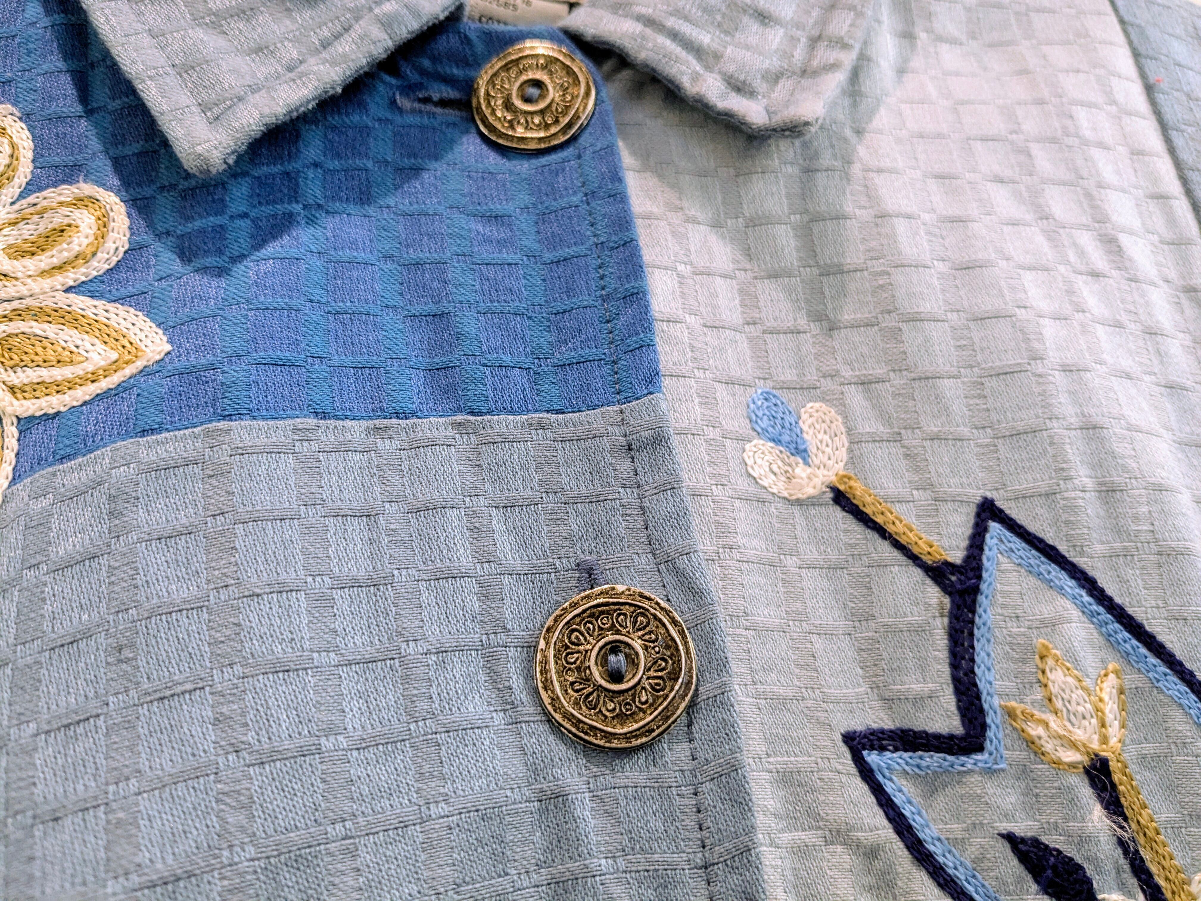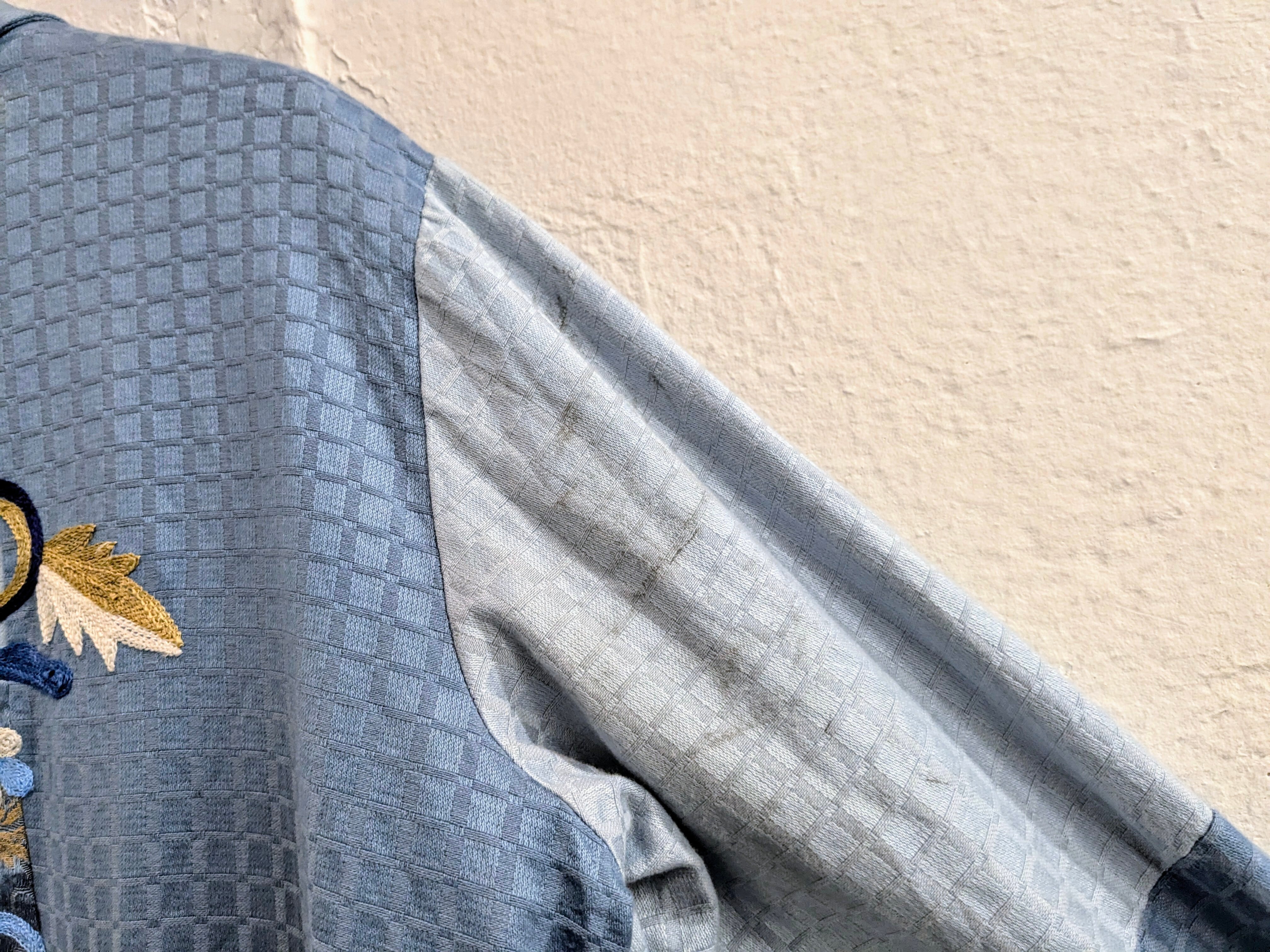 格子柄、光沢感のある生地などを、つなぎ合わせたようなデザインのボディに繊細な花の刺繍がされているアイテム。ブルーベースで作られているので、派手すぎることはないです。現行とかでもこの手のジャケットを作ったりしてるところもあります。そのソースとなったものかなって勝手に思っています。袖に汚れあり。
