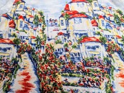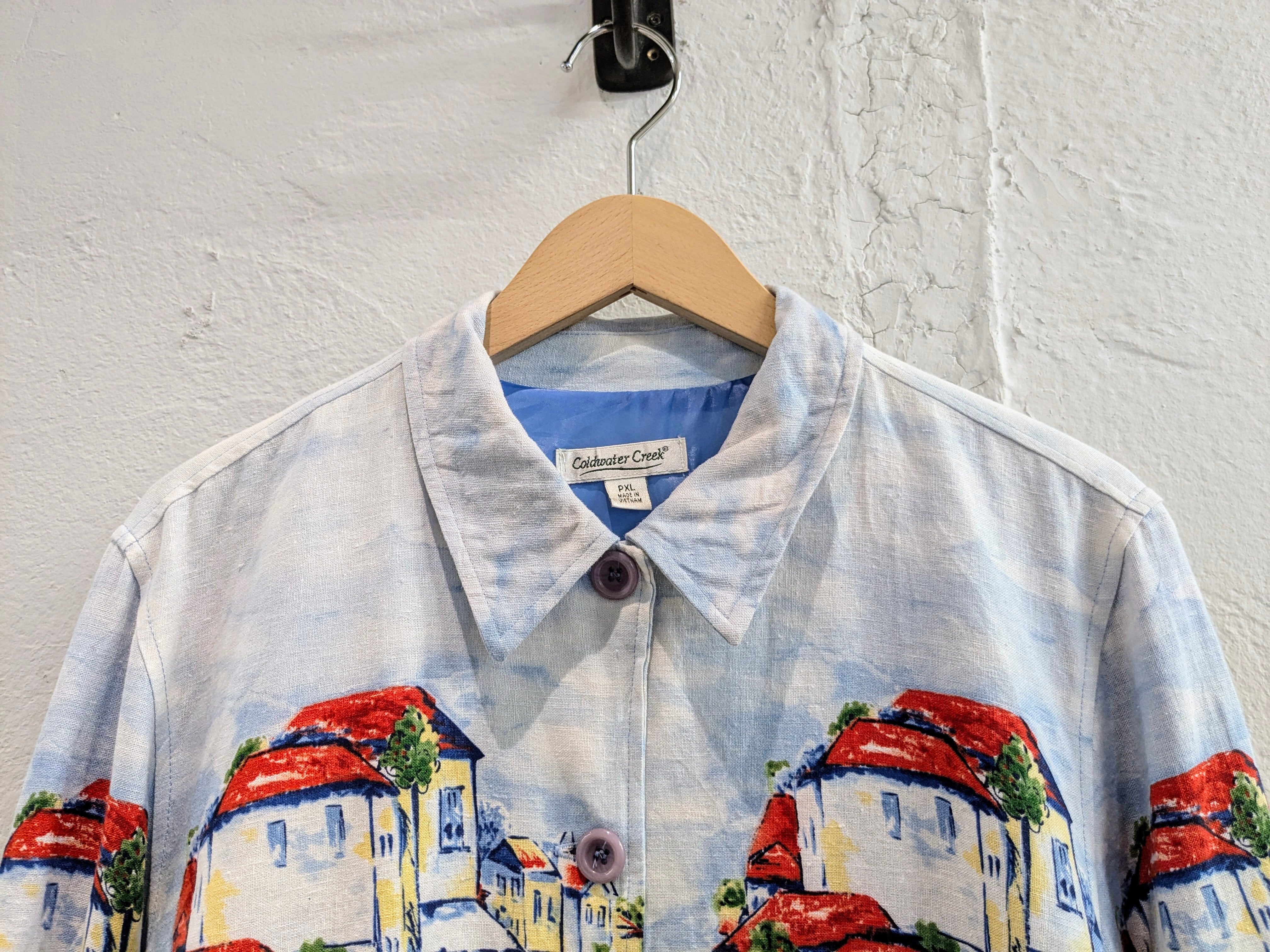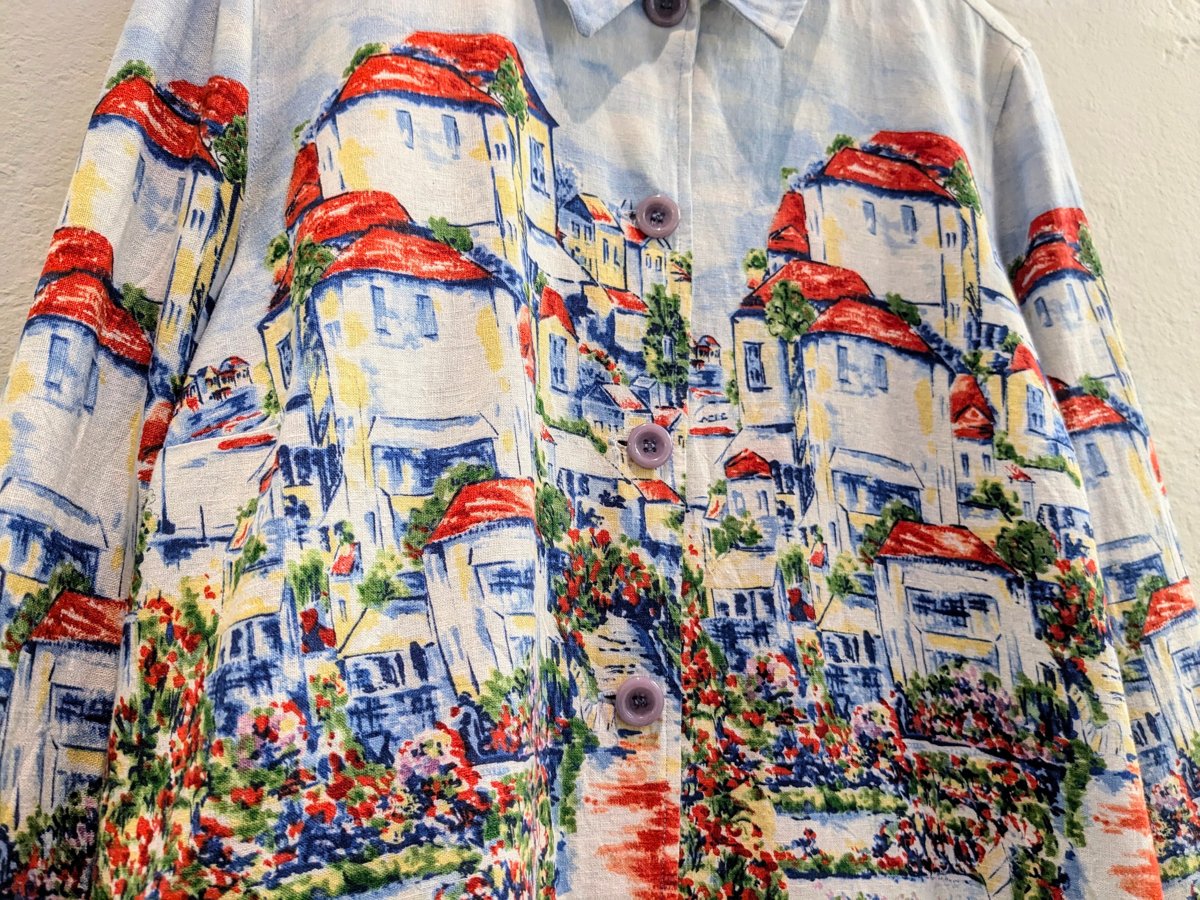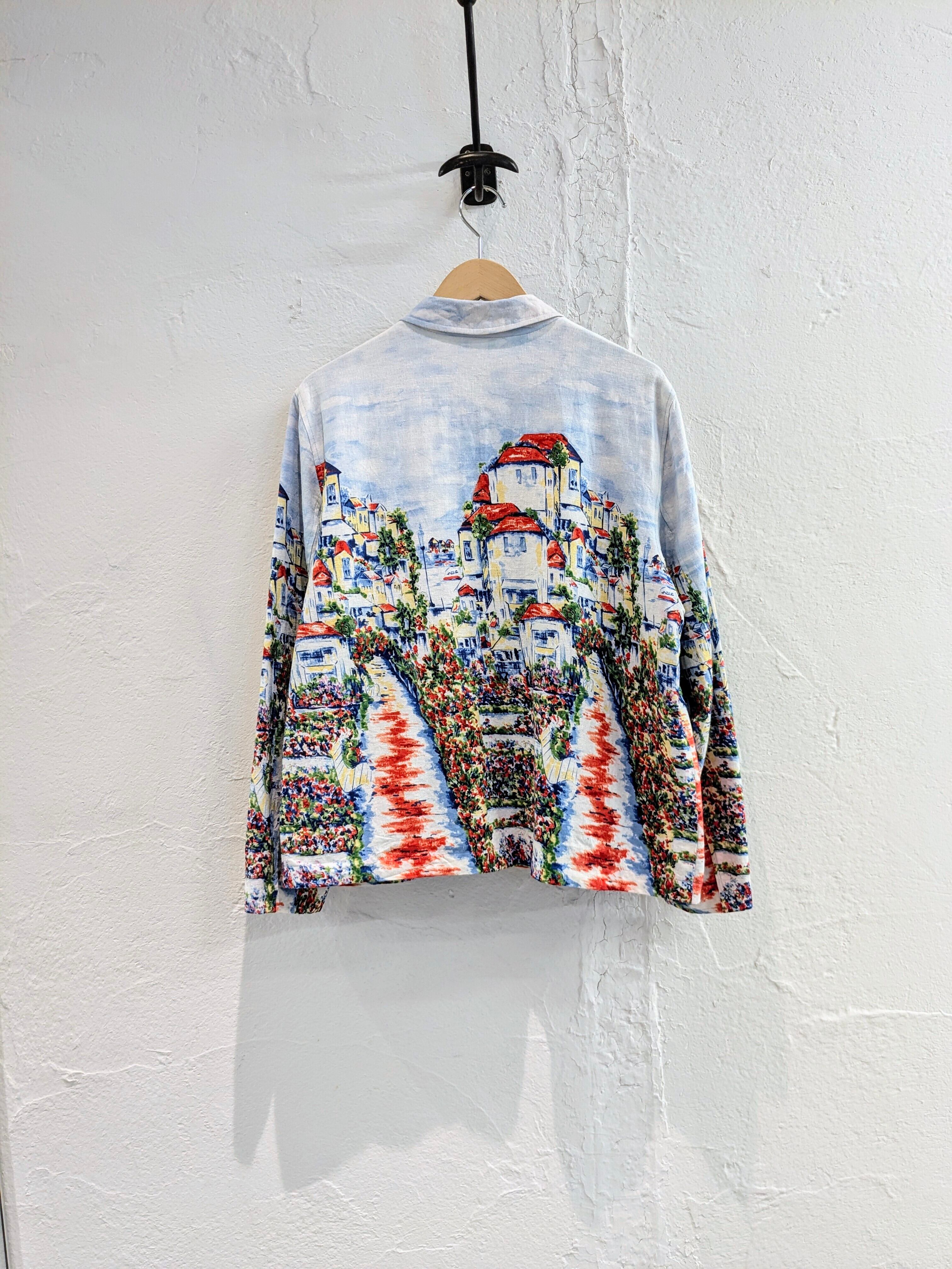 手描きで描いたようなタッチで、街並みが描かれています。パッと見た時に惹かれた一着。裏地は付いていますが、表地がリネン、レーヨンととても軽い素材となっています。色合いもとても綺麗でなかなか見ることのないデザインかと。