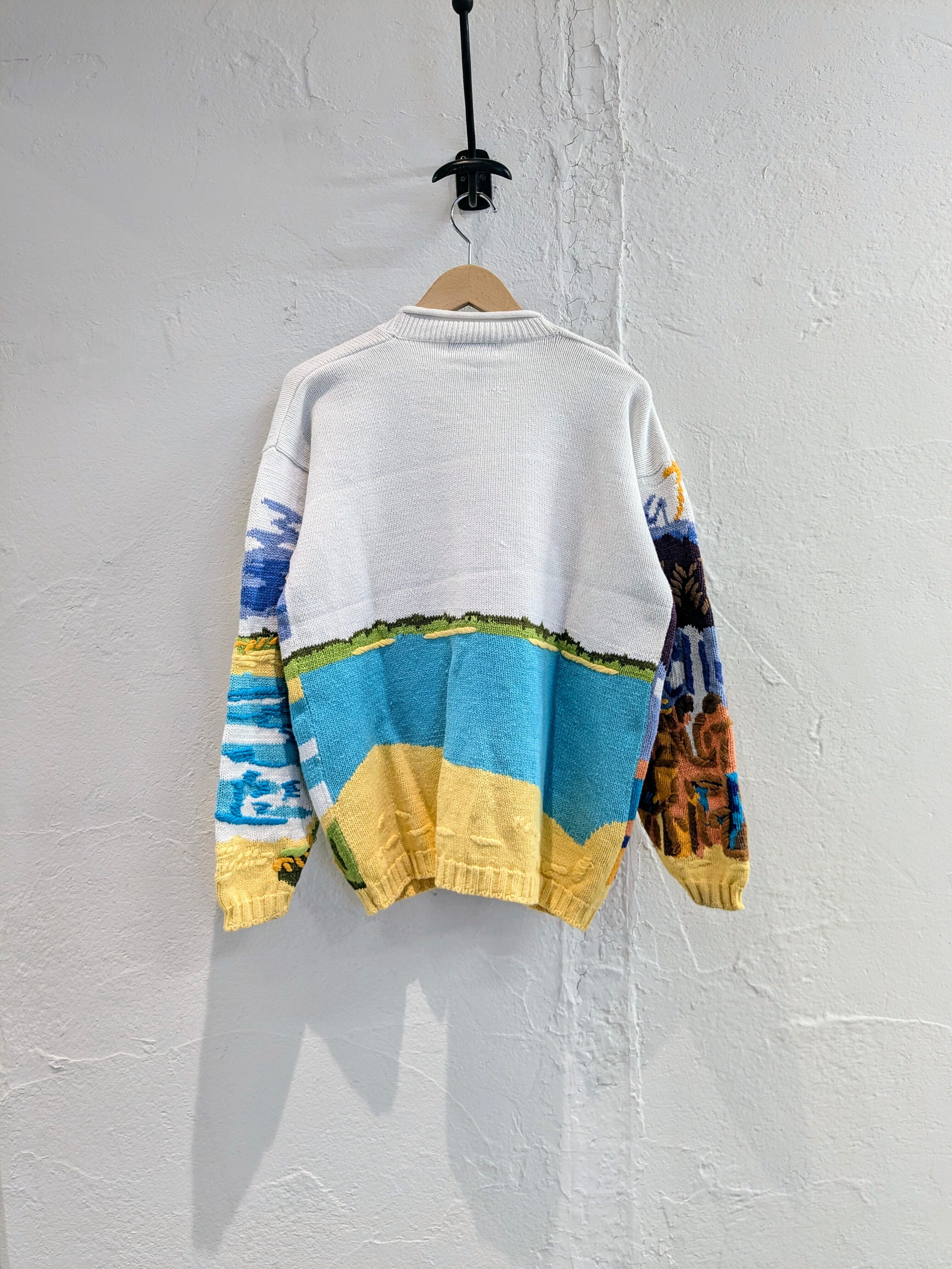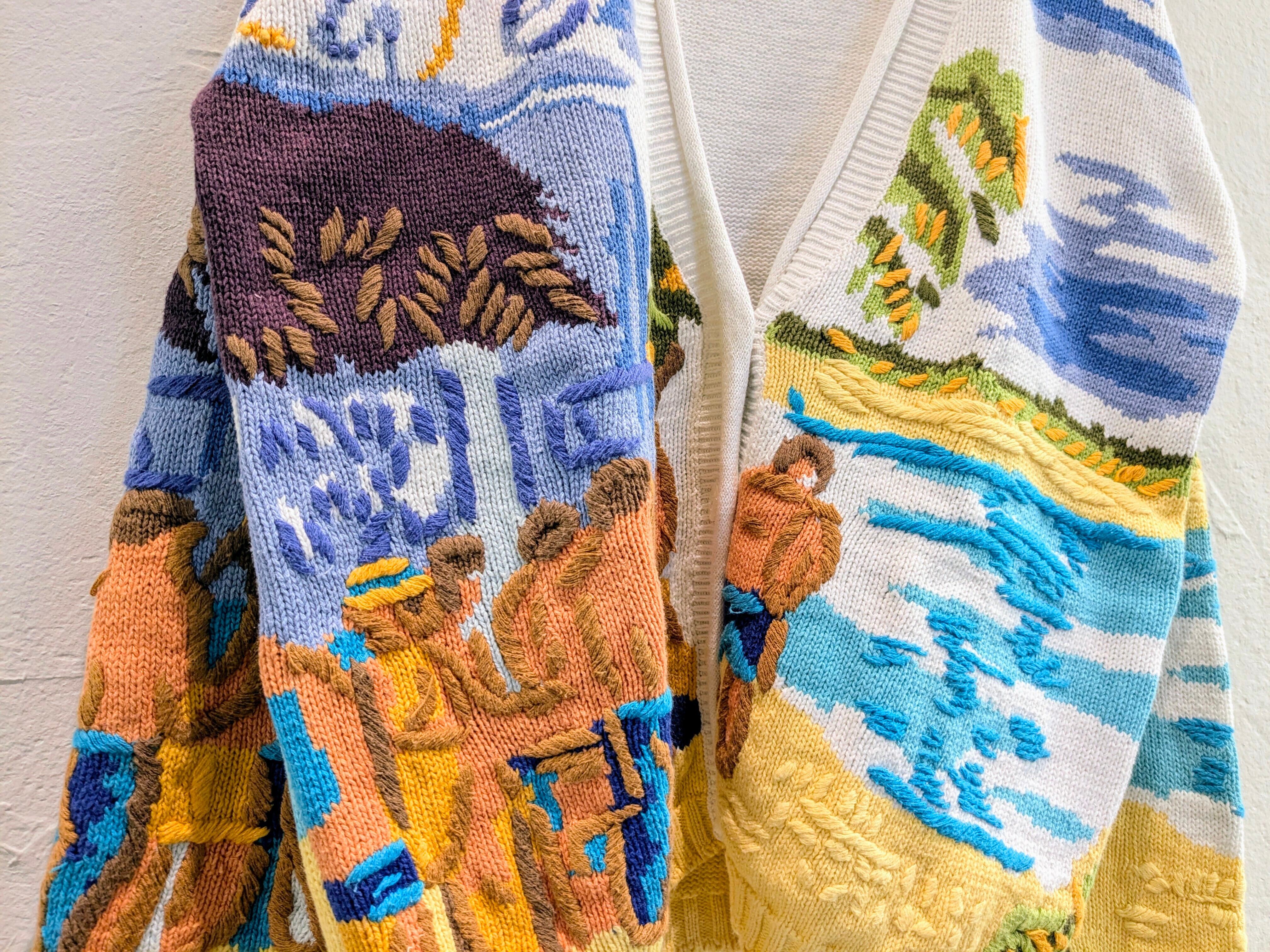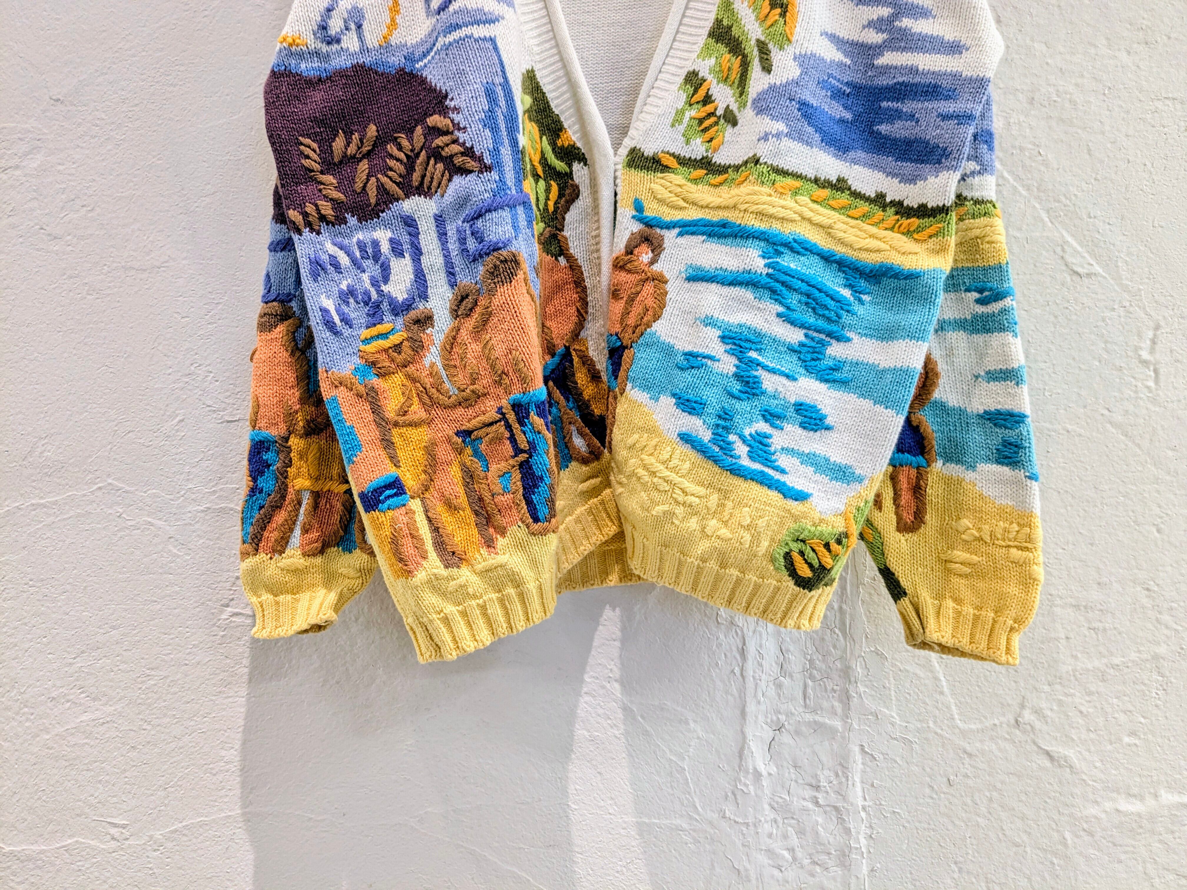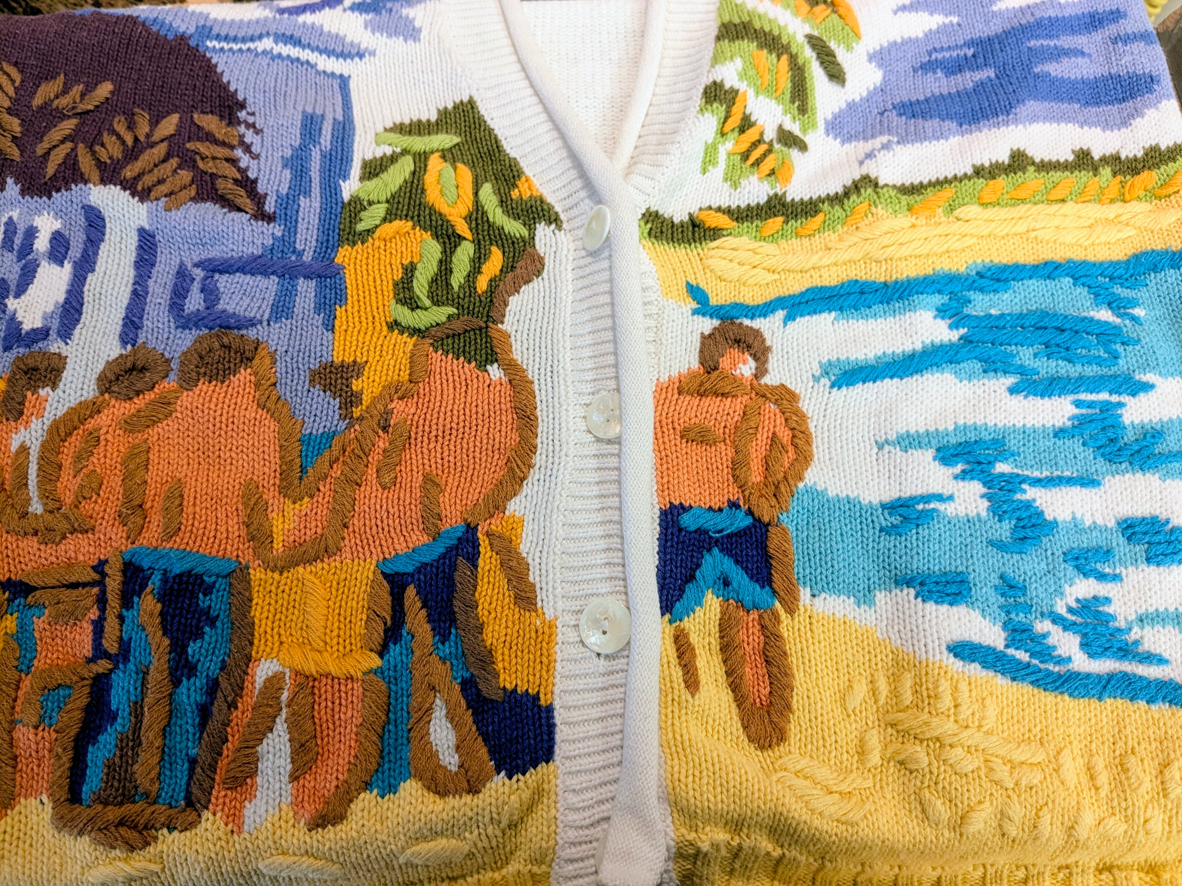 水辺に人がいるように見えるのですが、何をしているところを切り取っているのか分かりかねてしまいます。ただ、色合い、刺繍などとても綺麗で目を引く一着。コットン、ラミーでほぼ通年お使いいただけます。汚れあり。