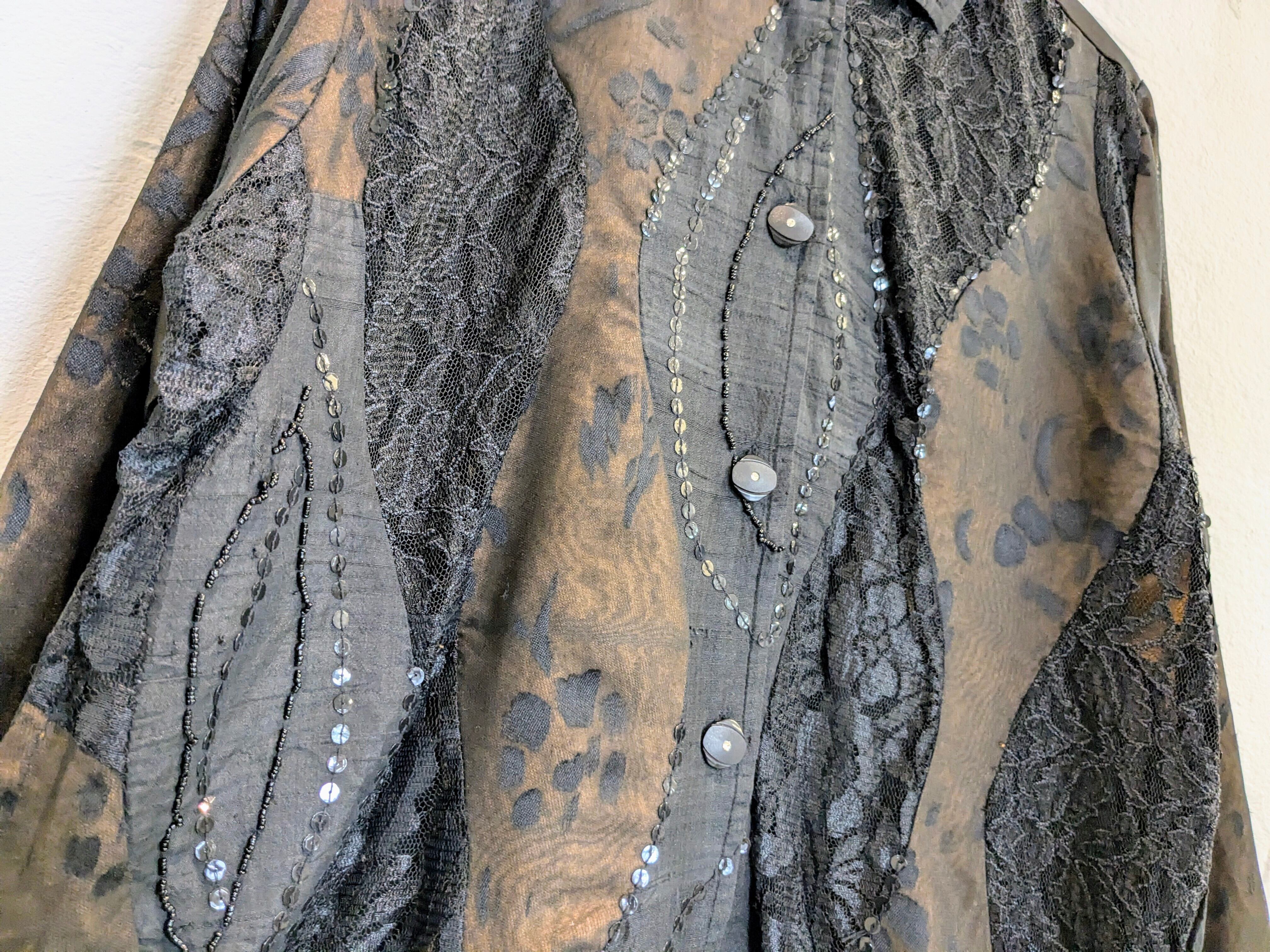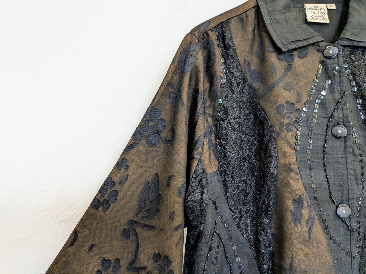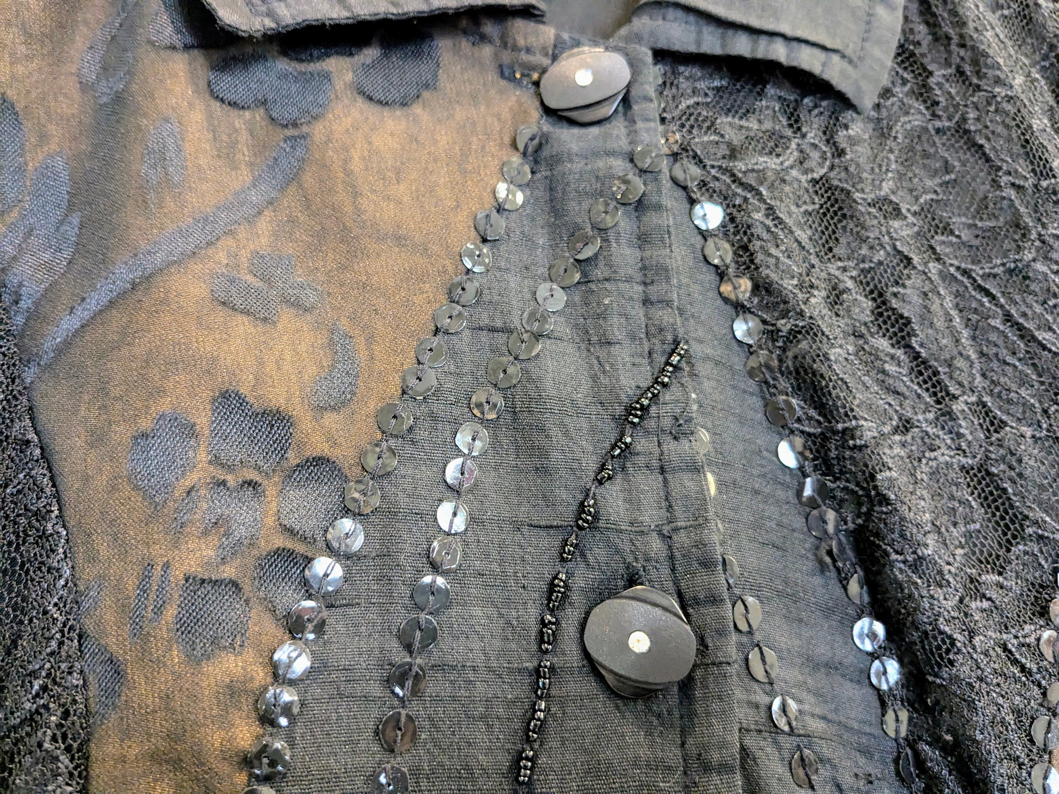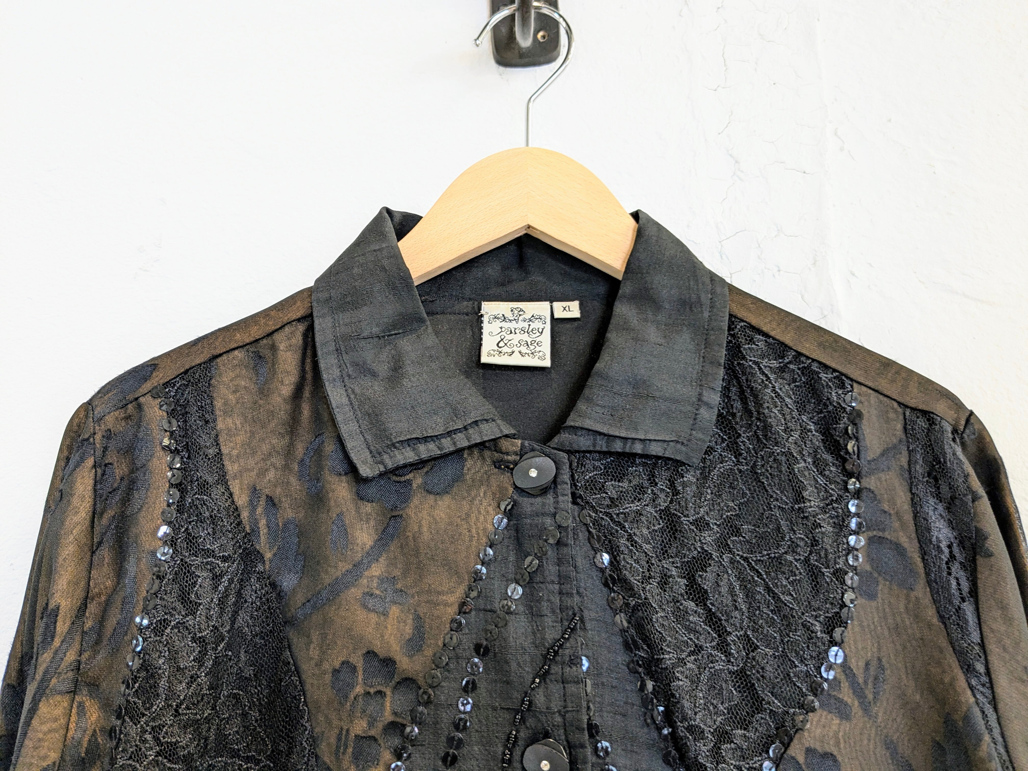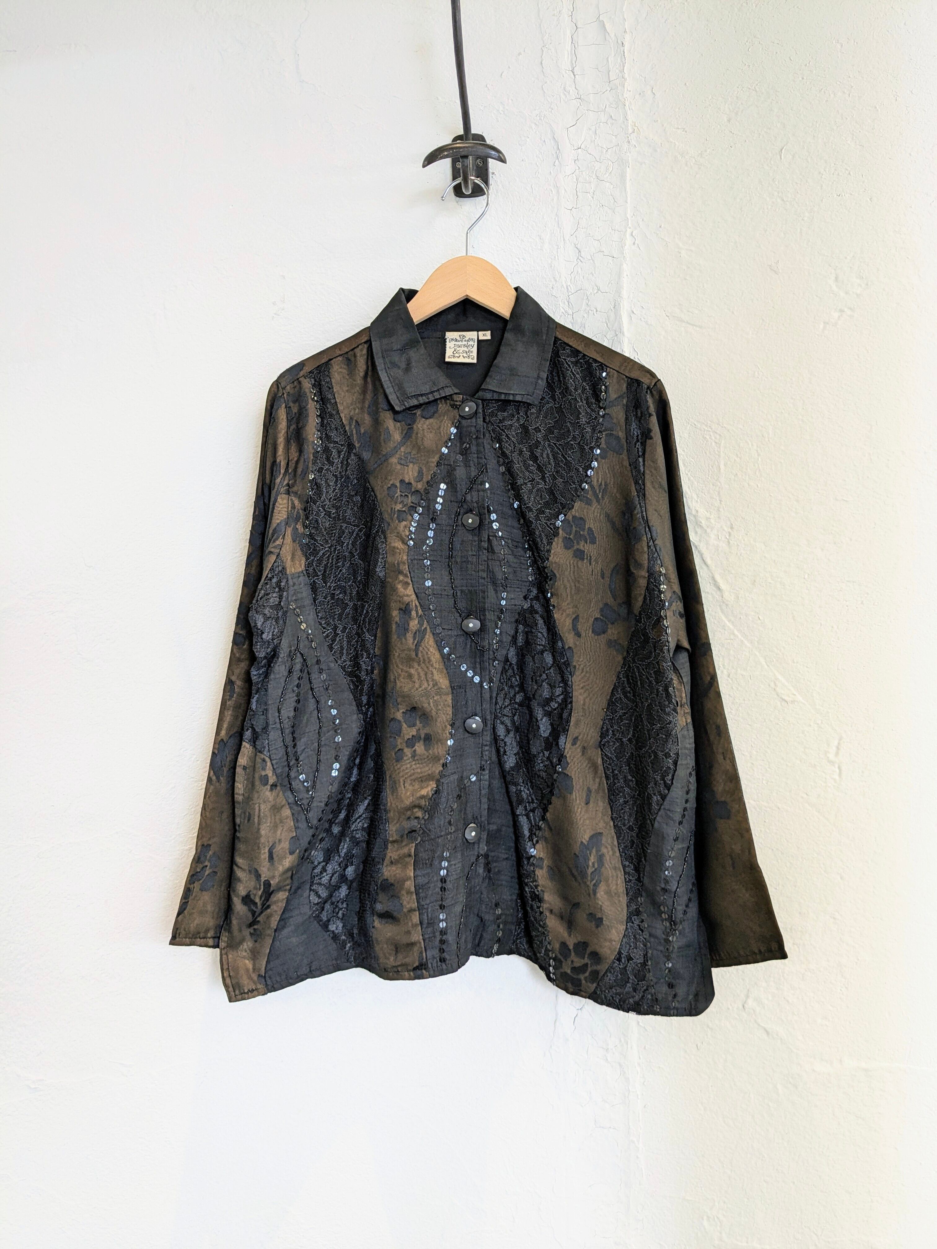 シアー、レース、スパンコールのデザインシャツ。