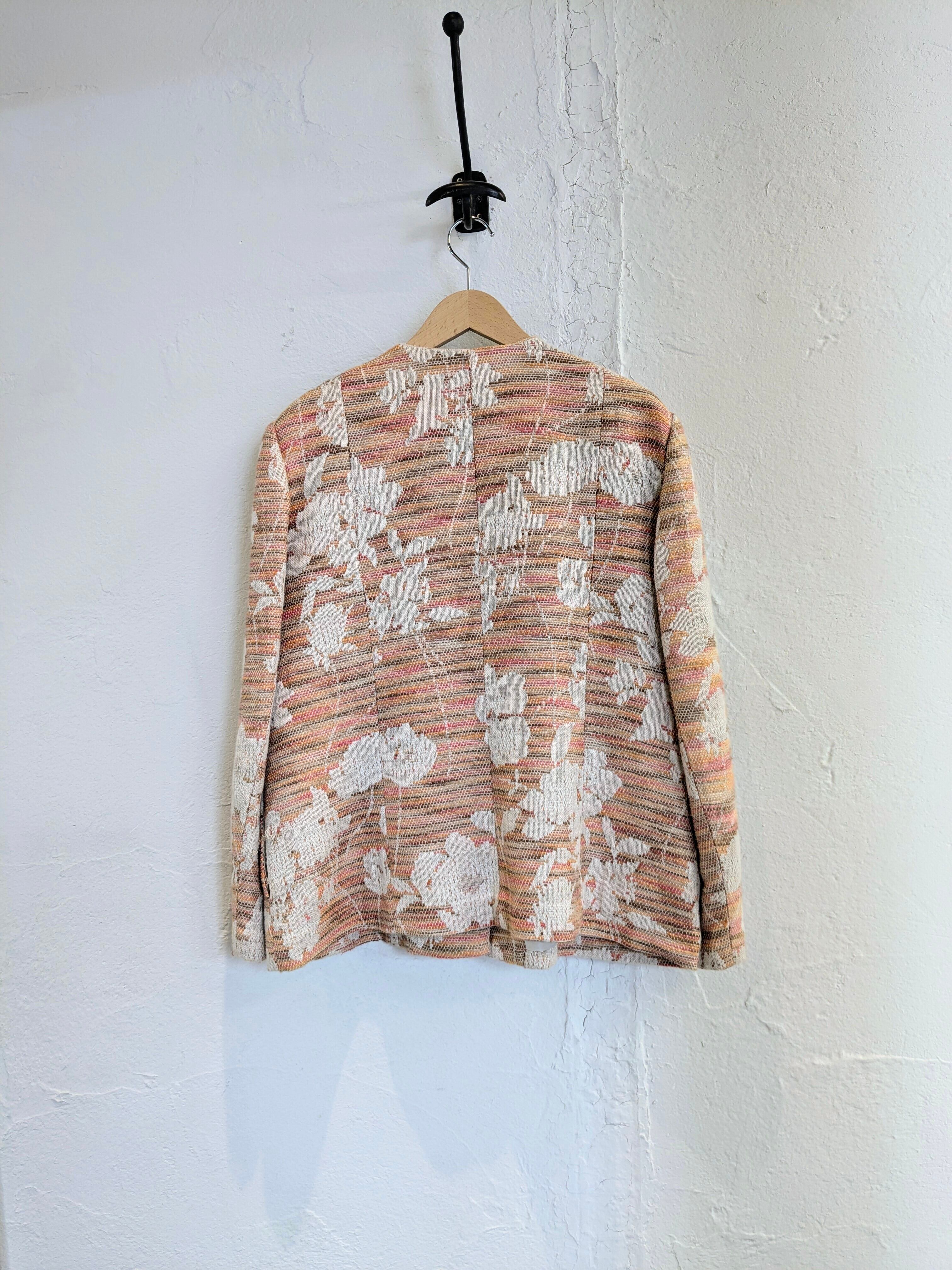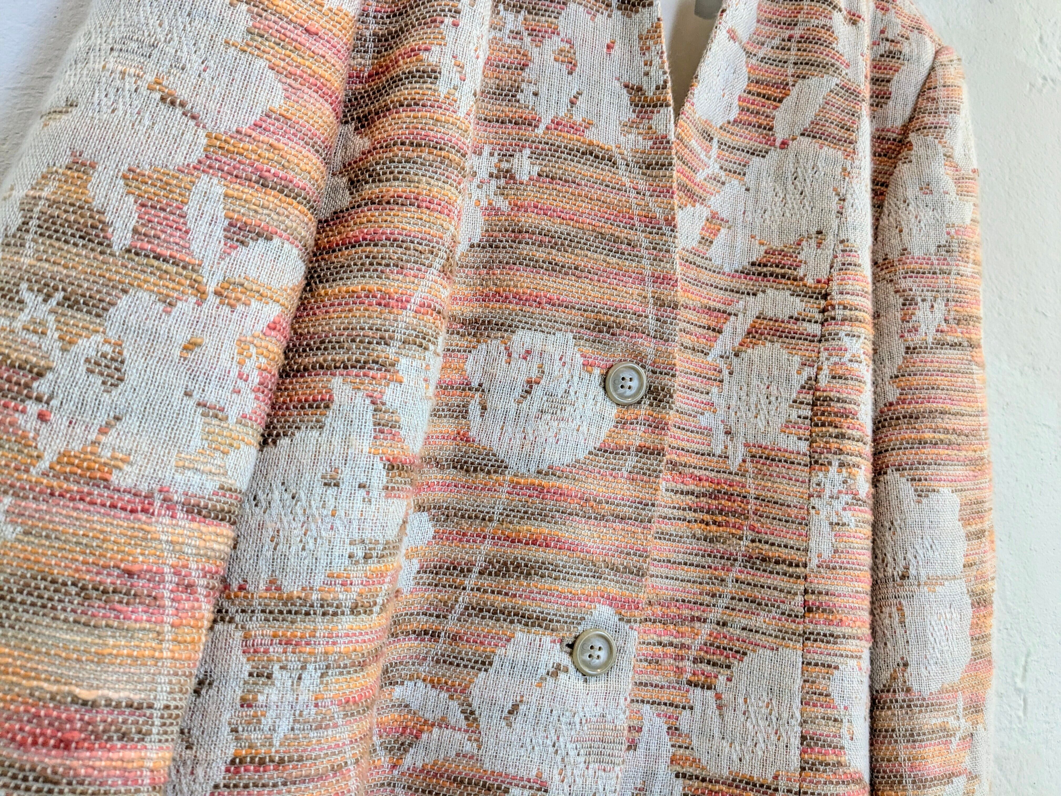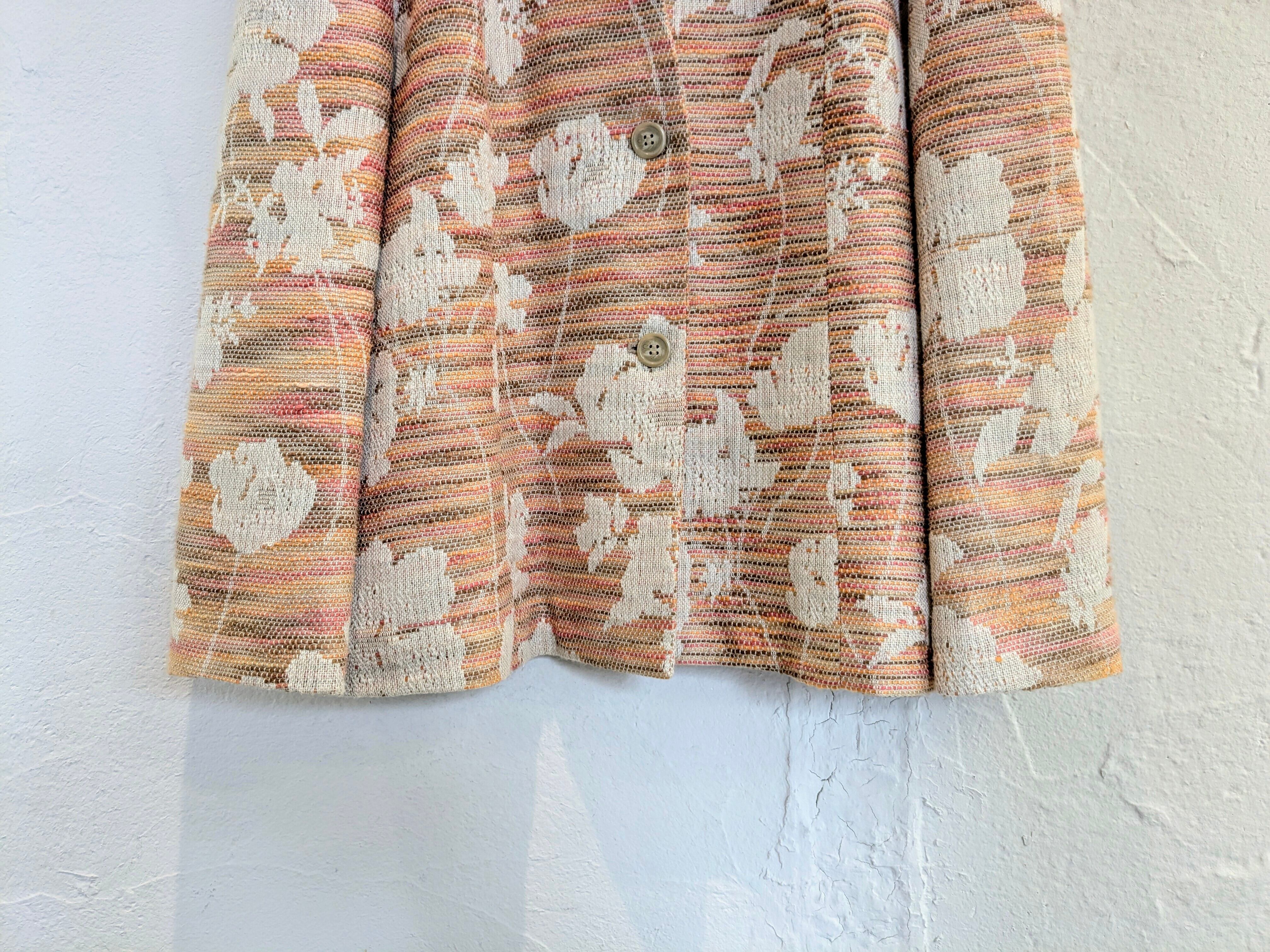 柄などがちょっとハッキリとは分からないのですが、おそらく植物とかを型抜きしてあるようなデザインになるかと思います。ピンク、オレンジなどの色を多色、パターンで編んであり、すごく手のこんだ作りの一着。色合いは柔らかく、ベージュらライトブルーなどのボトムスと合わせてもいいかと。キズあり。