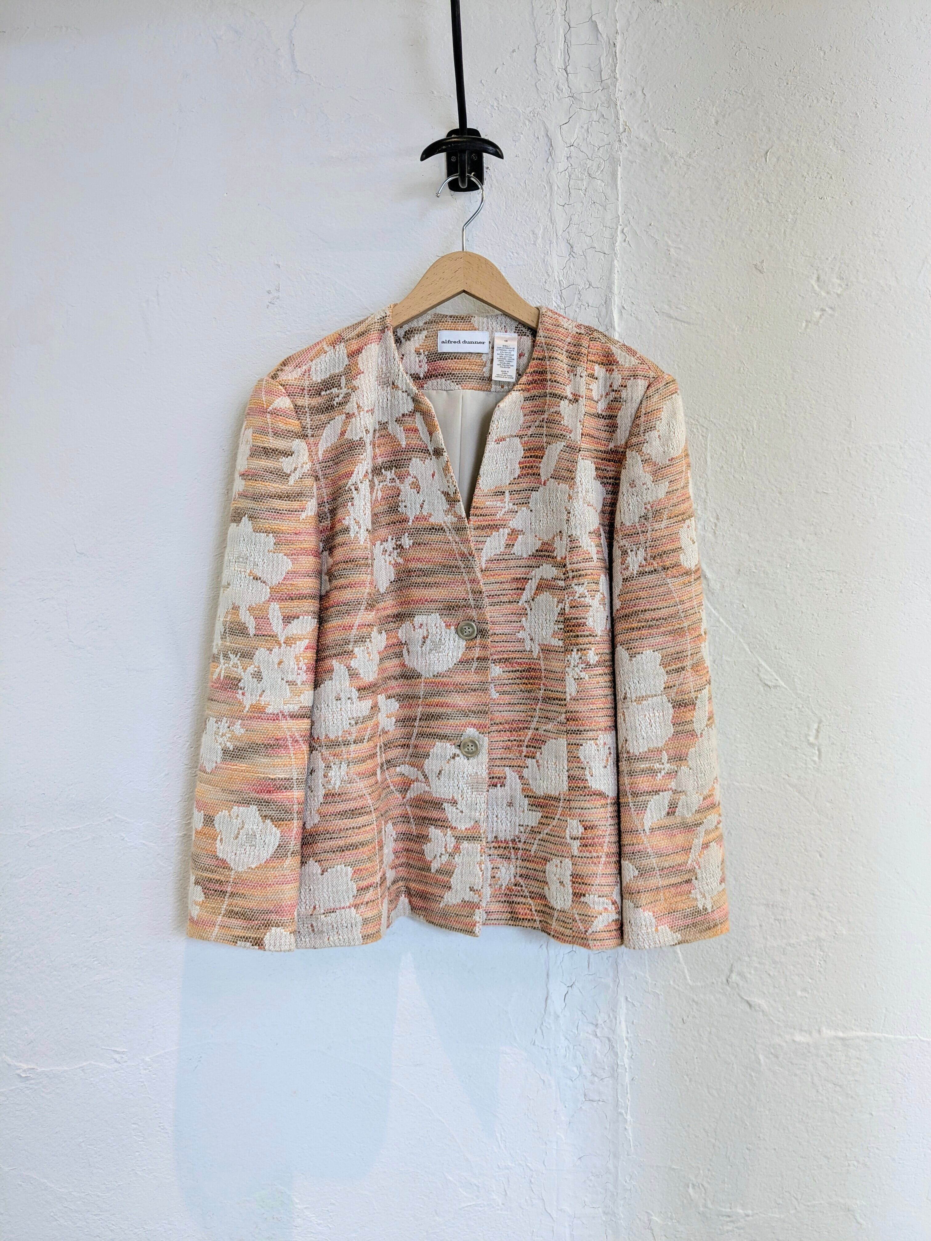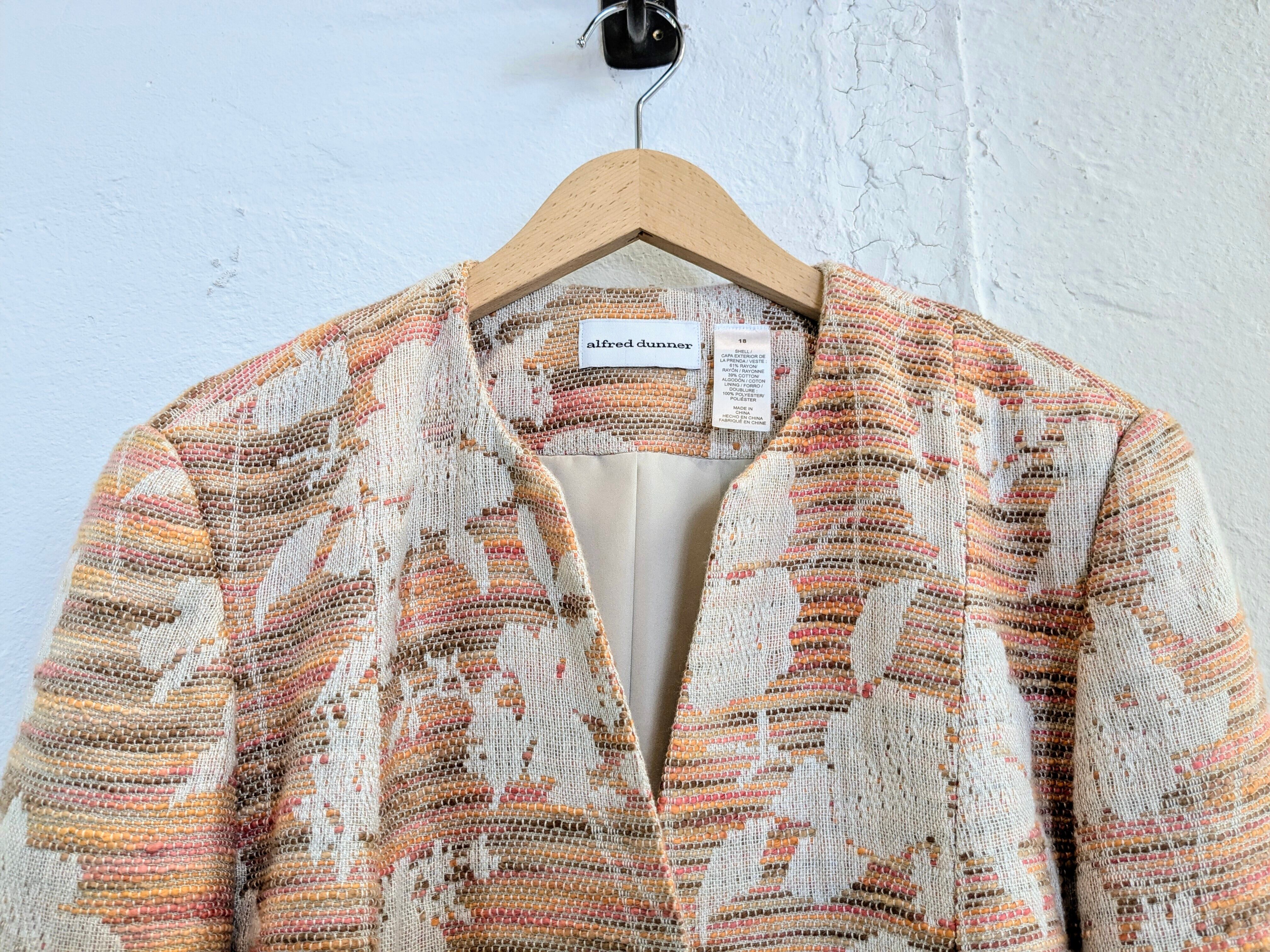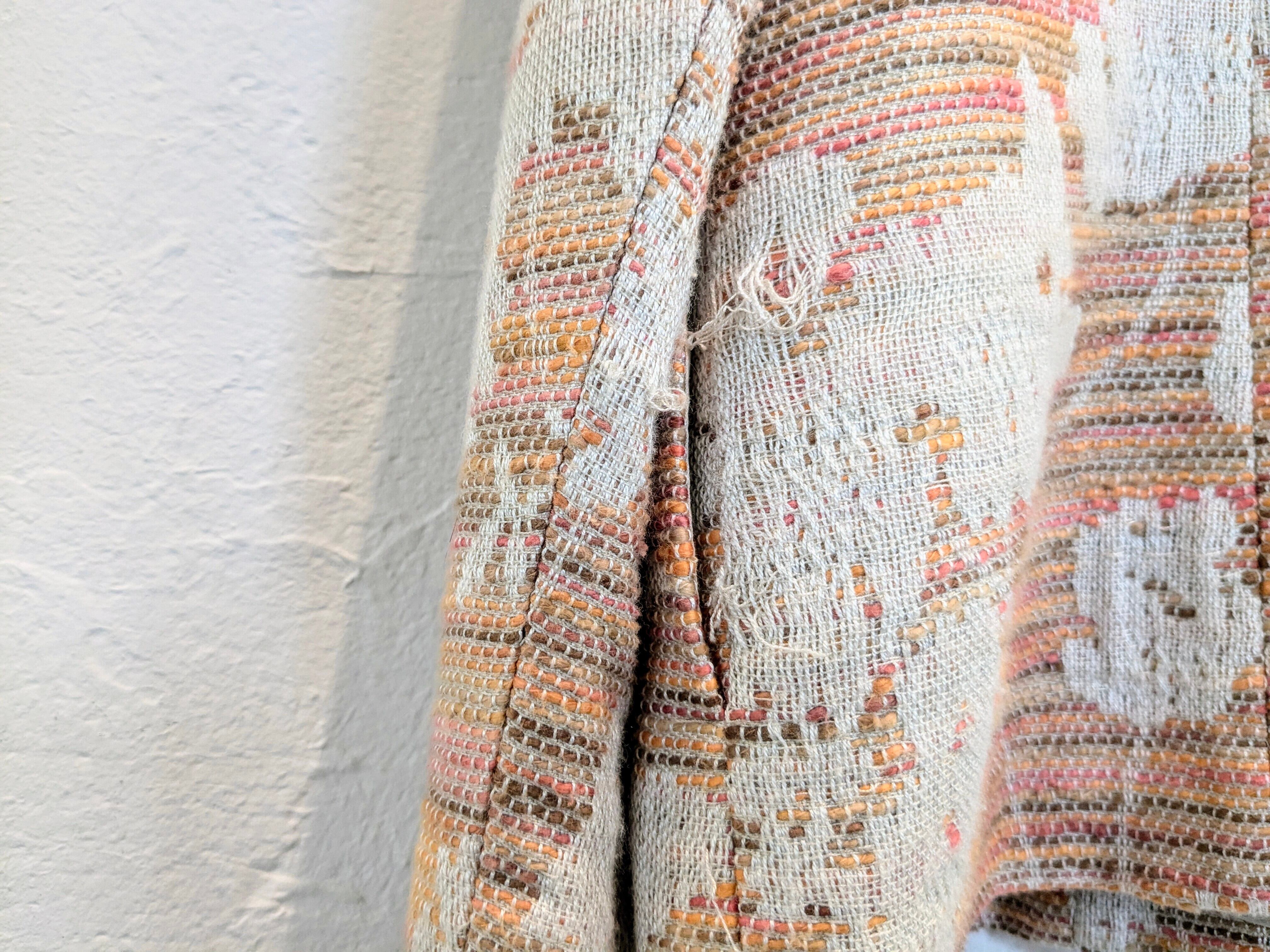 柄などがちょっとハッキリとは分からないのですが、おそらく植物とかを型抜きしてあるようなデザインになるかと思います。ピンク、オレンジなどの色を多色、パターンで編んであり、すごく手のこんだ作りの一着。色合いは柔らかく、ベージュらライトブルーなどのボトムスと合わせてもいいかと。キズあり。