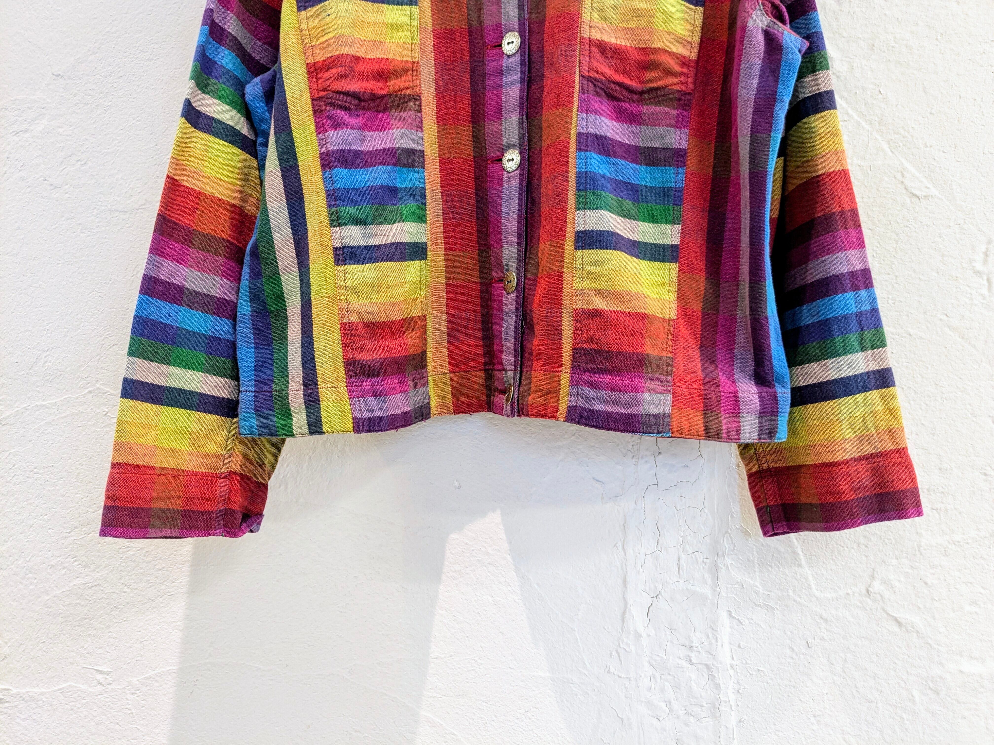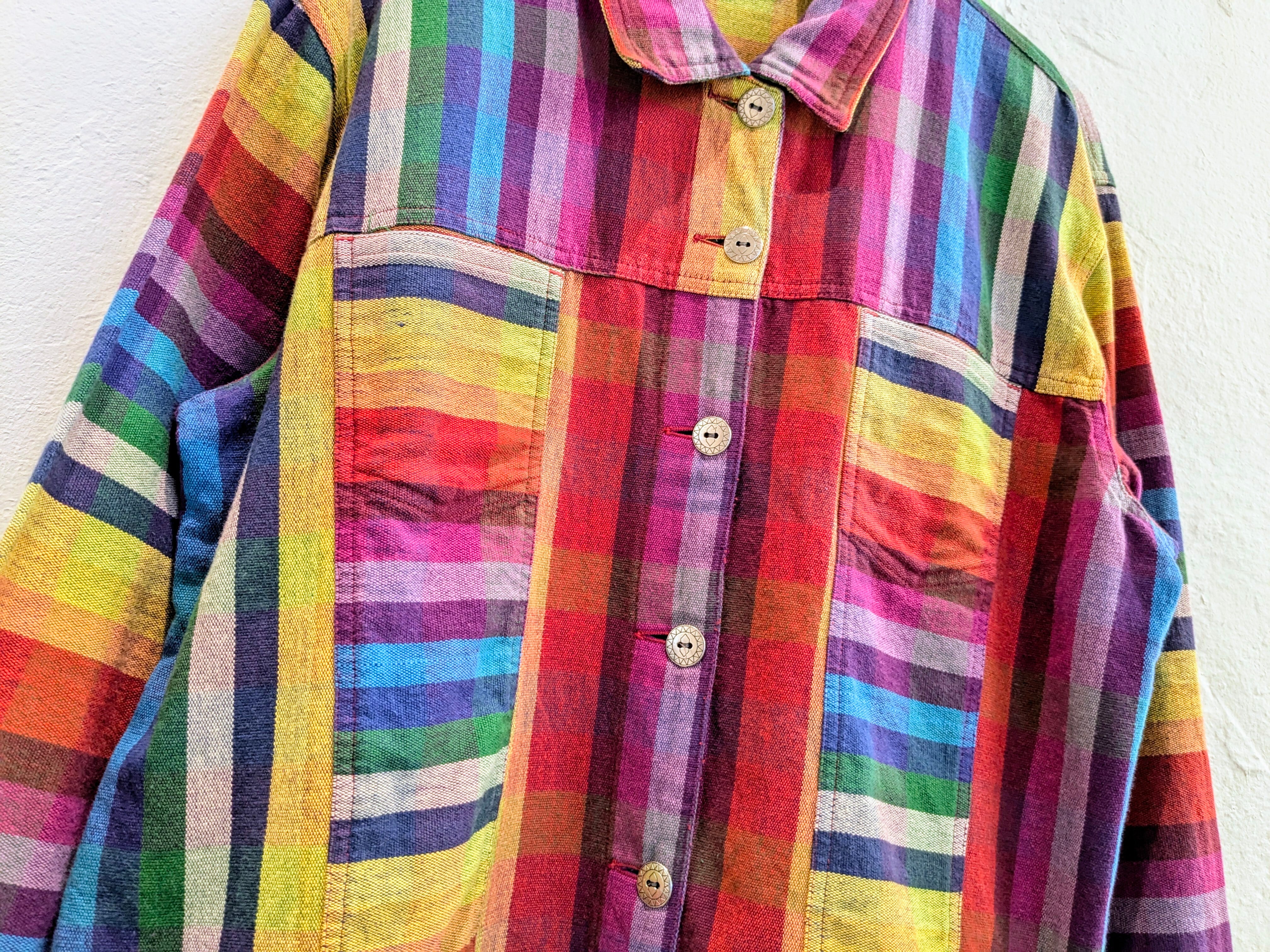 ボタンにも太陽のような刻印があり、虹をコンセプトに作ったのでは?と思わせる一着。丈はショートでとてもバランスがいいサイズ感。生地も柔らかく、肩ひじ張らず少し厚手のシャツ感覚で使えるアイテム。もちろん、上にジャケット、コートなども羽織れるくらいのアイテムで、使い勝手の良さ、着れる時期の長さなど万能なアイテムとなっています。