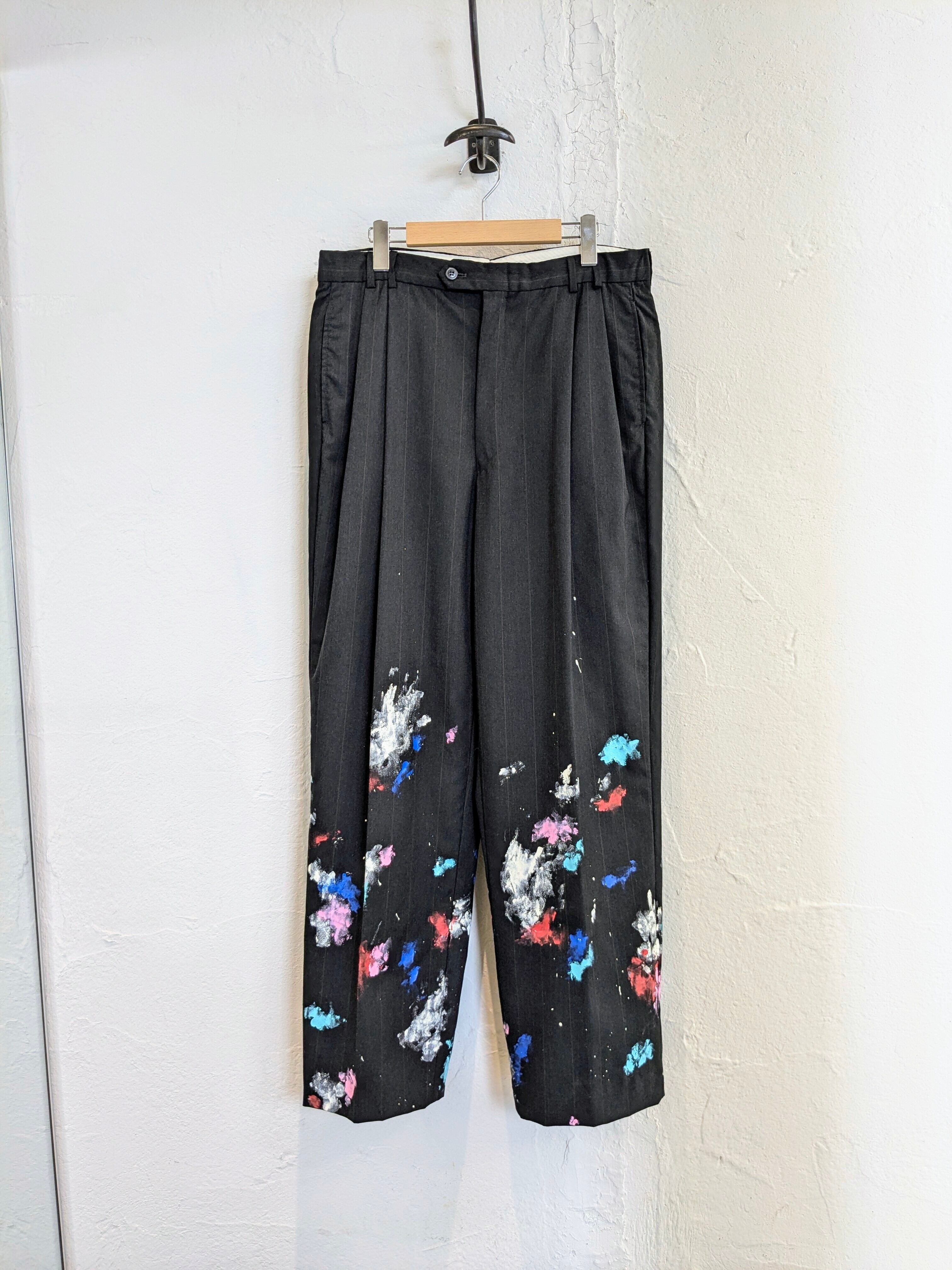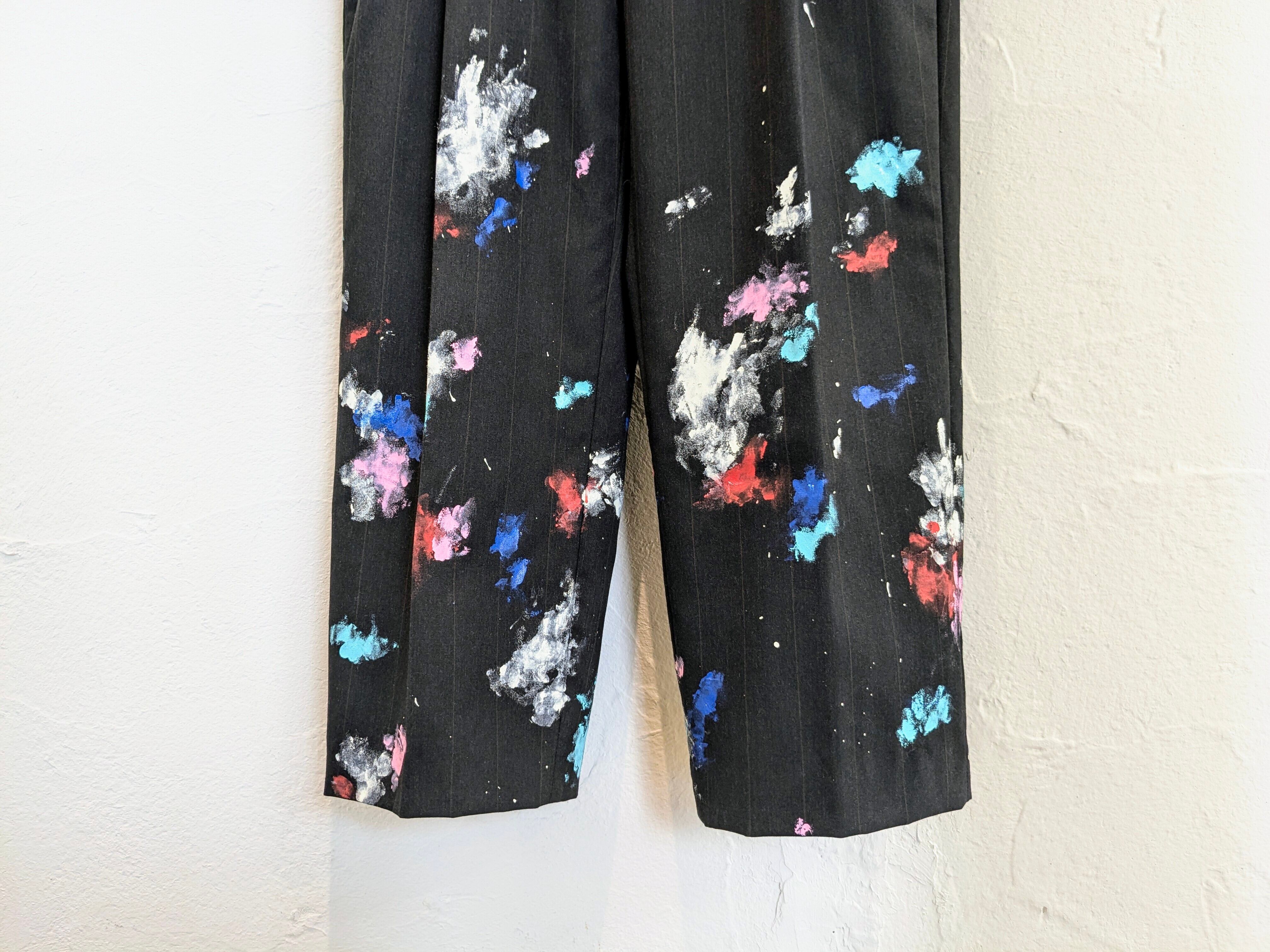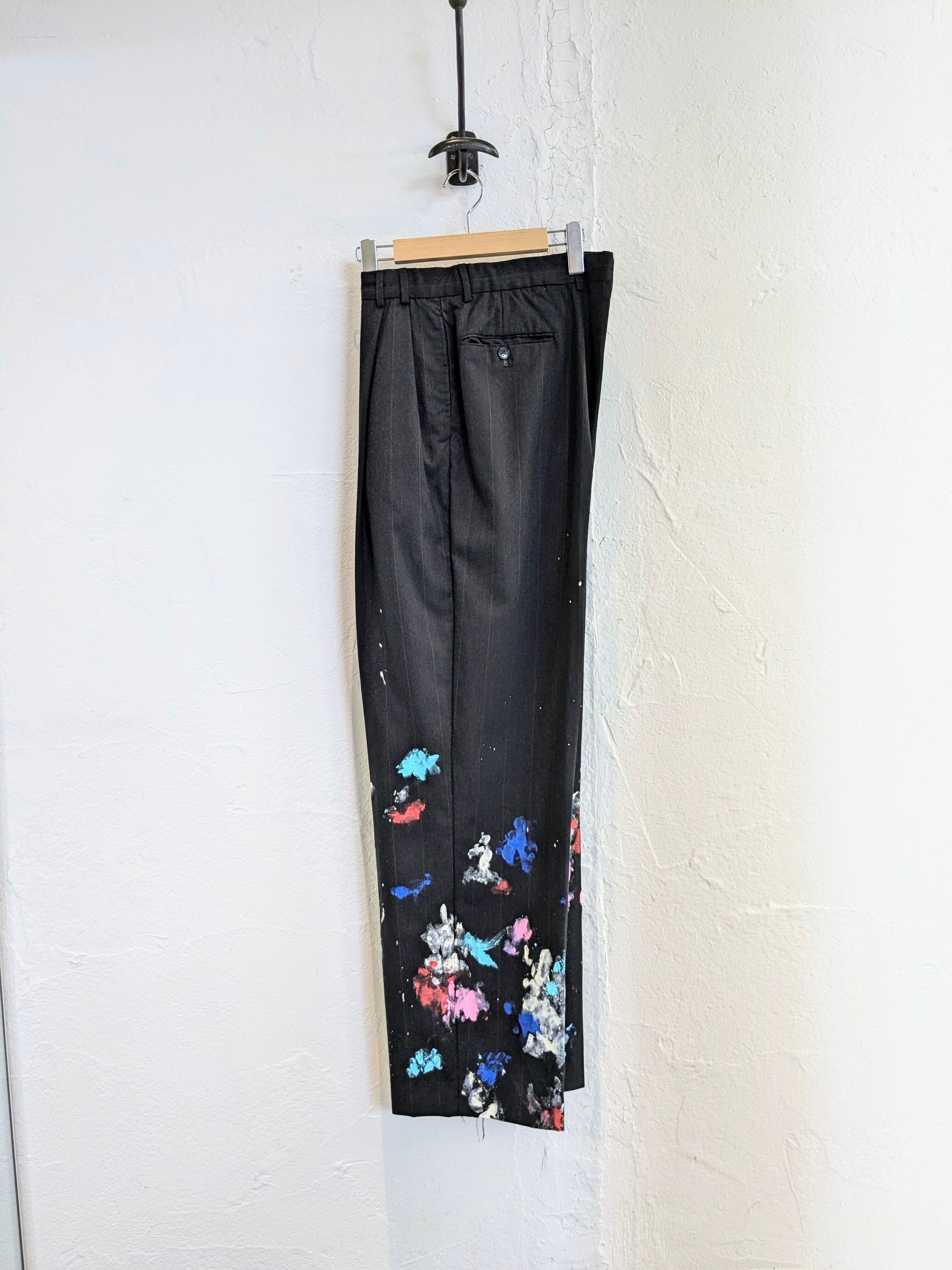 Artistic Painted Stripe Double-Breasted Jacket の対のパンツ。裾の方にペイントがされており、スタイリングの下から上まで目がいくようになるアイテム。パンツだけでも使いやすいので、セットアップでなくセパレートでもお使いいただきやすいかと。ツータック、ゆるっとしたルーズなシルエットがたまらなく、新毛ウールを使用しているので、重厚感、高級感が感じられるアイテムとなっています。