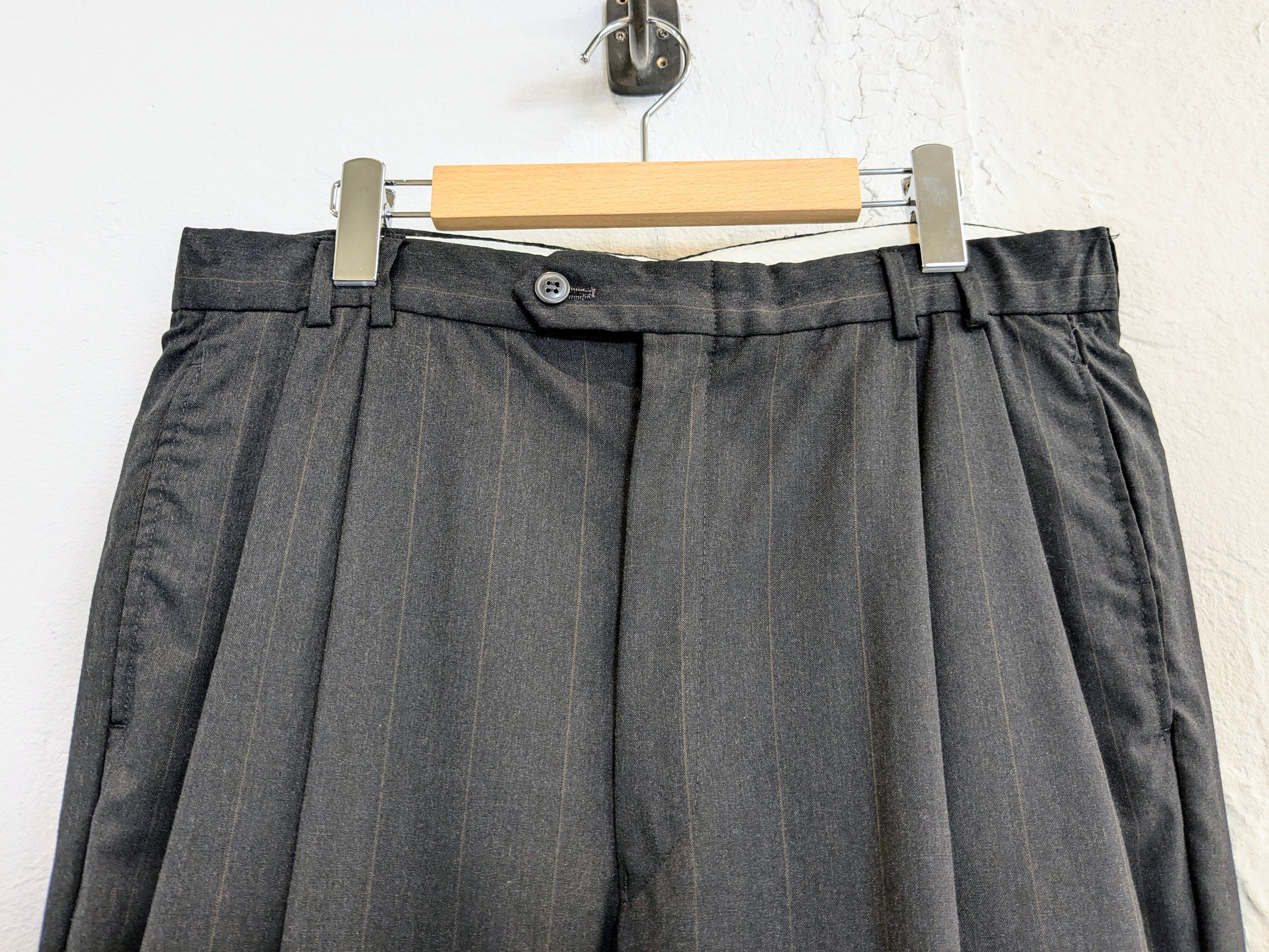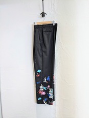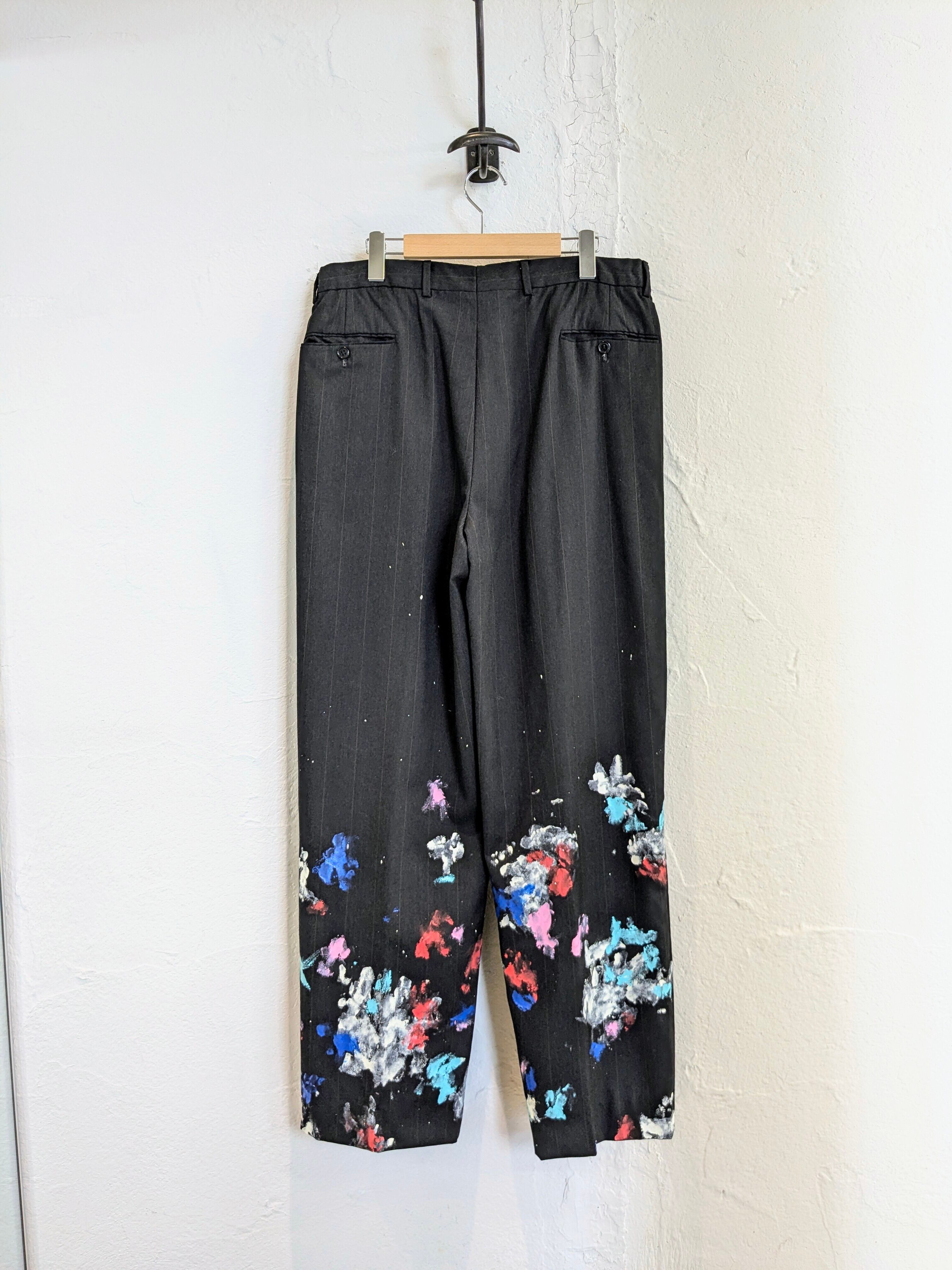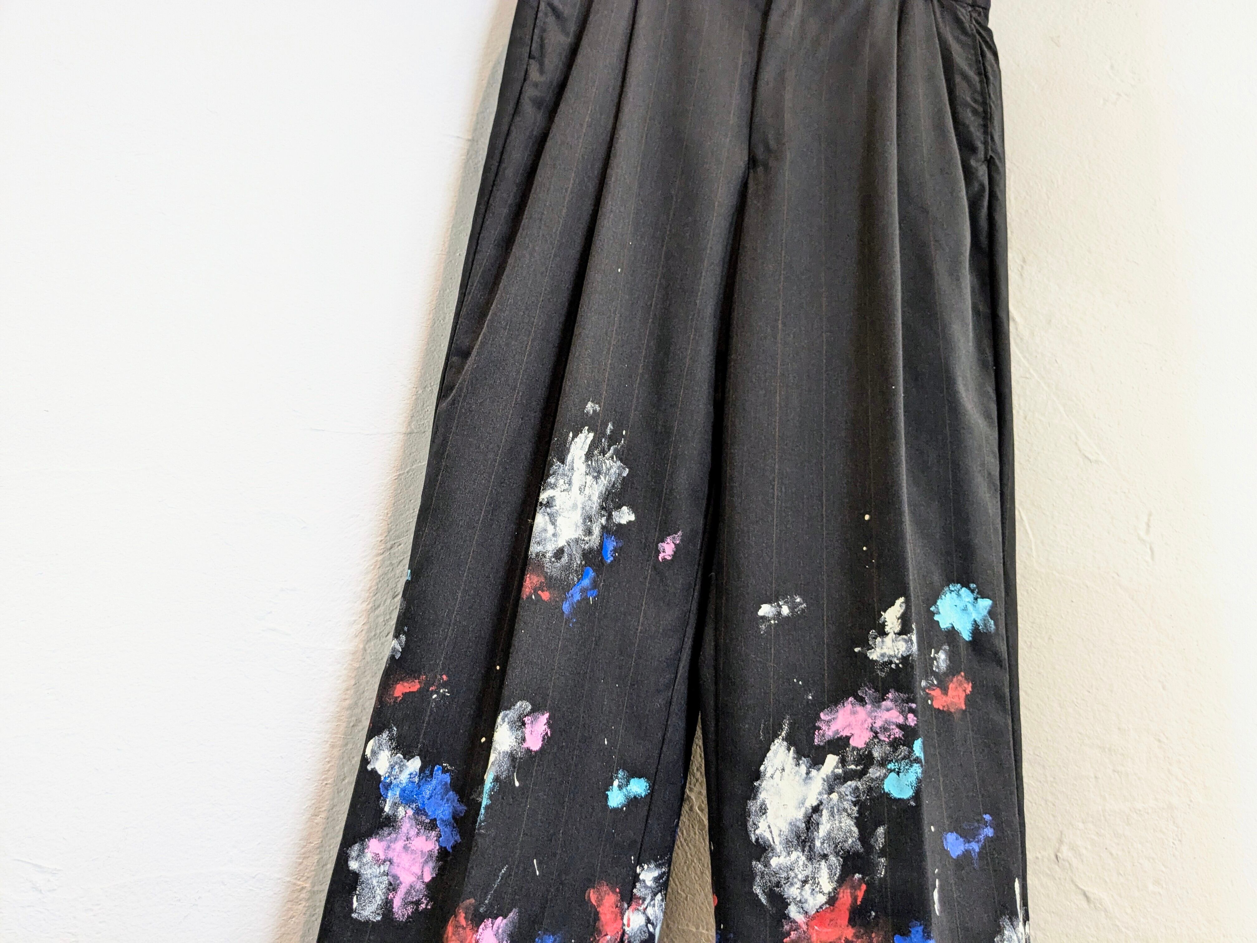 Artistic Painted Stripe Double-Breasted Jacket の対のパンツ。裾の方にペイントがされており、スタイリングの下から上まで目がいくようになるアイテム。パンツだけでも使いやすいので、セットアップでなくセパレートでもお使いいただきやすいかと。ツータック、ゆるっとしたルーズなシルエットがたまらなく、新毛ウールを使用しているので、重厚感、高級感が感じられるアイテムとなっています。