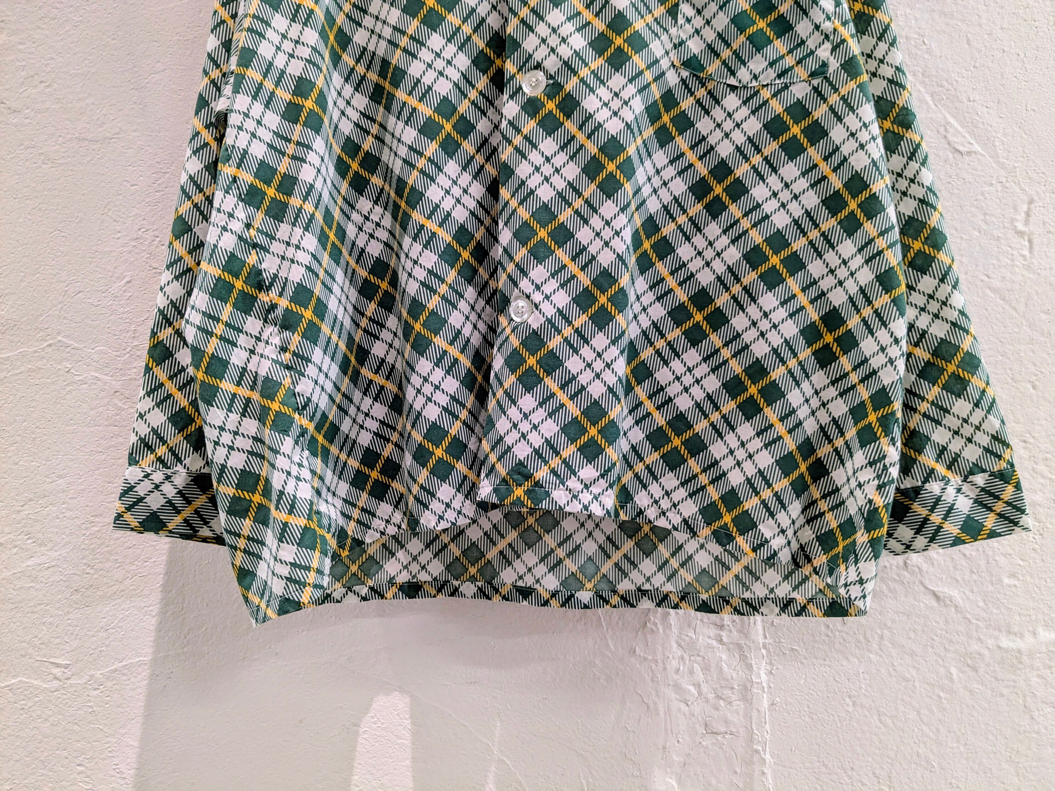 プリントのチェック柄、オープンカラー。スリーピングシャツになるかと思います。サラッとした素材感、透け感が出るくらいの生地感となっており、着れる時期も長くとっていただけます。どこかジャケットっぽくも見えるので、中にシャツを着てみたり、そういった着方もオススメです。