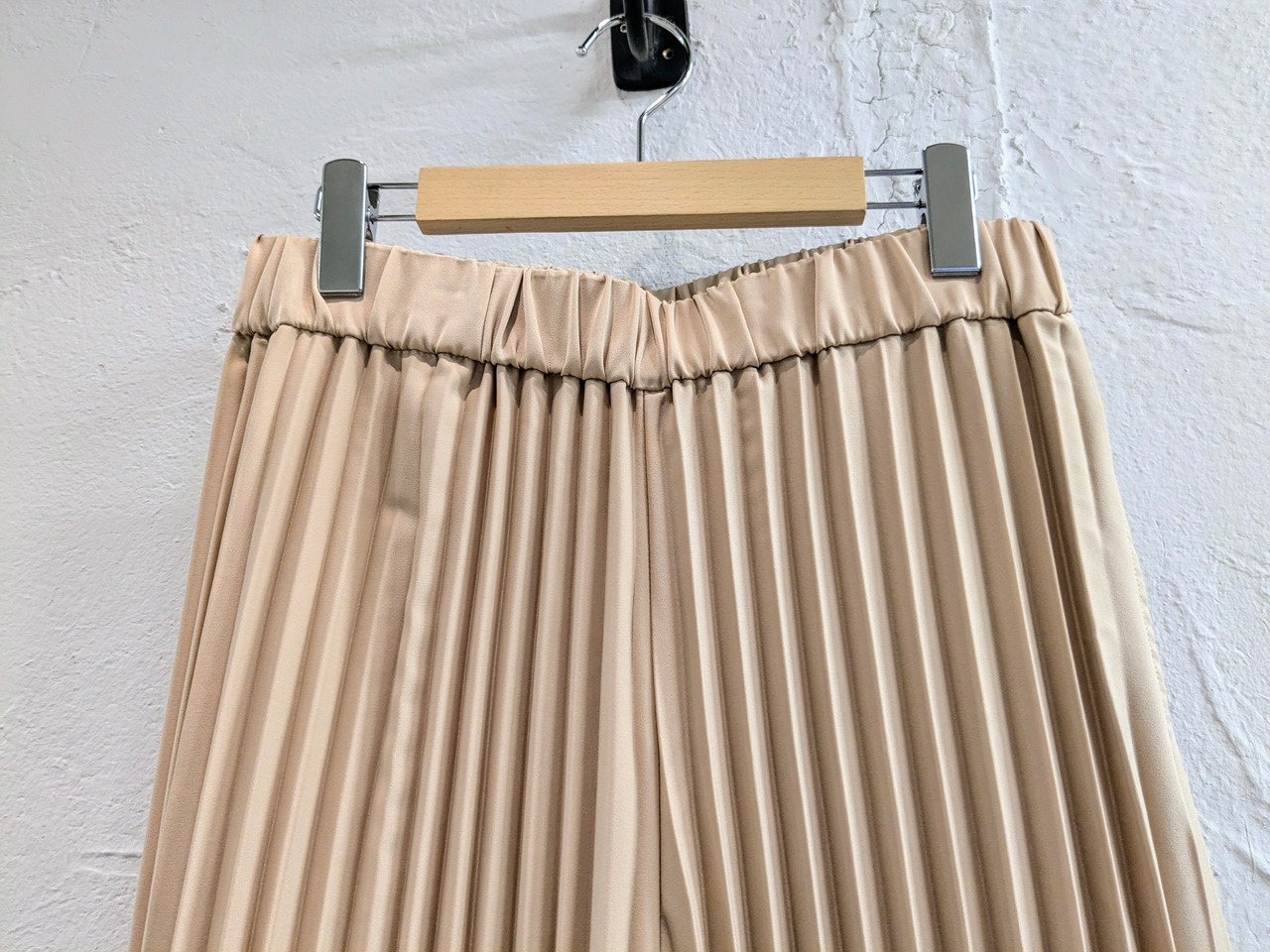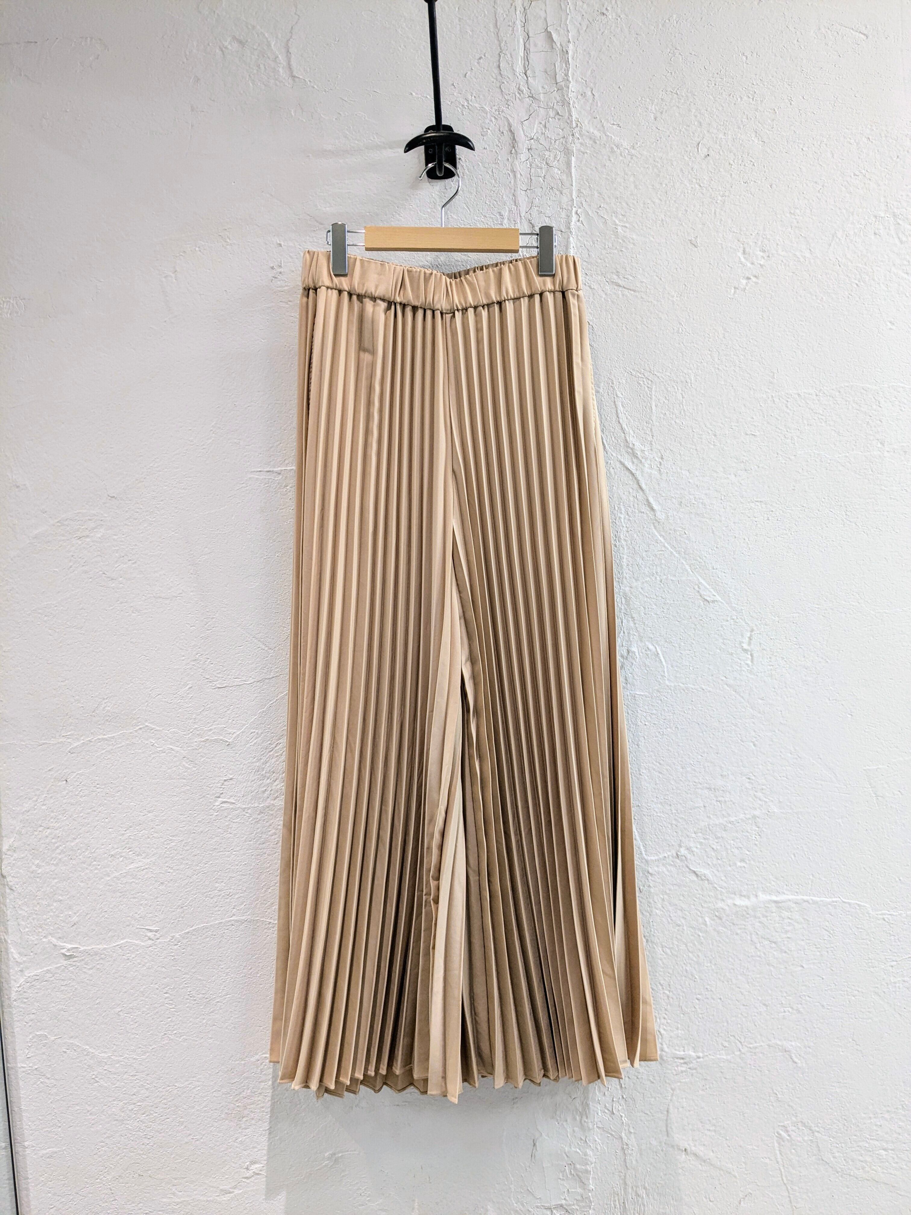 深めのプリーツが凹凸感でメリハリがあり、シンプルにならない一着。かなり太めのシルエットで、存在感があります。夏場はTシャツばっかりになるかたが多いかと思いますが、スタイリングの変化をつけるのにオススメ。