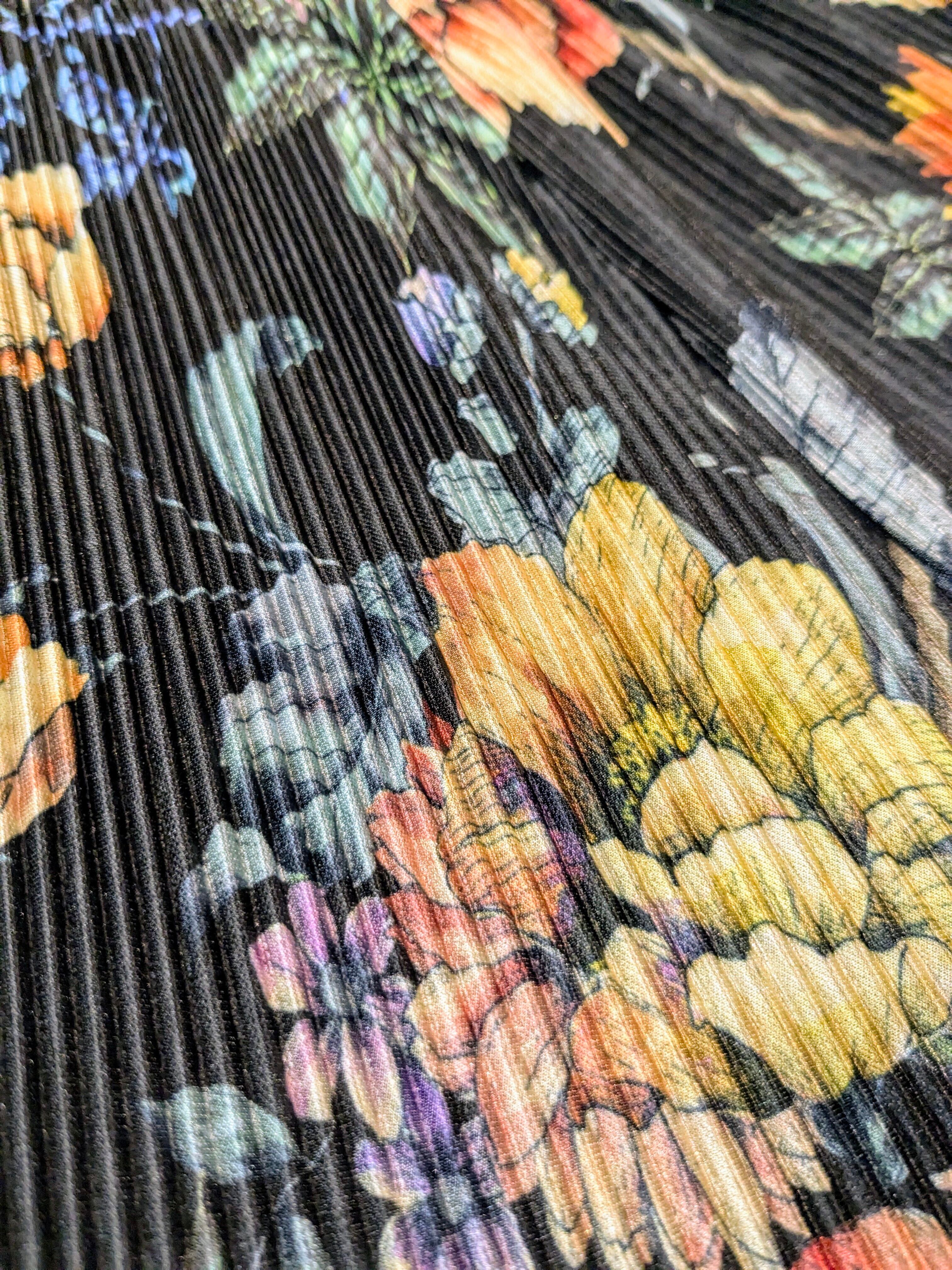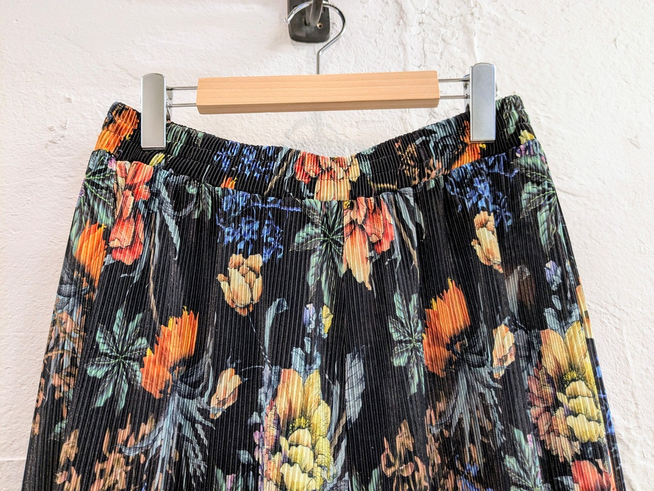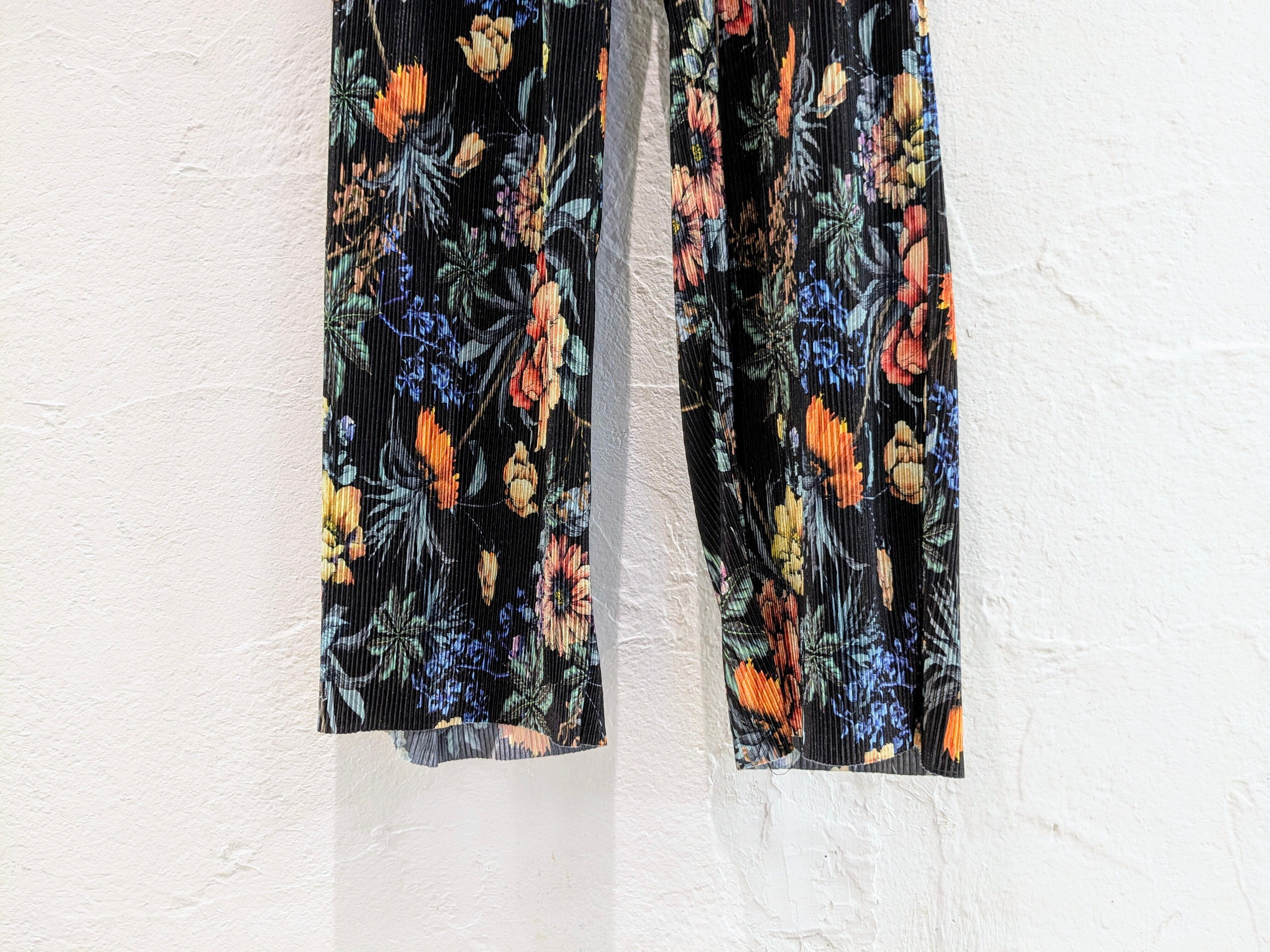 かなり上品なデザインで、デザイナーズとかにありそうなアイテム。ブラックのボディに色の花柄が映える一着。また、プリーツで凹凸感、表面変化があります。シンプルにTシャツに履くだけでも決まってしまう、そんなアイテム。