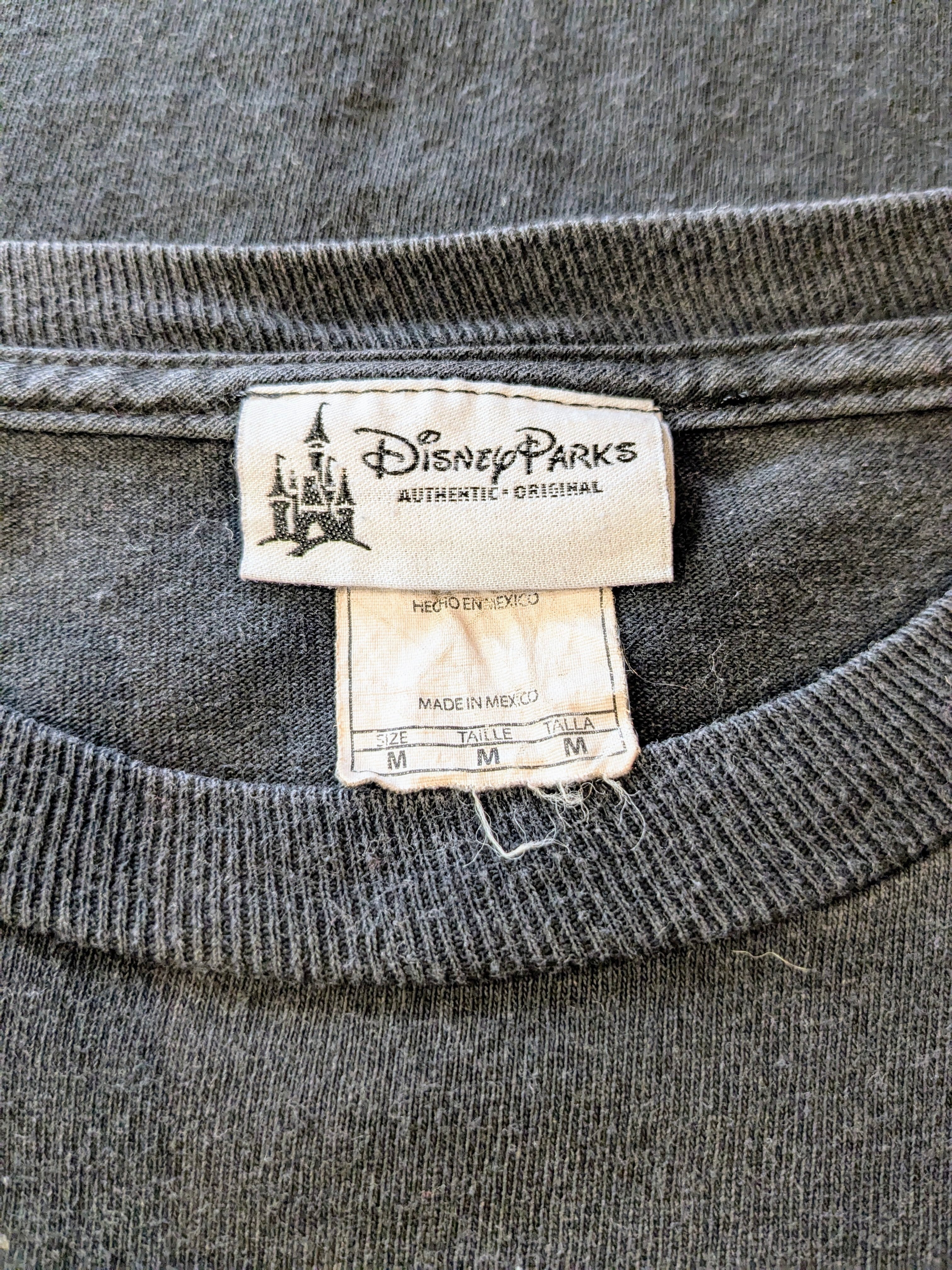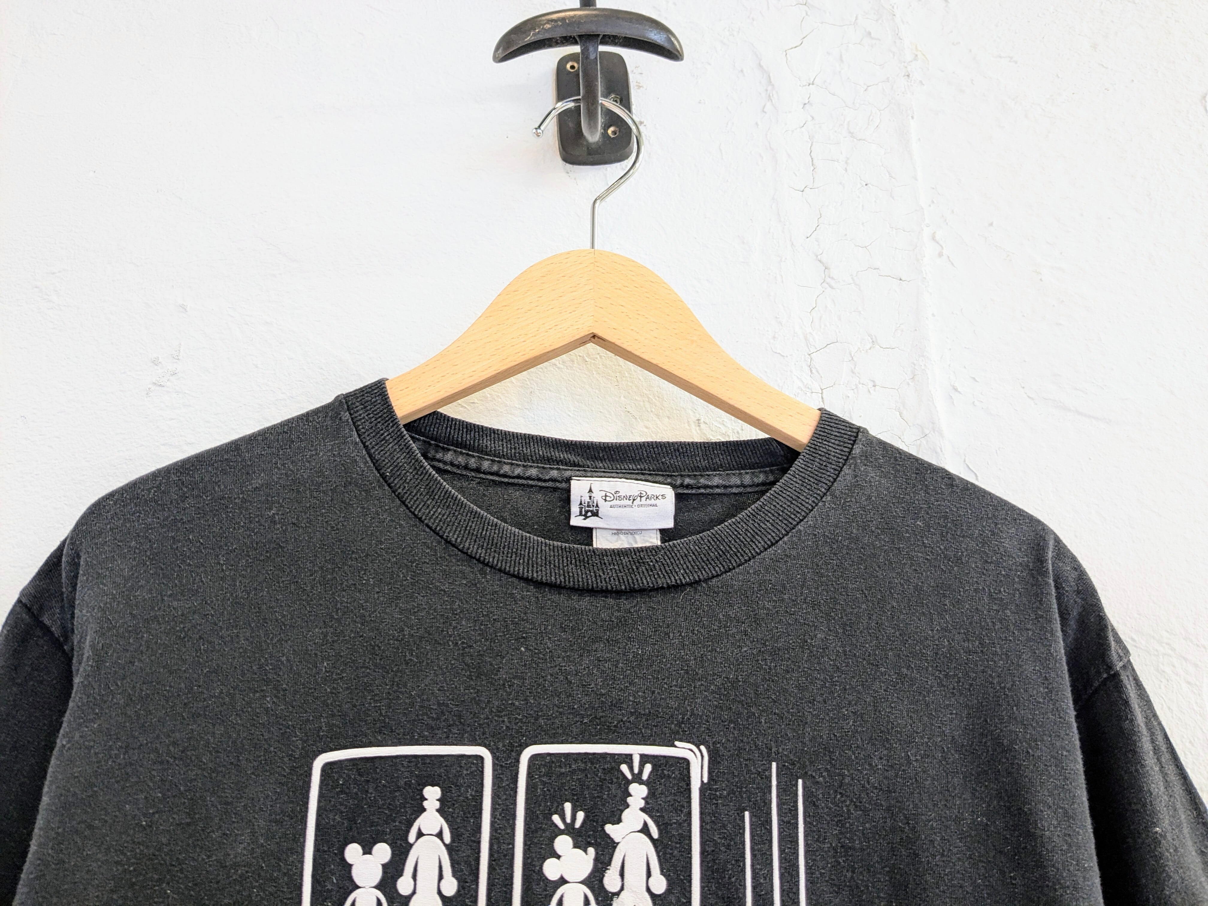 ミッキーとグーフィーがシルエットでアトラクションに乗っている様子がプリントされています。キャラクター感が強くないので、着やすいデザインとなります。