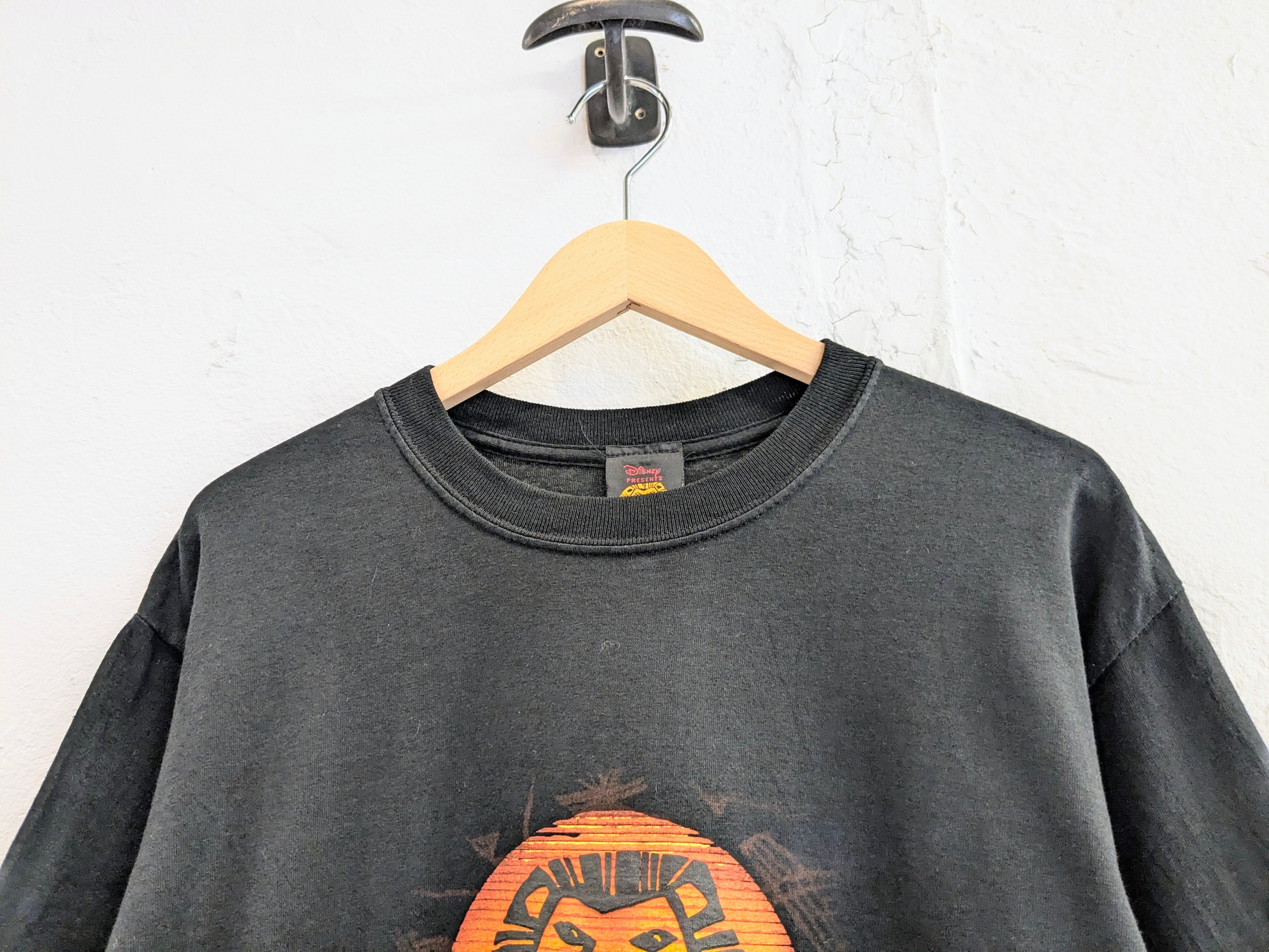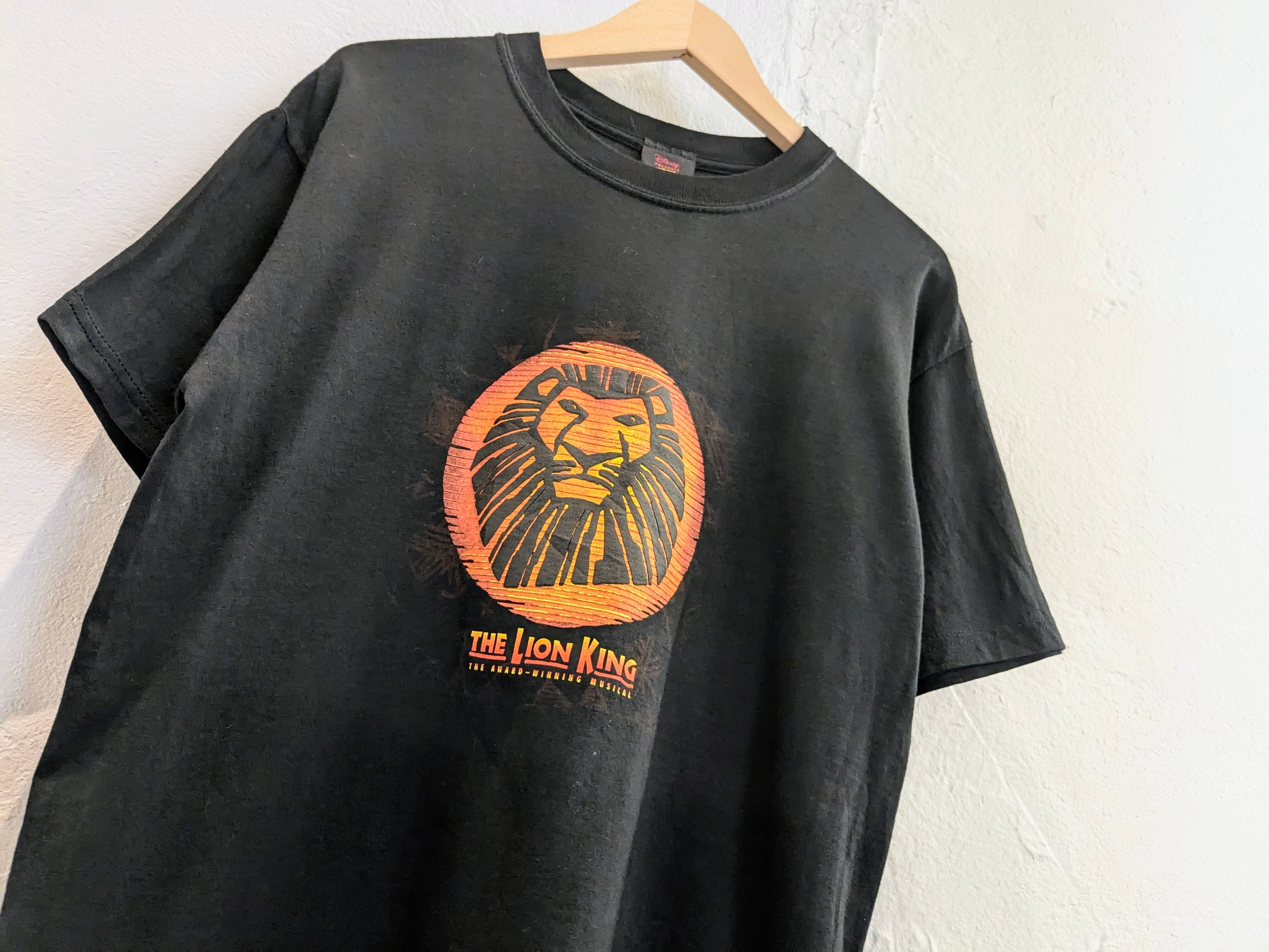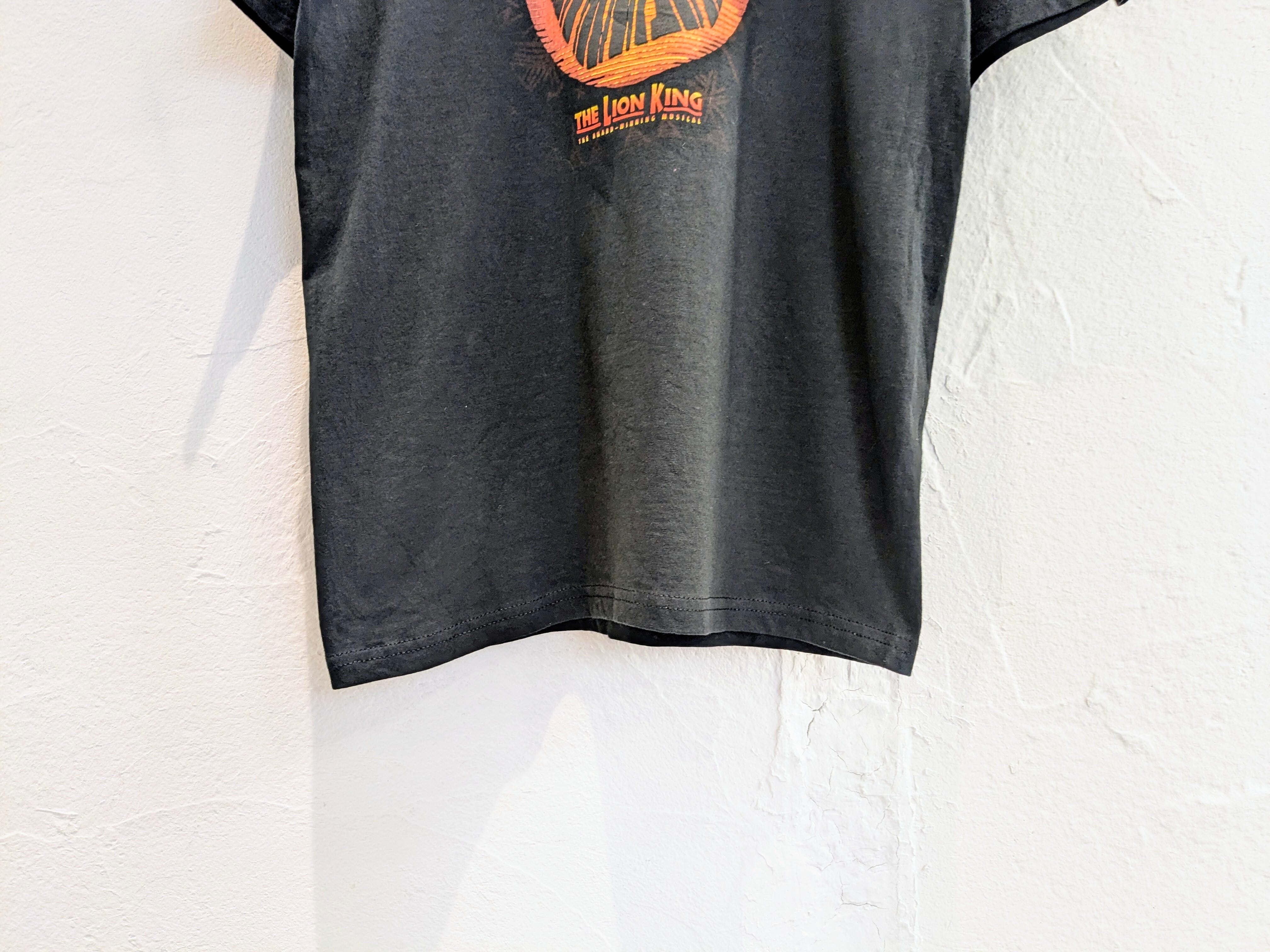 ミュージカル、ライオンキングのロンドン公演のTシャツ。スーベニアもの。フロントはライオンキングと一発で分かるプリント。発泡プリントとなり、凹凸感のあるデザイン。背面にLondonのプリント。ブラックボディにオレンジベースのプリントが目を引く一着。