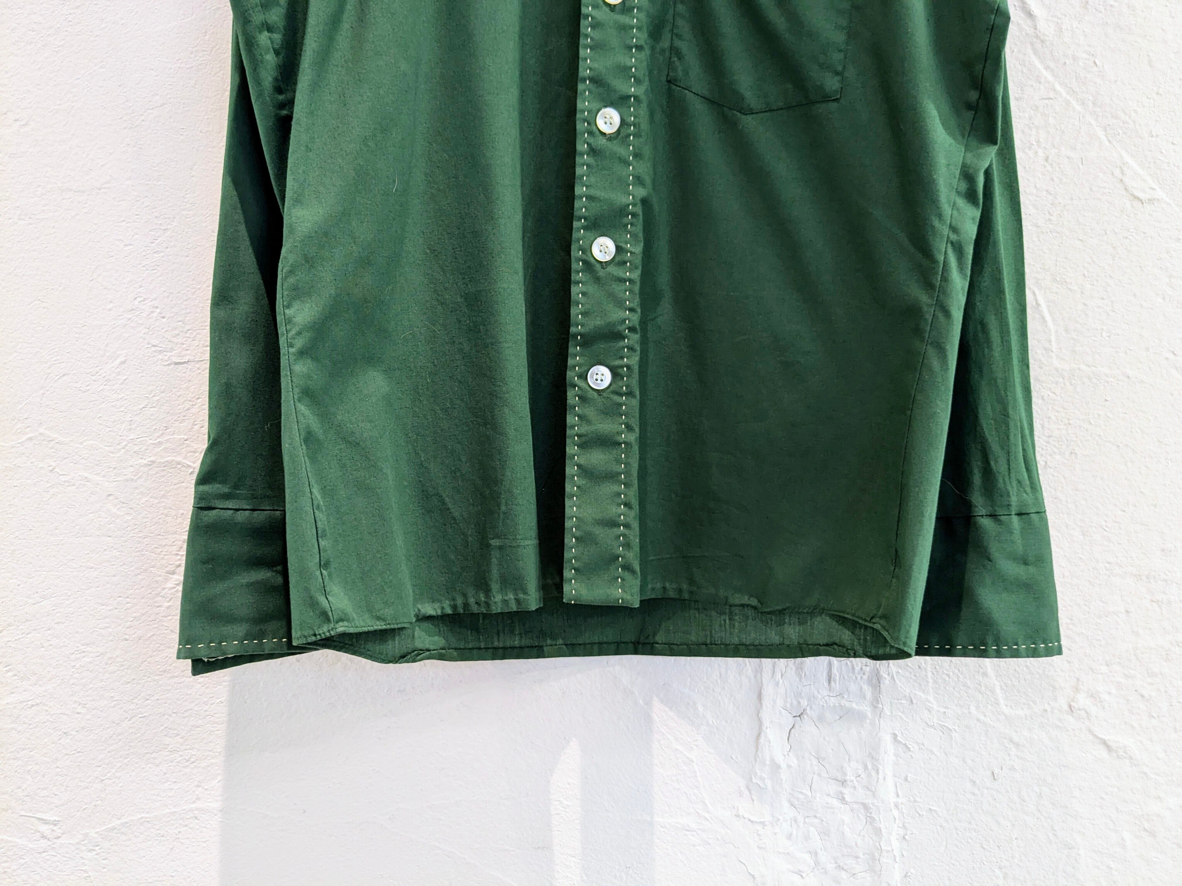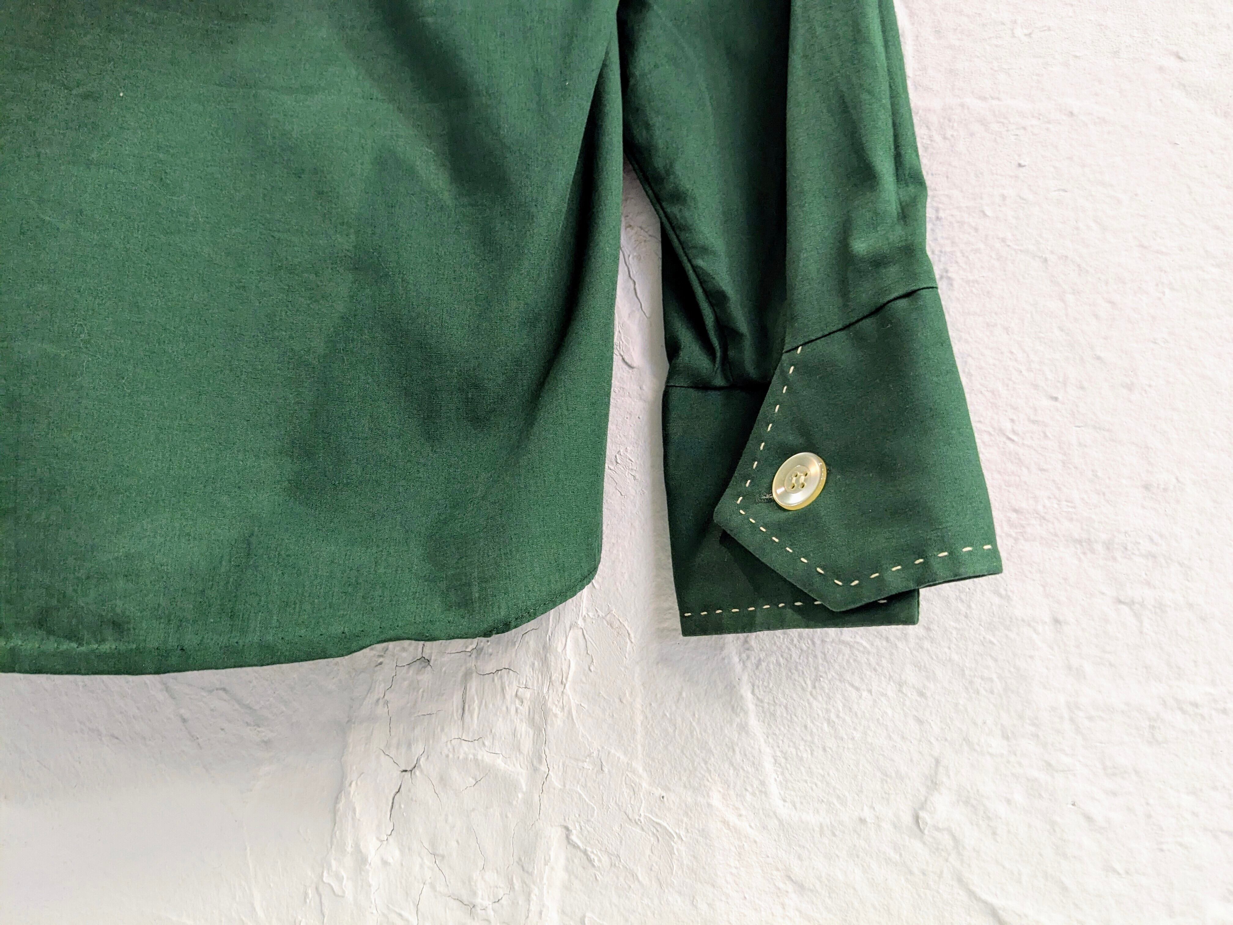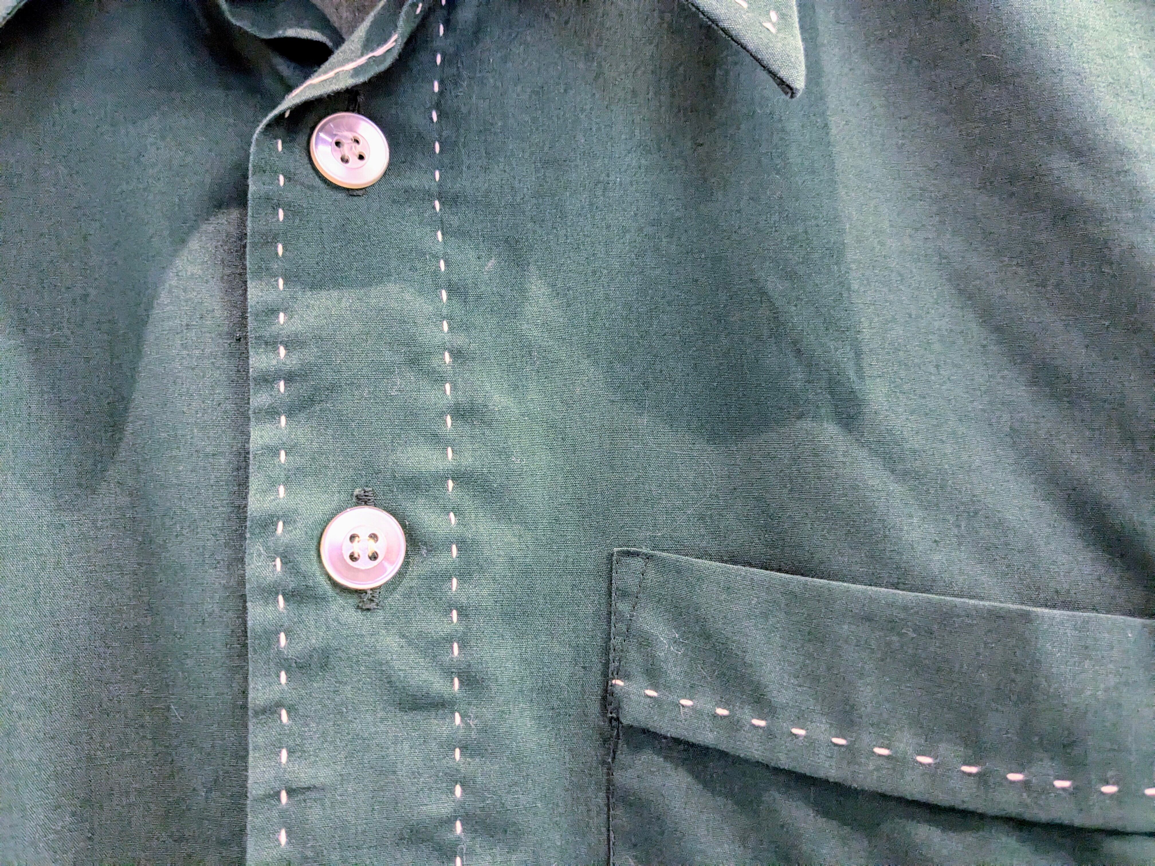 要所に施されたステッチがとても特徴的で可愛いアイテム。グリーンもモスグリーンのような濃いめの色味で、少し落ち着いた大人な雰囲気のシャツ。ジャケットなどのインナーに着ても、フロントのステッチがのぞくのでデザインがどこに着ても活きてくるそんな一着。