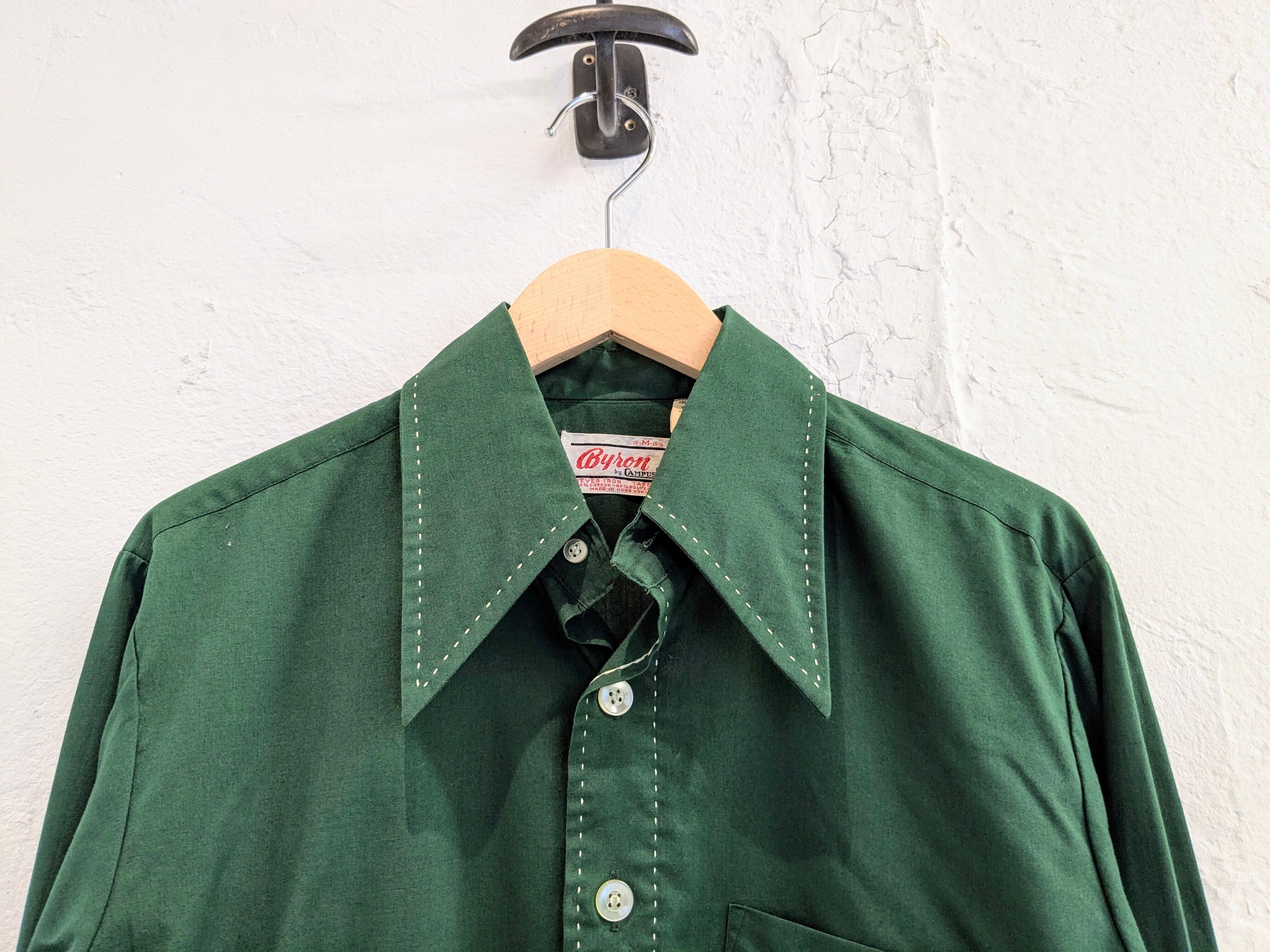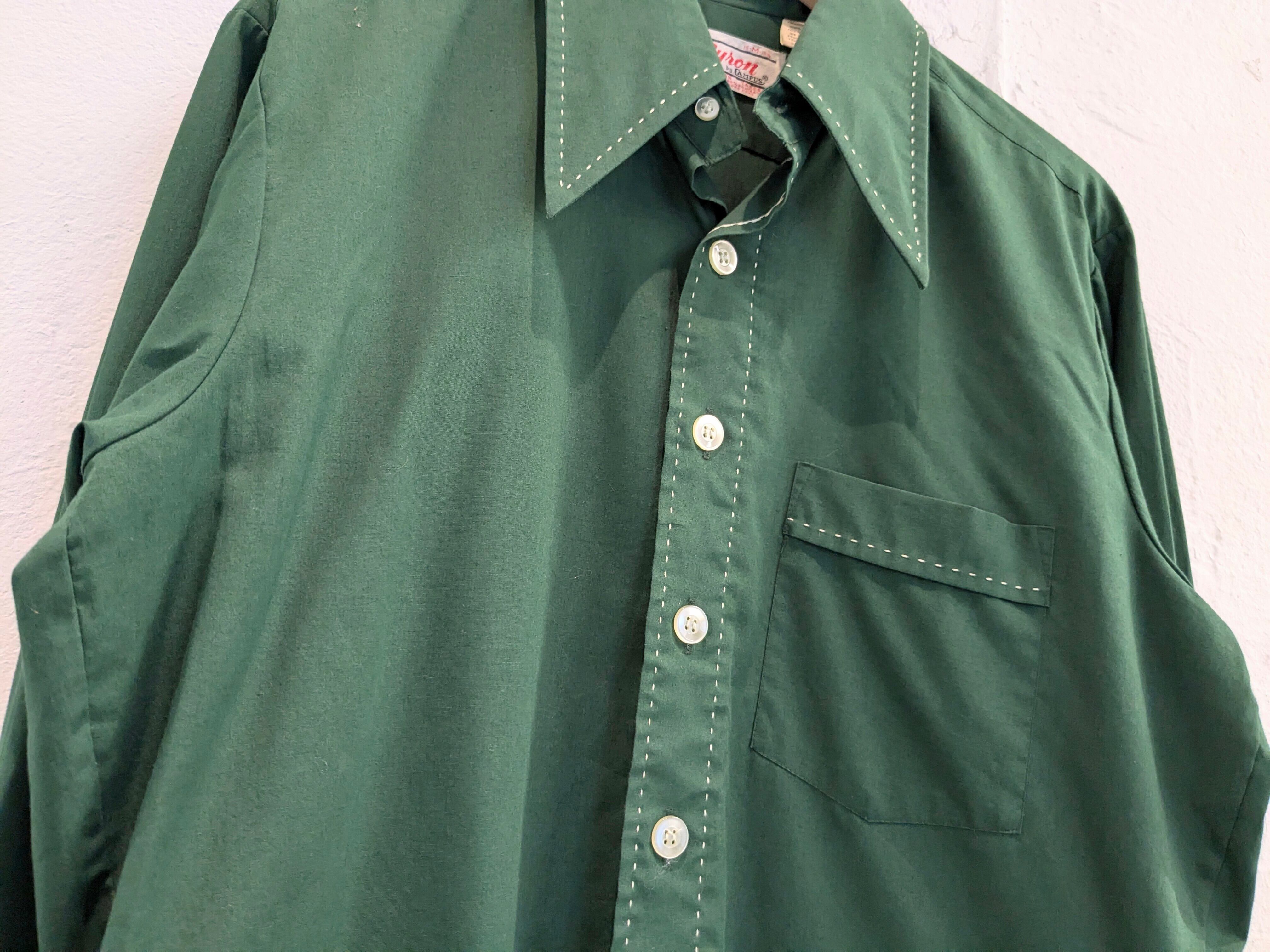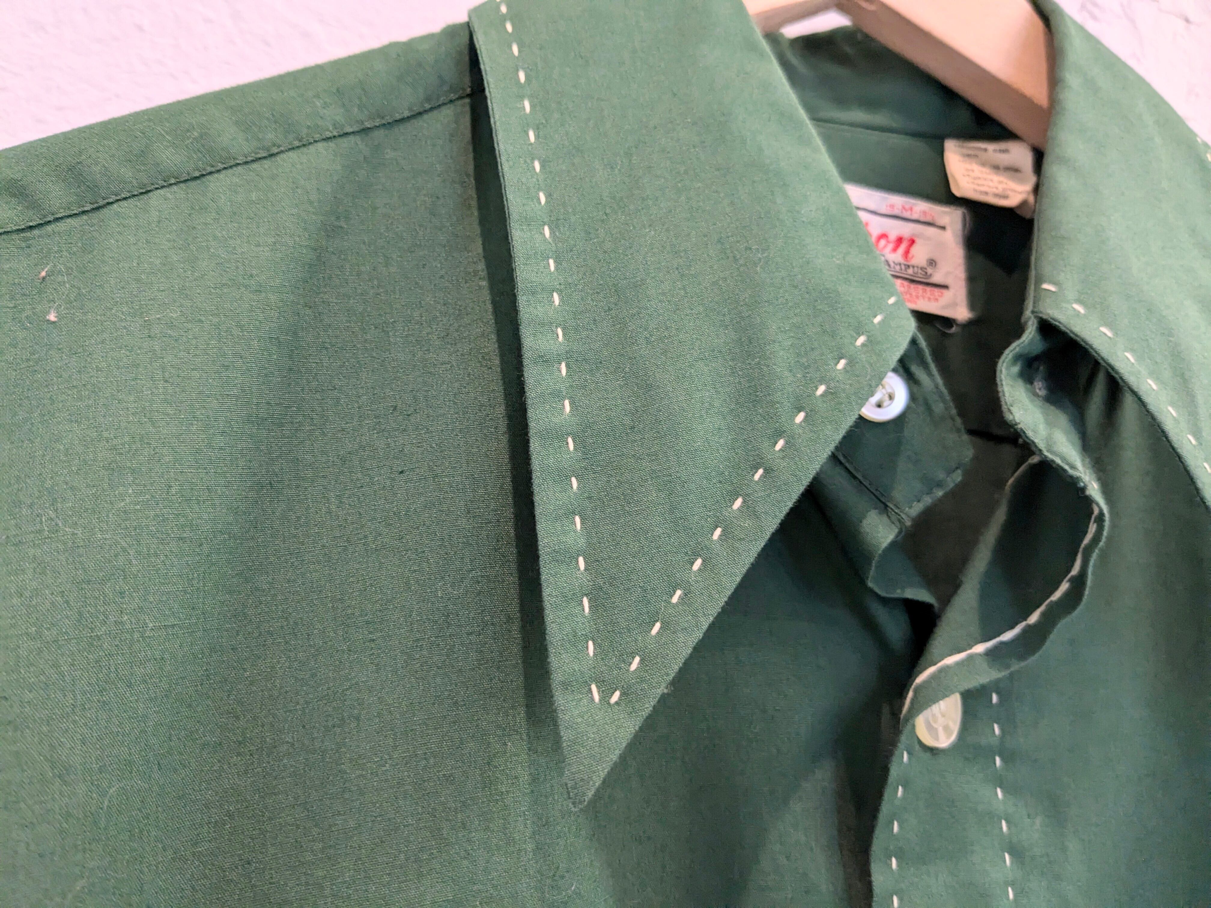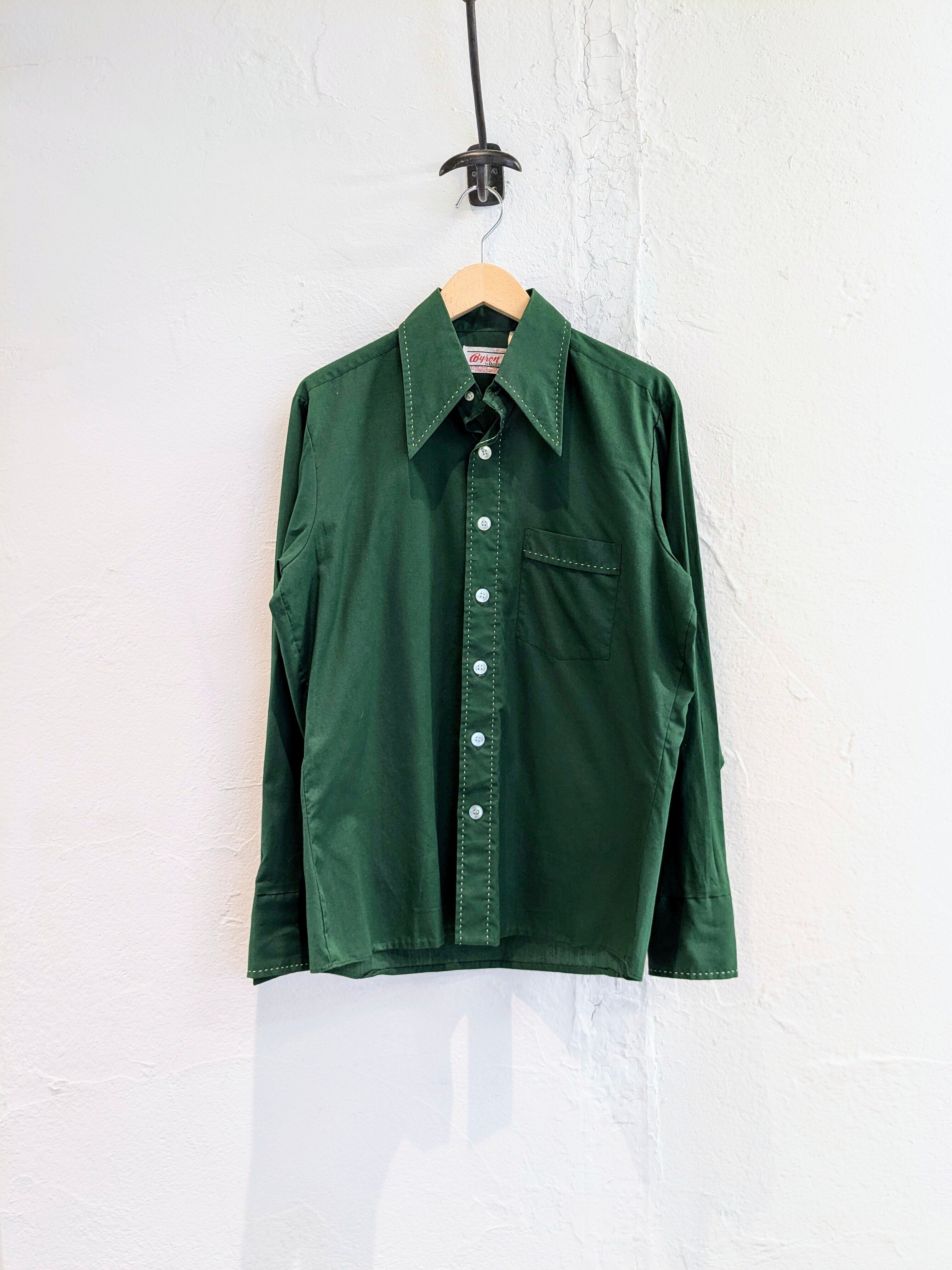 要所に施されたステッチがとても特徴的で可愛いアイテム。グリーンもモスグリーンのような濃いめの色味で、少し落ち着いた大人な雰囲気のシャツ。ジャケットなどのインナーに着ても、フロントのステッチがのぞくのでデザインがどこに着ても活きてくるそんな一着。