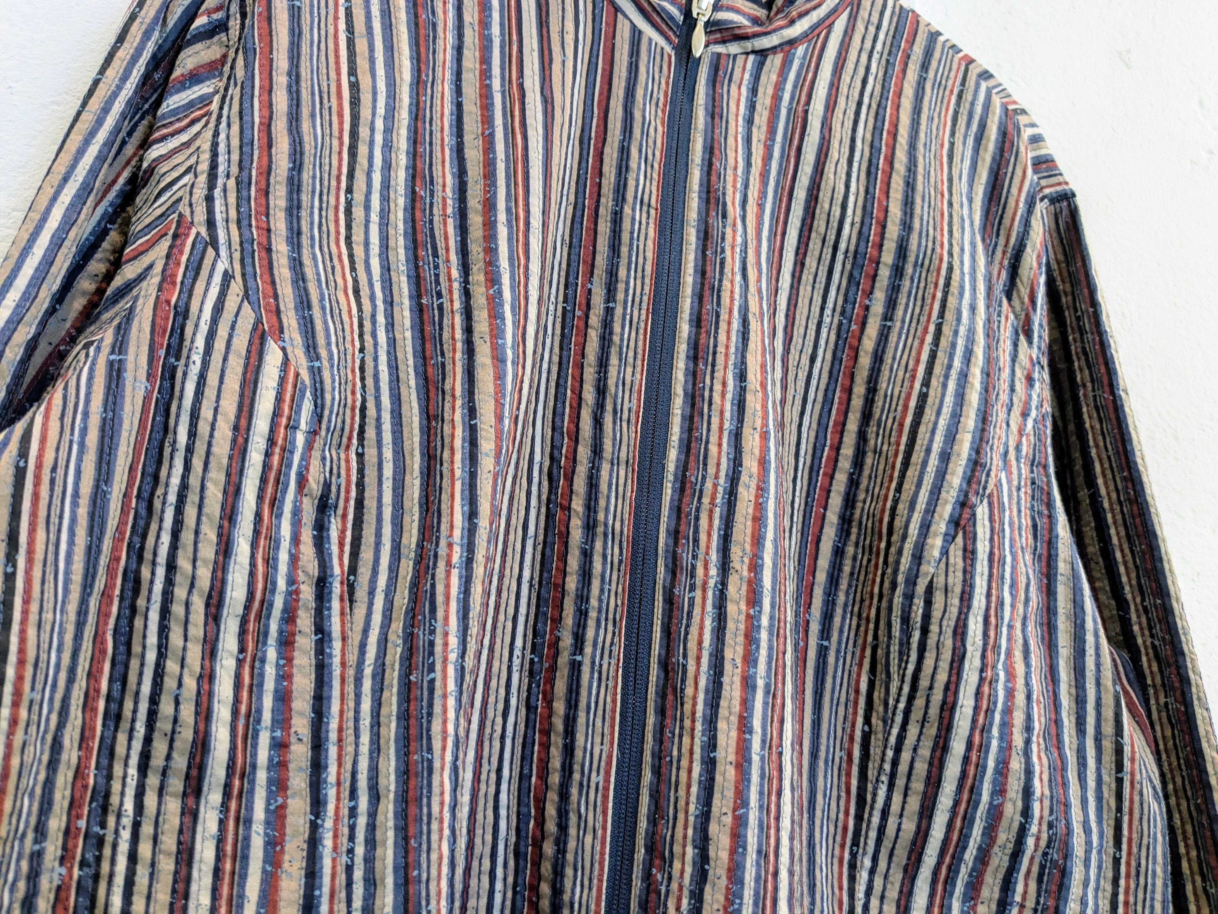 花柄とストライプのリバーシブルブルゾン。どっちが表と言いきれないどっちも着るやつ。両A面ブルゾン。その日、その時の気分で変化が出せるとても便利なアイテム。袖は折り返すことで、別の表情が出るので、ロールアップをしてもポイントになります。生地は、ダブルフェイスですがそこまで厚くないのでさらっと羽織っていただけます。