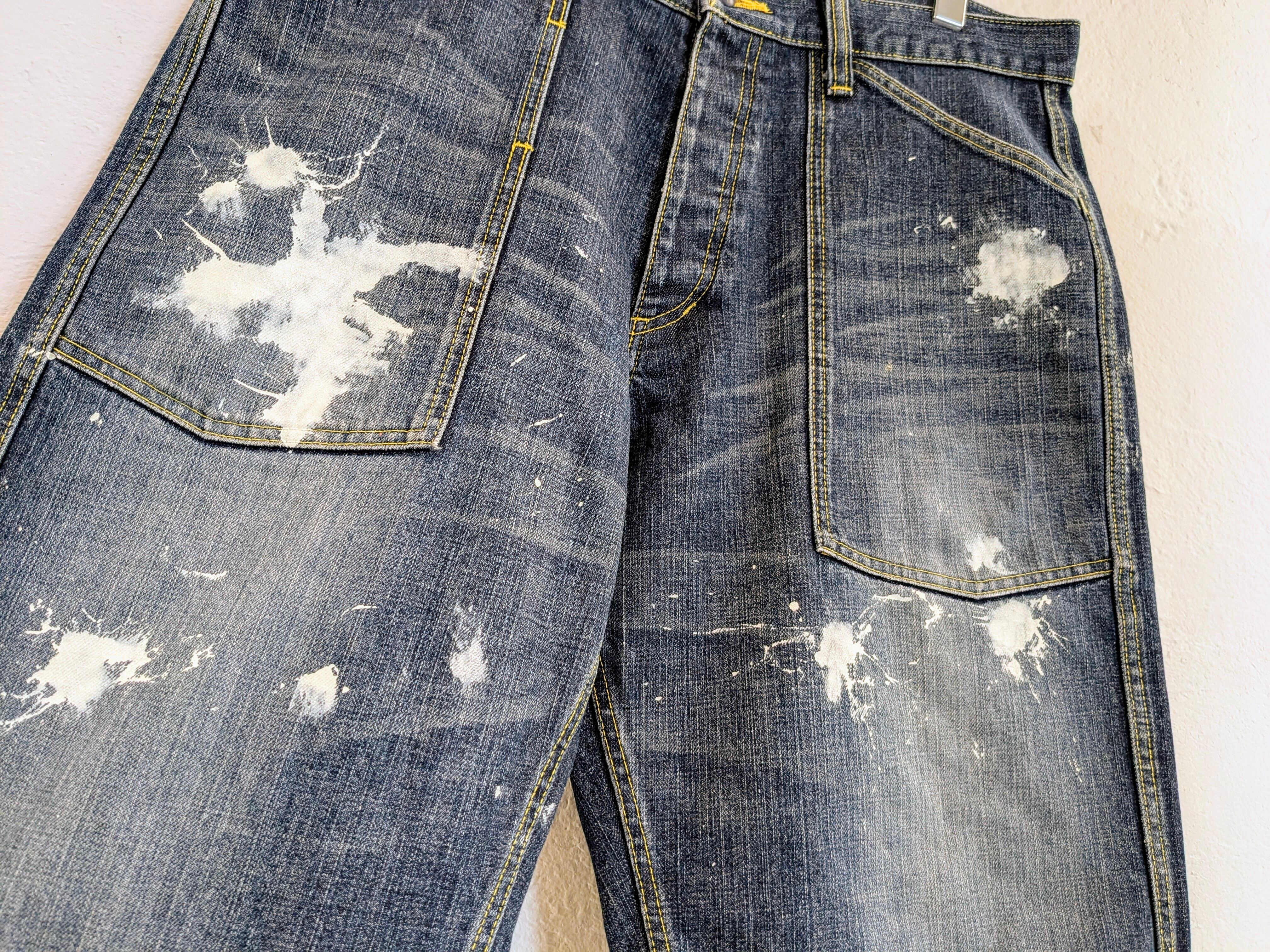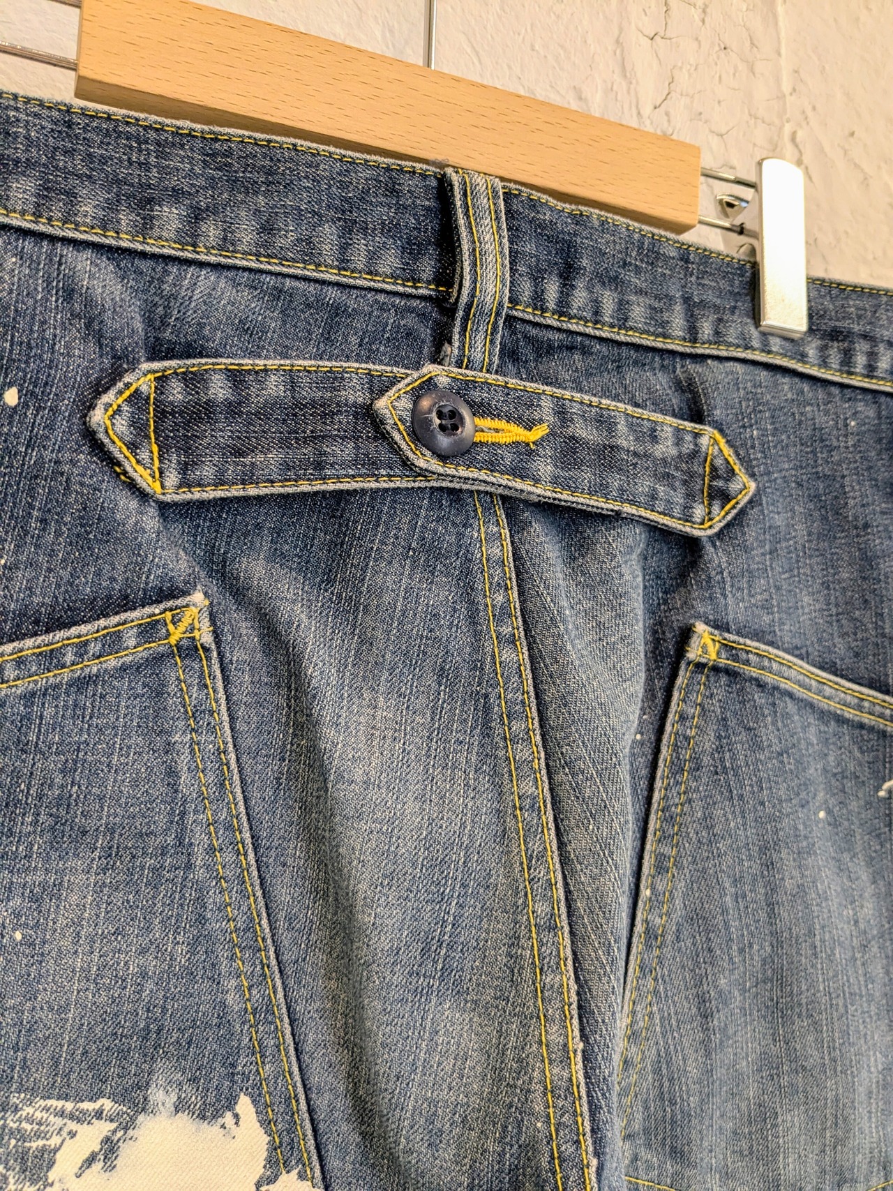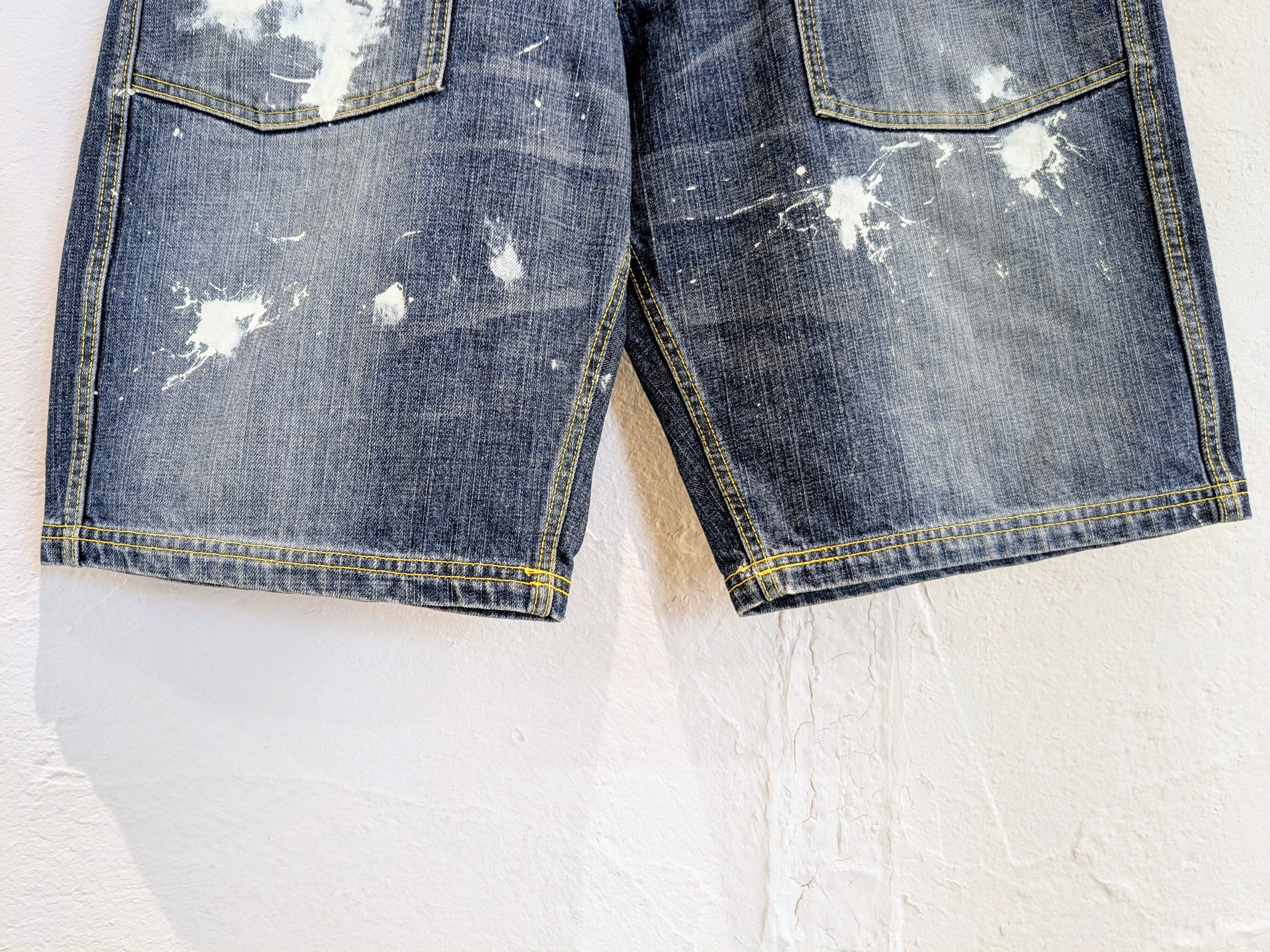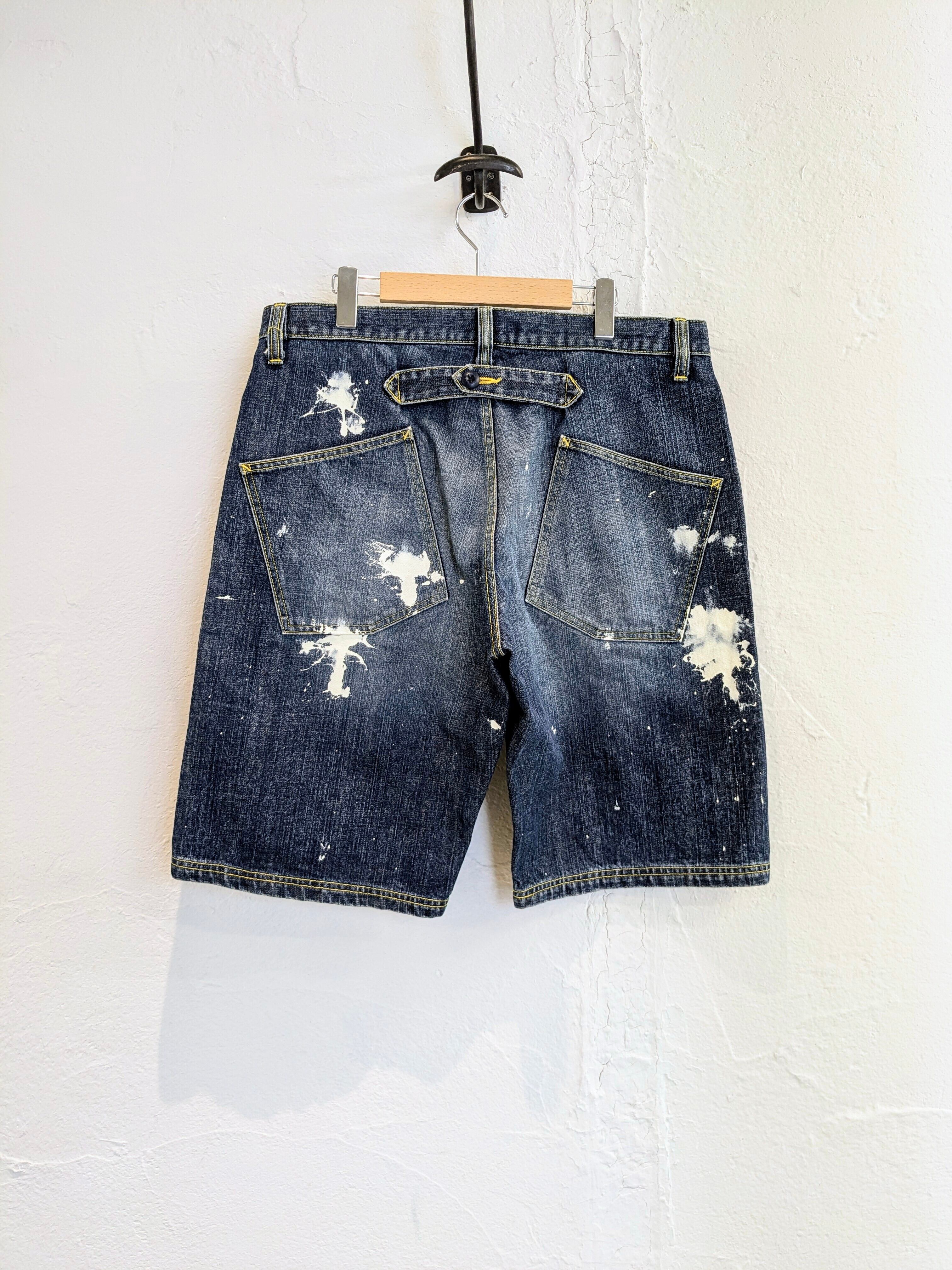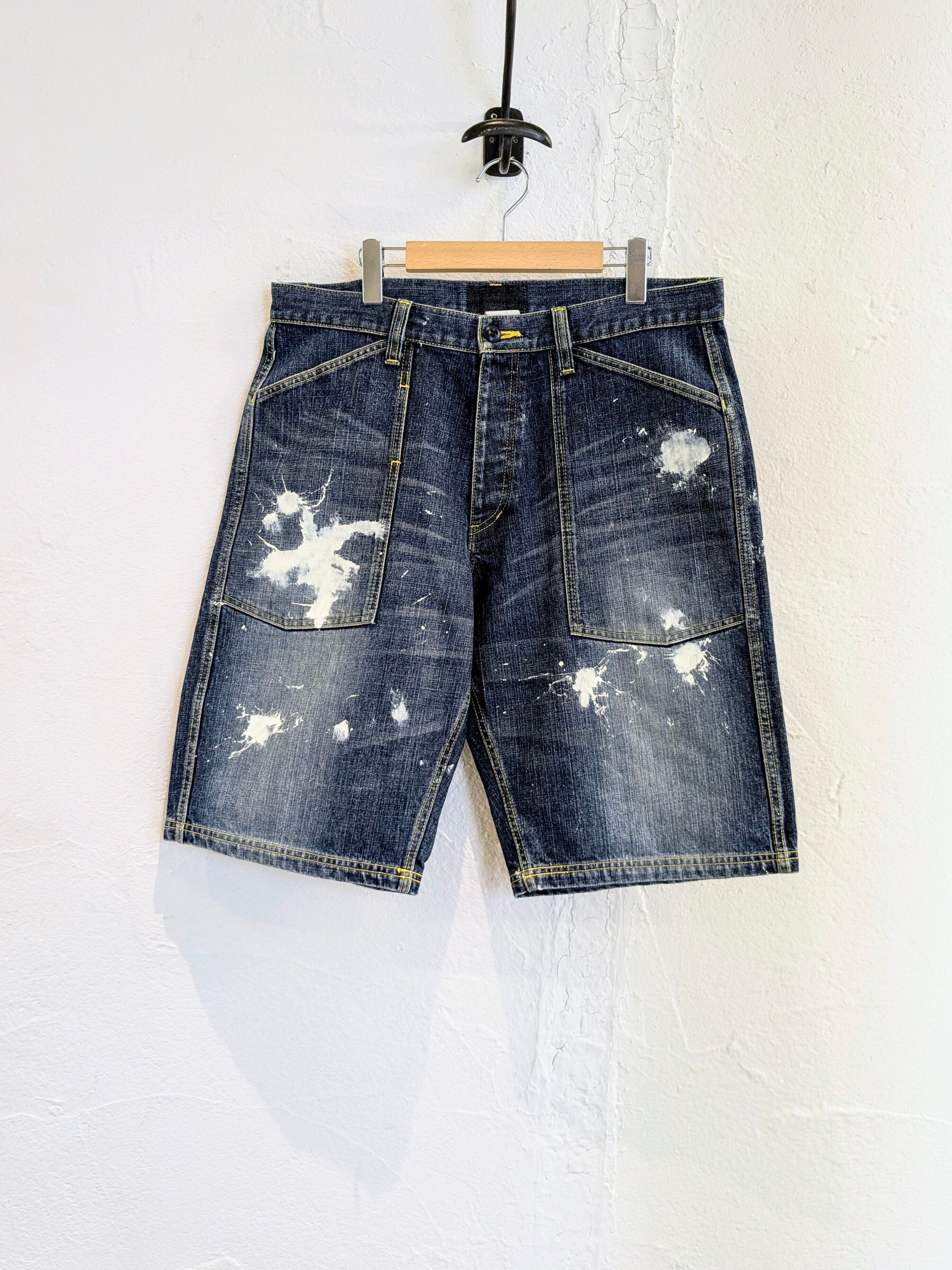 ワイドデニムのショートパンツにペイントをのせたアイテム。たっぷりとしたシルエットがちょうどよく、ペイントの汚れた感じも雰囲気がありとてもカッコいい一着。今っぽいアイテムですかま、ユーズドならではのよれ感がまたいい感じ。合わせやすいアイテムで、メンズはもちろん、レディースの方がベルトでしぼって履いても可愛いです。