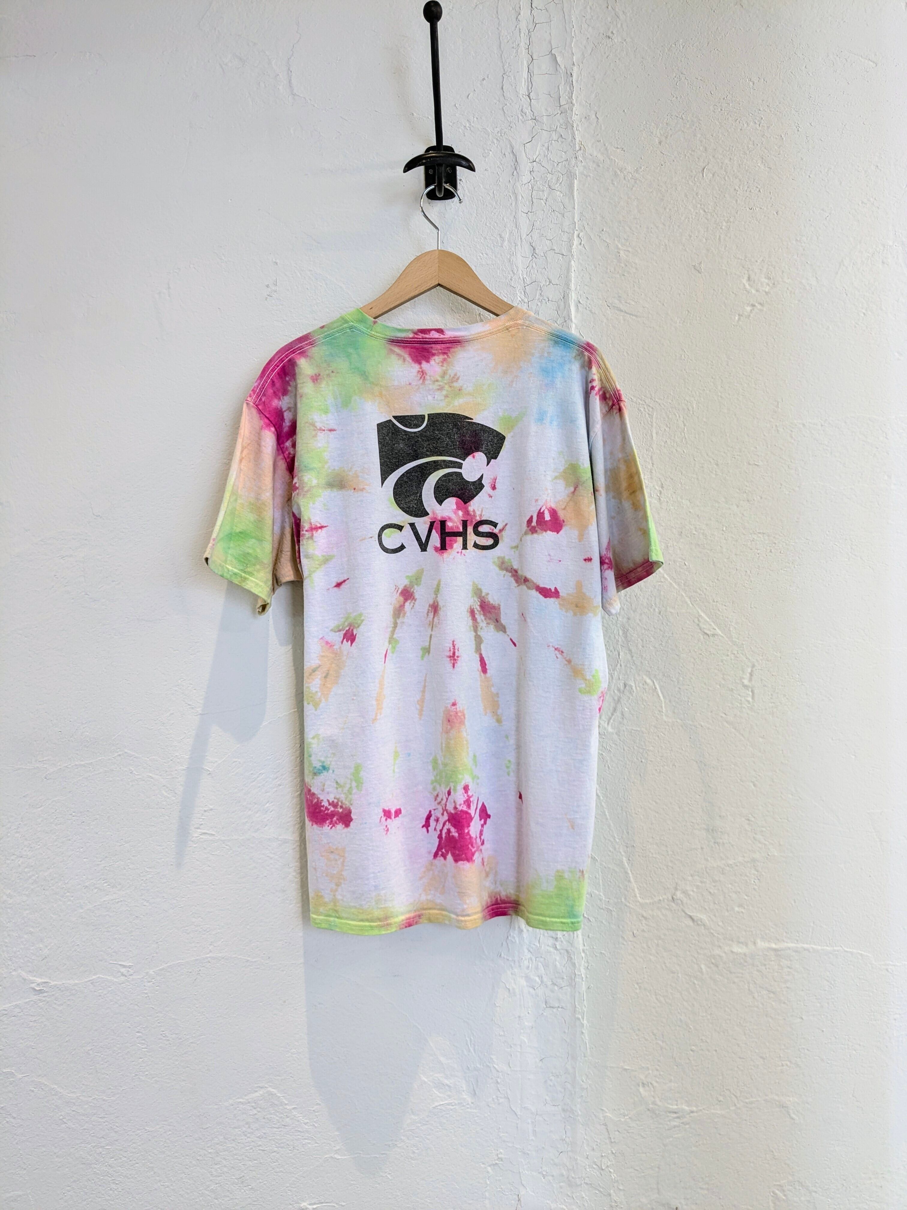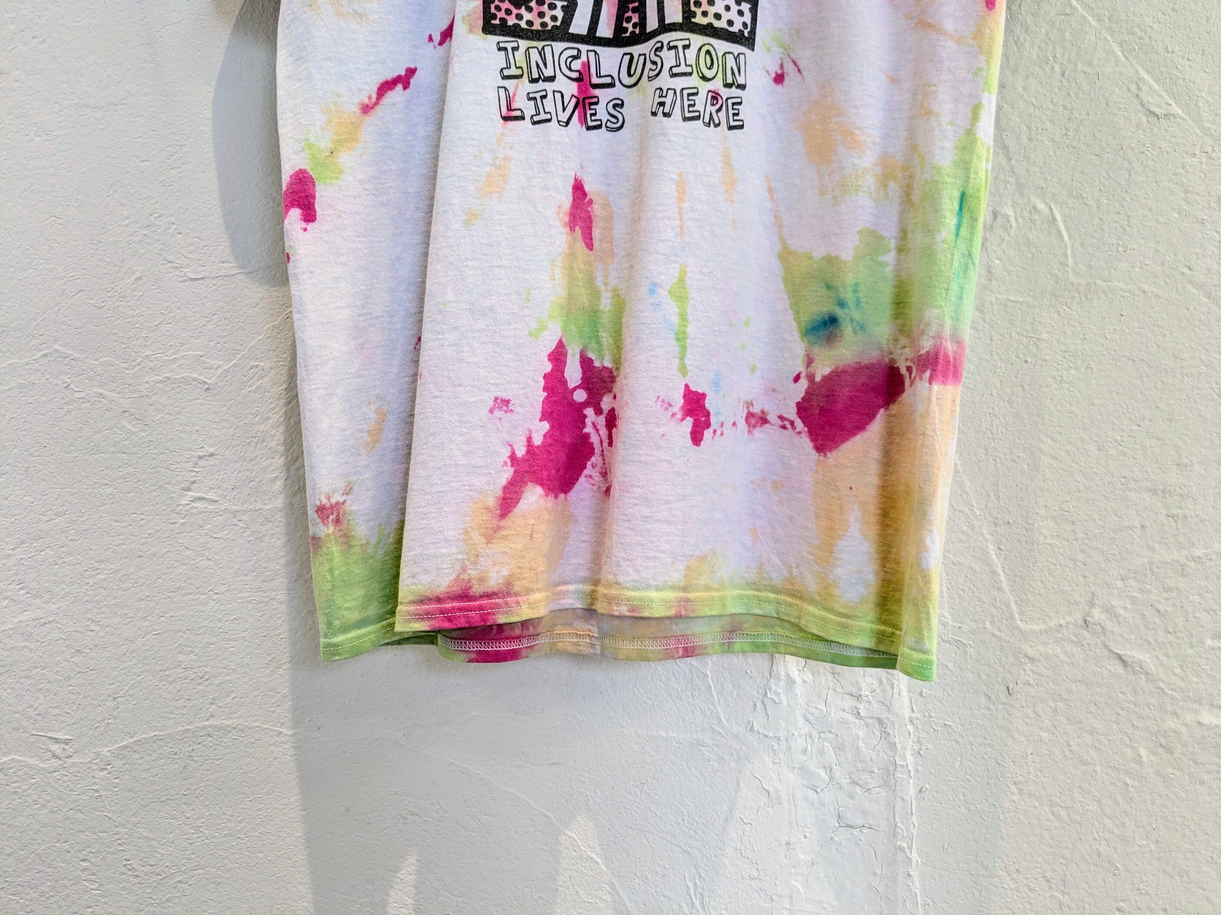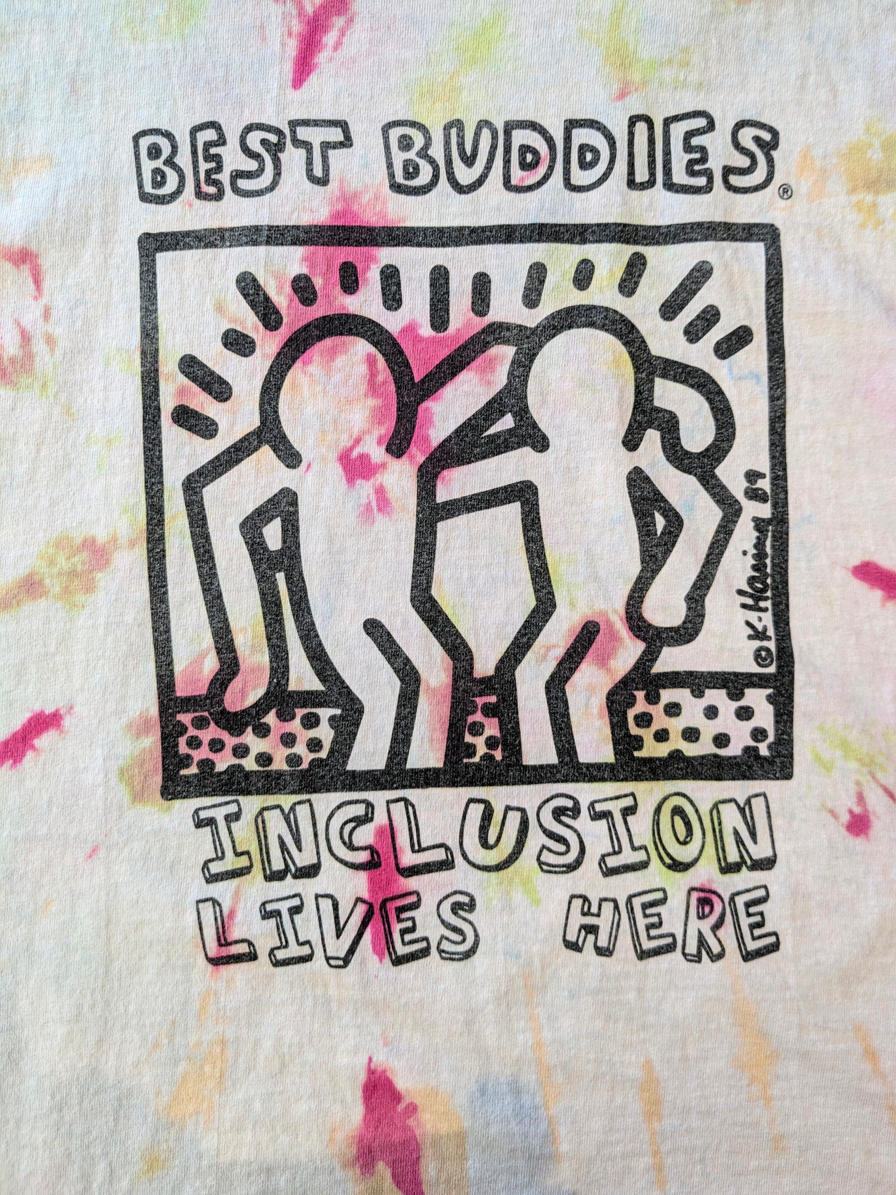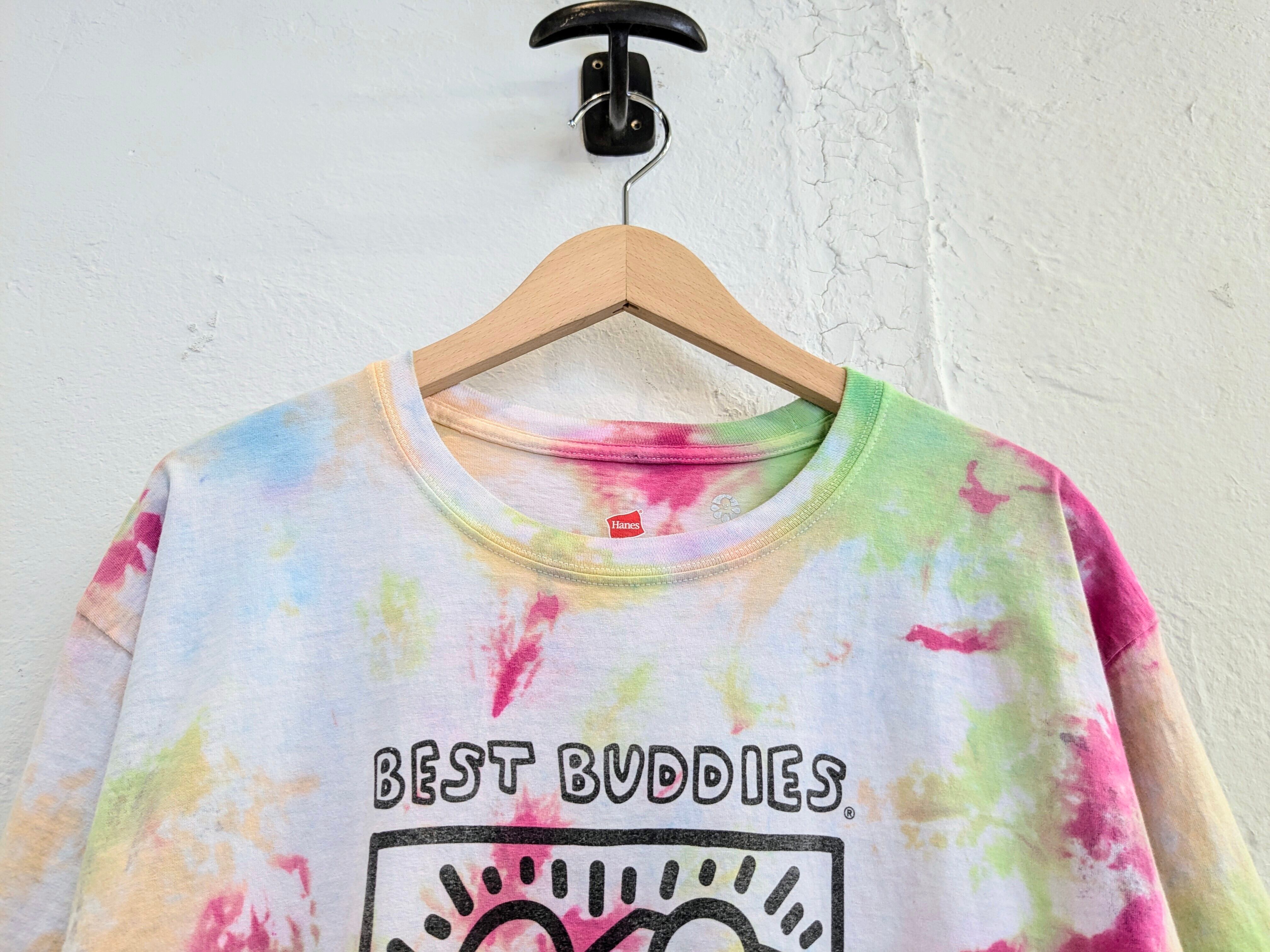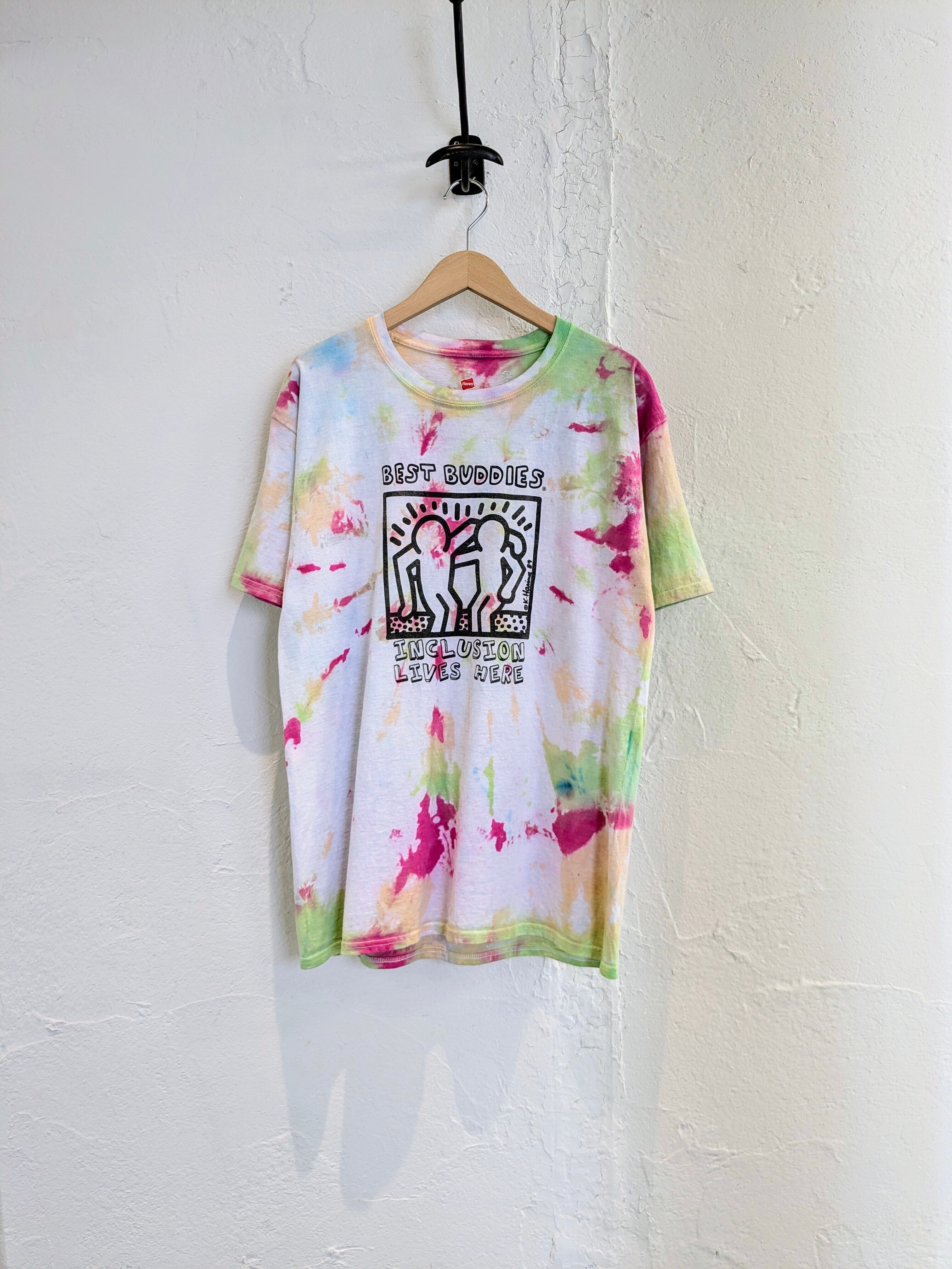 全体的にタイダイ染めになっており、色鮮やかなアイテム。フロントにはキース・ヘリングと分かりやすいプリントが入っています。少し変化球気味のTシャツになります。