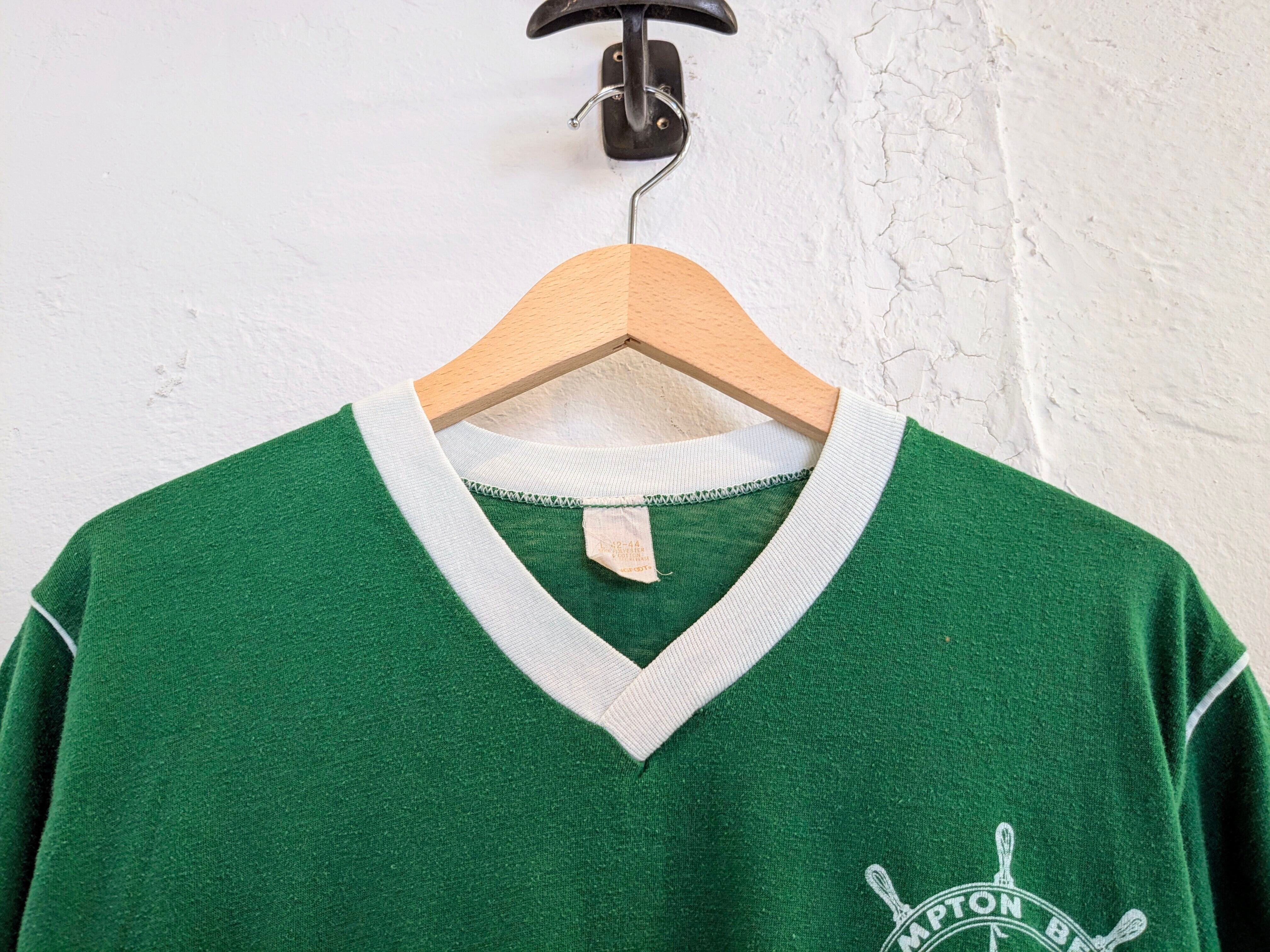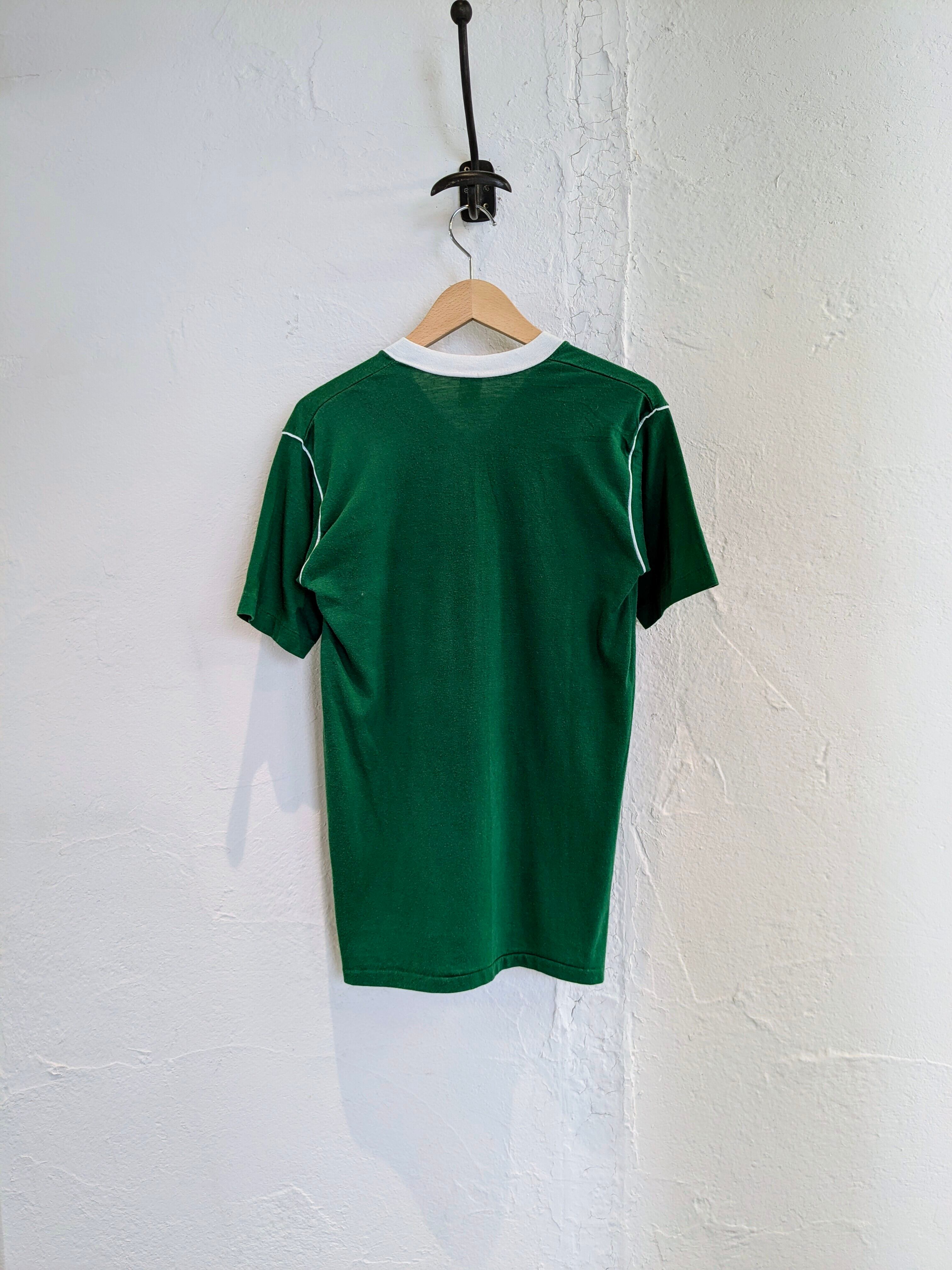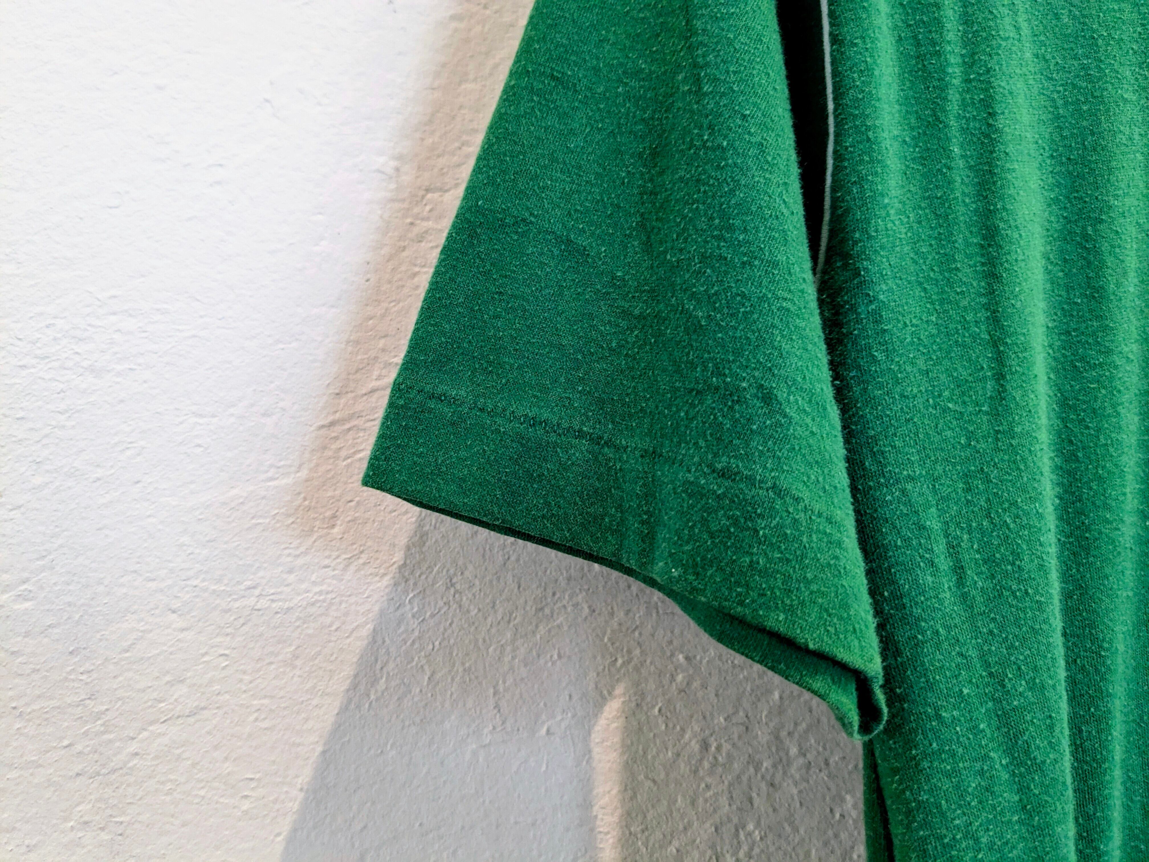 アメリカ製のシングルステッチ。1990年代頃のアイテム。リンガーと言っていいのか、首のところのみが白に切り替わっています。プリントのかすれ具合など雰囲気抜群です。色は比較的残っており、濃いめのグリーンと言えるかと。