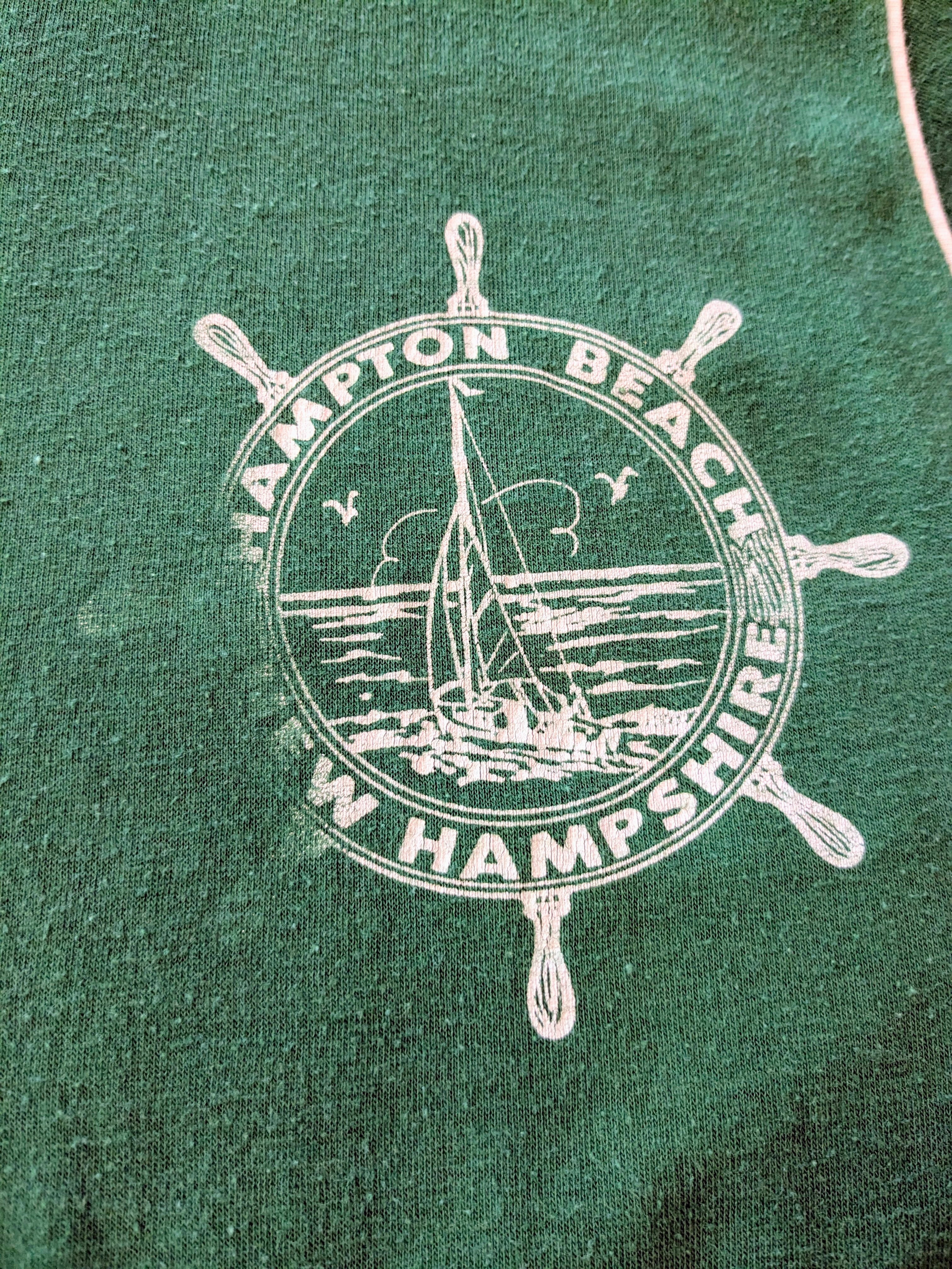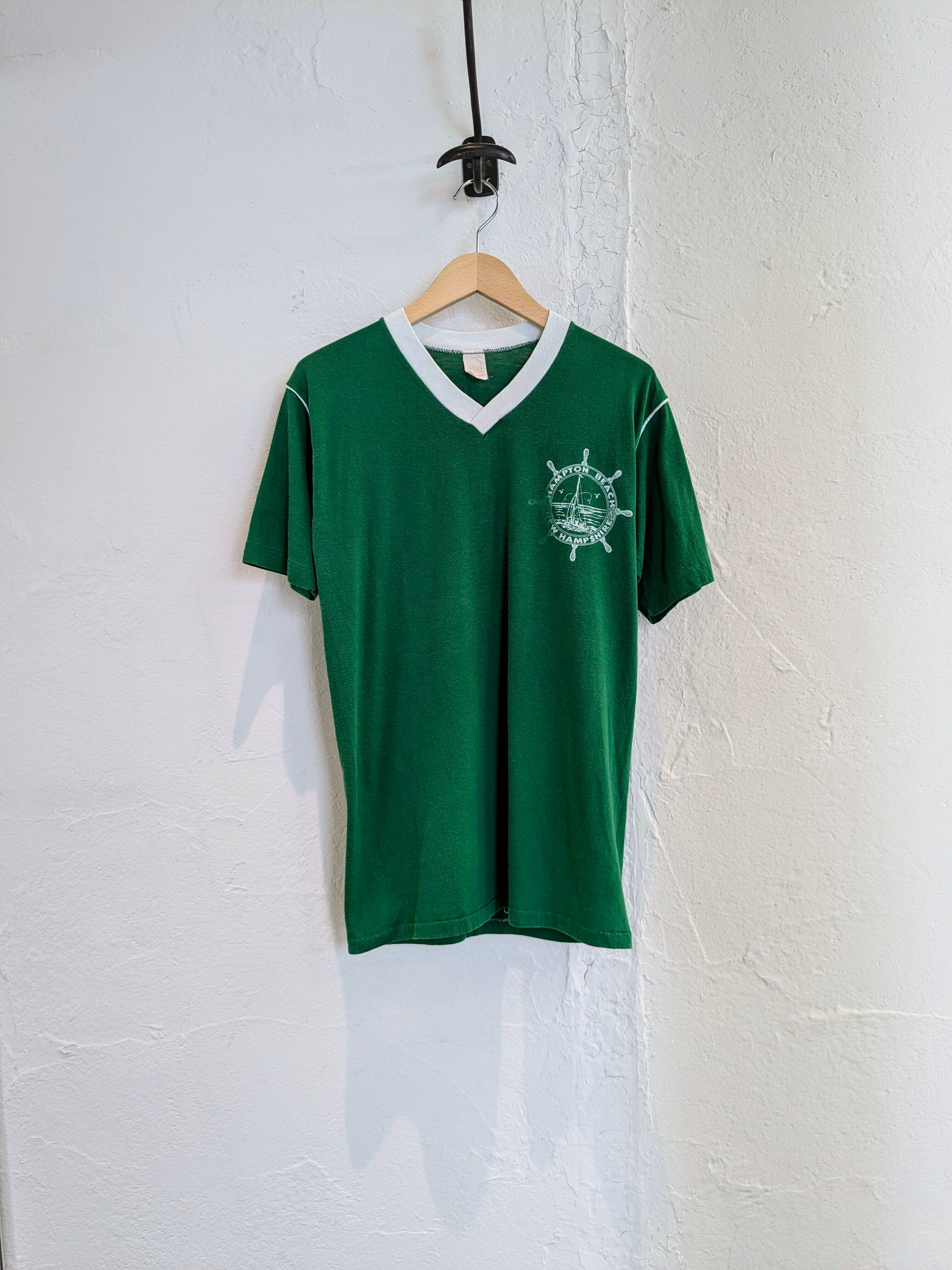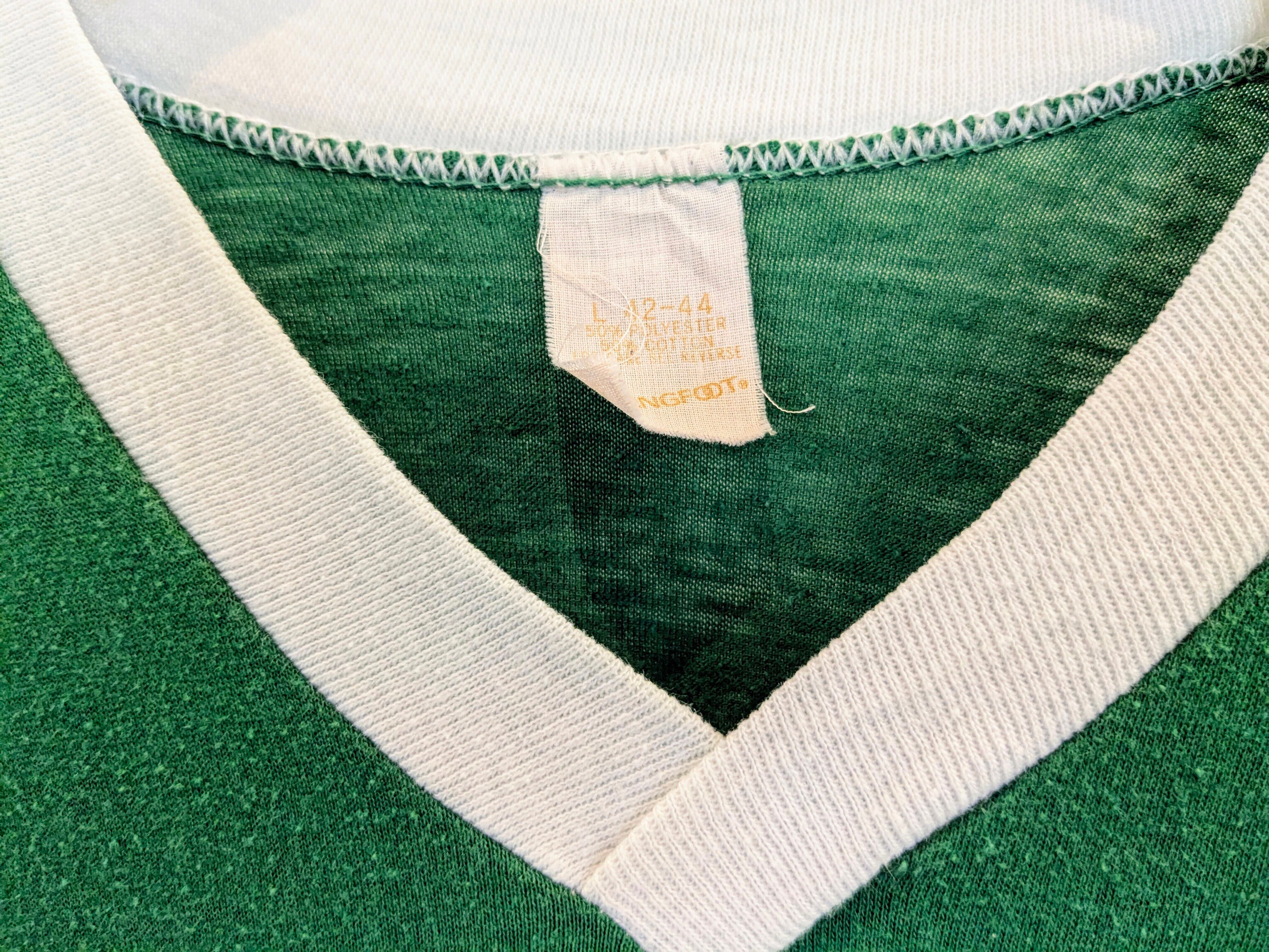 アメリカ製のシングルステッチ。1990年代頃のアイテム。リンガーと言っていいのか、首のところのみが白に切り替わっています。プリントのかすれ具合など雰囲気抜群です。色は比較的残っており、濃いめのグリーンと言えるかと。