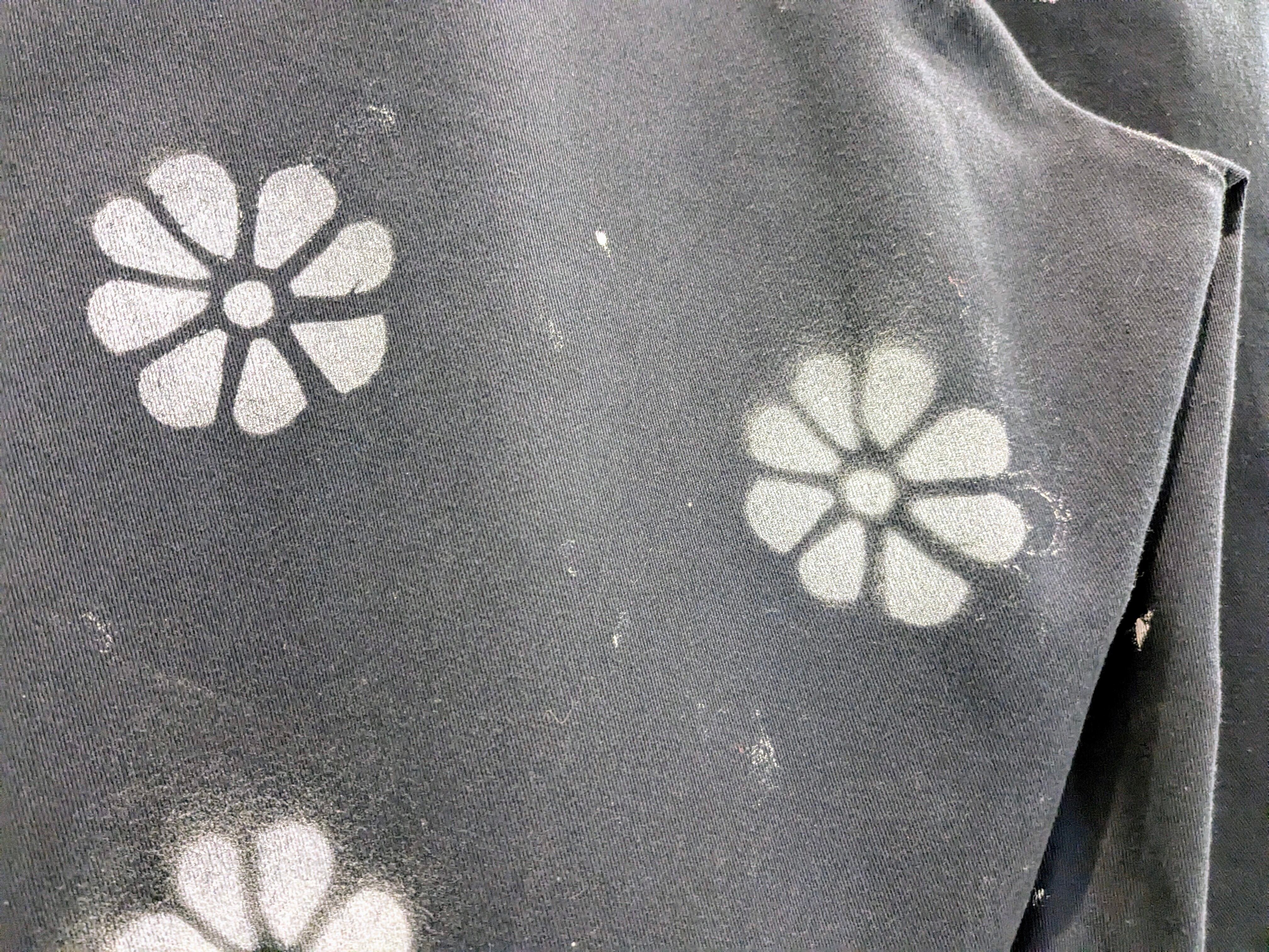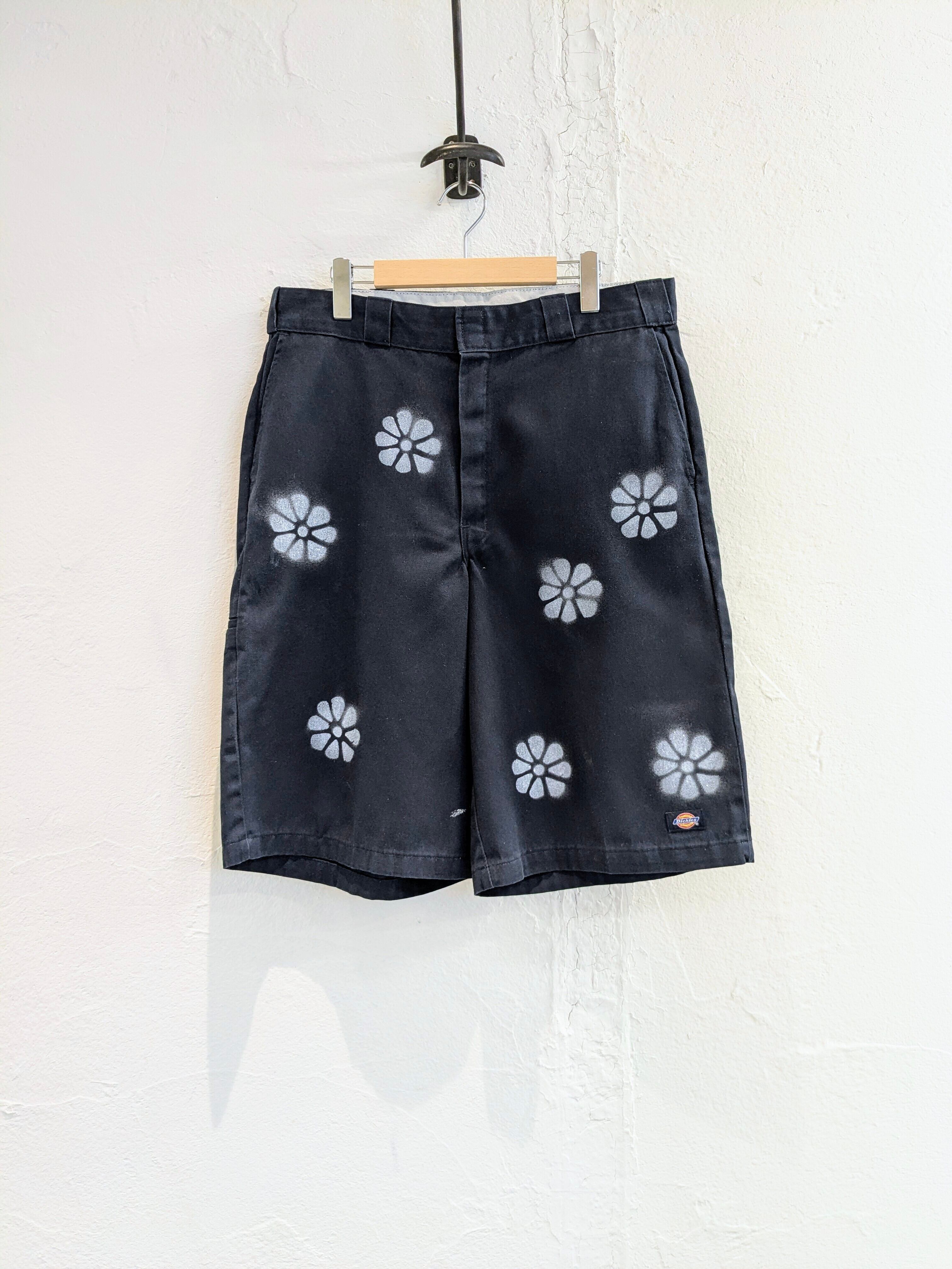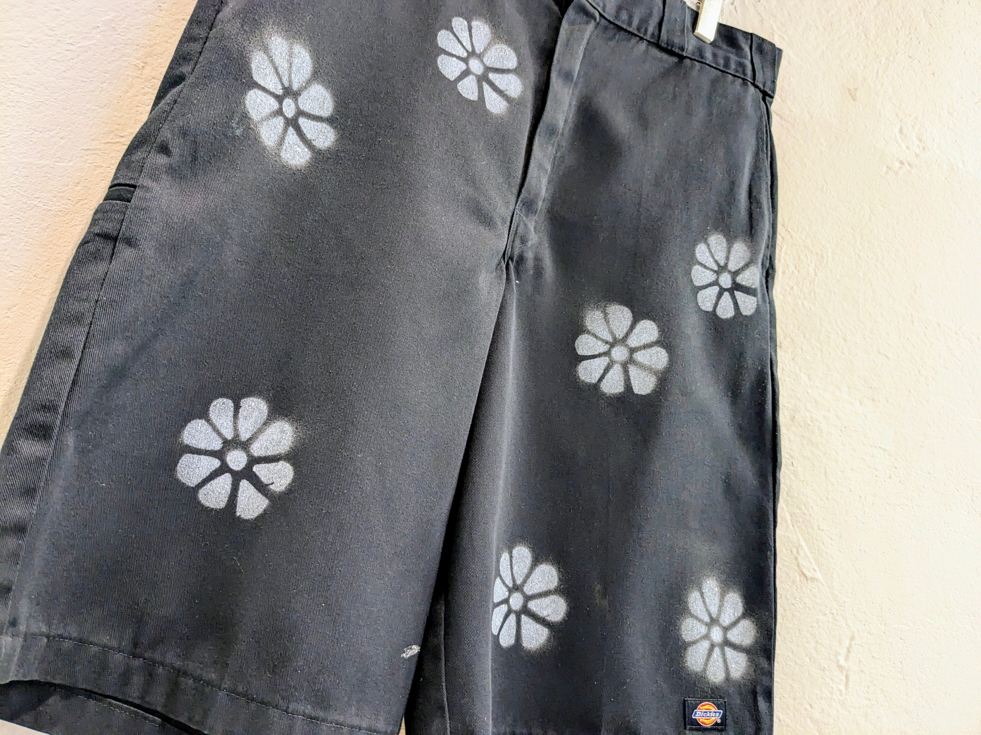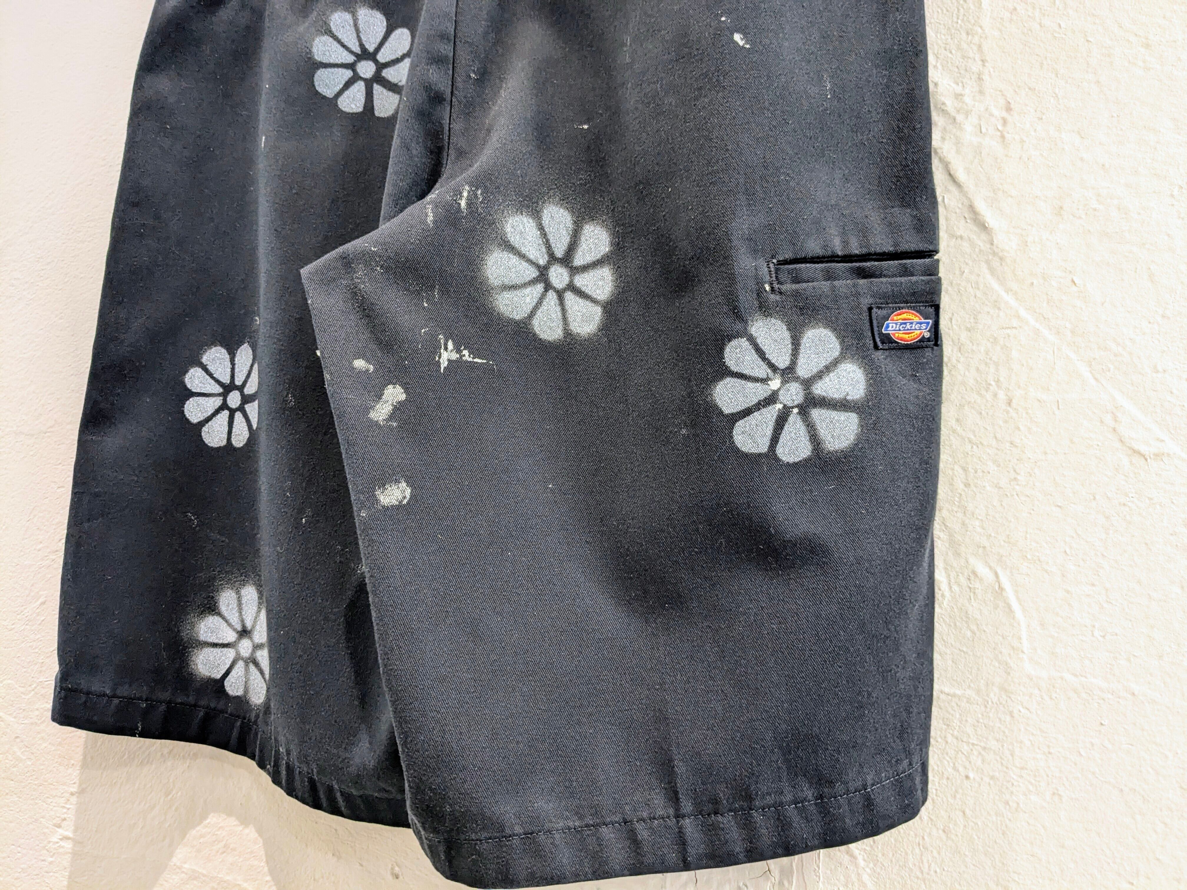 ユーズドのディッキーズのショーツにエアブラシで花柄を施したアイテム。全体的に入っており、目を引くデザインとなっています。元々汚れが入った個体を使用しています。ゆえに、花柄意外にも汚れ、ボロの要素も入っている雰囲気のいい一着に仕上がっています。シルエットは、ワイドで膝下の丈なので今っぽさも兼ね備えたアイテム。