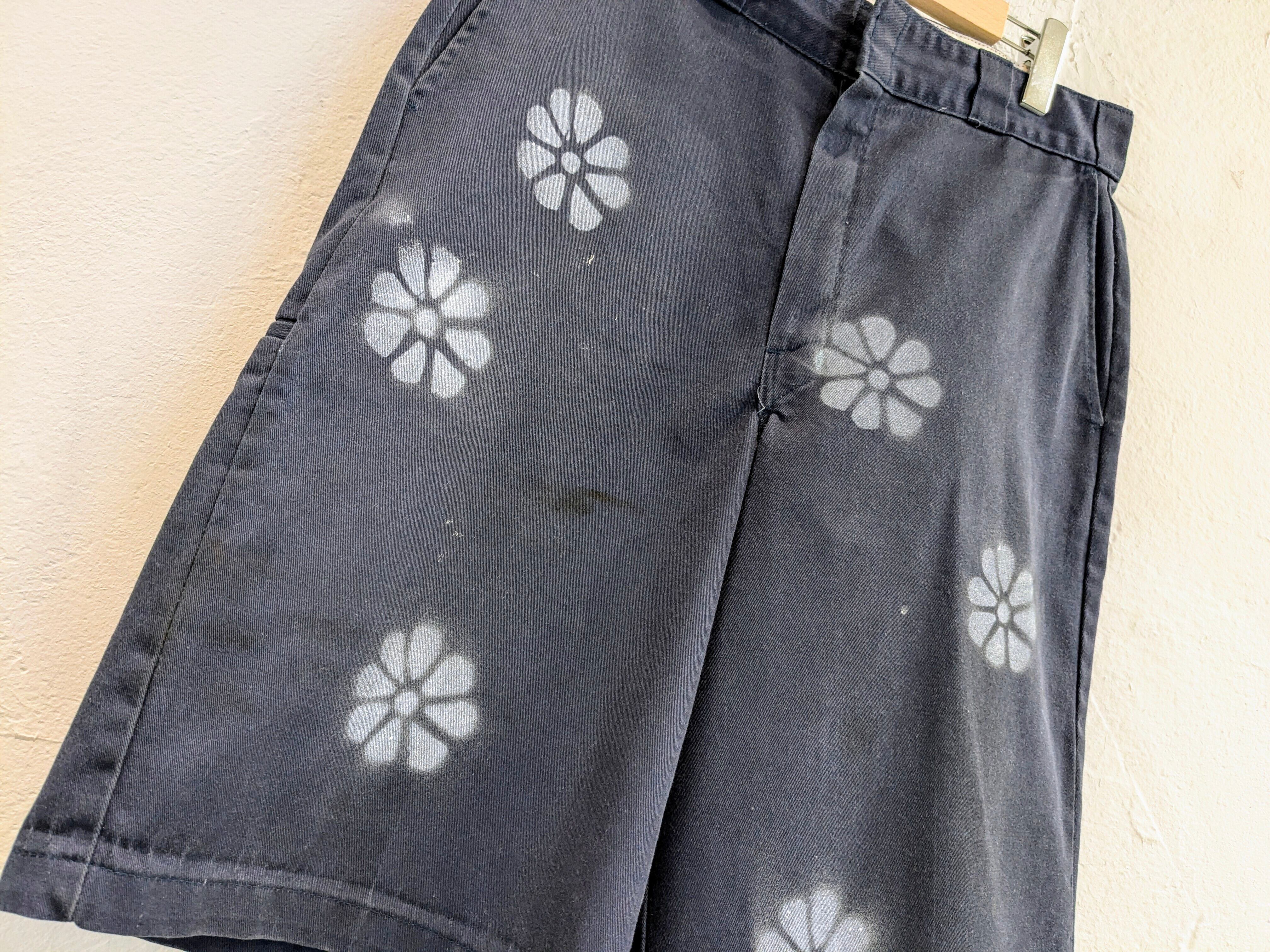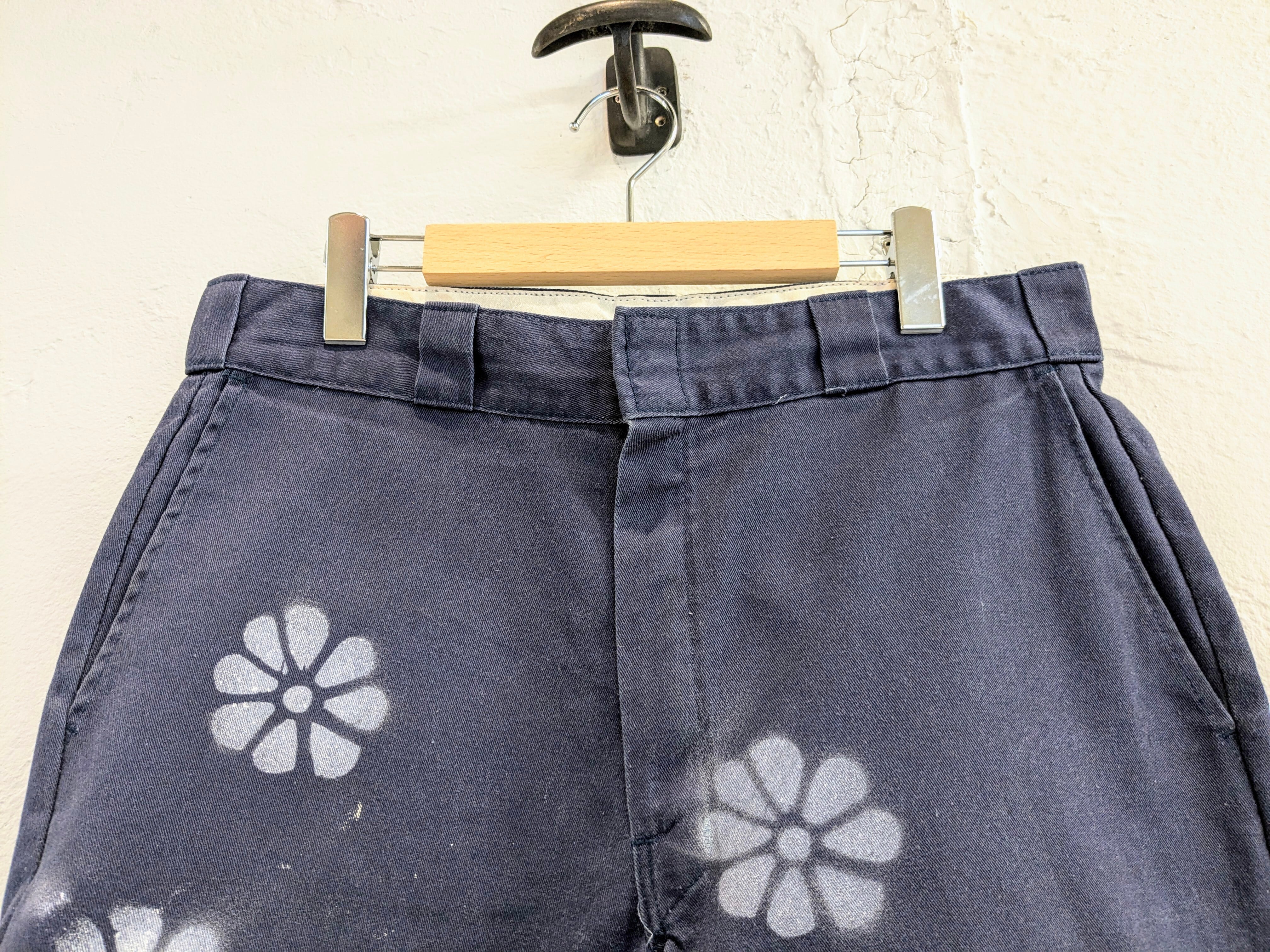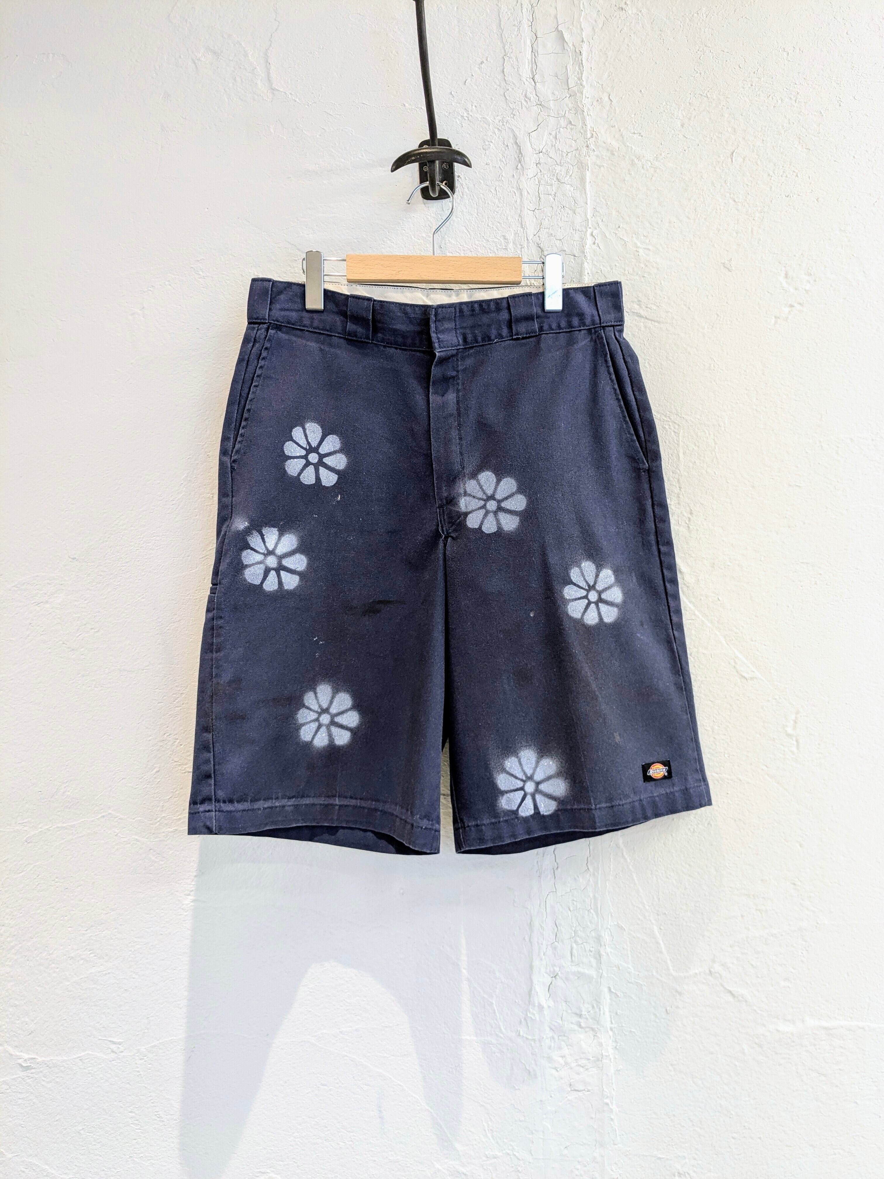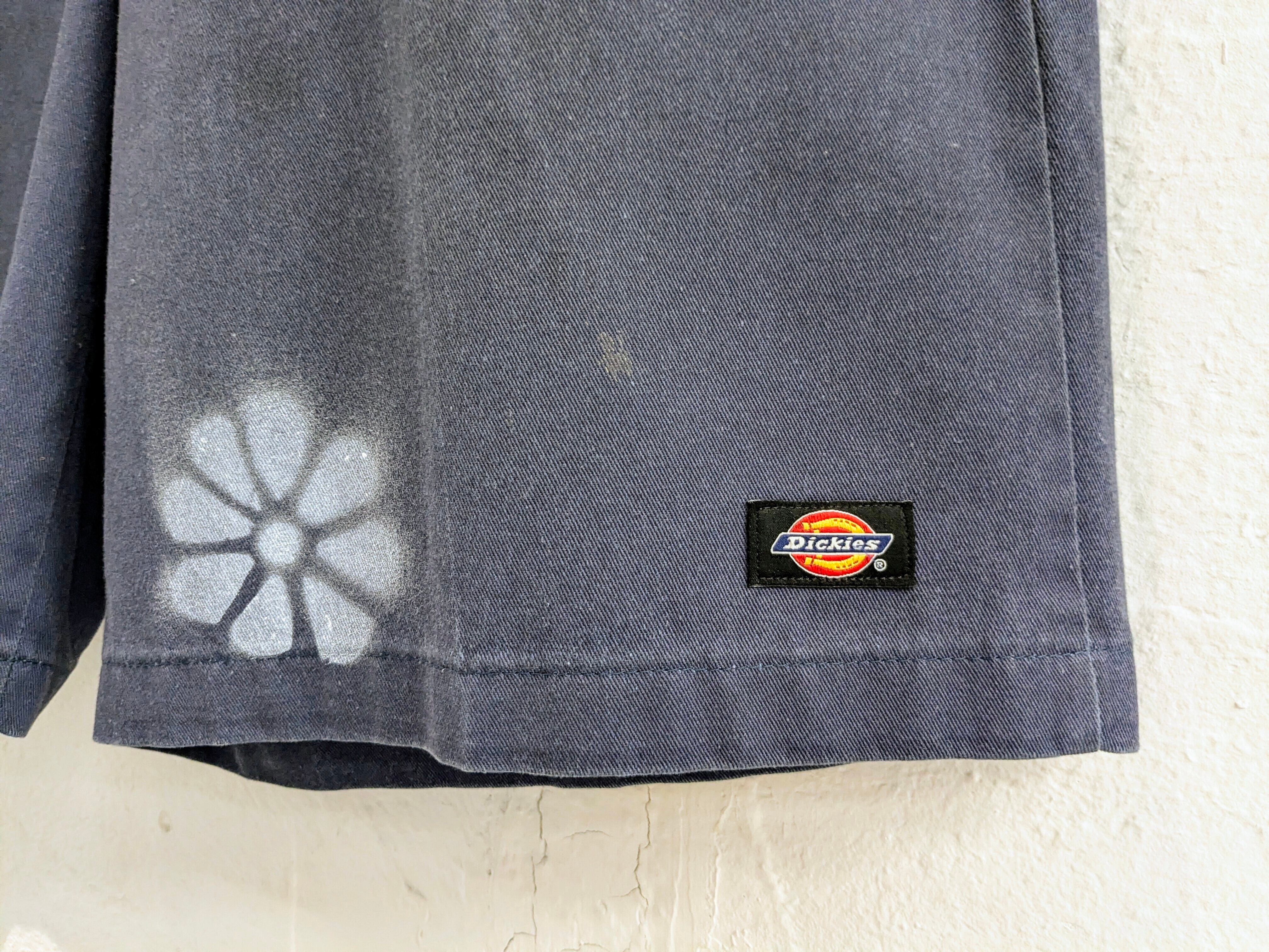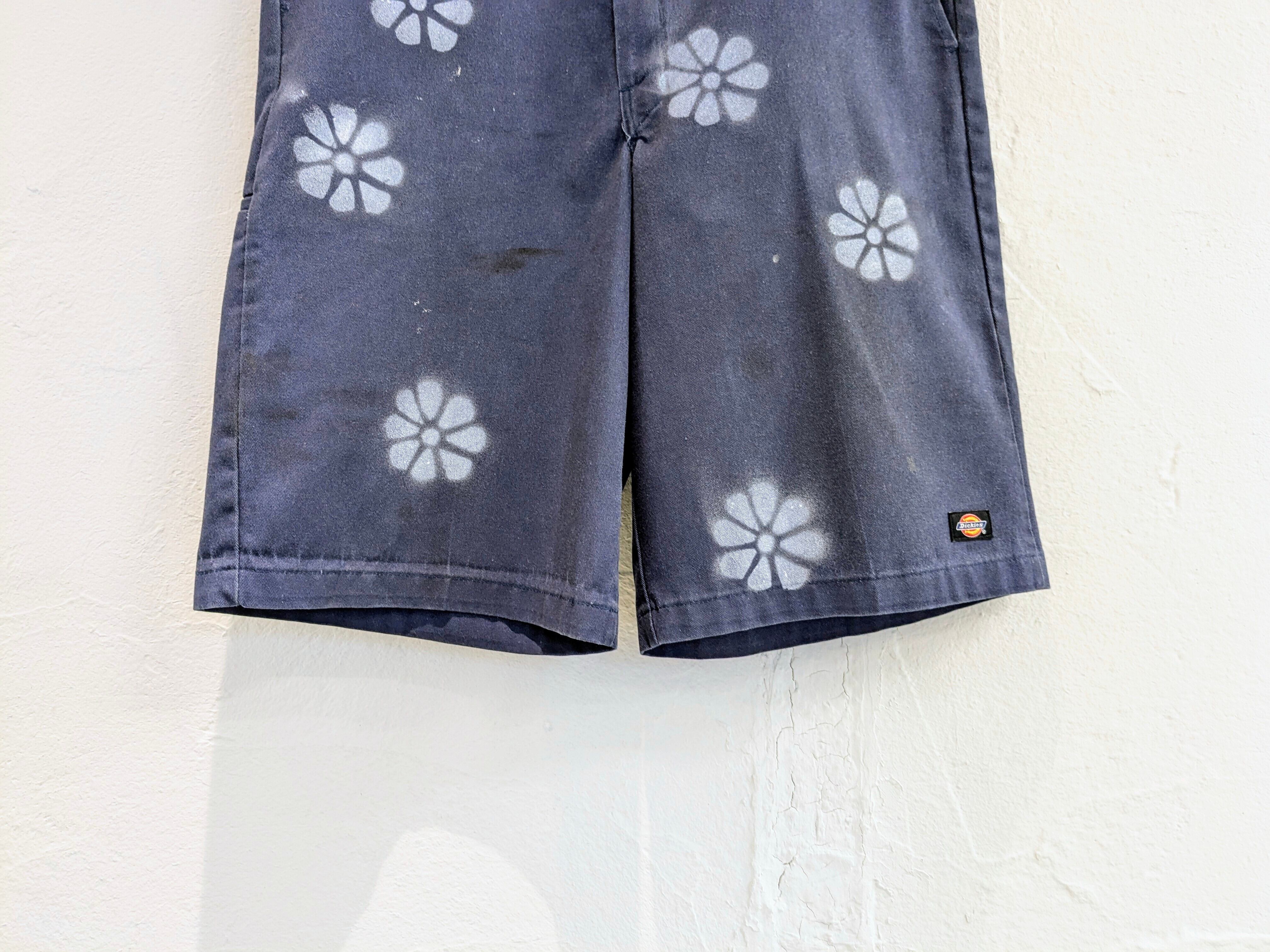 ユーズドのディッキーズのショーツにエアブラシで花柄を施したアイテム。全体的に入っており、目を引くデザインとなっています。元々汚れが入った個体を使用しています。ゆえに、花柄意外にも汚れ、ボロの要素も入っている雰囲気のいい一着に仕上がっています。シルエットは、ワイドで膝下の丈なので今っぽさも兼ね備えたアイテム。