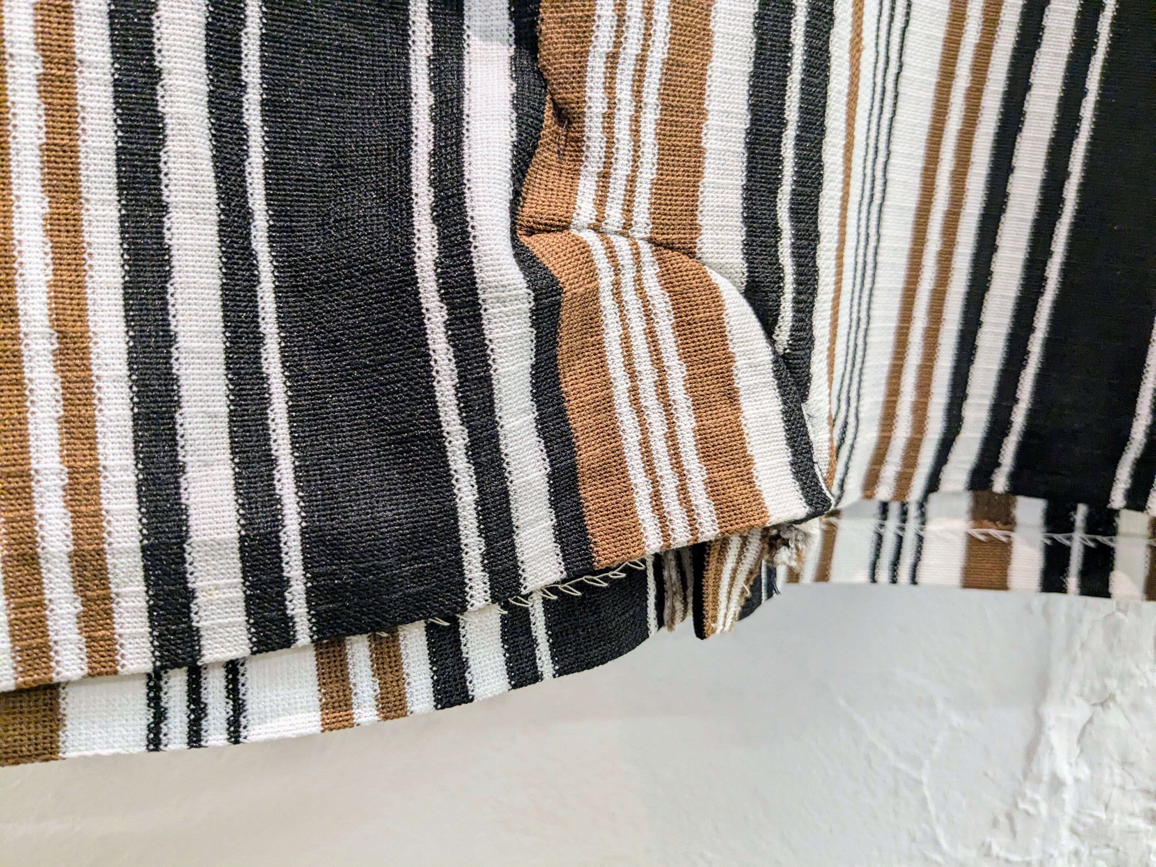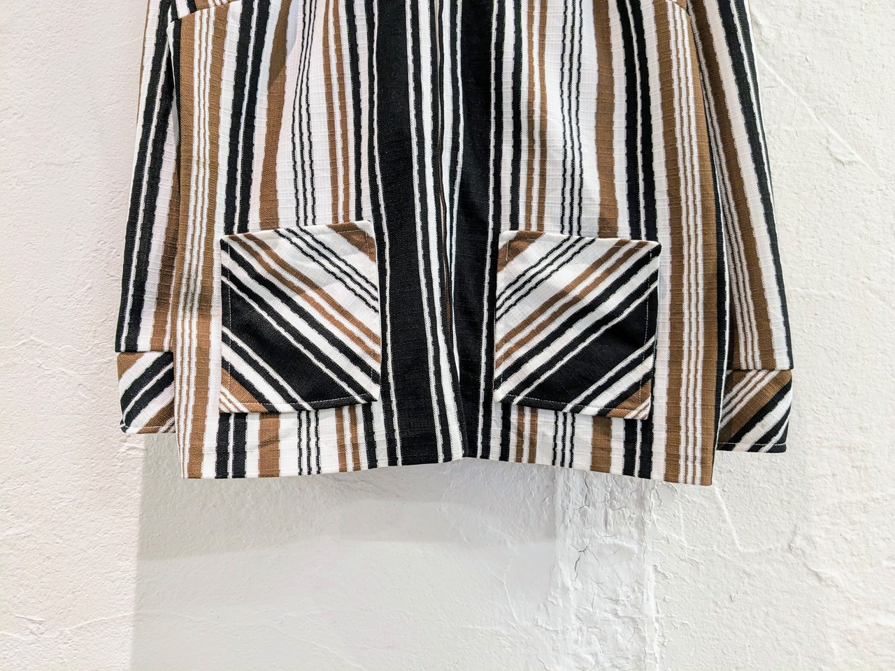 ストライプの入り方はランダムに入っています。ニット素材でとても軽く着やすいアイテム。ニットと言っても、おそらくアクリルとかになると思いますので、暑すぎるといったことはなく、真夏以外はアウター、インナーと着ていただけまく。さりげなくタロンジップを使用。リペアが後ろ裾に入っています。
