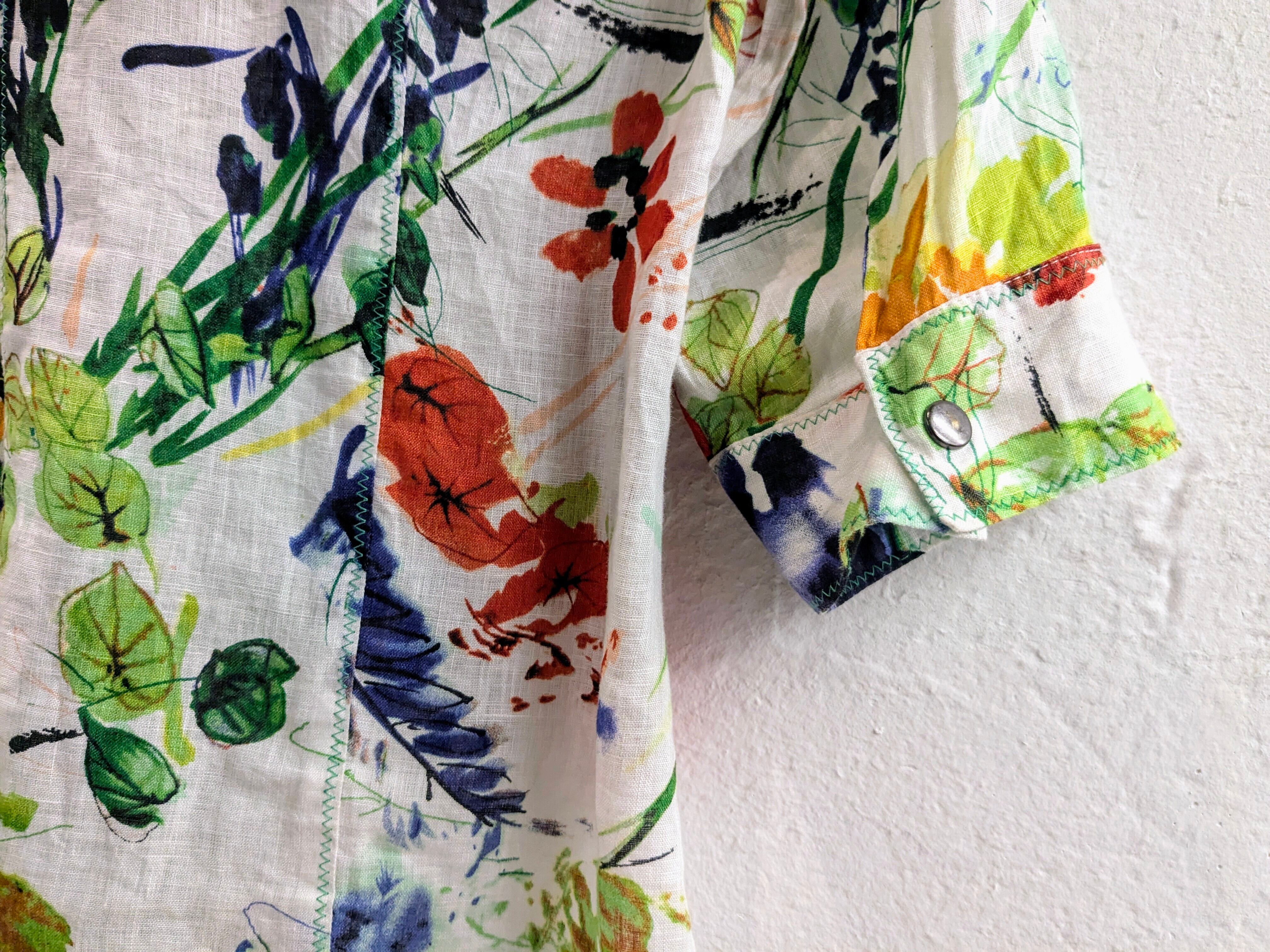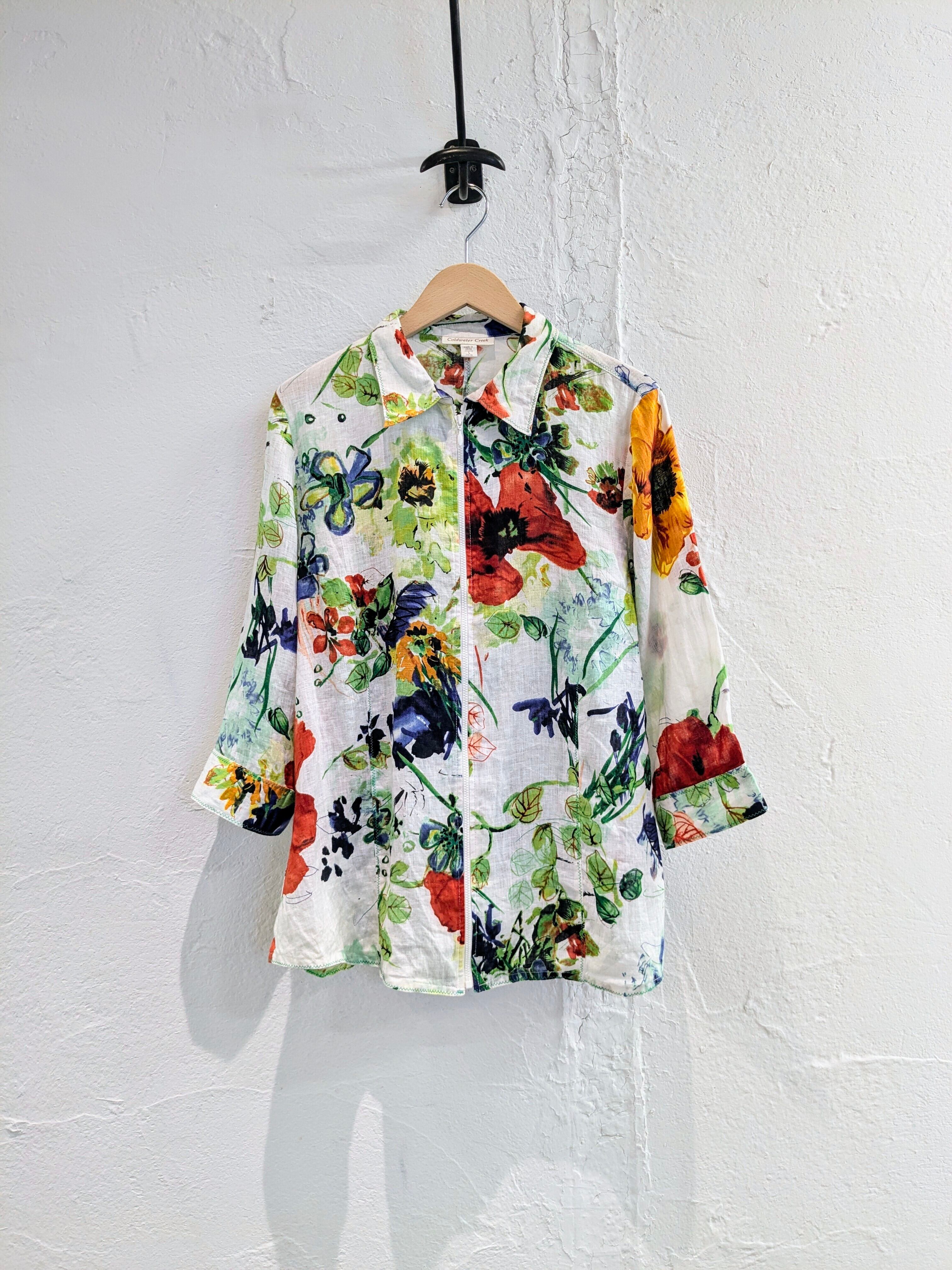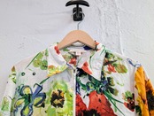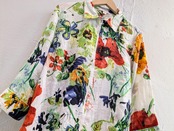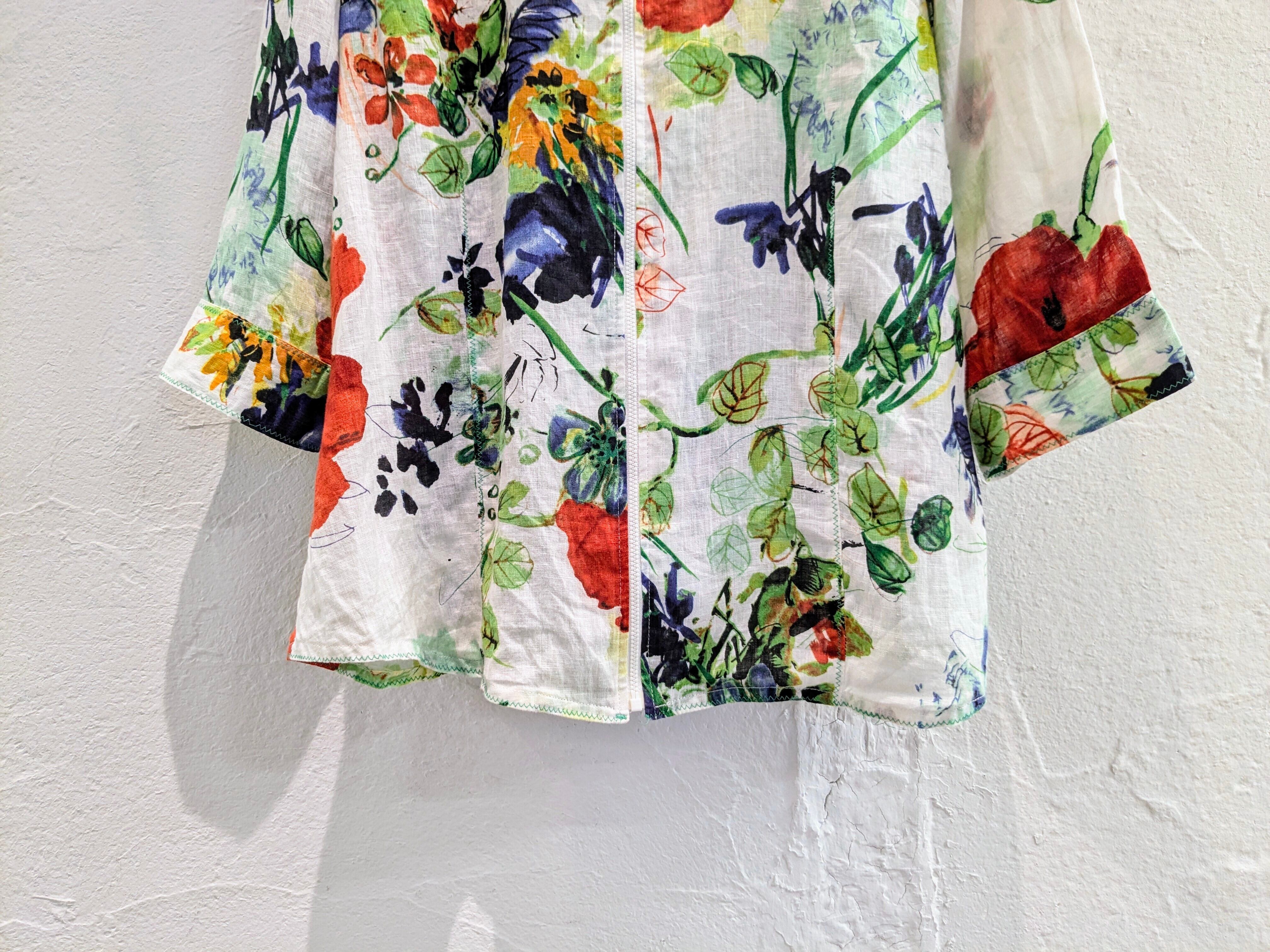 手書き風にプリントされた花柄がとても上品なアイテム。このデザインでジップアップのブルゾンタイプはあまり見ないデザインかと。夏場でもさらっと、涼しく羽織れます。素材の関係かジップが少しつっかかりますが、問題なく着ていただけます。