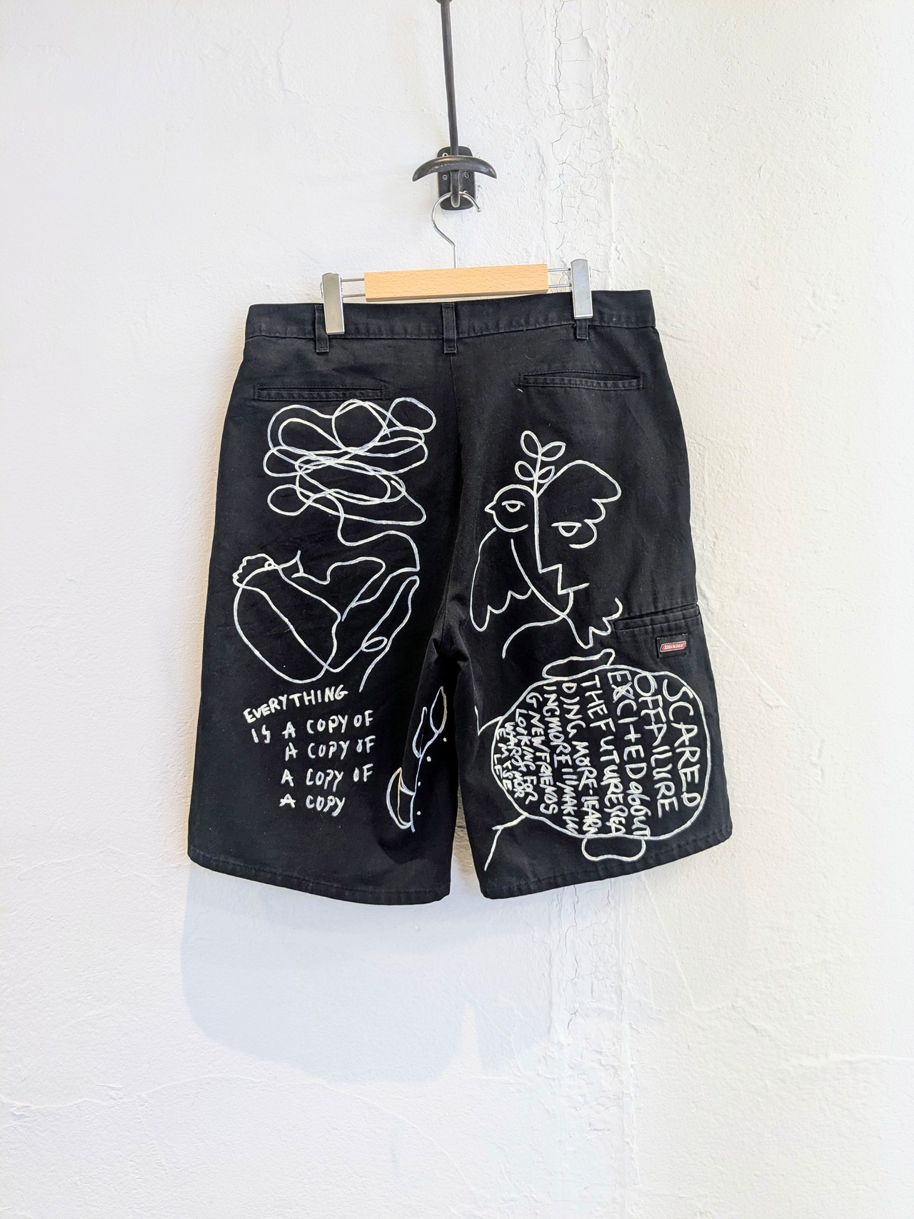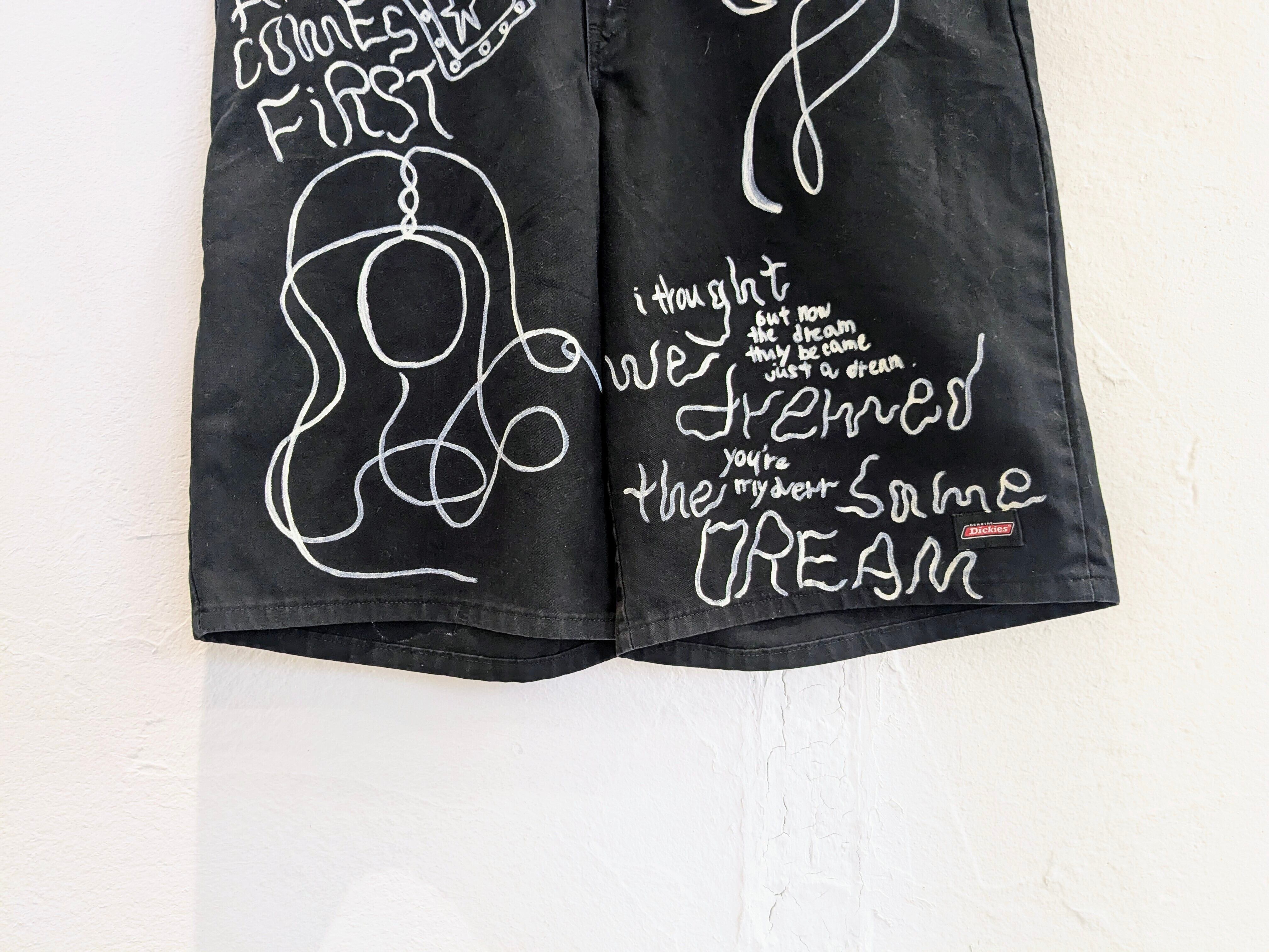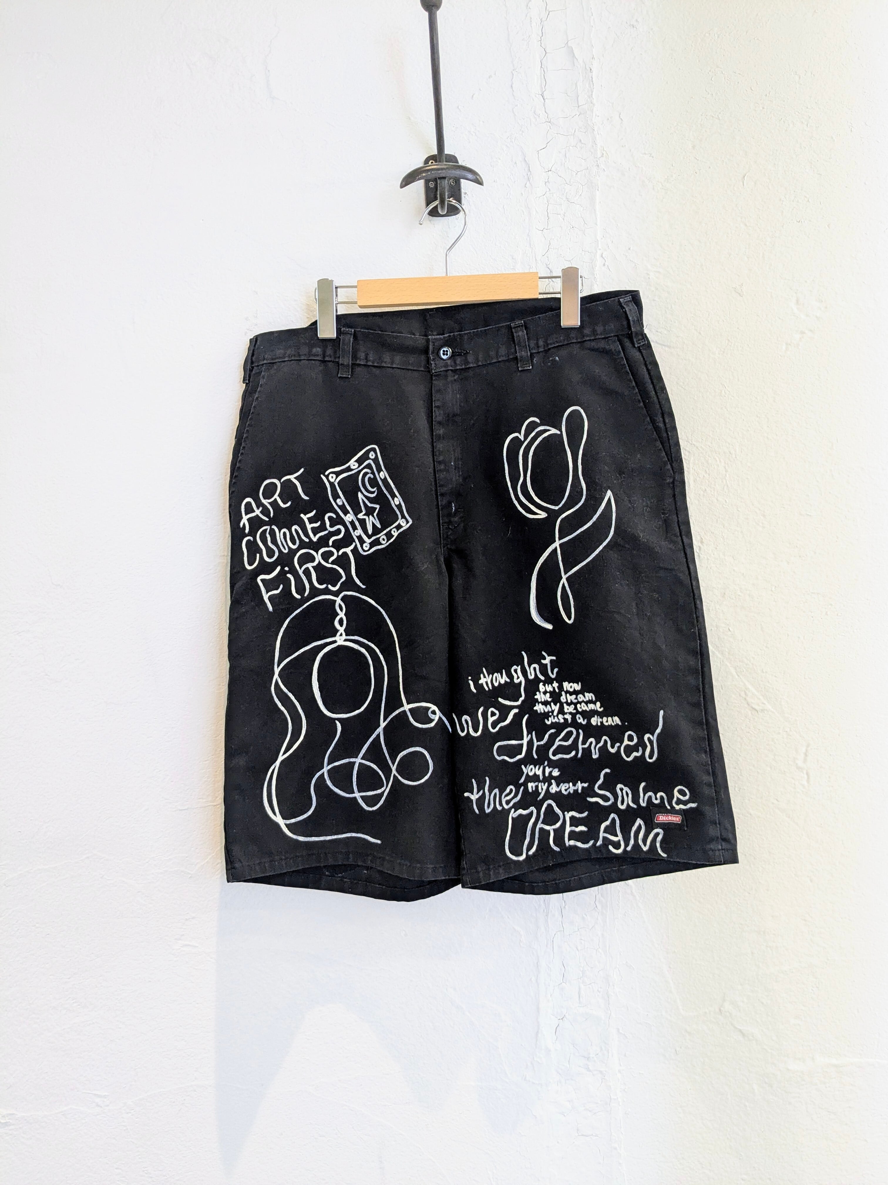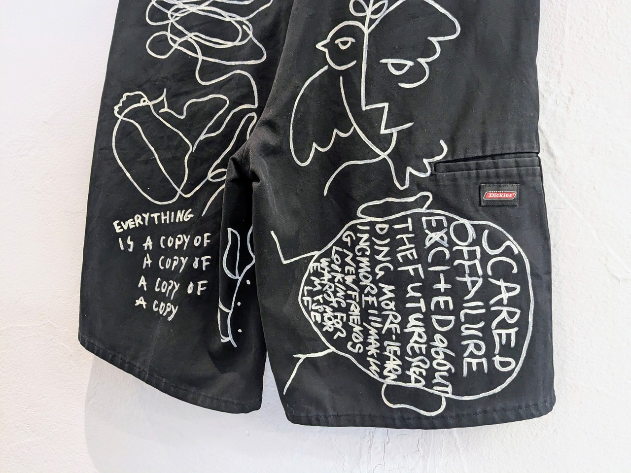 古着のディッキーズのショーツに線画でデザインを加えてもらったアイテム。線画、一筆書きのような雰囲気でどこか味のあるデザインとなっています。全て手描きでのイラストになりますので、一点物となります。ワイド、膝下くらいの丈で形としても今っぽさがあります。元々の個体の汚れなどがございます。
