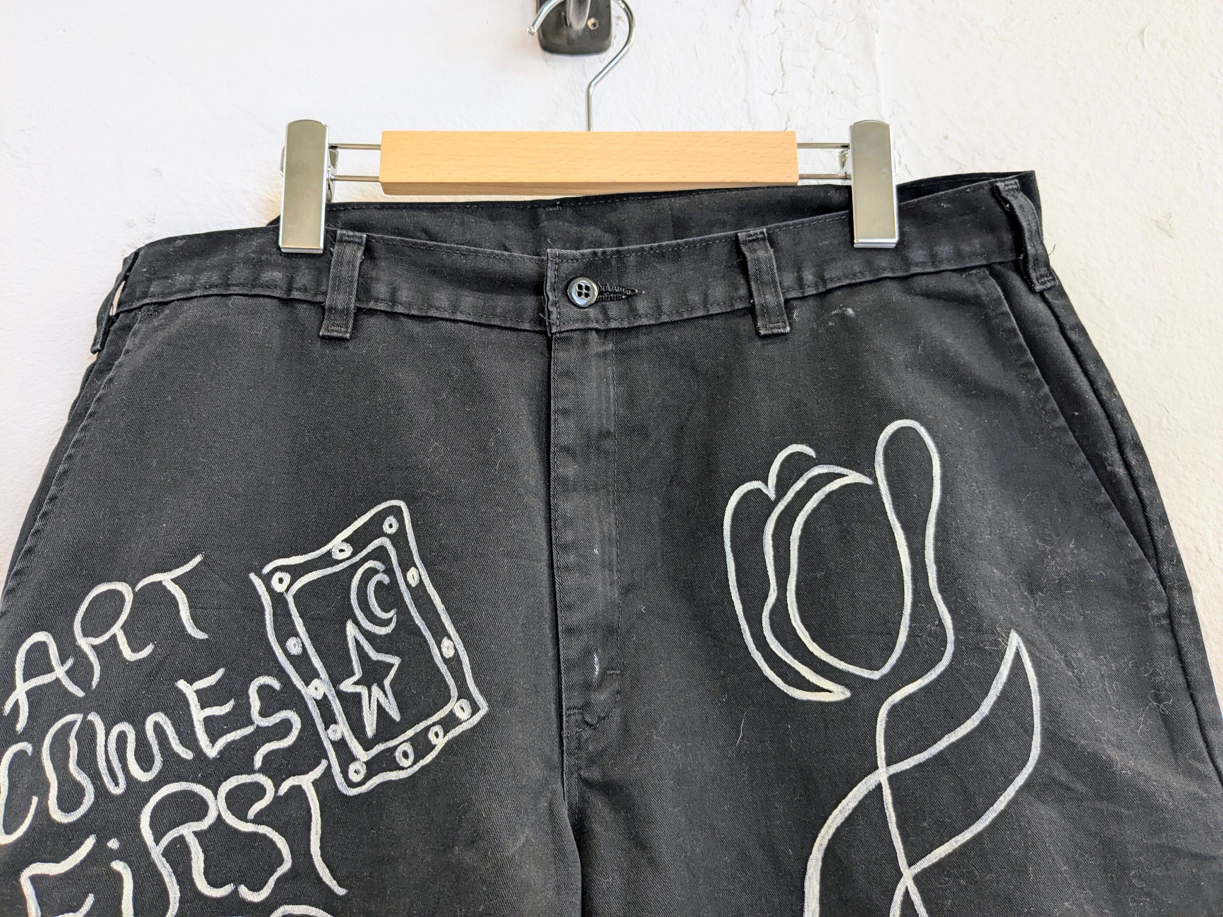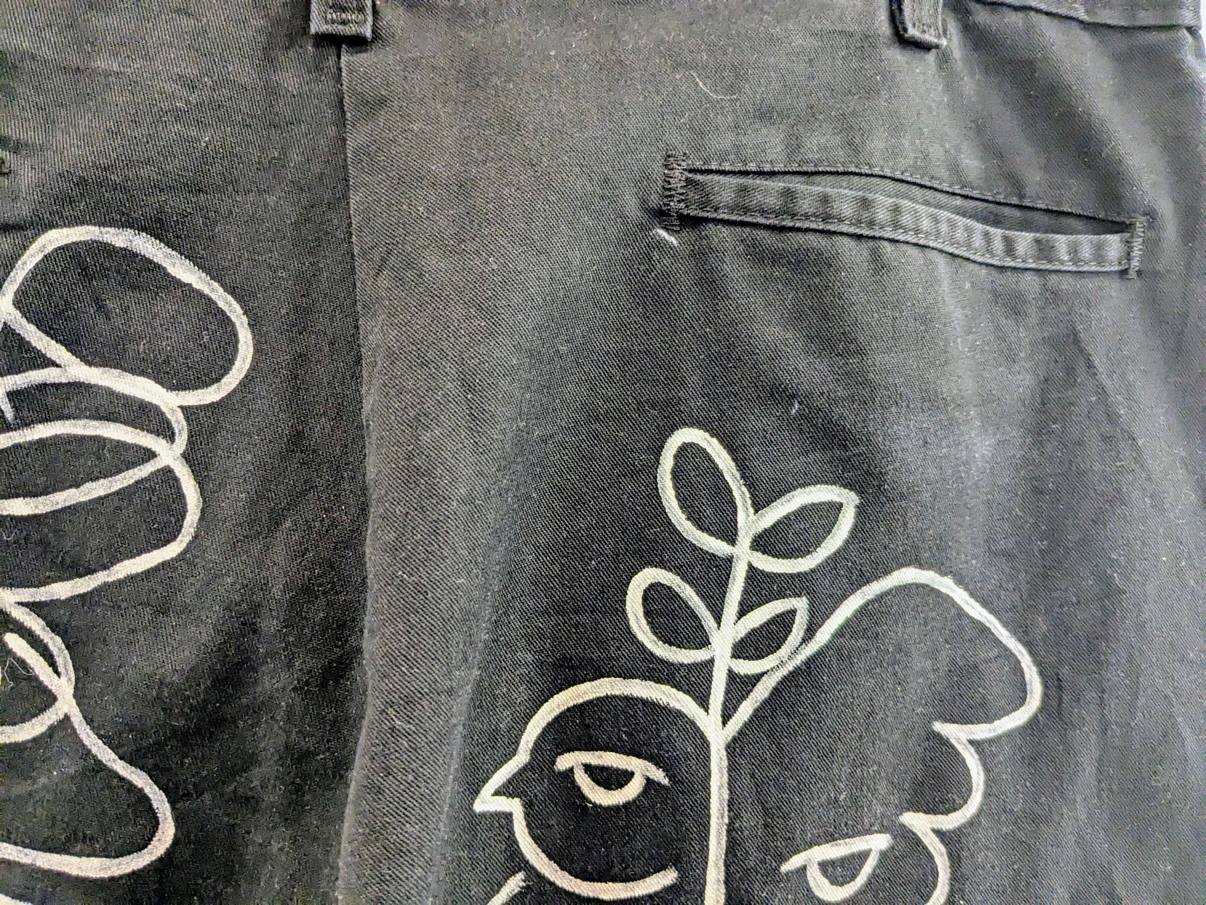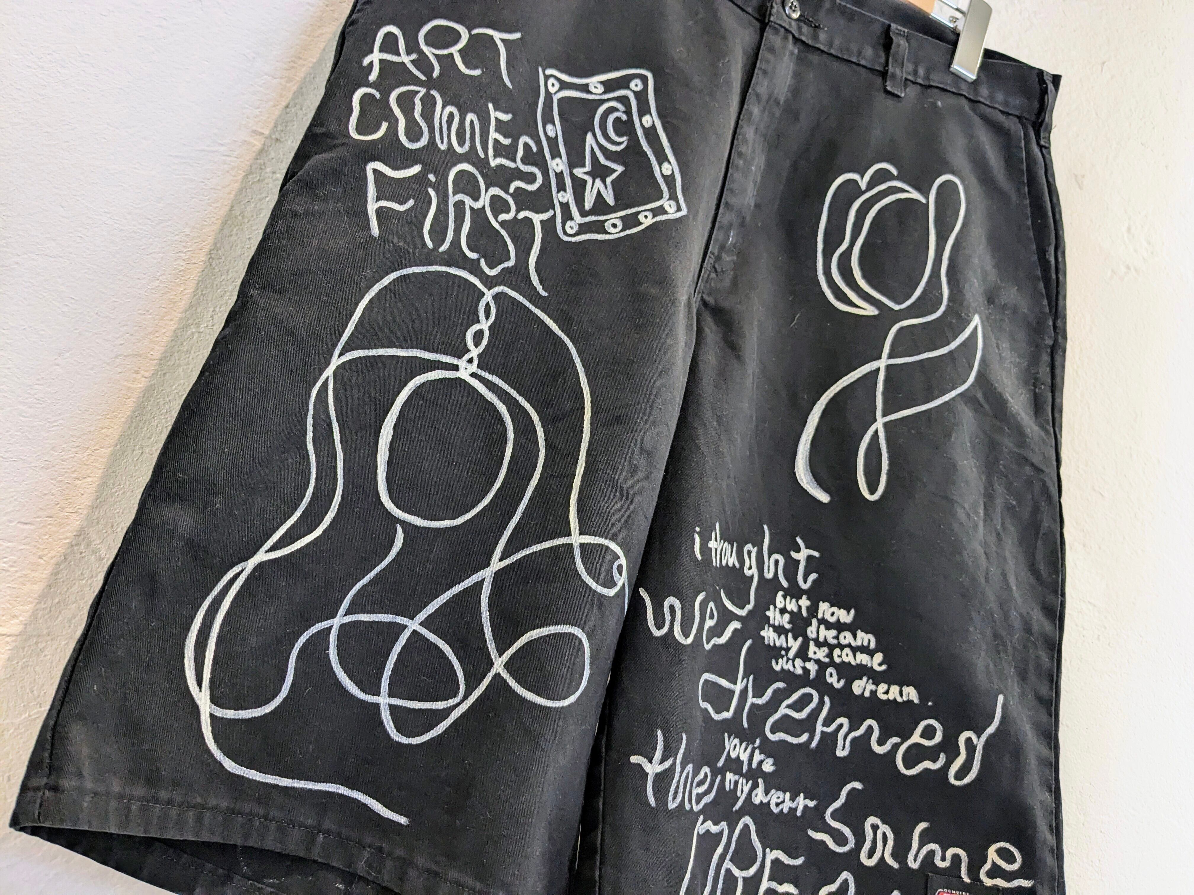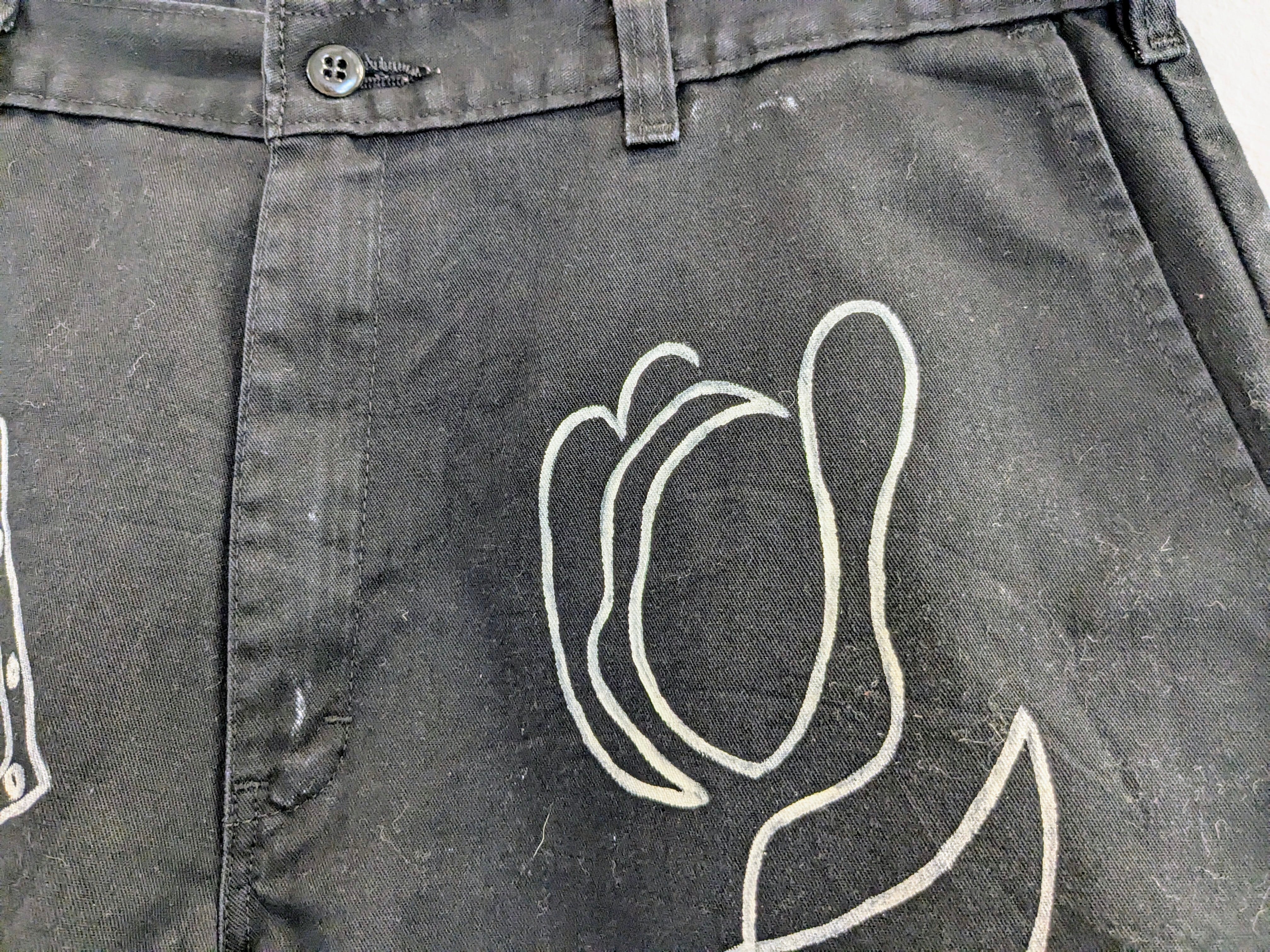 古着のディッキーズのショーツに線画でデザインを加えてもらったアイテム。線画、一筆書きのような雰囲気でどこか味のあるデザインとなっています。全て手描きでのイラストになりますので、一点物となります。ワイド、膝下くらいの丈で形としても今っぽさがあります。元々の個体の汚れなどがございます。