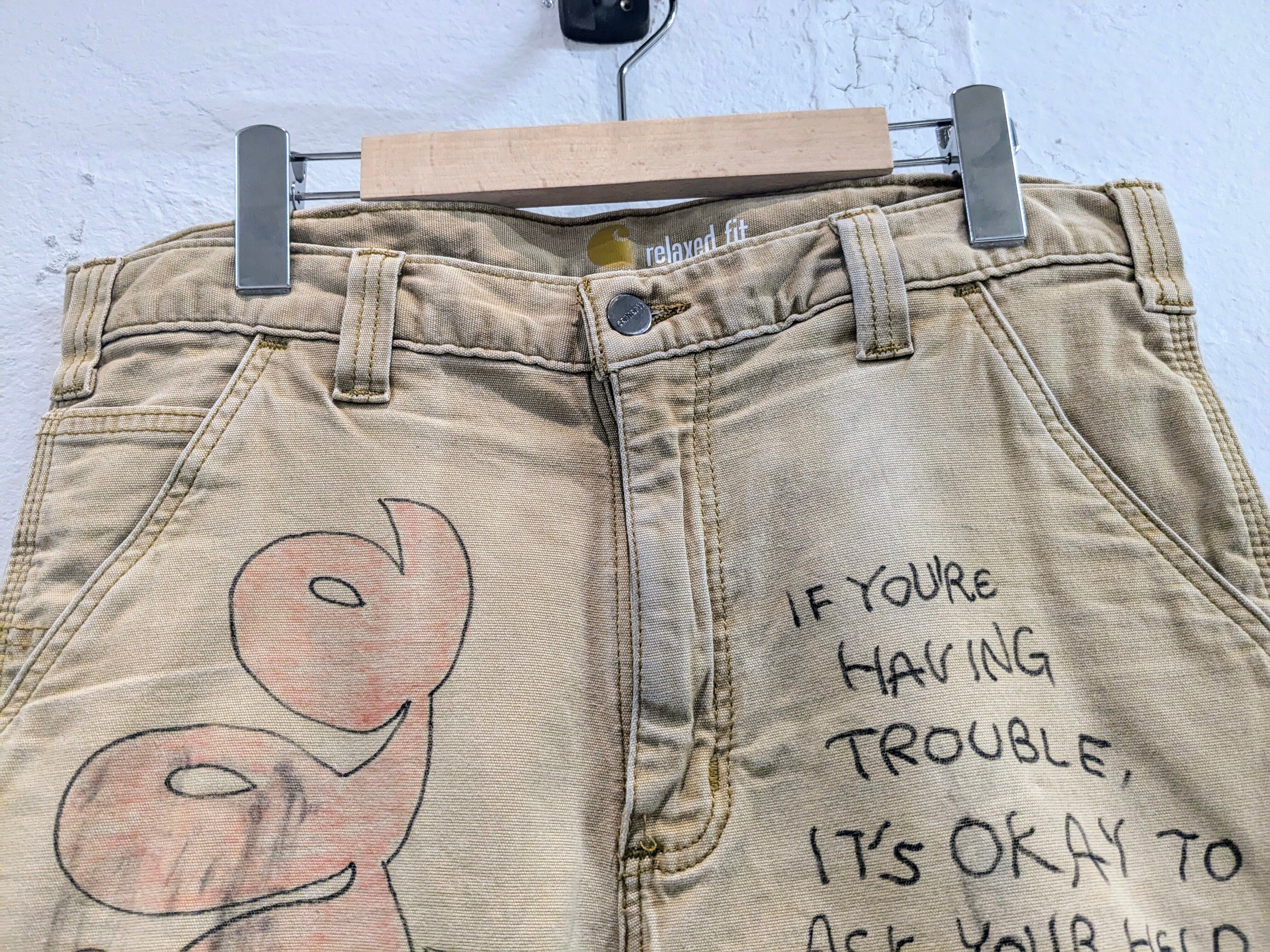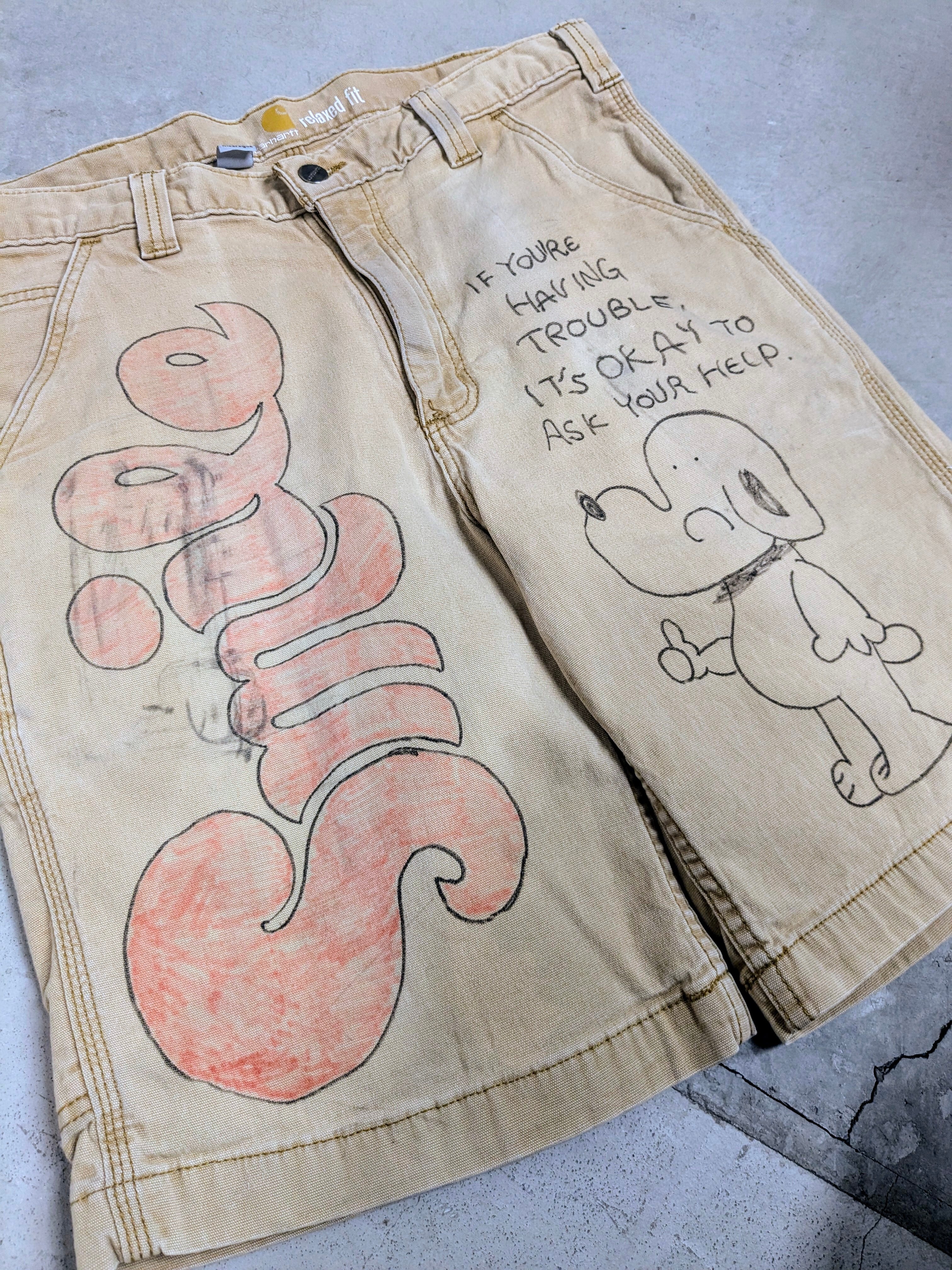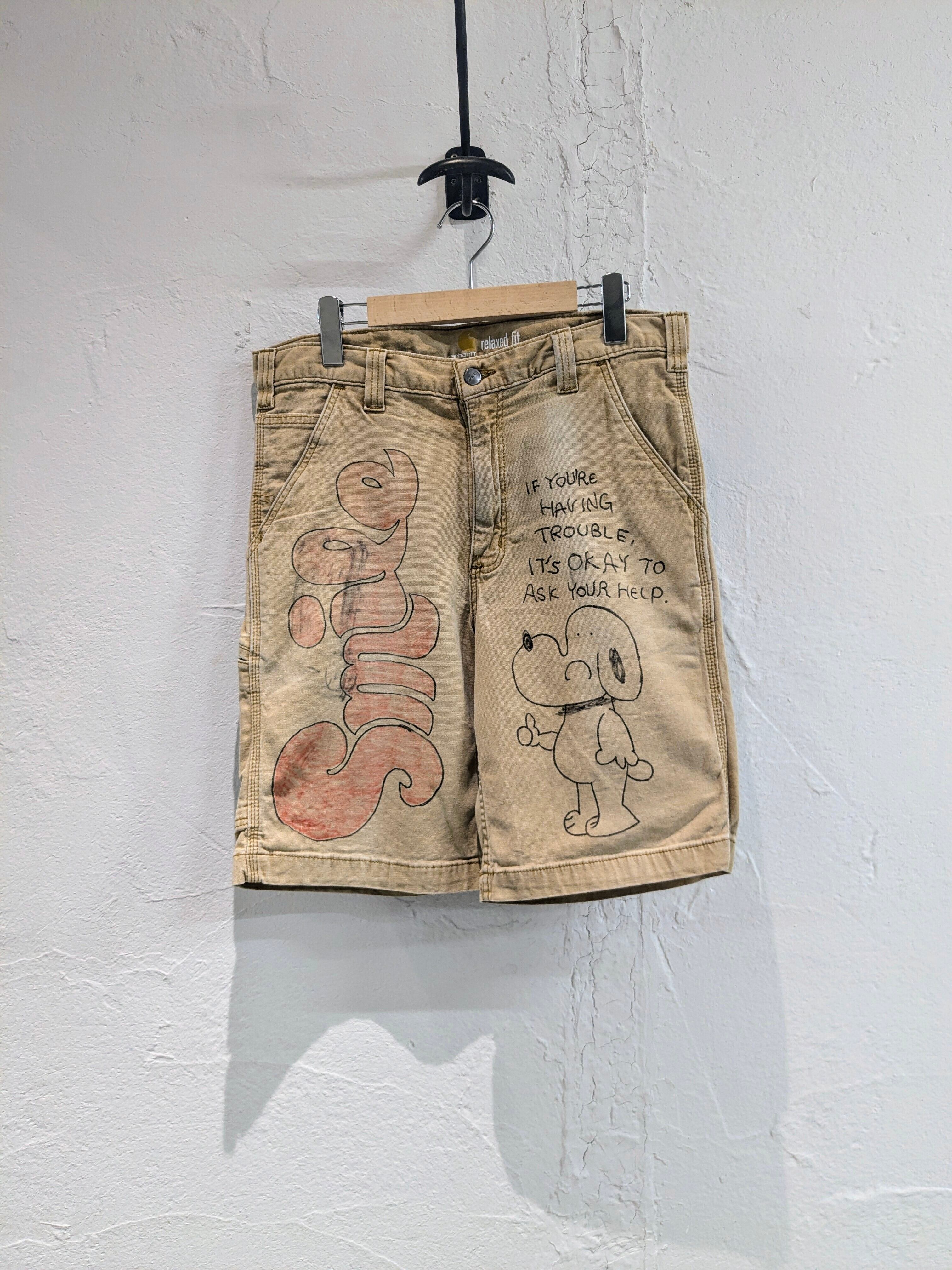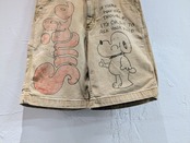 ライトダックの生地のショートパンツにイラストを加えてもらっています。汚れなどは元々のもので雰囲気のあるパンツにメモリアルの要素を加えたアイテム。無骨な男らしいアイテムに可愛いイラストがいい意味でアンバランスな感じがとてもいい感じ。