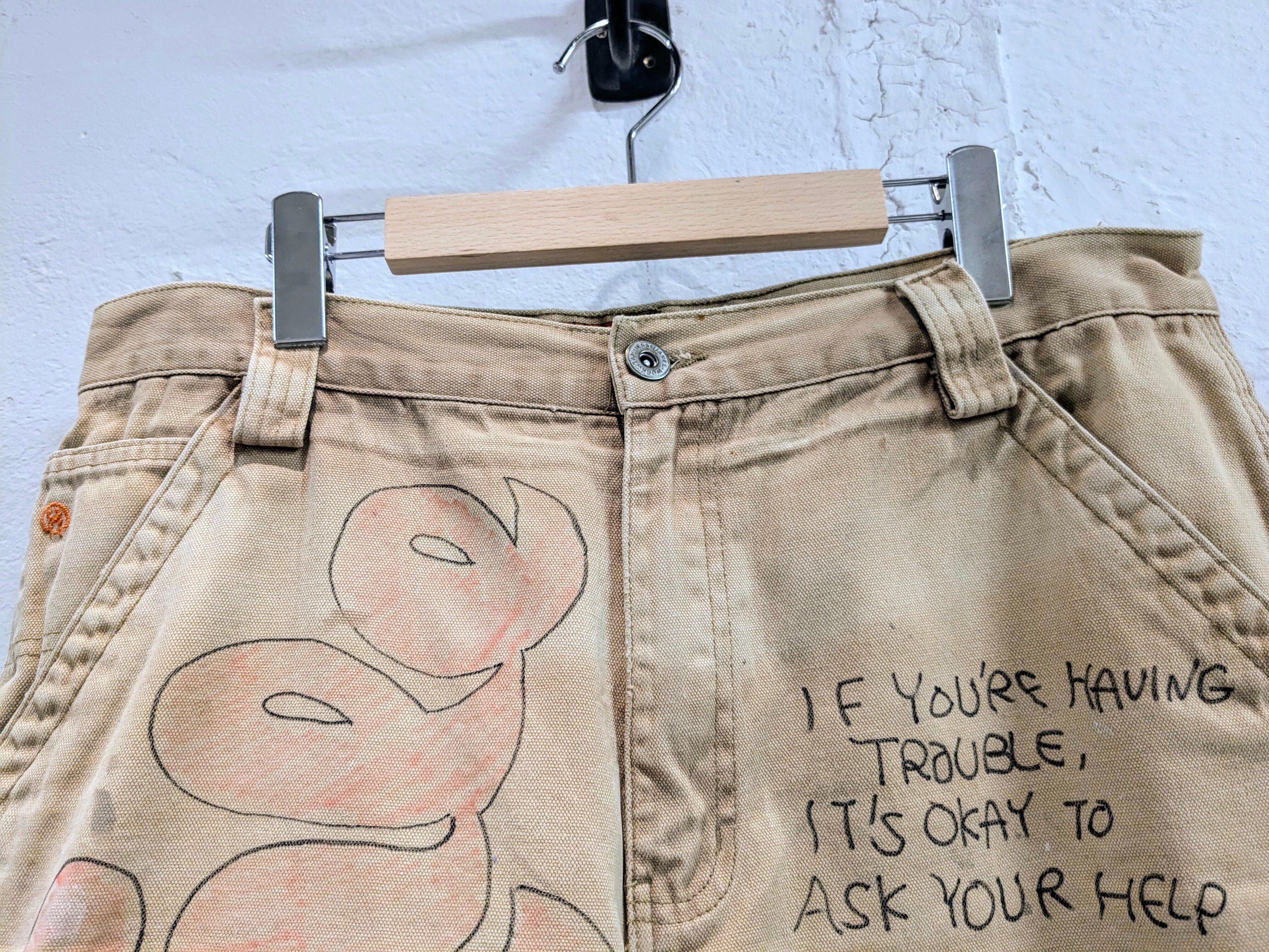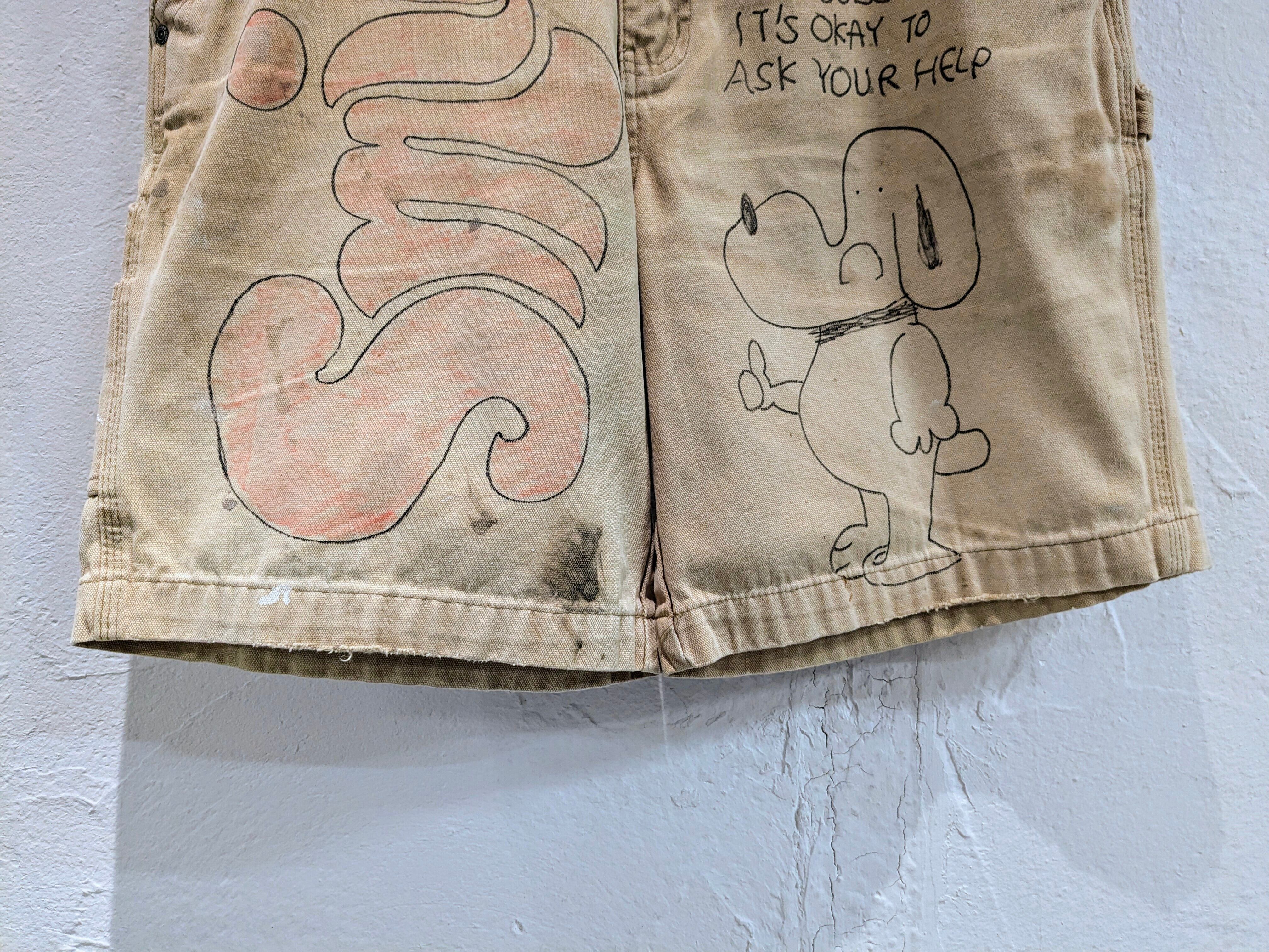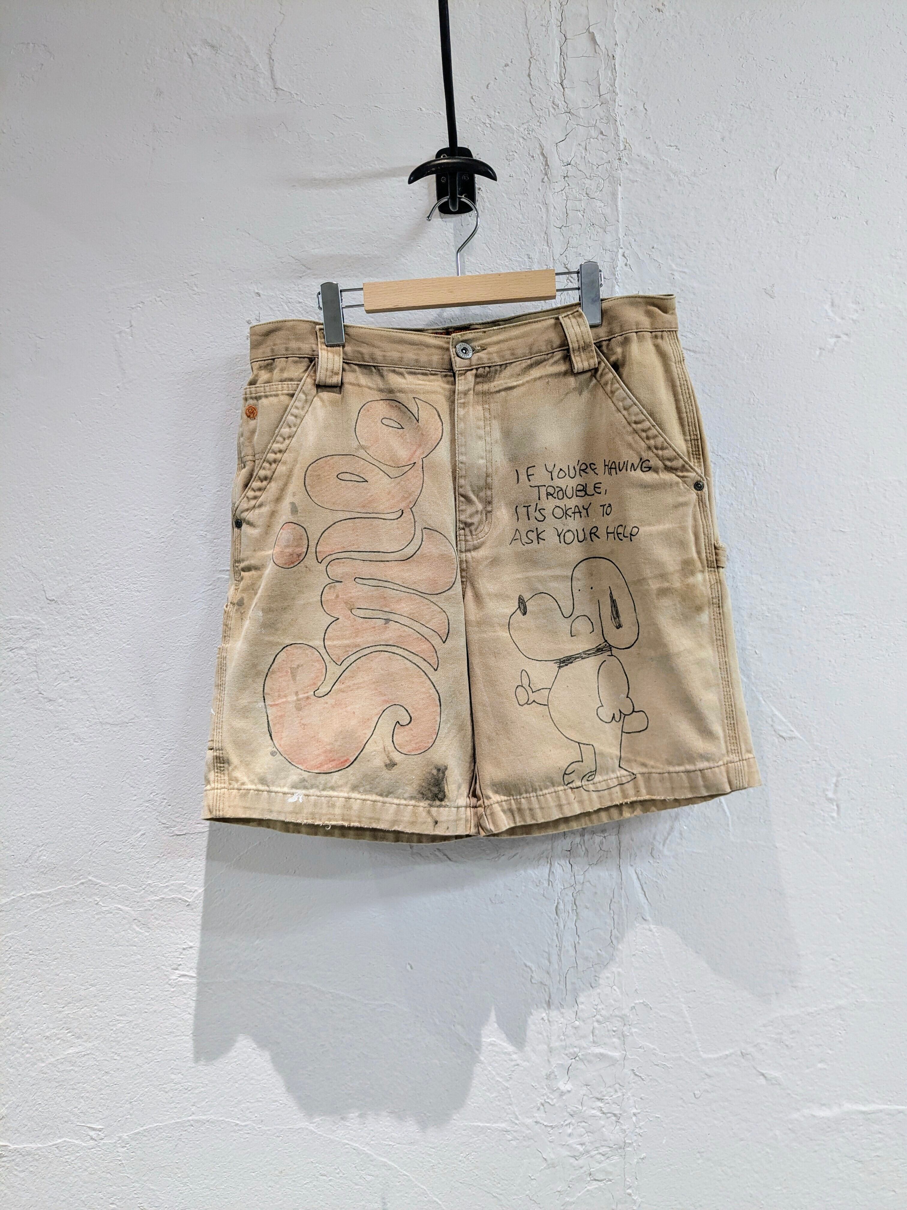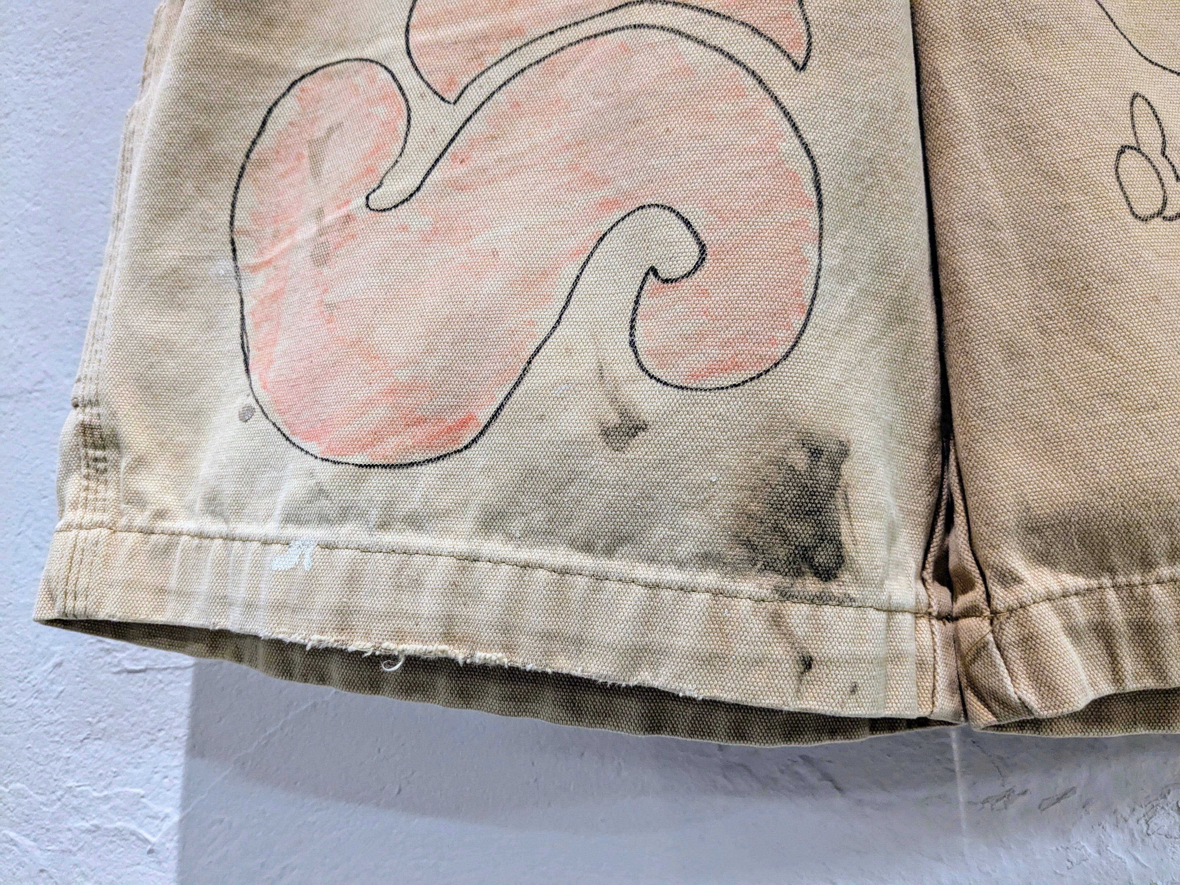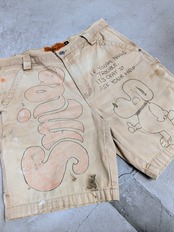 ダックの生地のショートパンツにイラストを加えてもらっています。汚れなどは元々のもので雰囲気のあるパンツにメモリアルの要素を加えたアイテム。無骨な男らしいアイテムに可愛いイラストがいい意味でアンバランスな感じがとてもいい感じ。