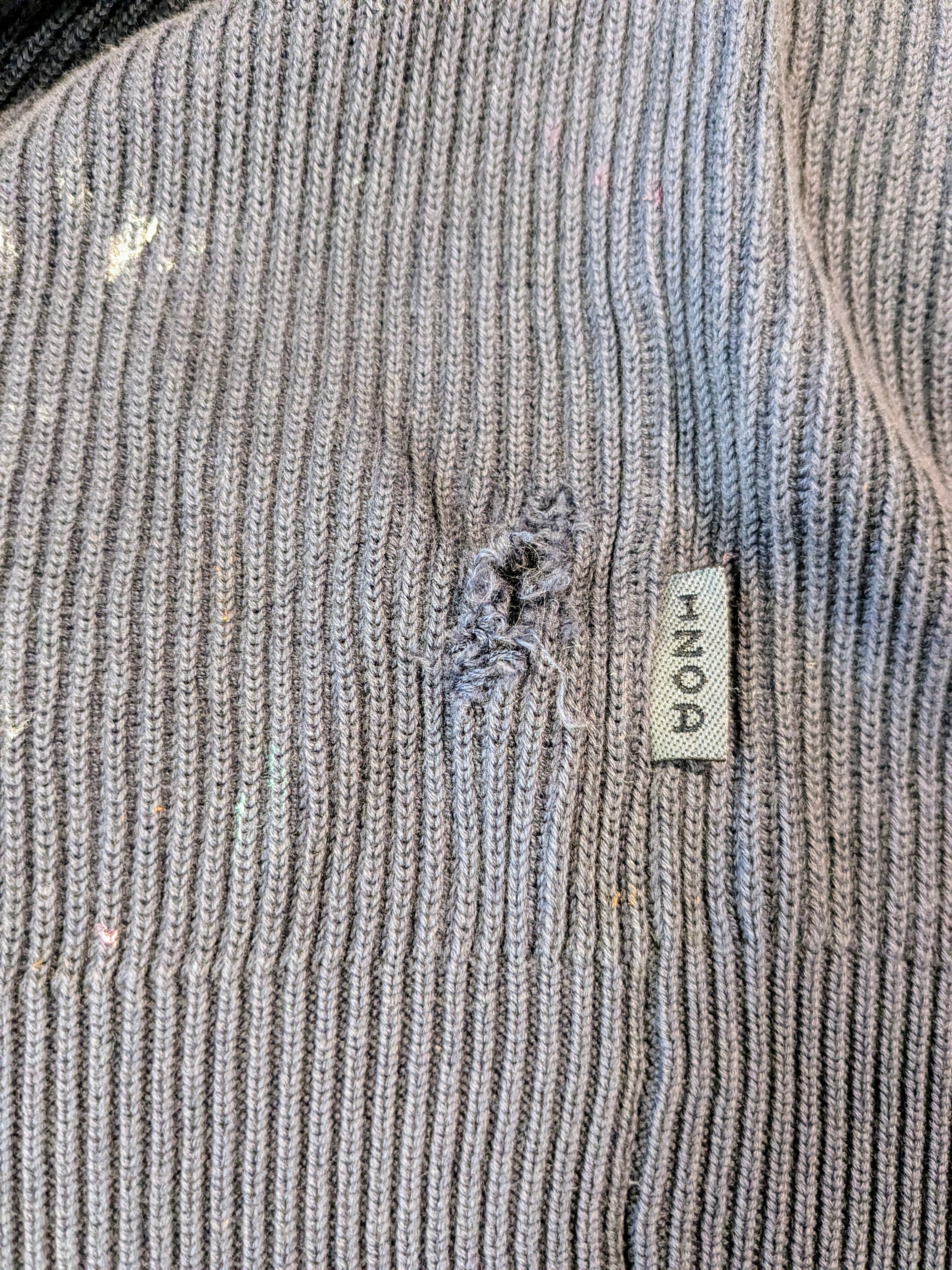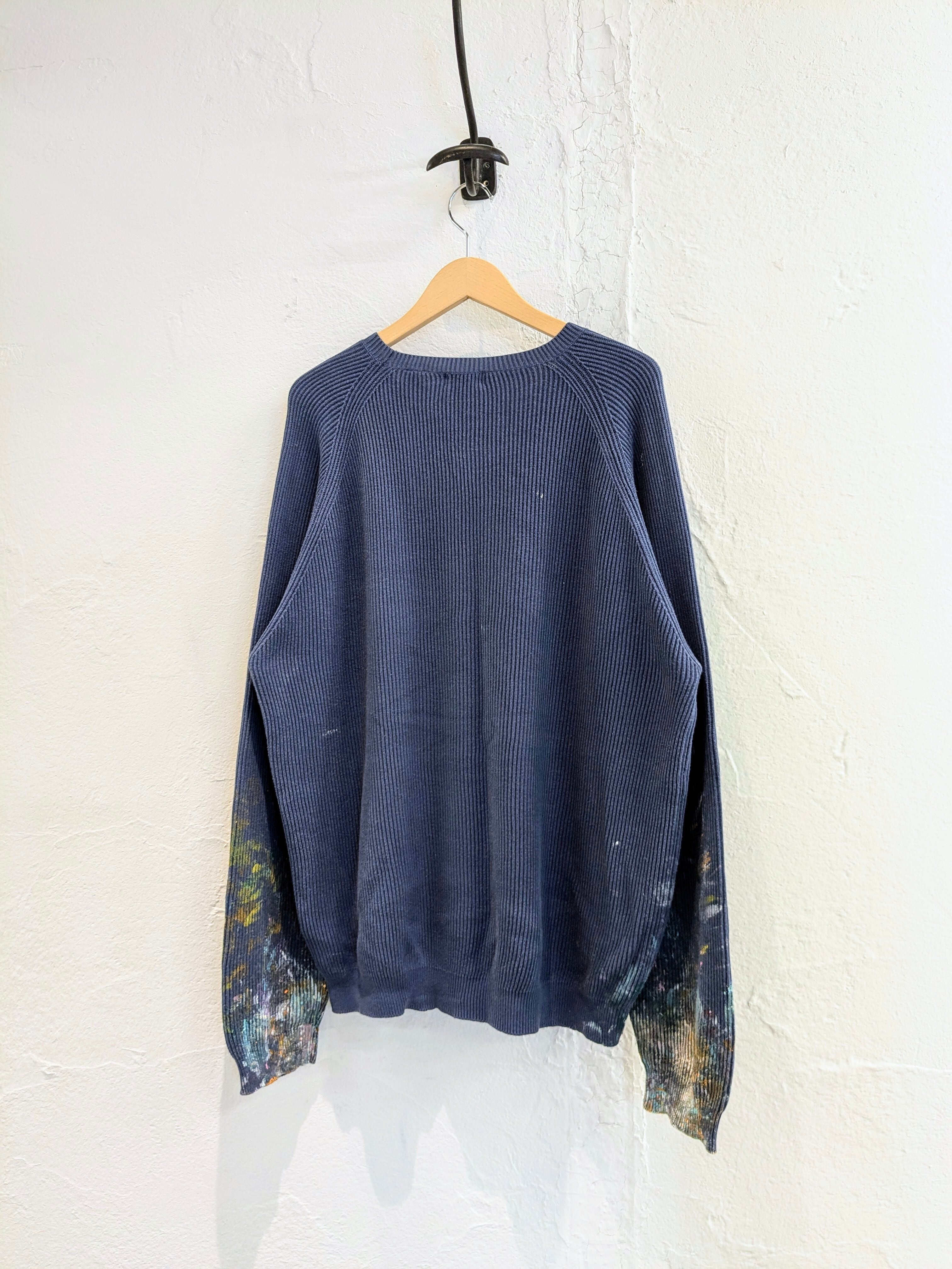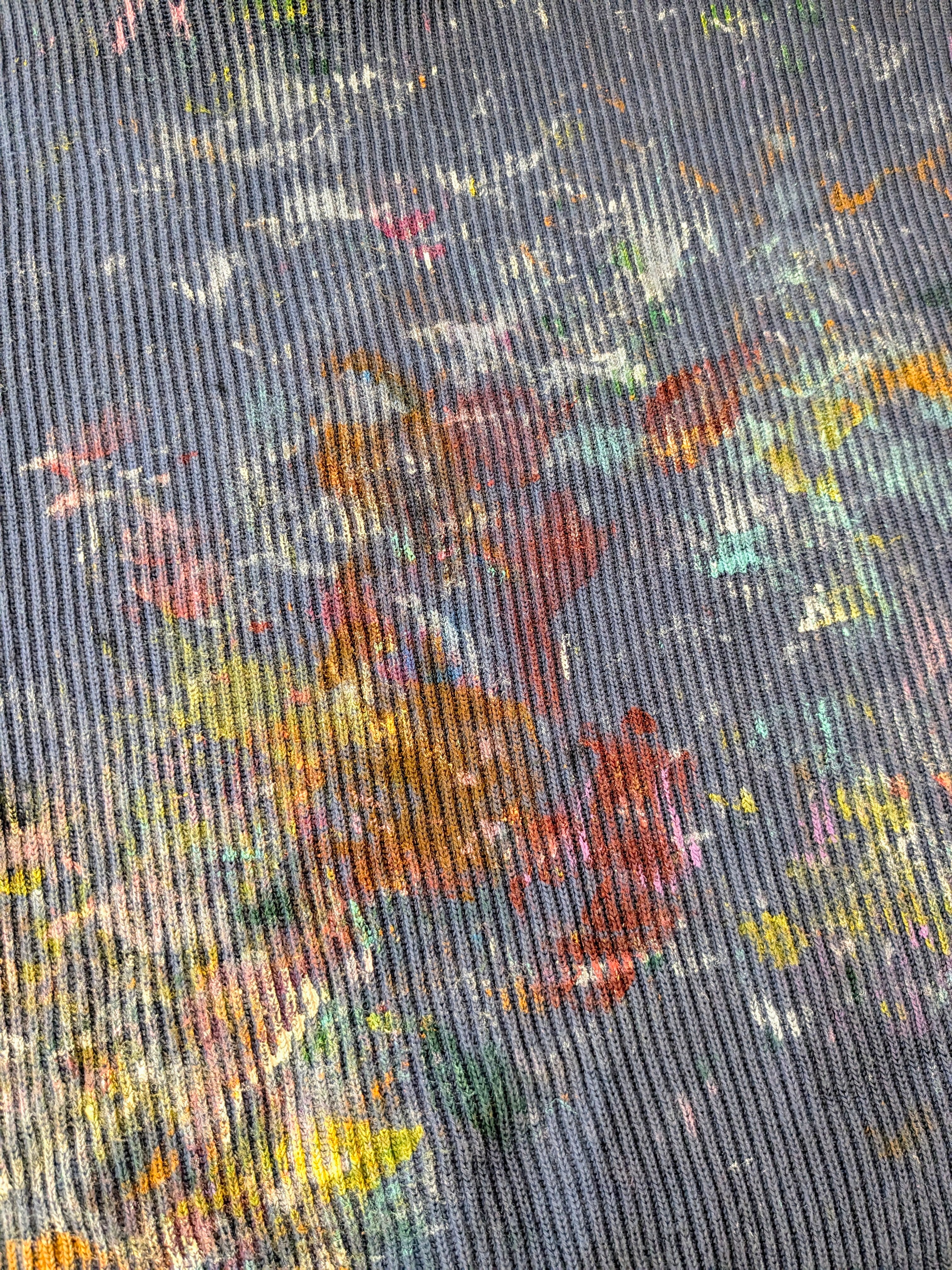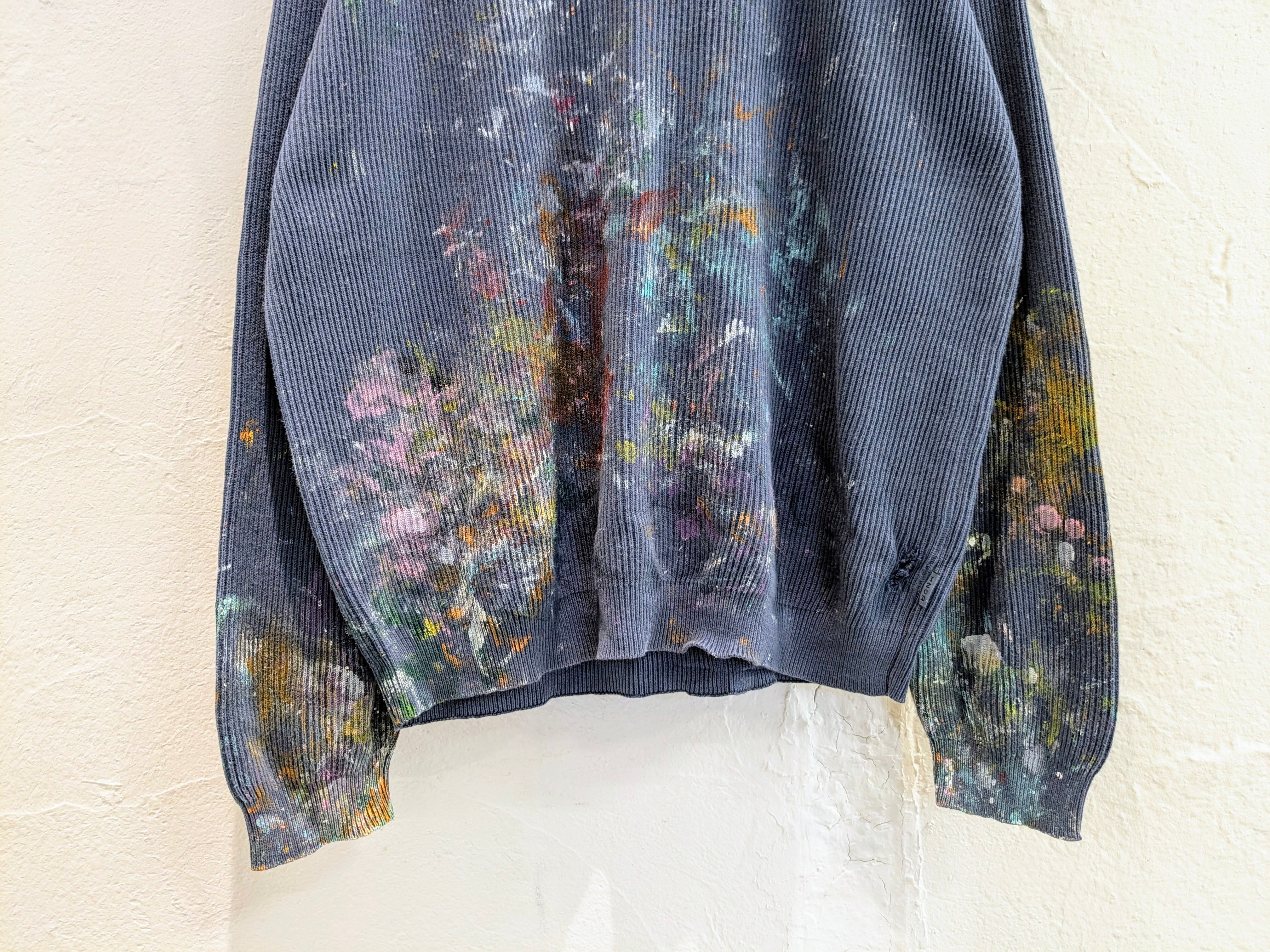 カラフルな感じにペイントされているアイテム。リアルな作業で汚れたようなデザインに仕上がっています。レーヨンが含まれているので、落ち感がありとても柔らかく着やすくなっています。リブ編みで凹凸があるので、肌の接地面が少なく快適に涼しく着ていただけます。キズあり。