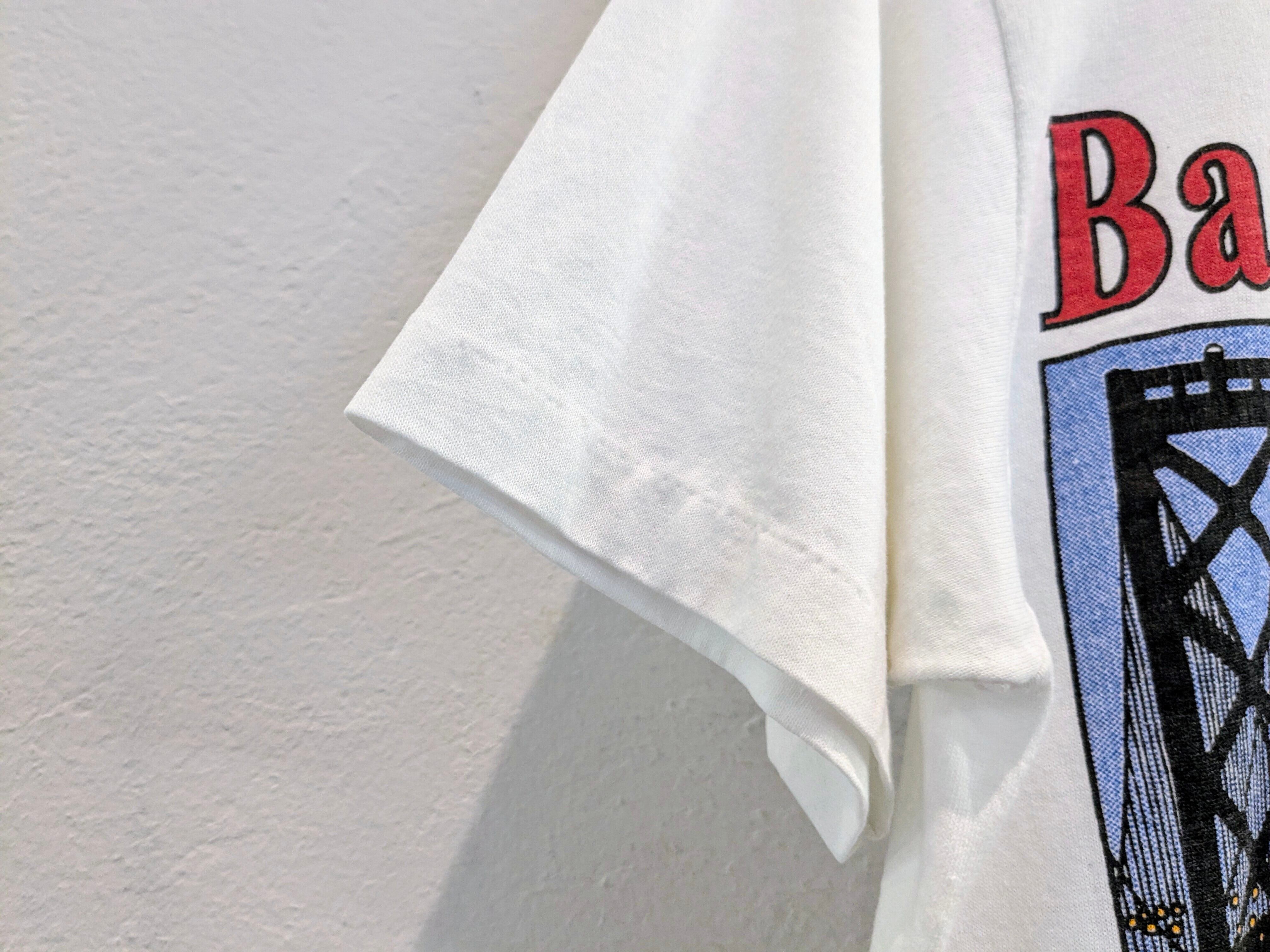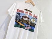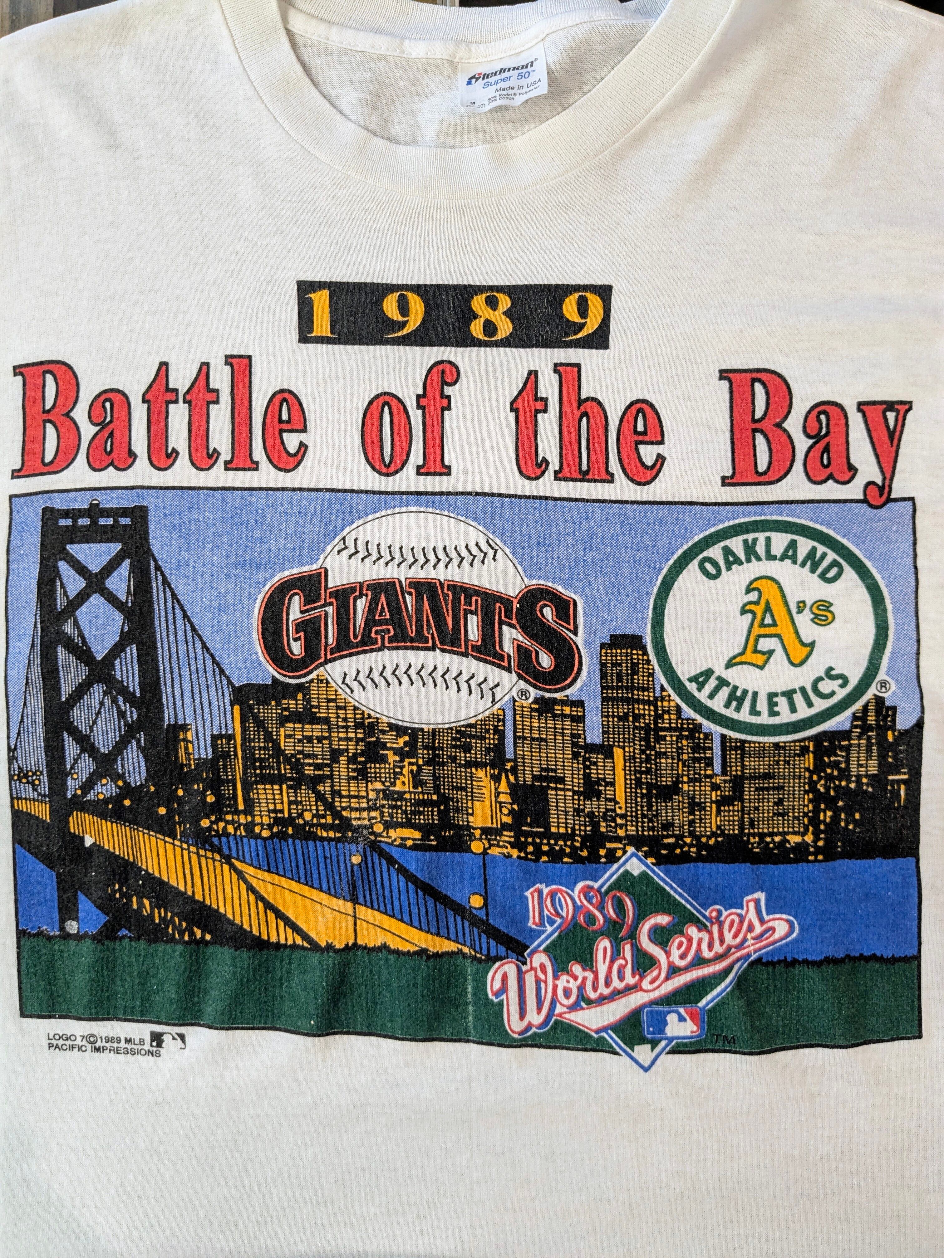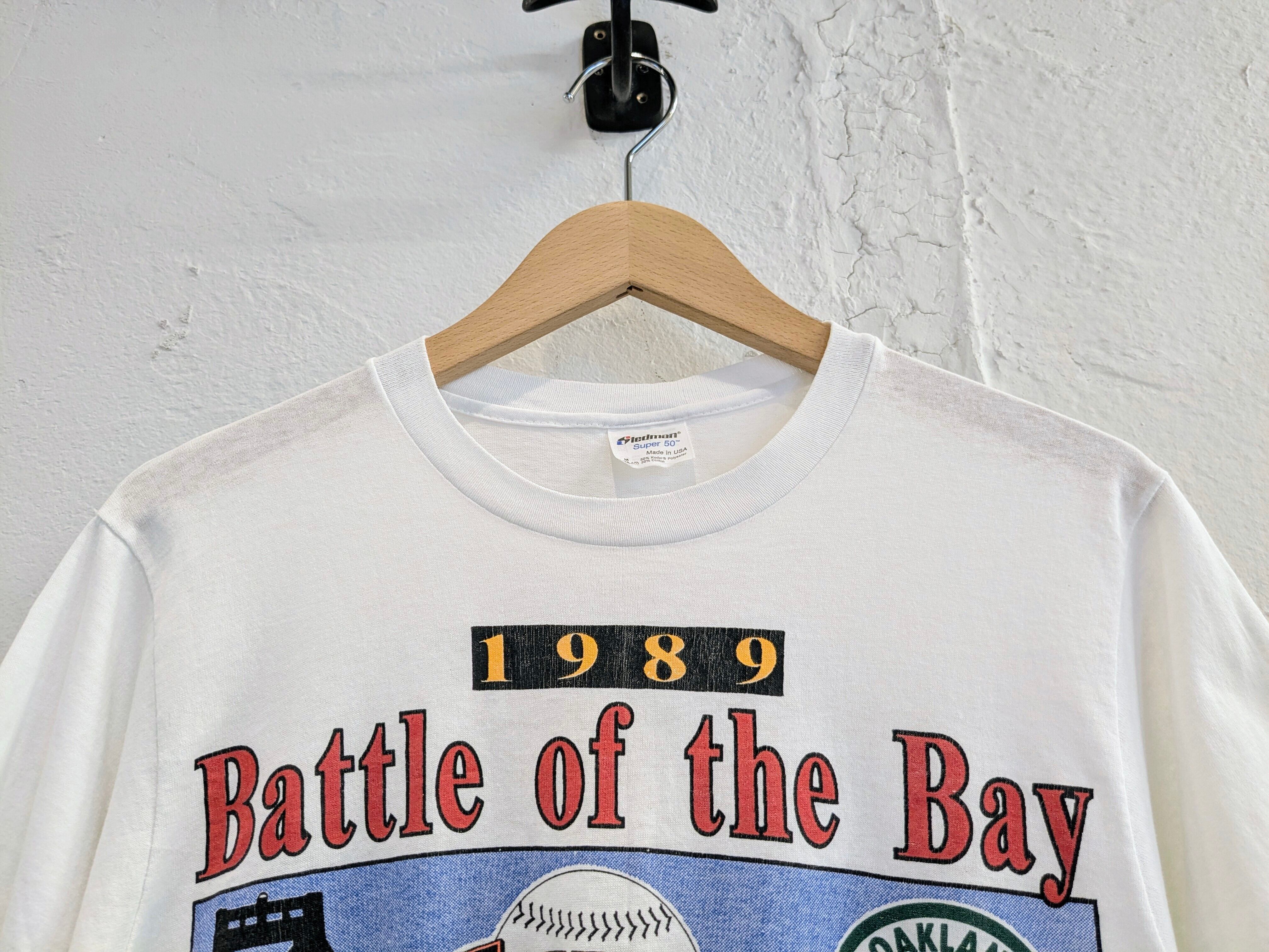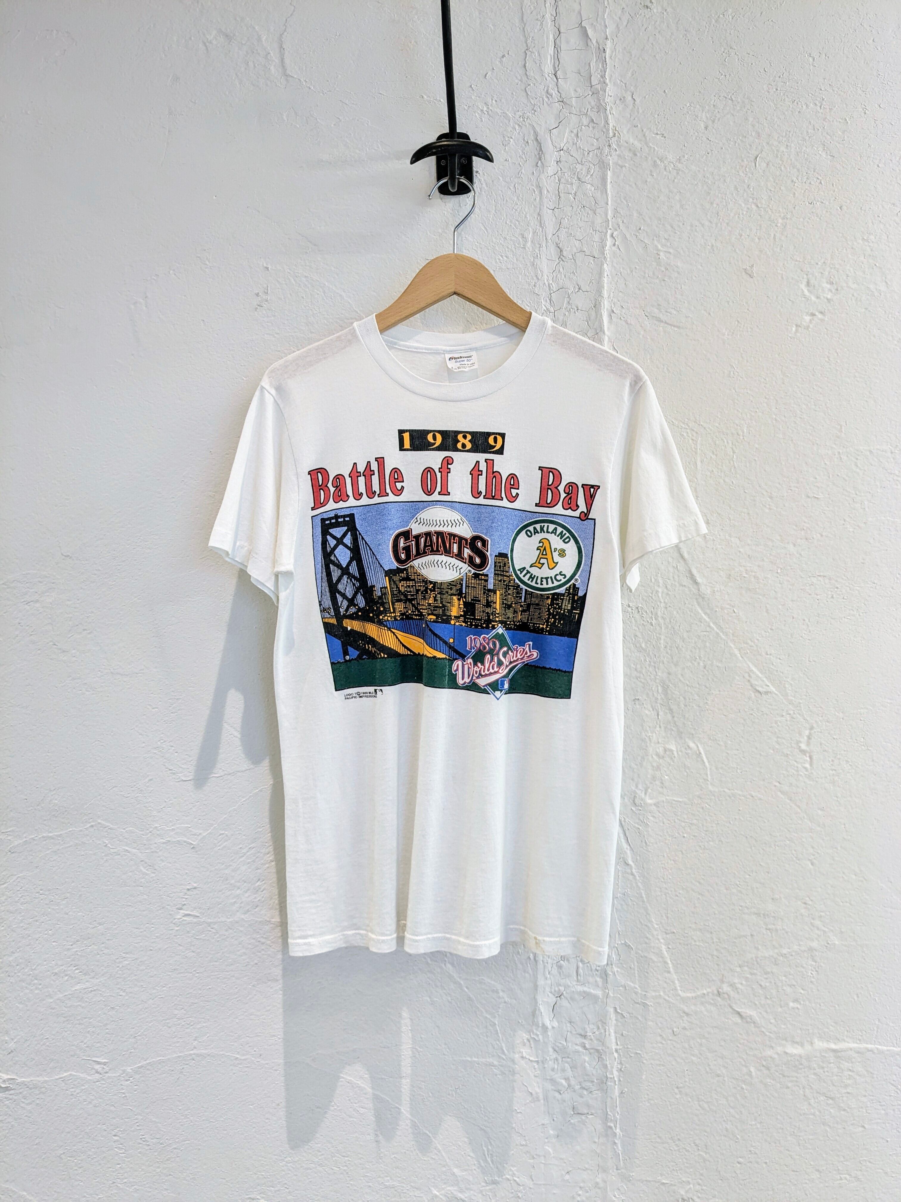 1989年のワールドシリーズ、ジャイアンツとアスレチックスのTシャツ。生地は薄く、透け感があります。汚れあり。