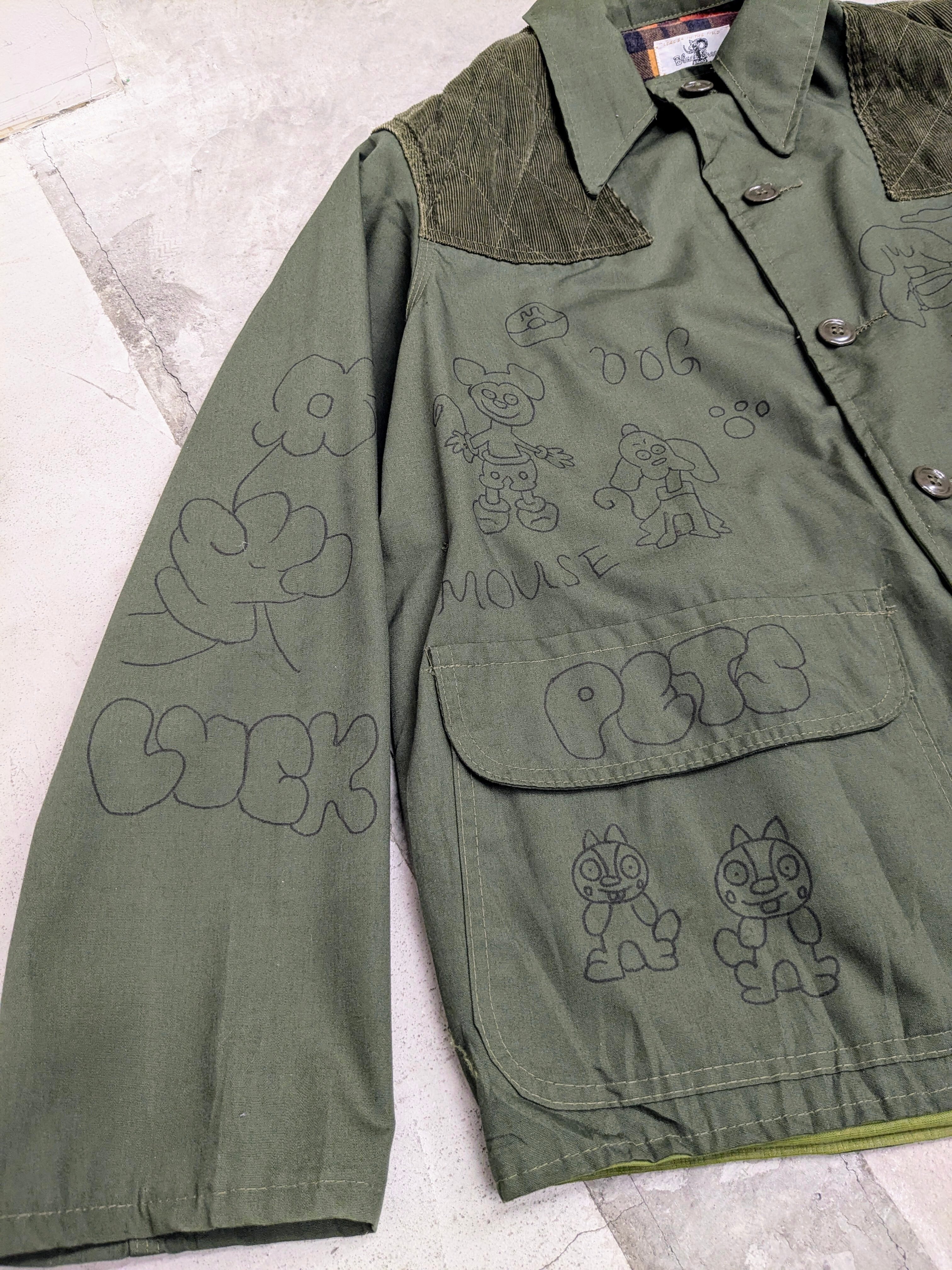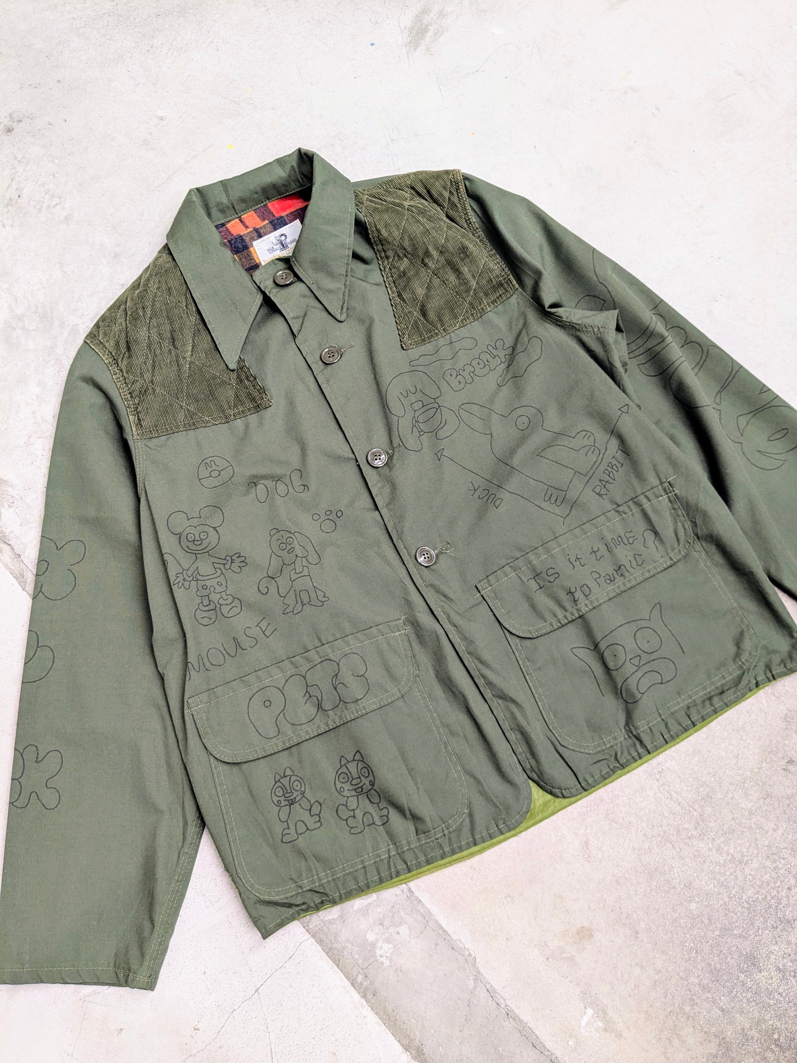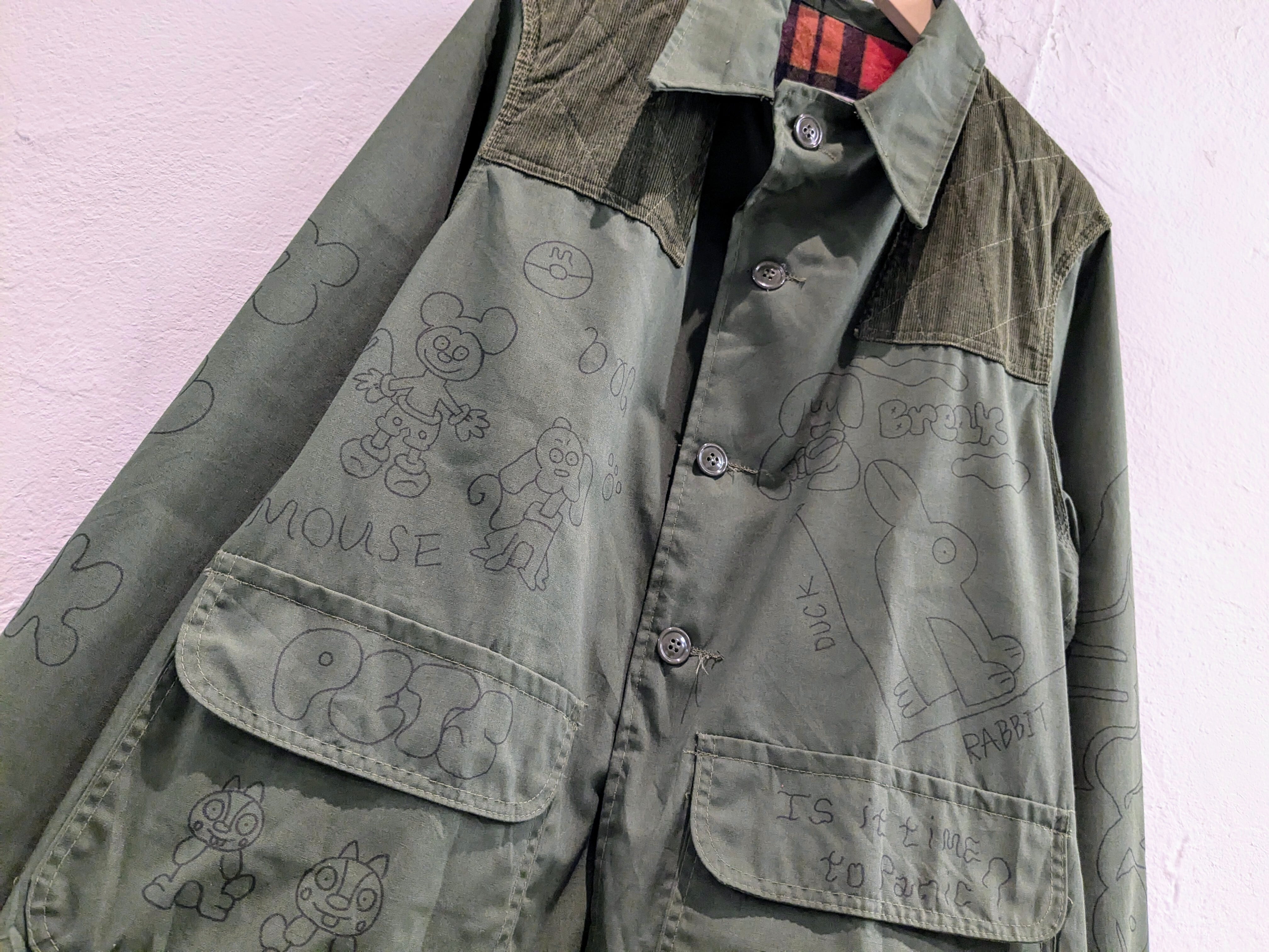 1960-1970年代頃のハンティングジャケットにイラストを加えてもらっています。どこか見たことあるようなキャラクターがいたりと、とても可愛いデザインとなっております。同じものは2つと存在しない唯一無二の1点物となります。