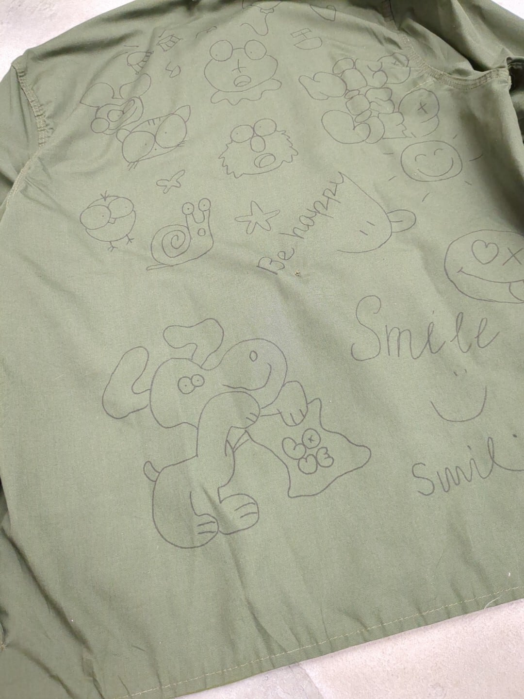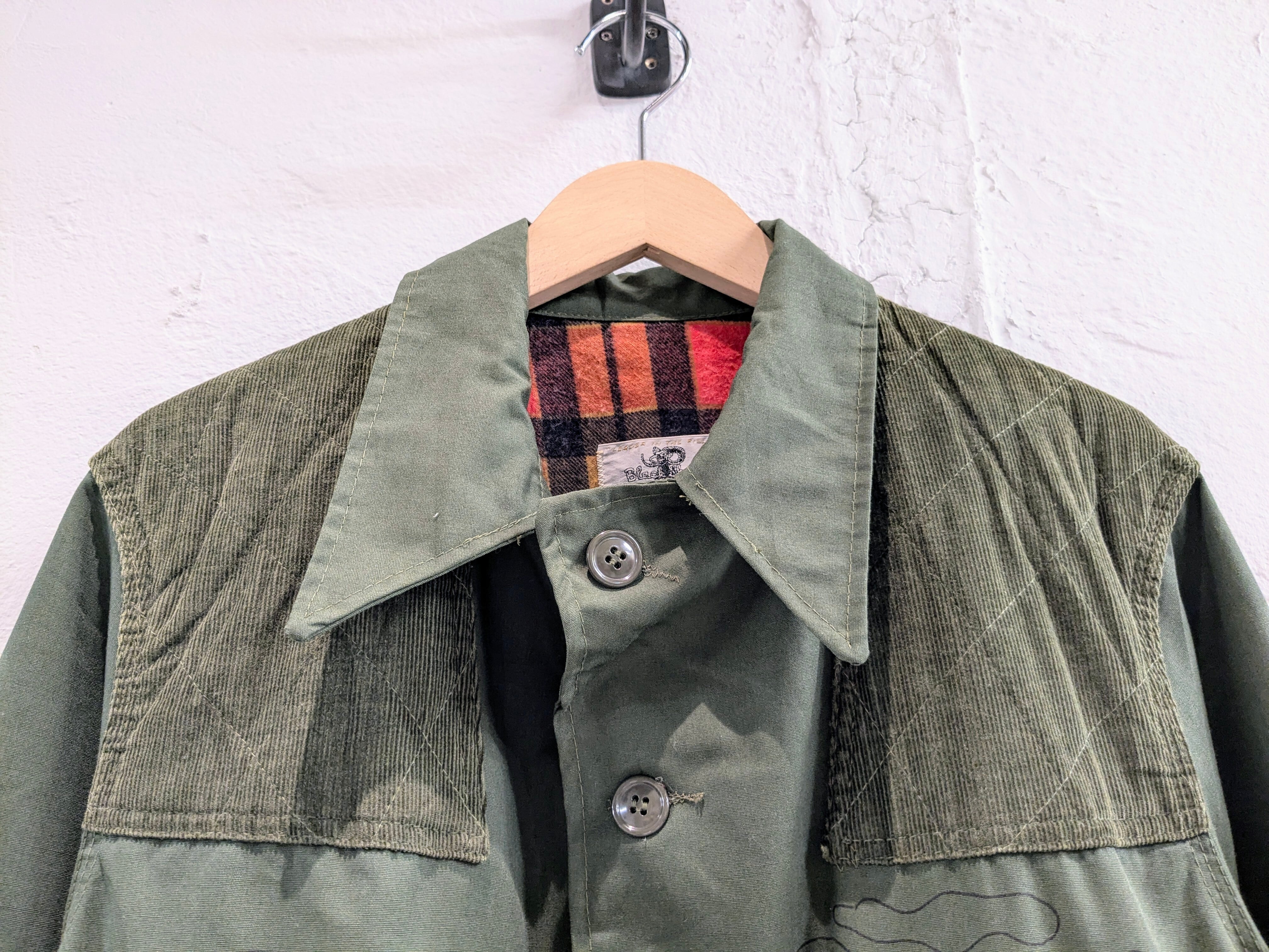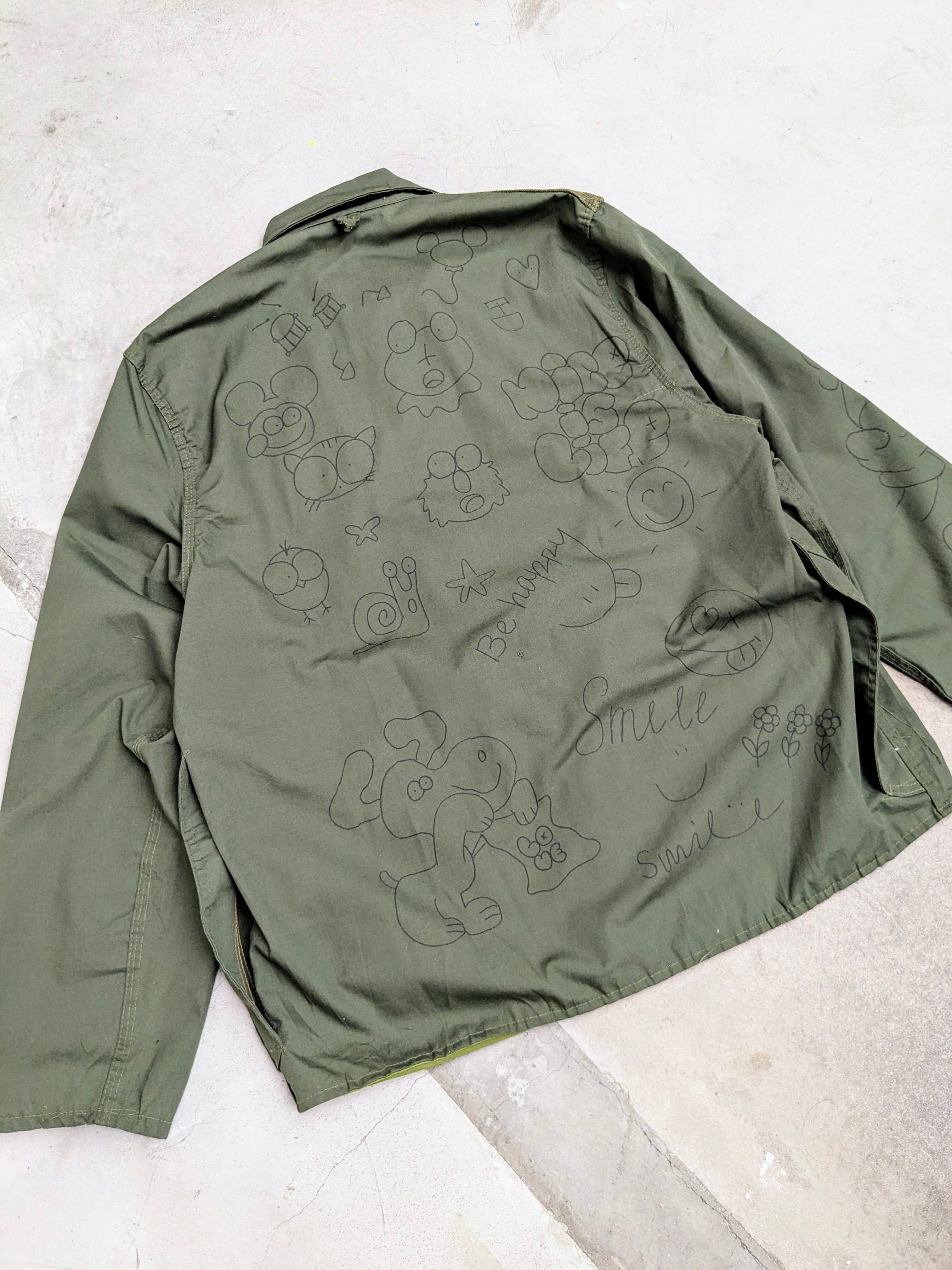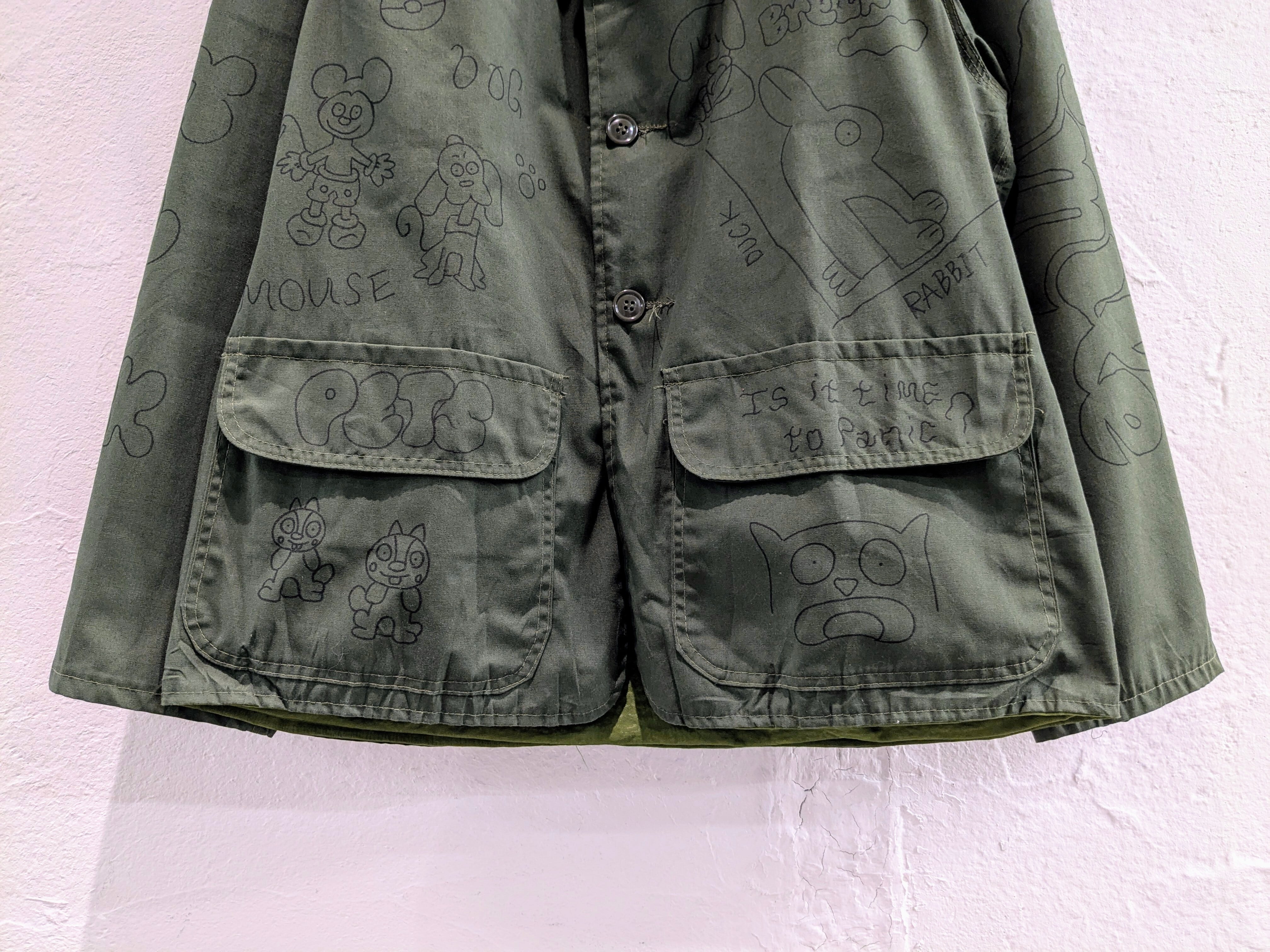 1960-1970年代頃のハンティングジャケットにイラストを加えてもらっています。どこか見たことあるようなキャラクターがいたりと、とても可愛いデザインとなっております。同じものは2つと存在しない唯一無二の1点物となります。