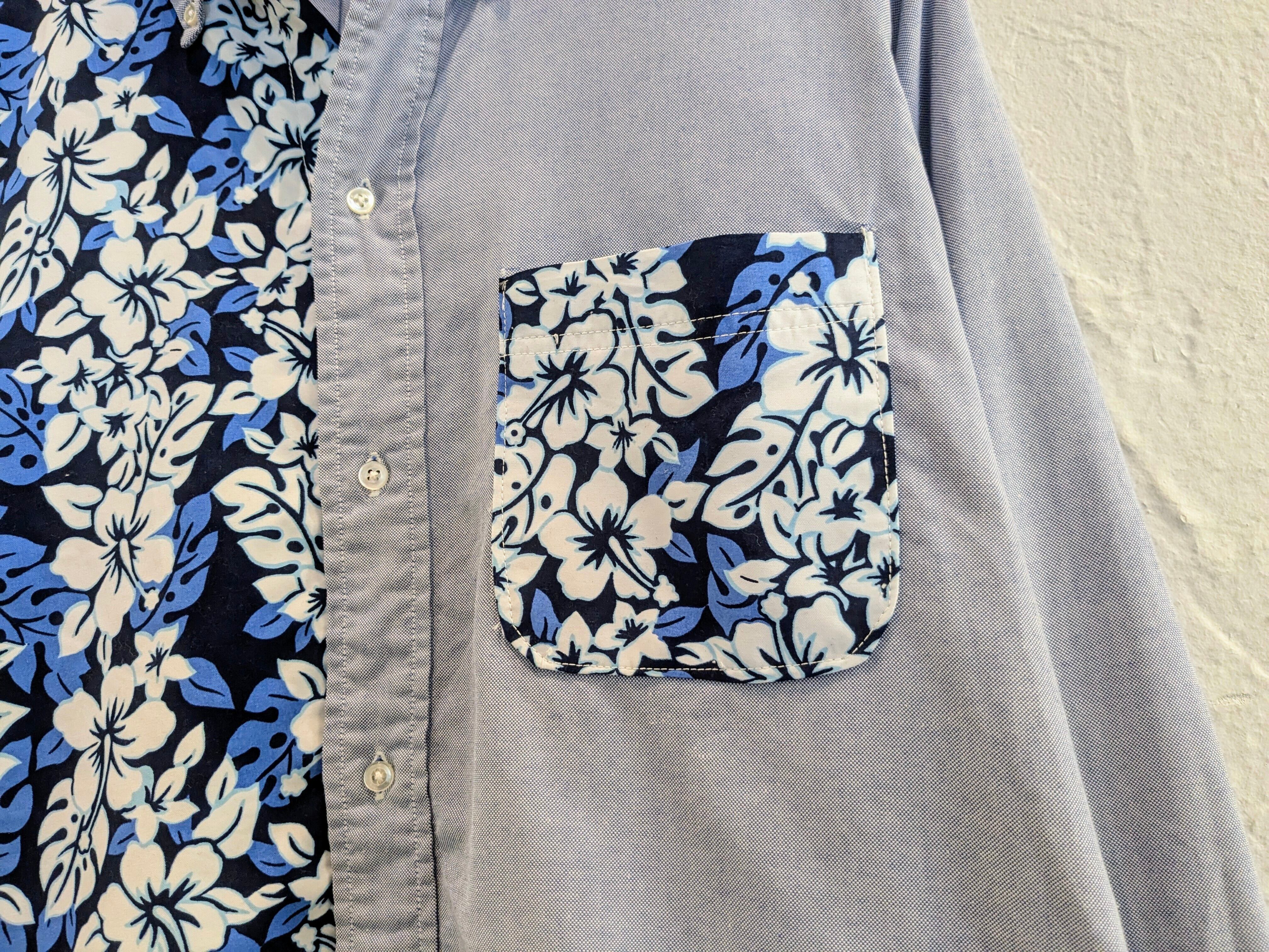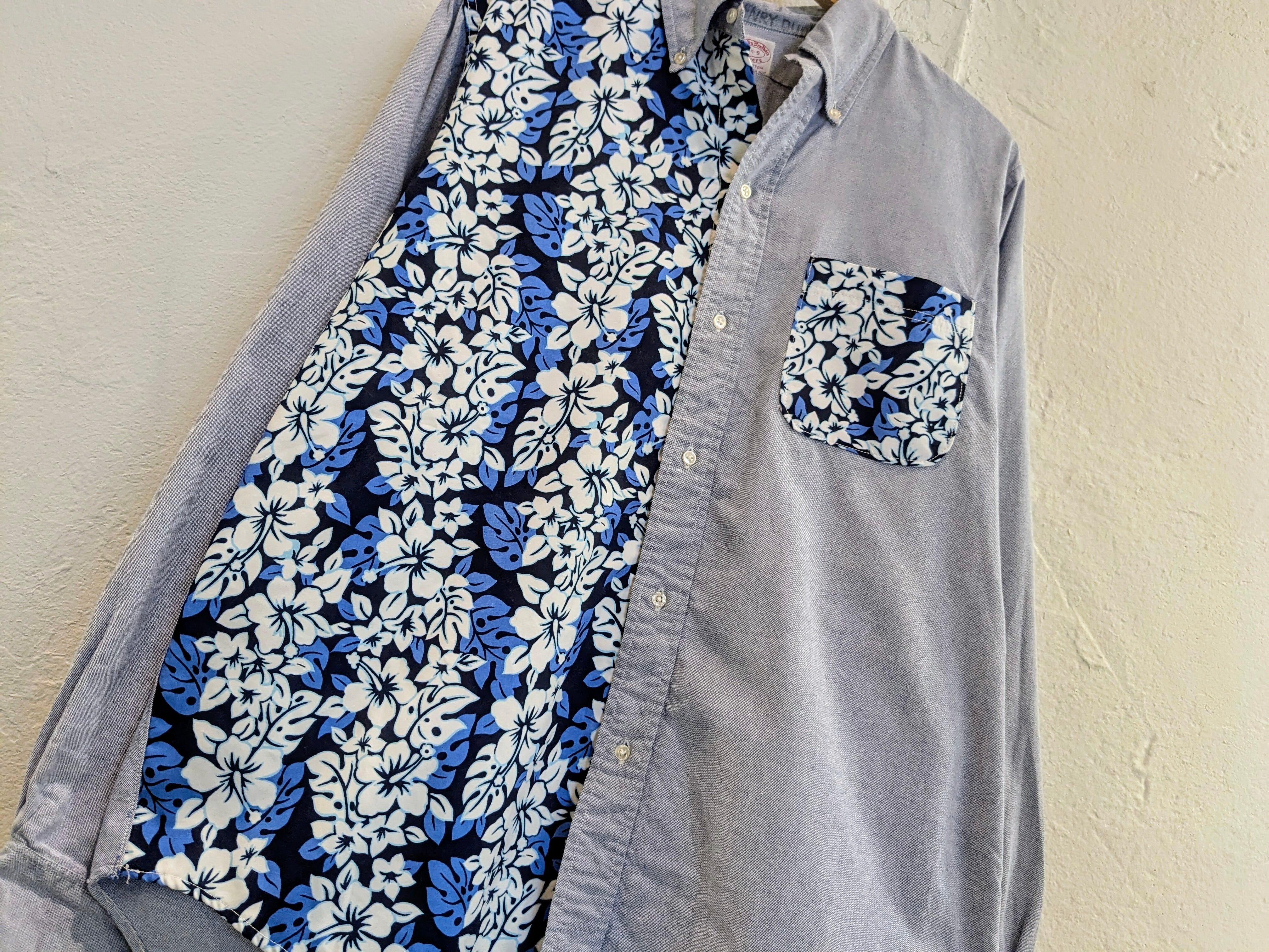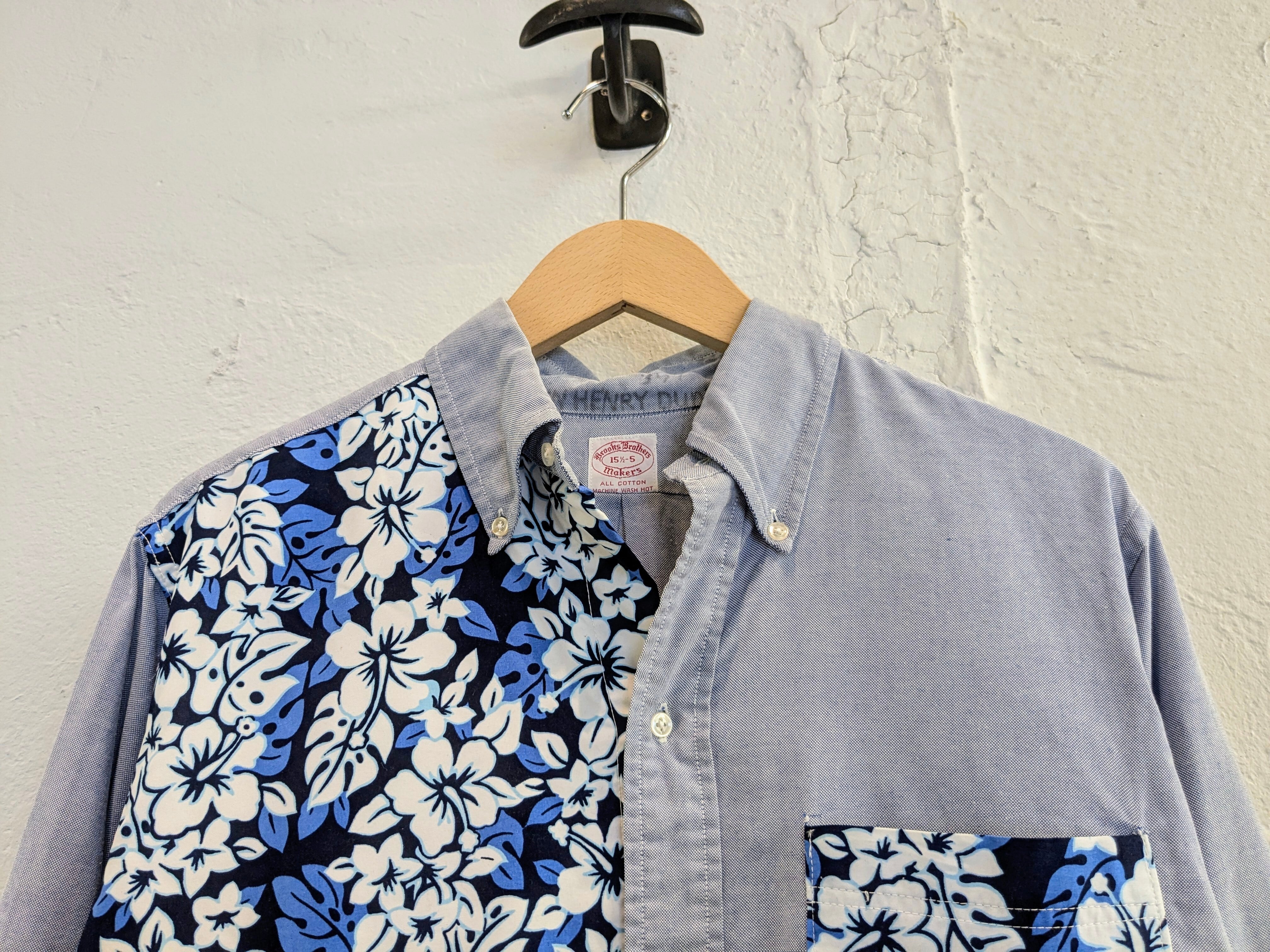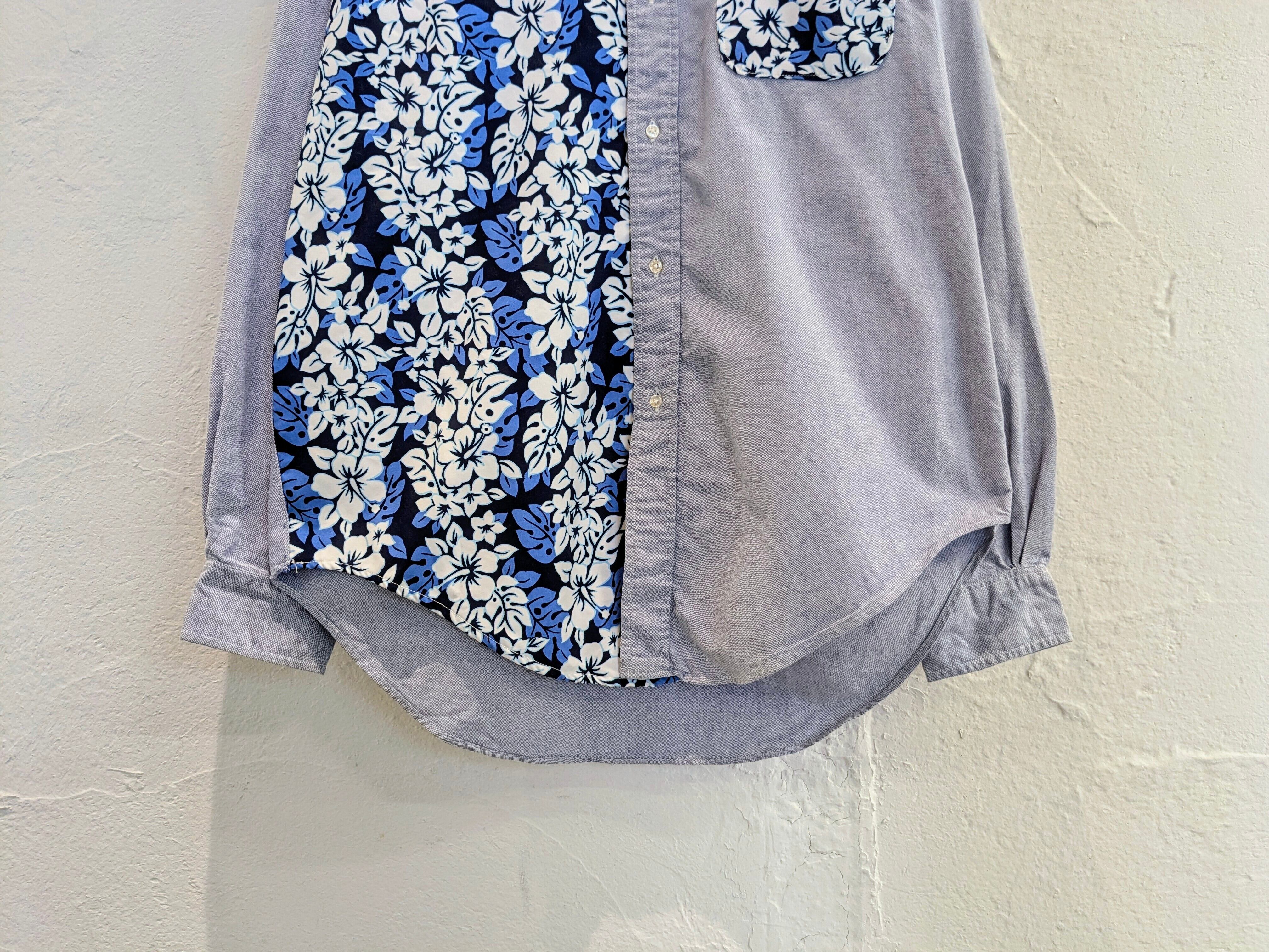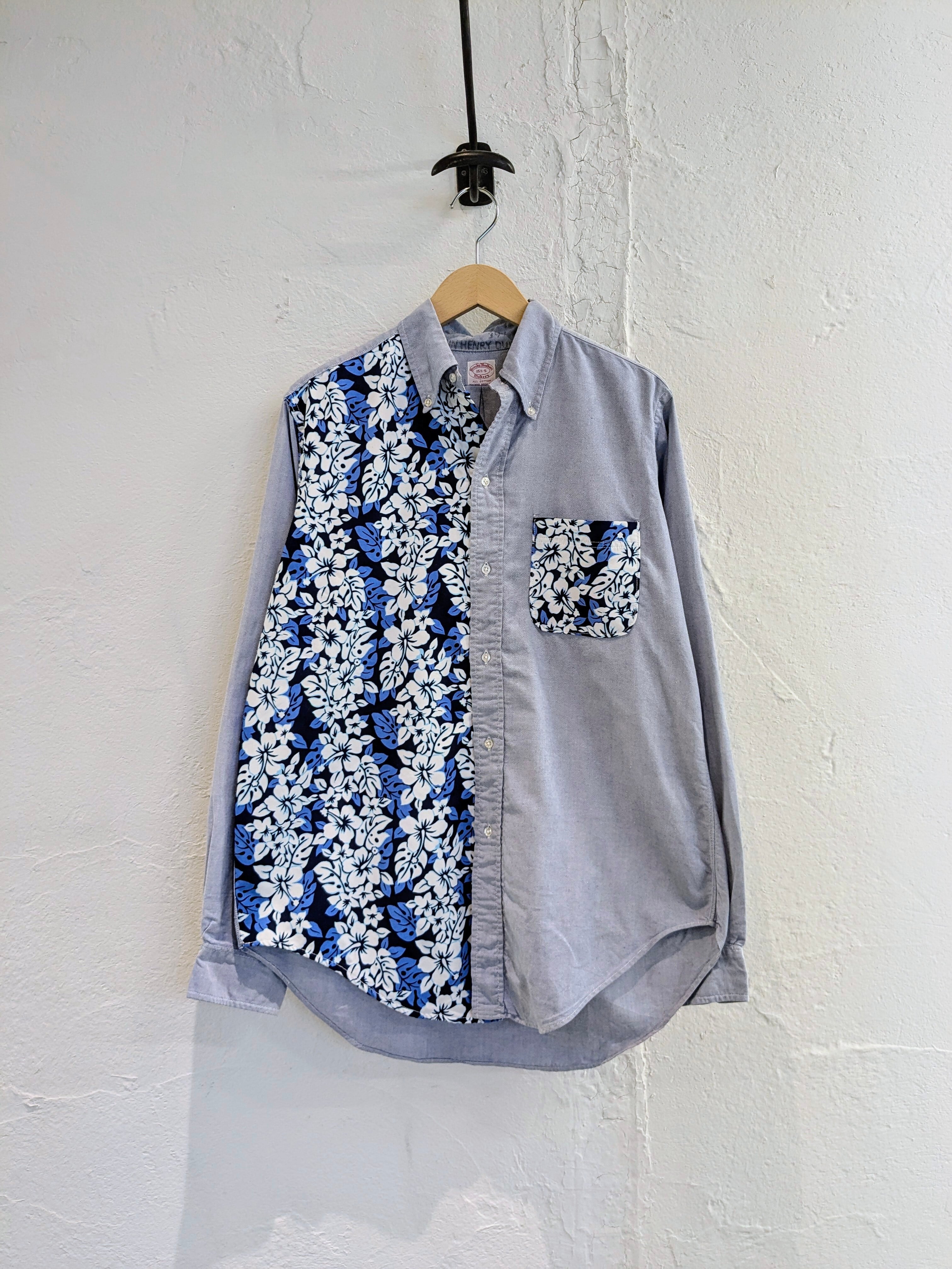 花柄の生地をドッキングしたデザインシャツ。元々このデザインのモノを買付してきました。オックスのボディに関しては、ブルックスブラザーズのメーカーズのモノを使用しています。唯一無二の1点物となっております。キズあり。