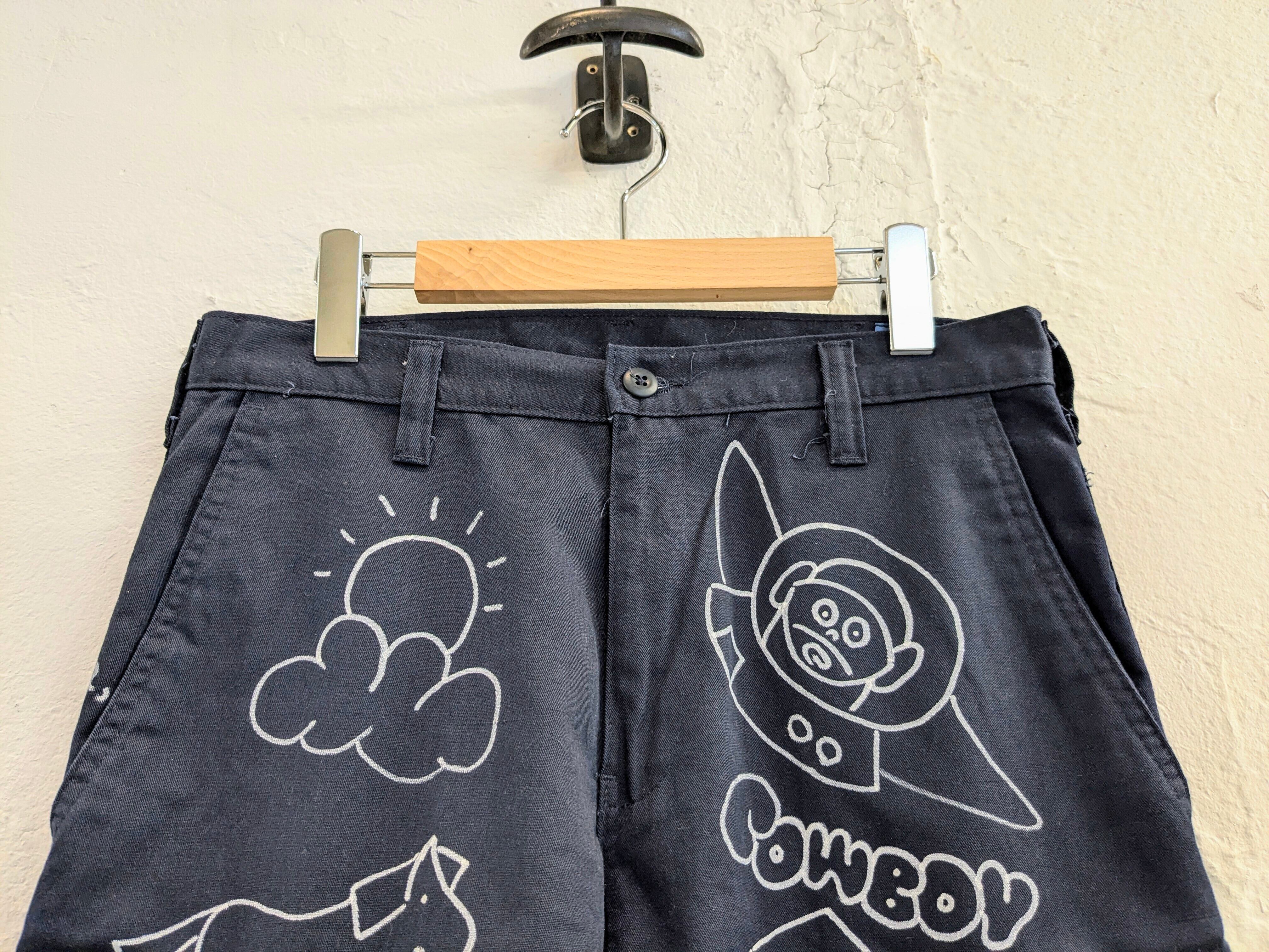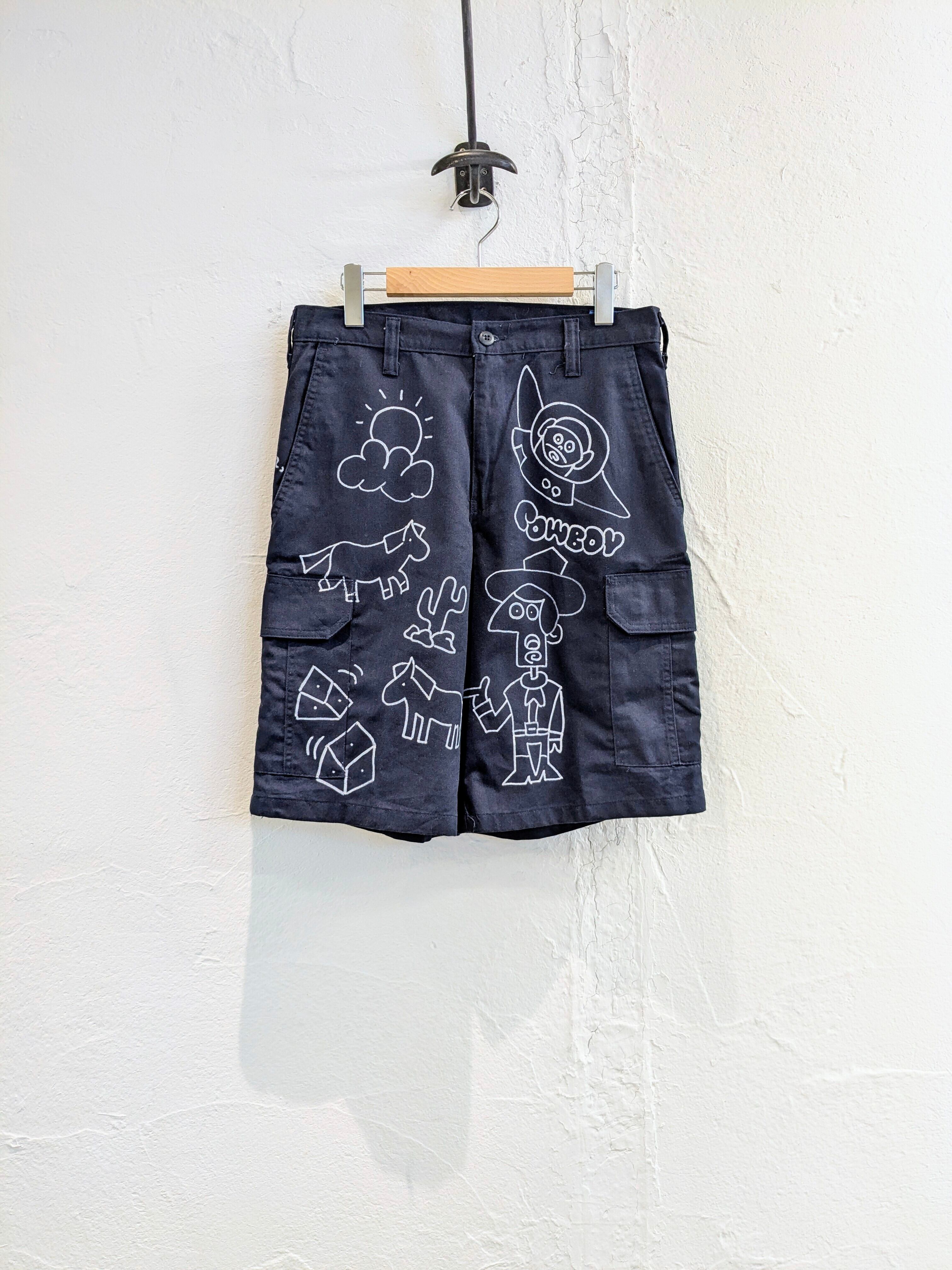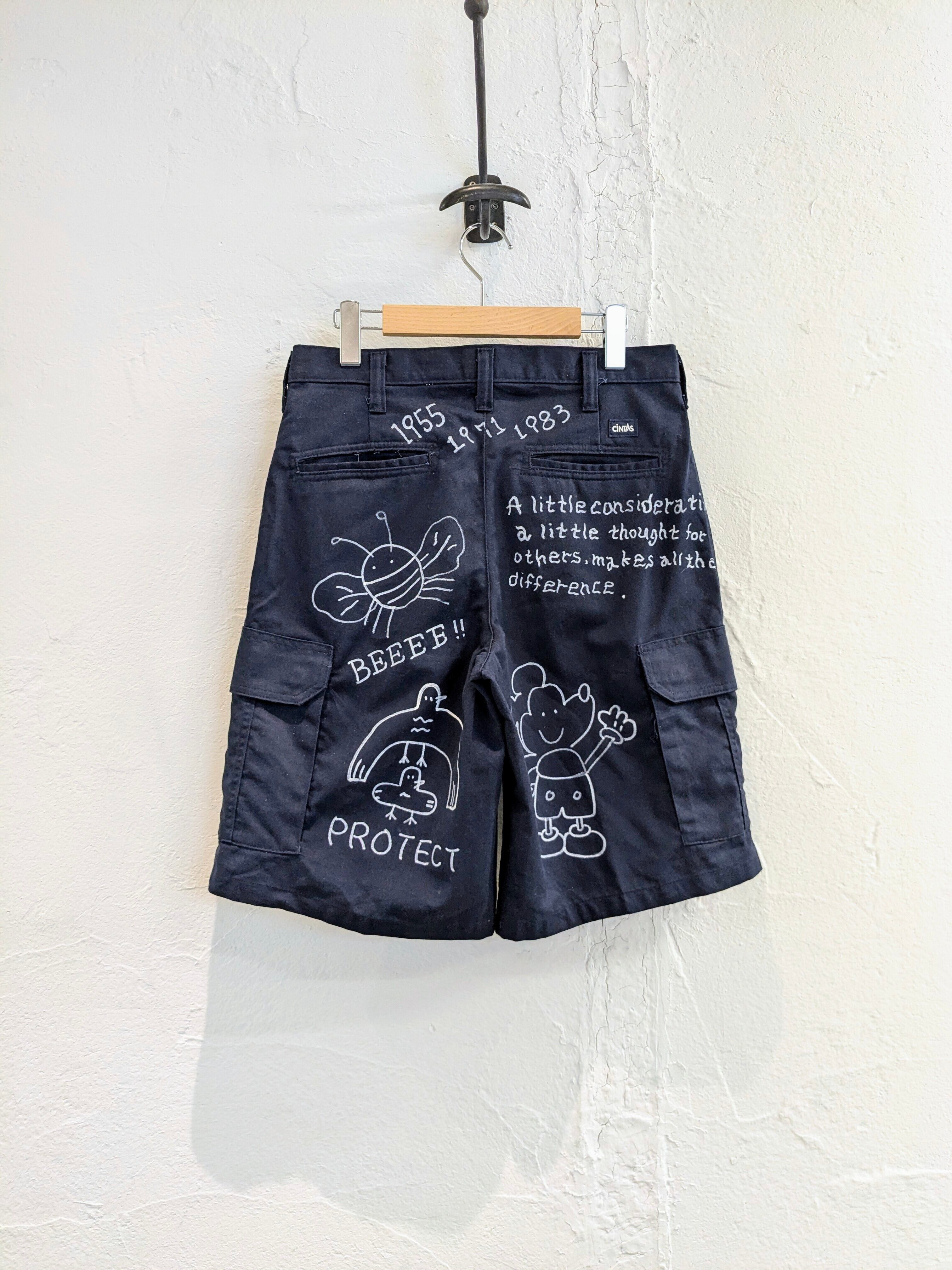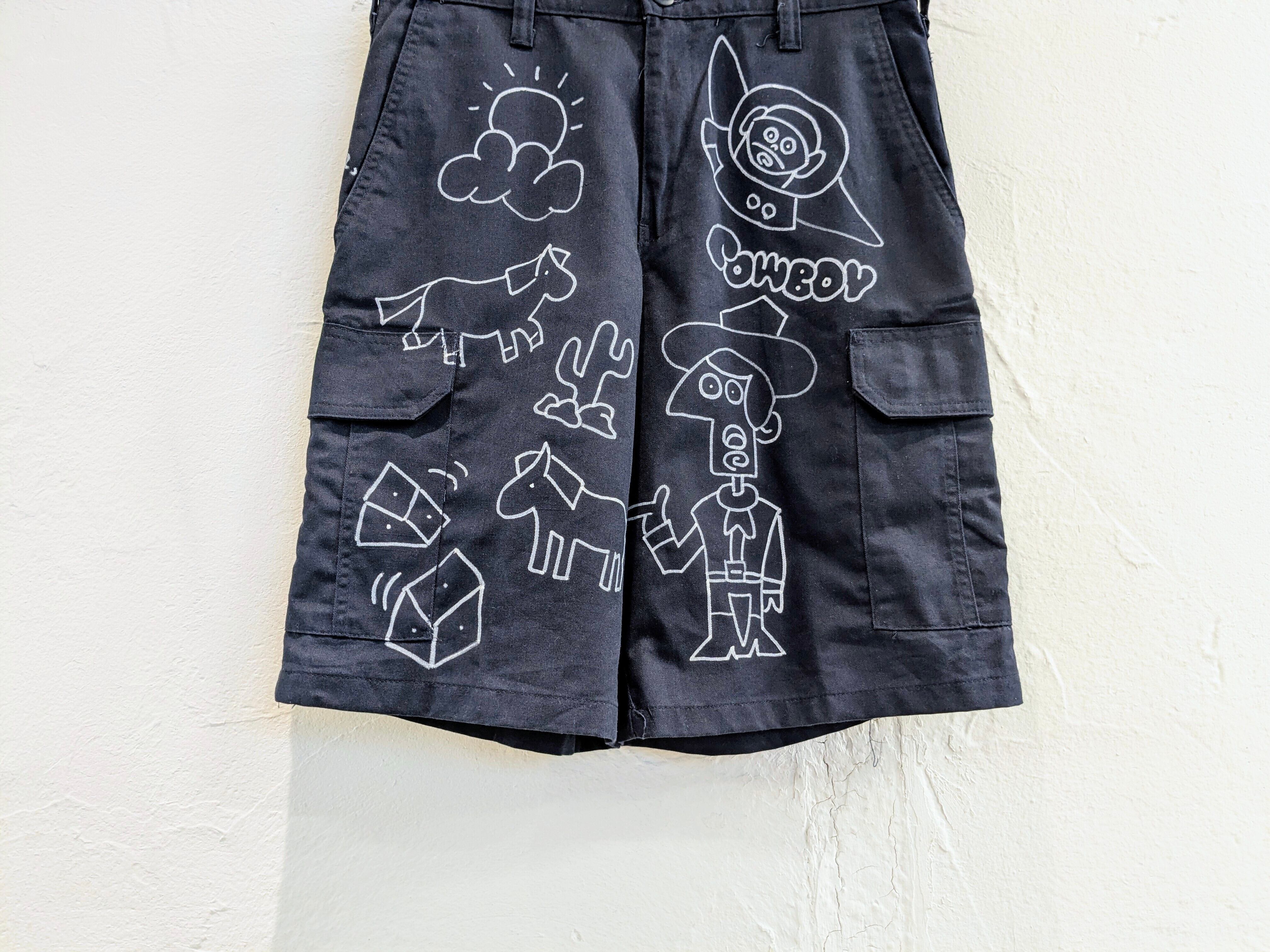 カーゴショートパンツにイラストを加えてもらっています。どこかで見たことあるようなキャラクターがいたりと、可愛いアイテムになっています。メモリアル的な要素を足したアイテム。同じものは2つと存在しない唯一無二のアイテム。