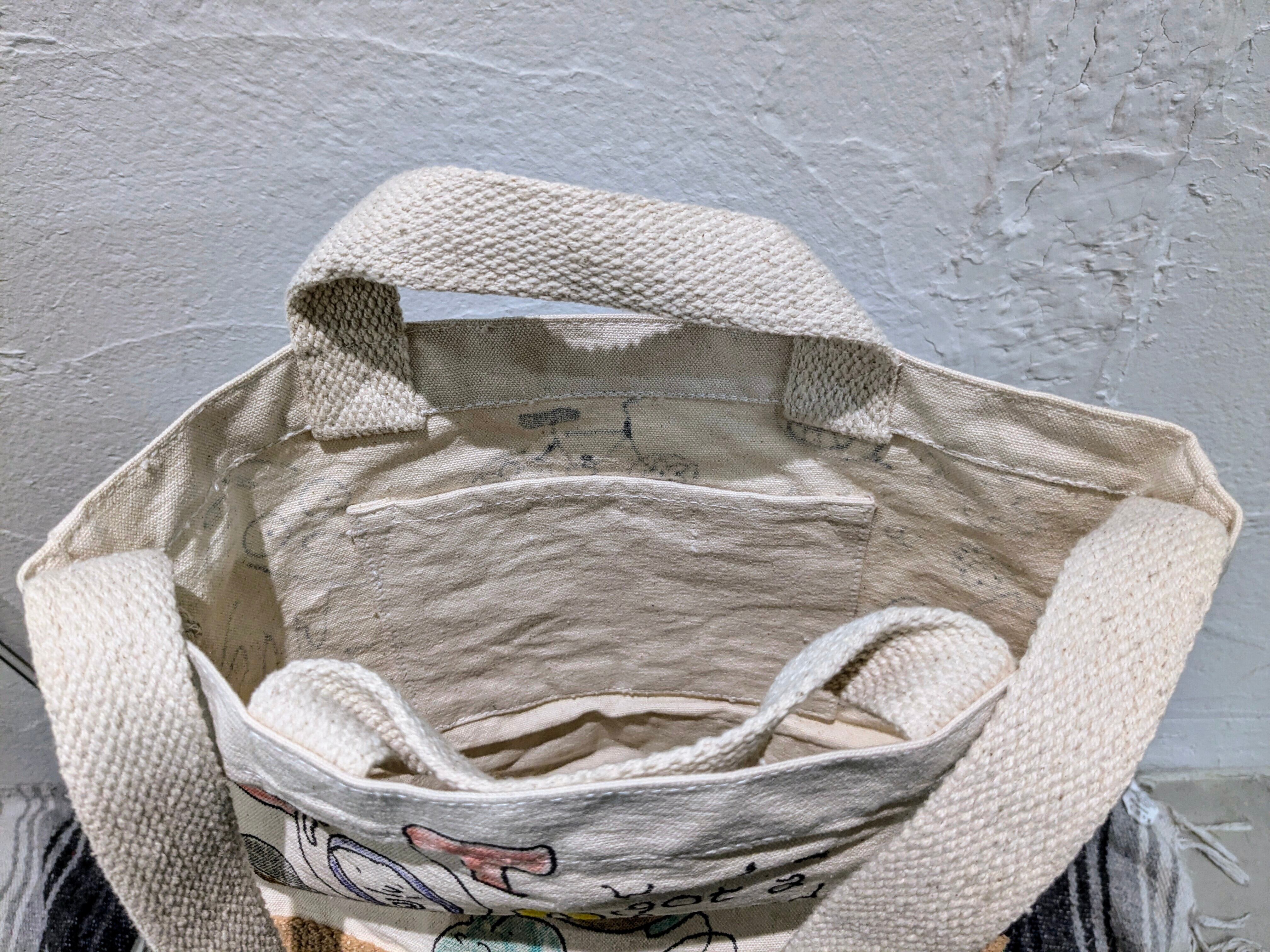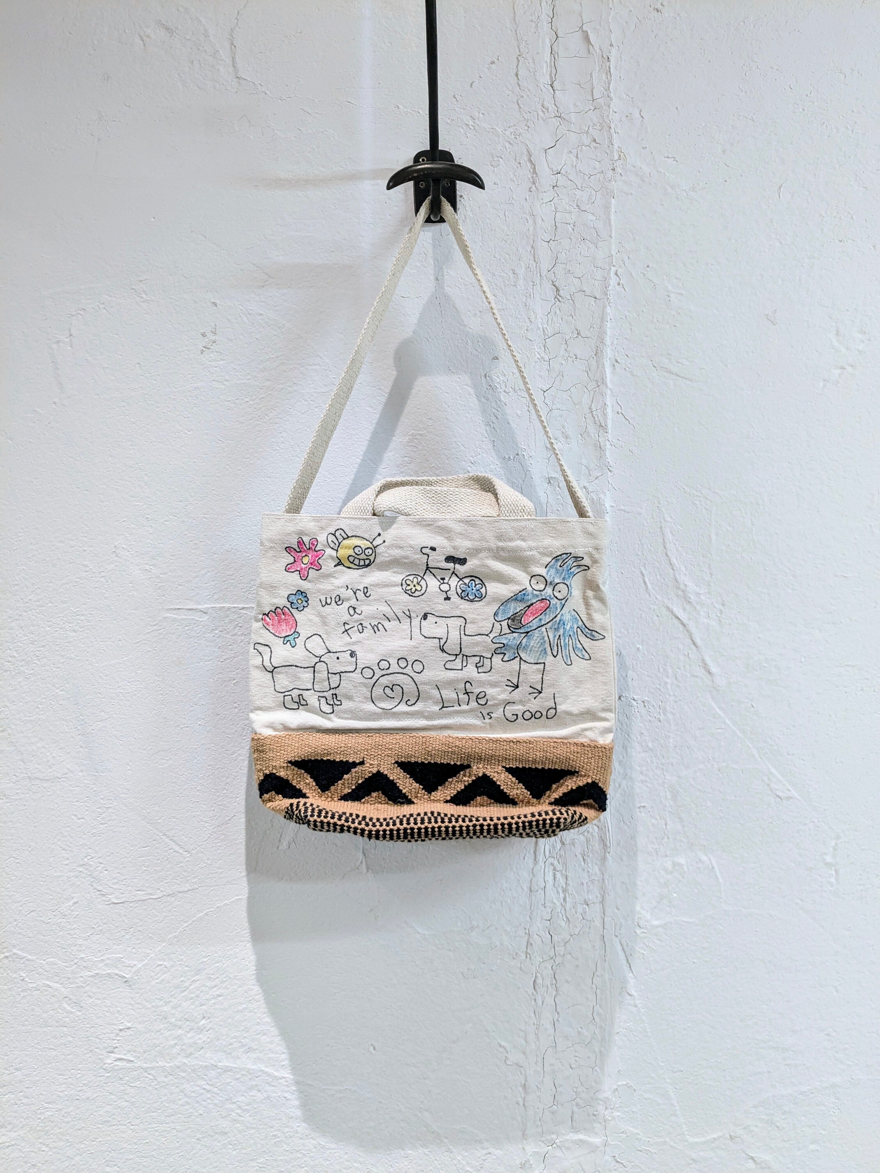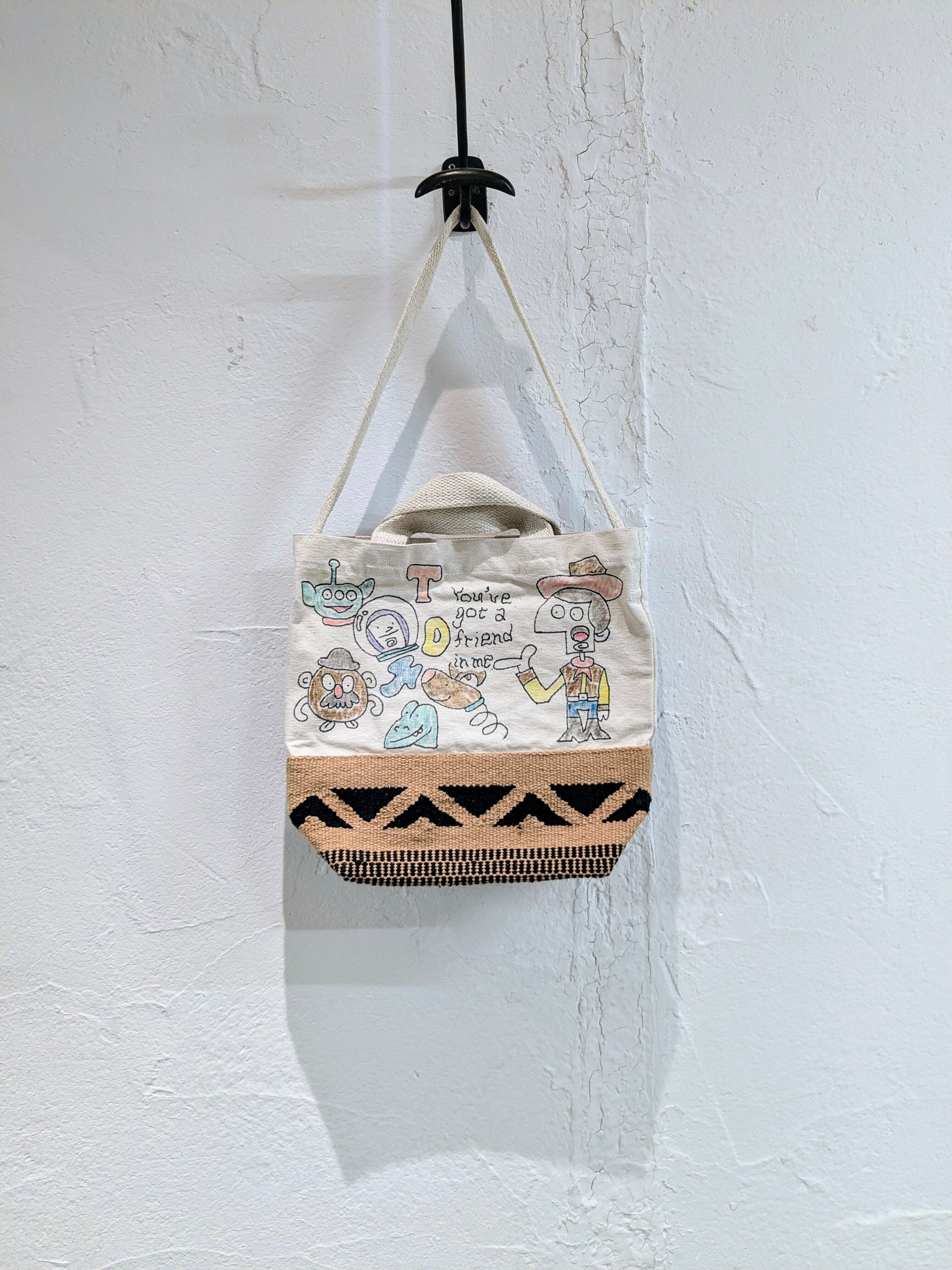 キャンバス生地の2wayバッグに手描きで、イラストを加えています。どこかで見たことあるようなキャラクターなどとても可愛いデザインのアイテム。同じモノは2つと存在しない、唯一無二の1点物となっております。手持ちとショルダーの2wayでお使いいただけます。自然素材のものか、生地のものか分かりませんが独特の匂いがあります。