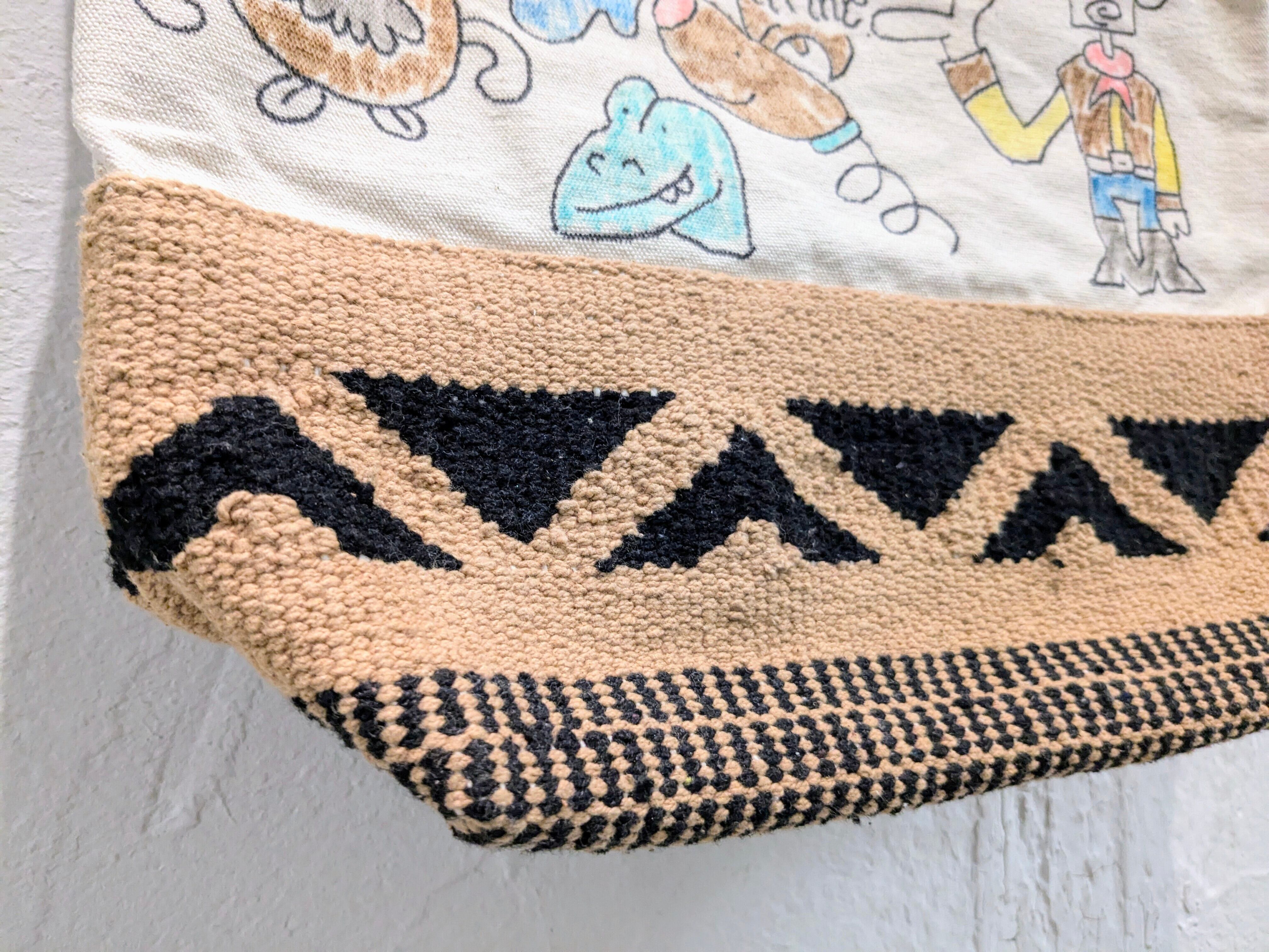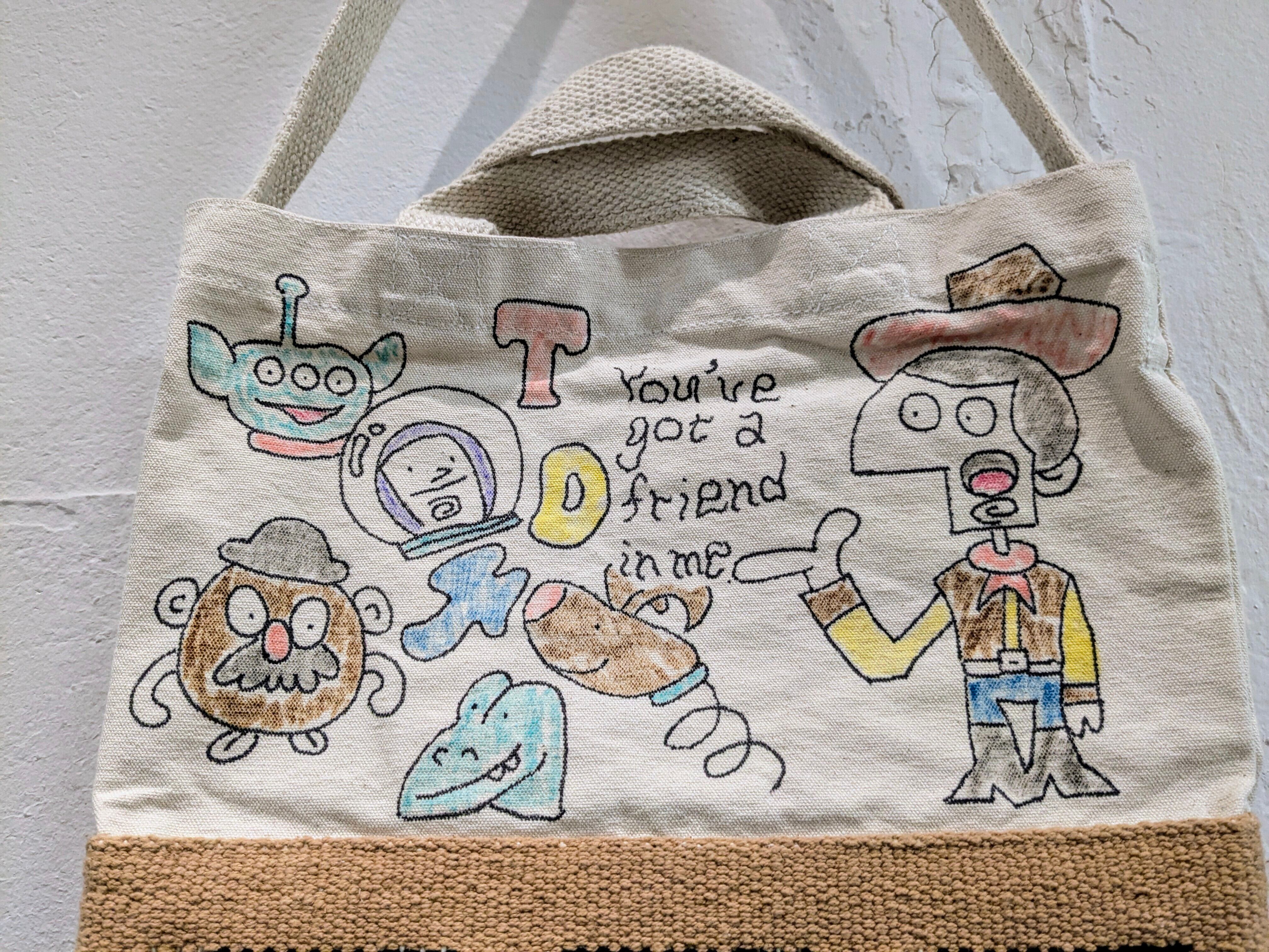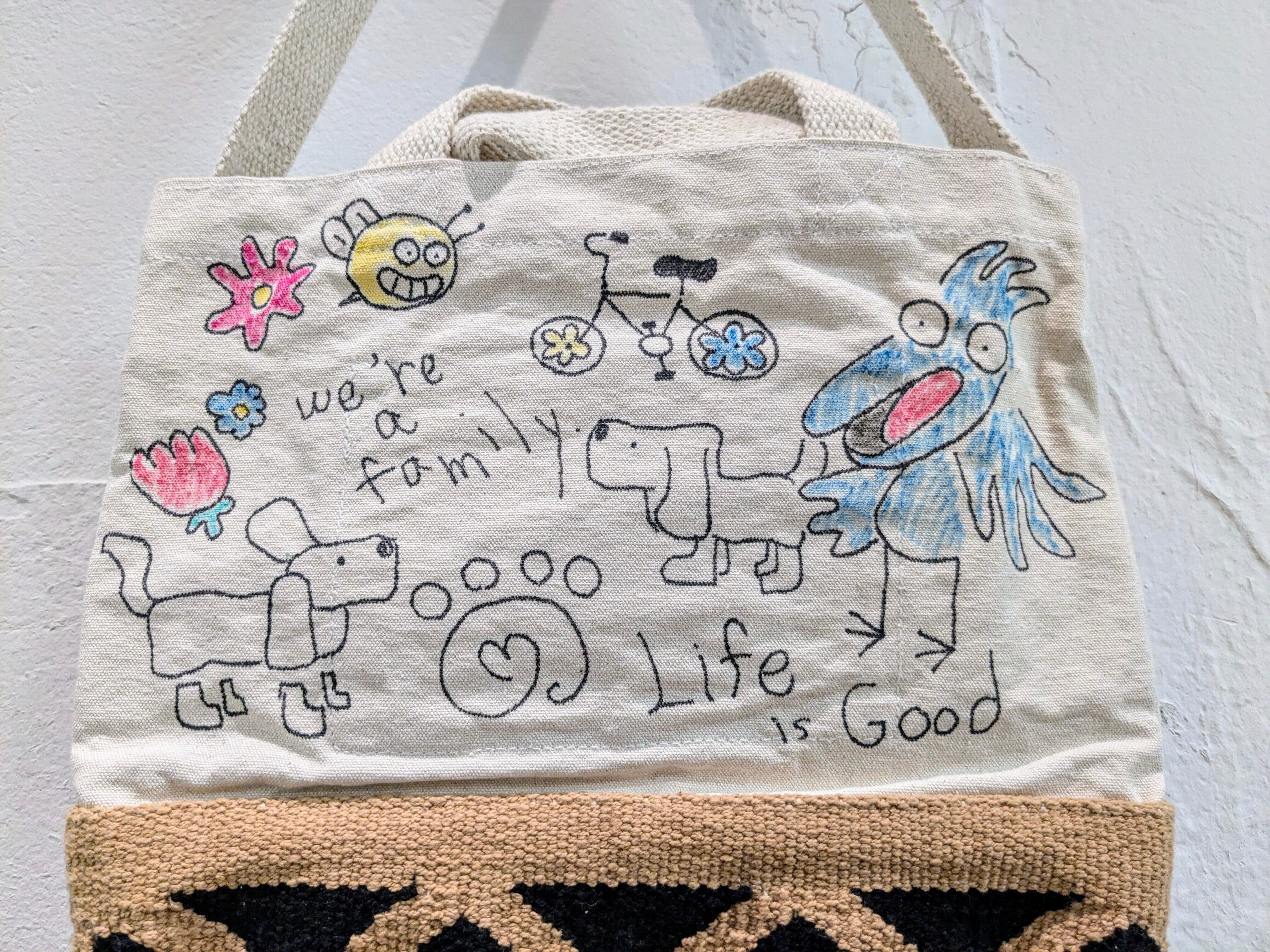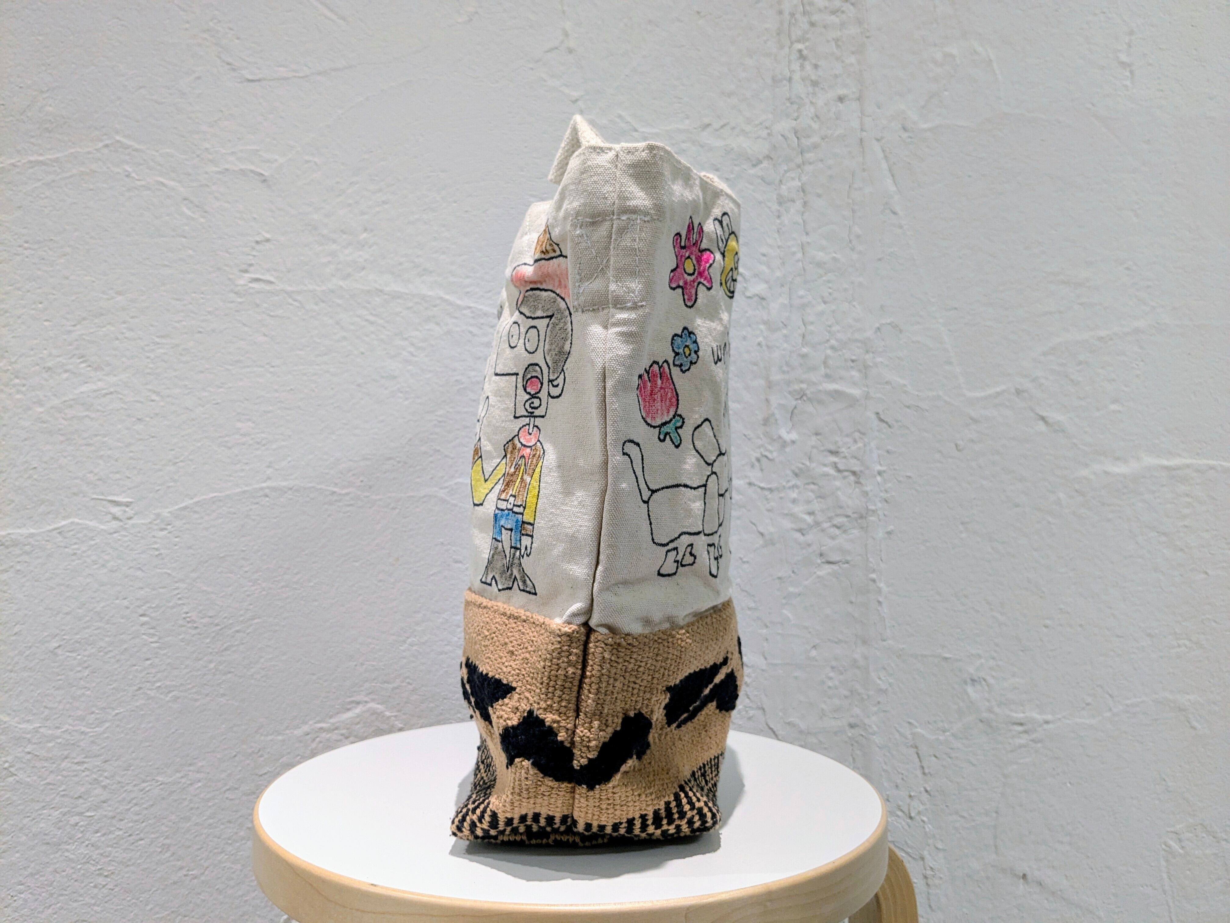 キャンバス生地の2wayバッグに手描きで、イラストを加えています。どこかで見たことあるようなキャラクターなどとても可愛いデザインのアイテム。同じモノは2つと存在しない、唯一無二の1点物となっております。手持ちとショルダーの2wayでお使いいただけます。自然素材のものか、生地のものか分かりませんが独特の匂いがあります。