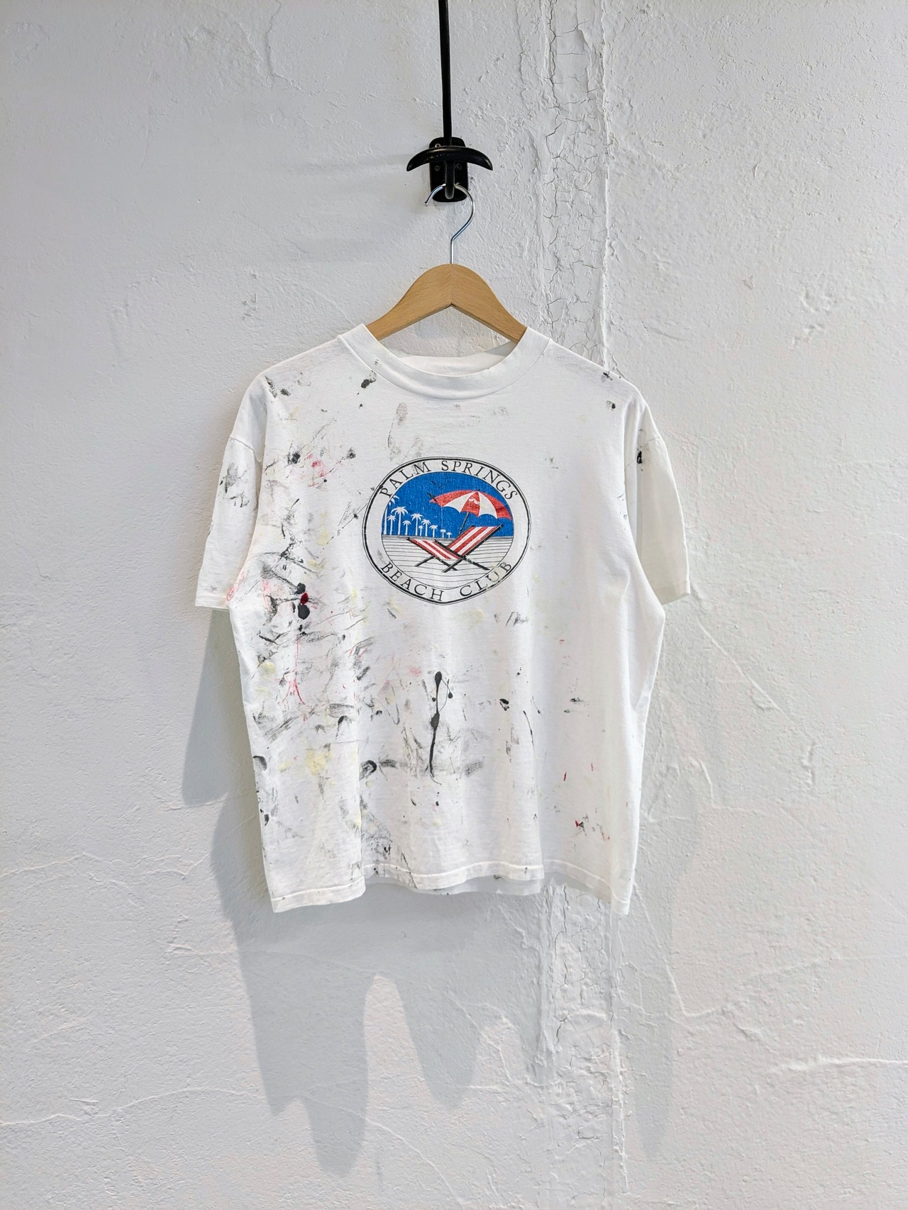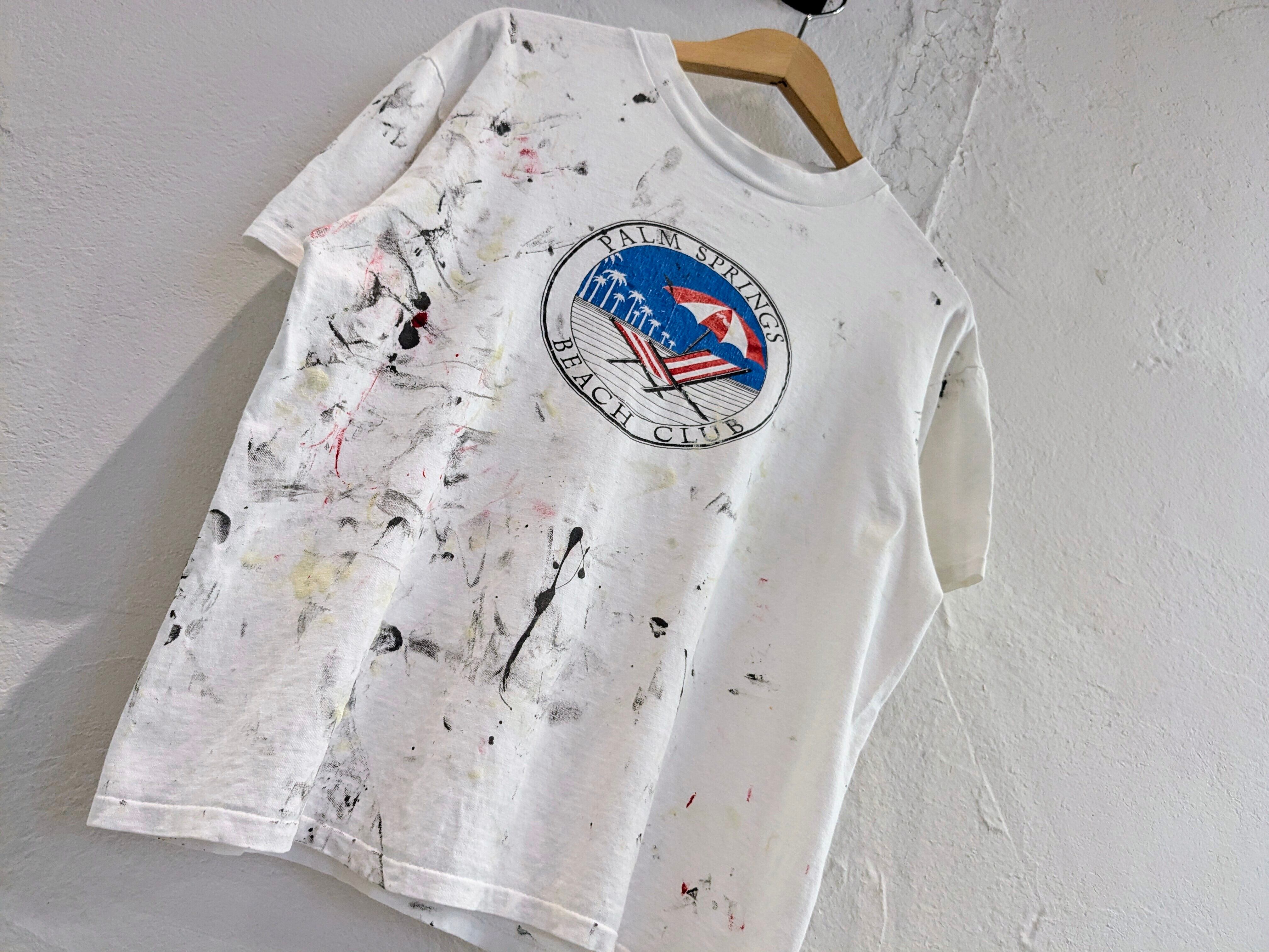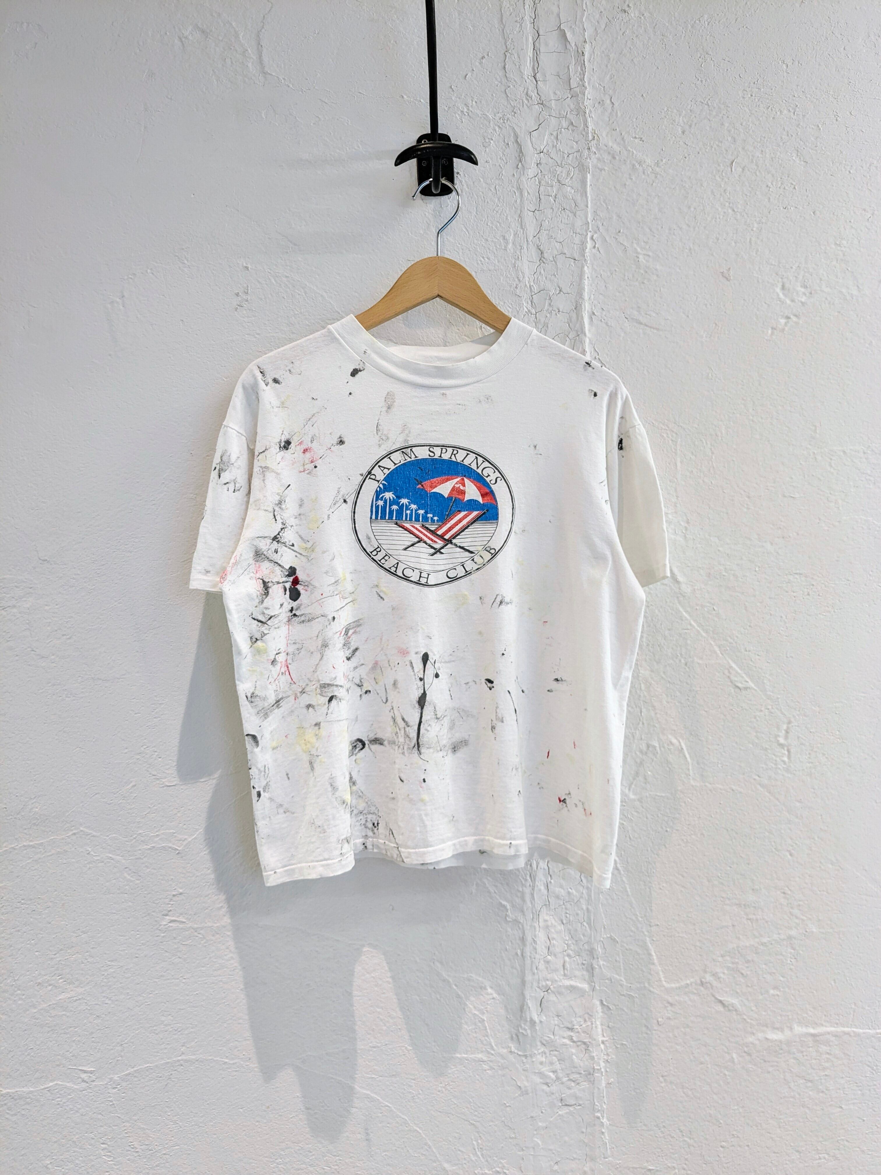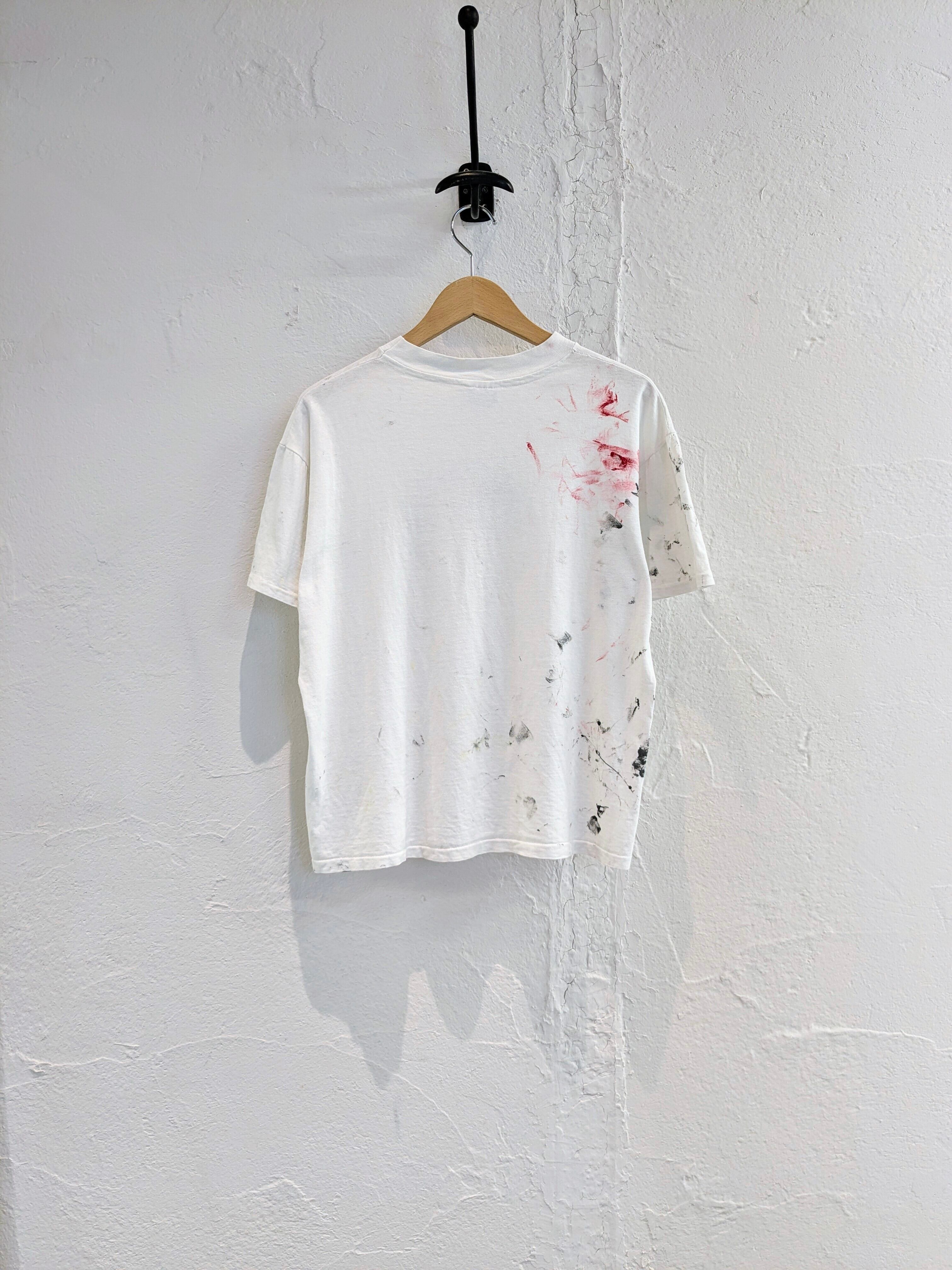 全体的にペンキの汚れがついています。雰囲気良く、他にはない味があります。Tシャツの形もワイド、ショートのボックスシルエットなのが嬉しいポイント。