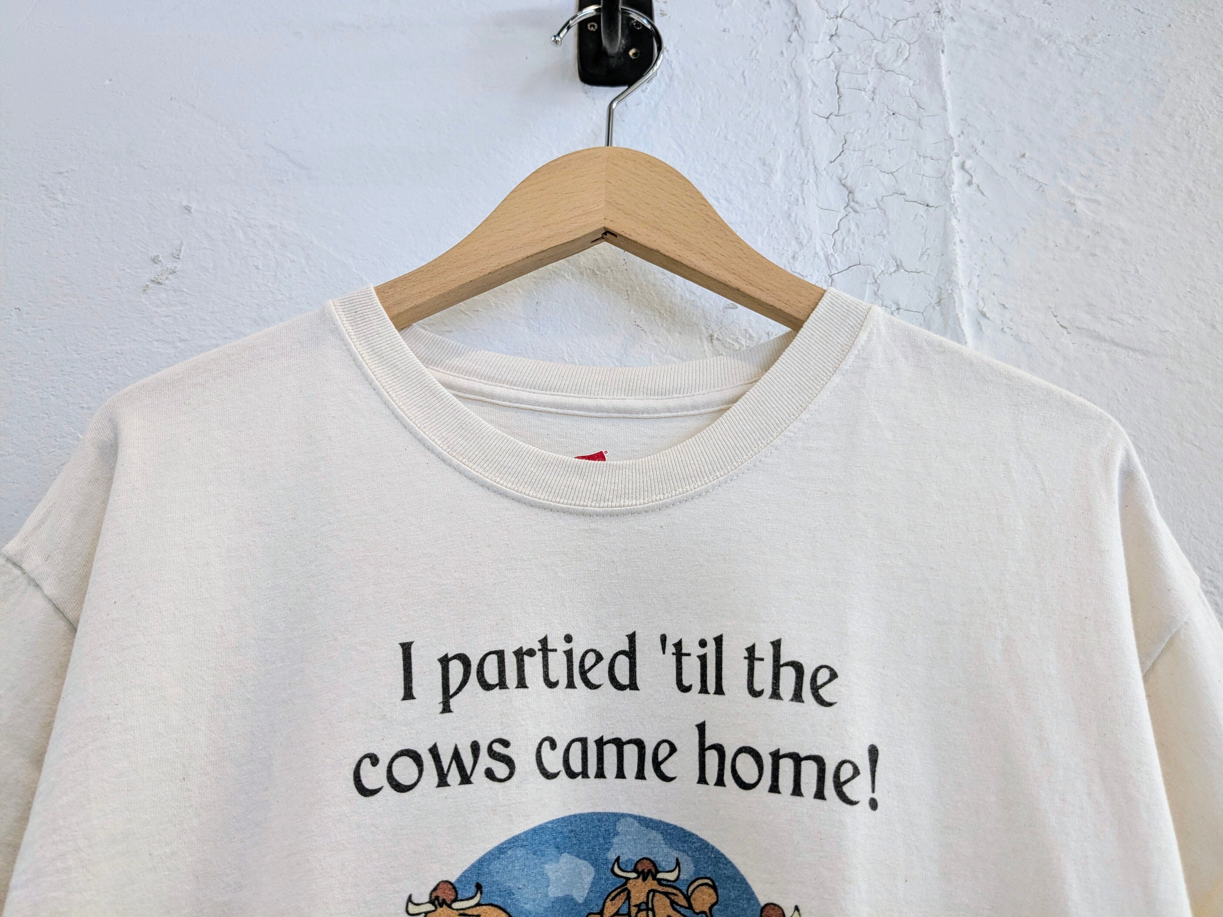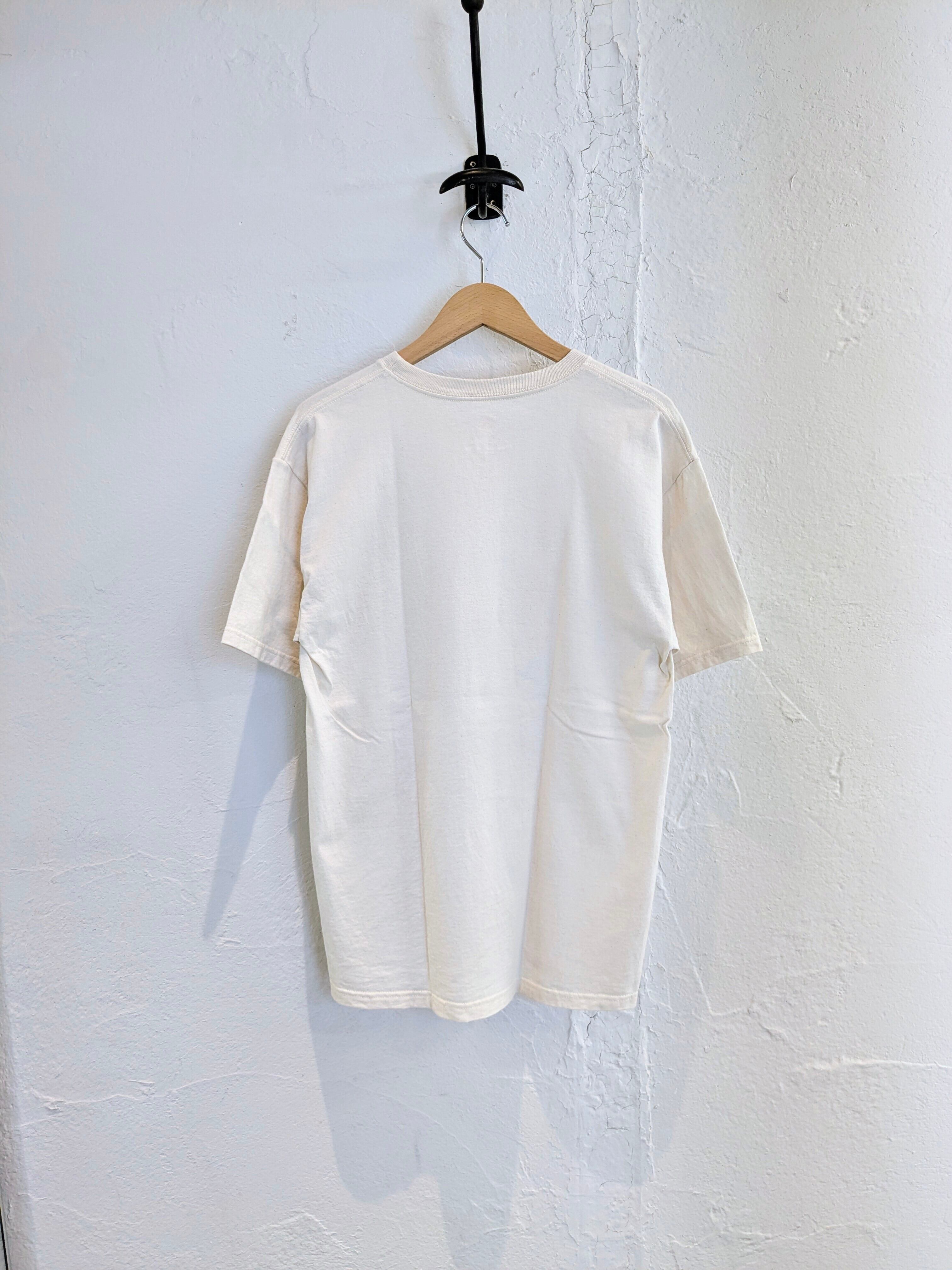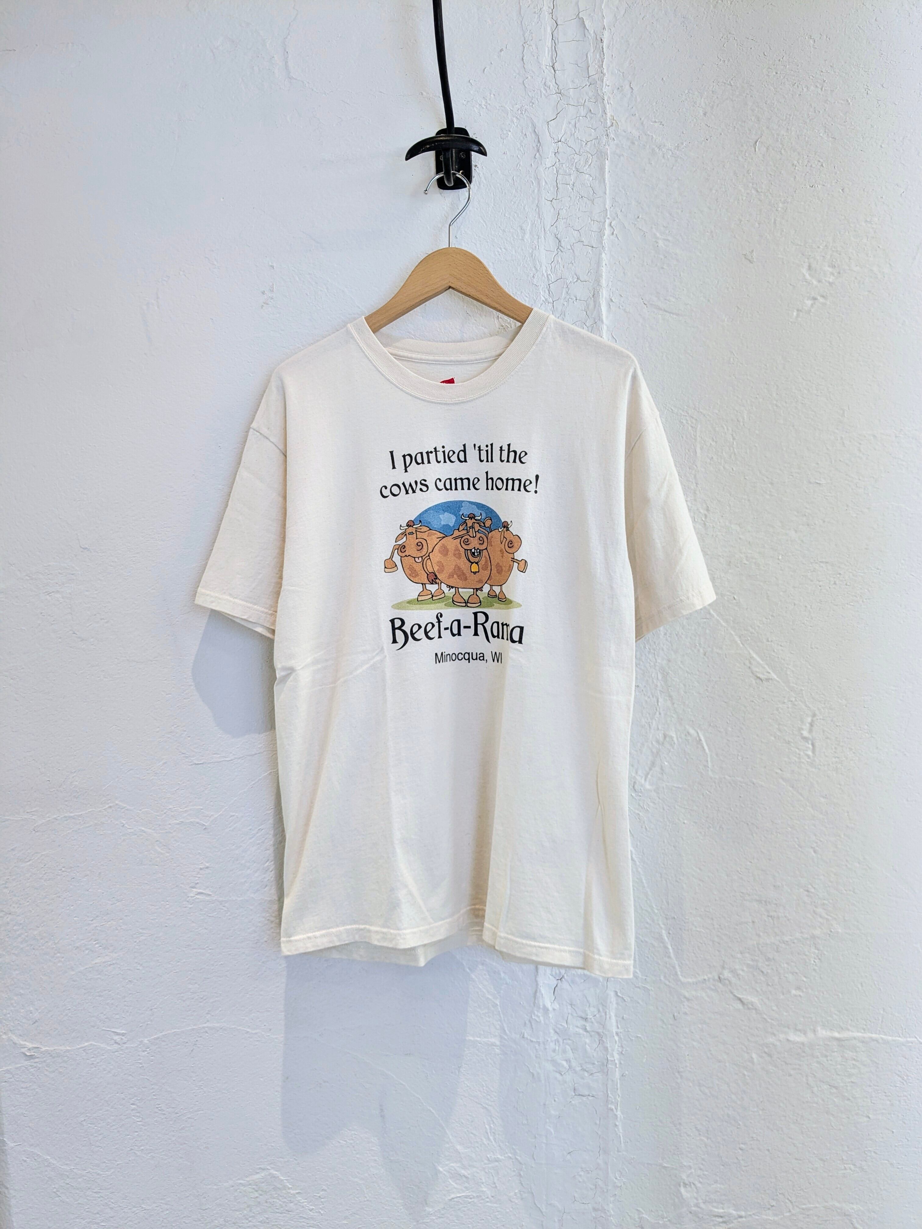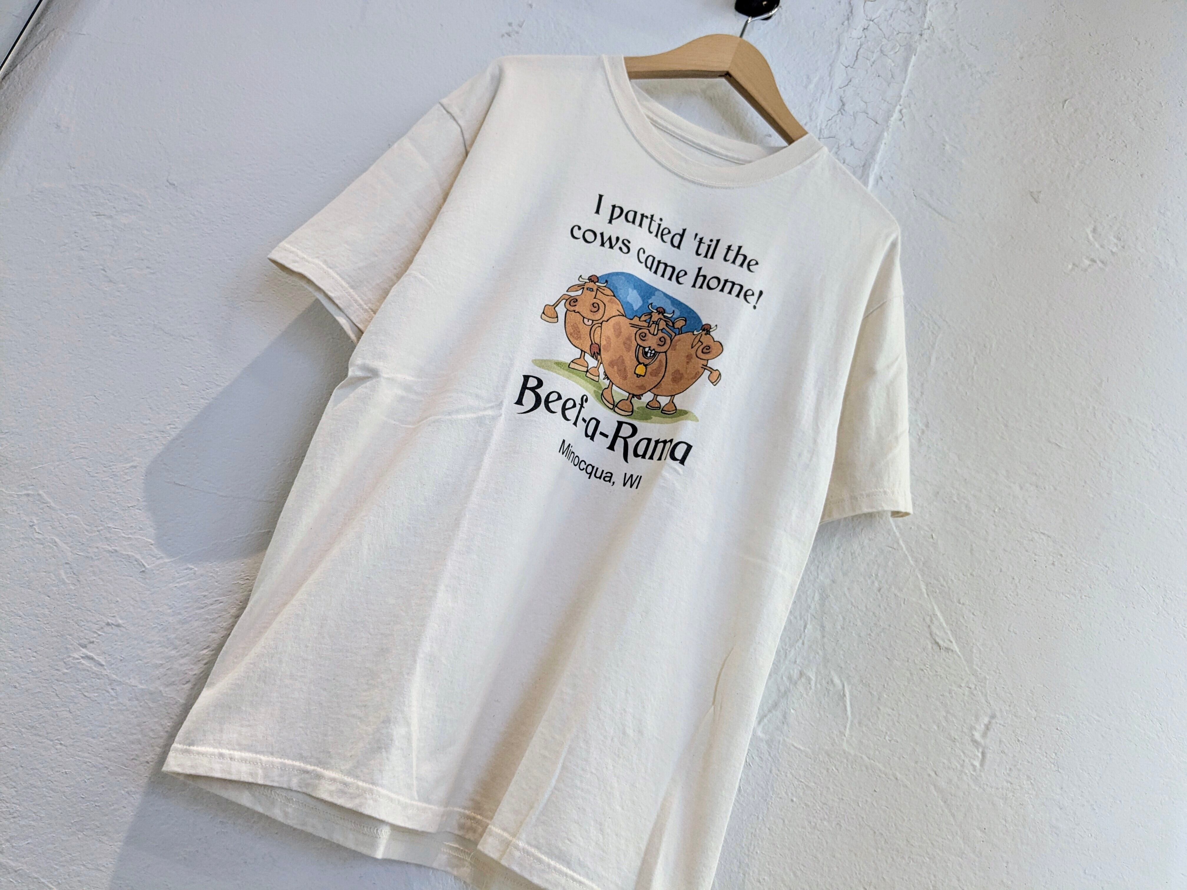 「牛が家に帰るまでパーティーしたよ!」と書いてあります。牛の絵のタッチがとても可愛い一着。ボディも生成り、オフホワイトの柔らかい色味。どこか愛嬌のあるプリントがついつい気になる、そんなアイテム。