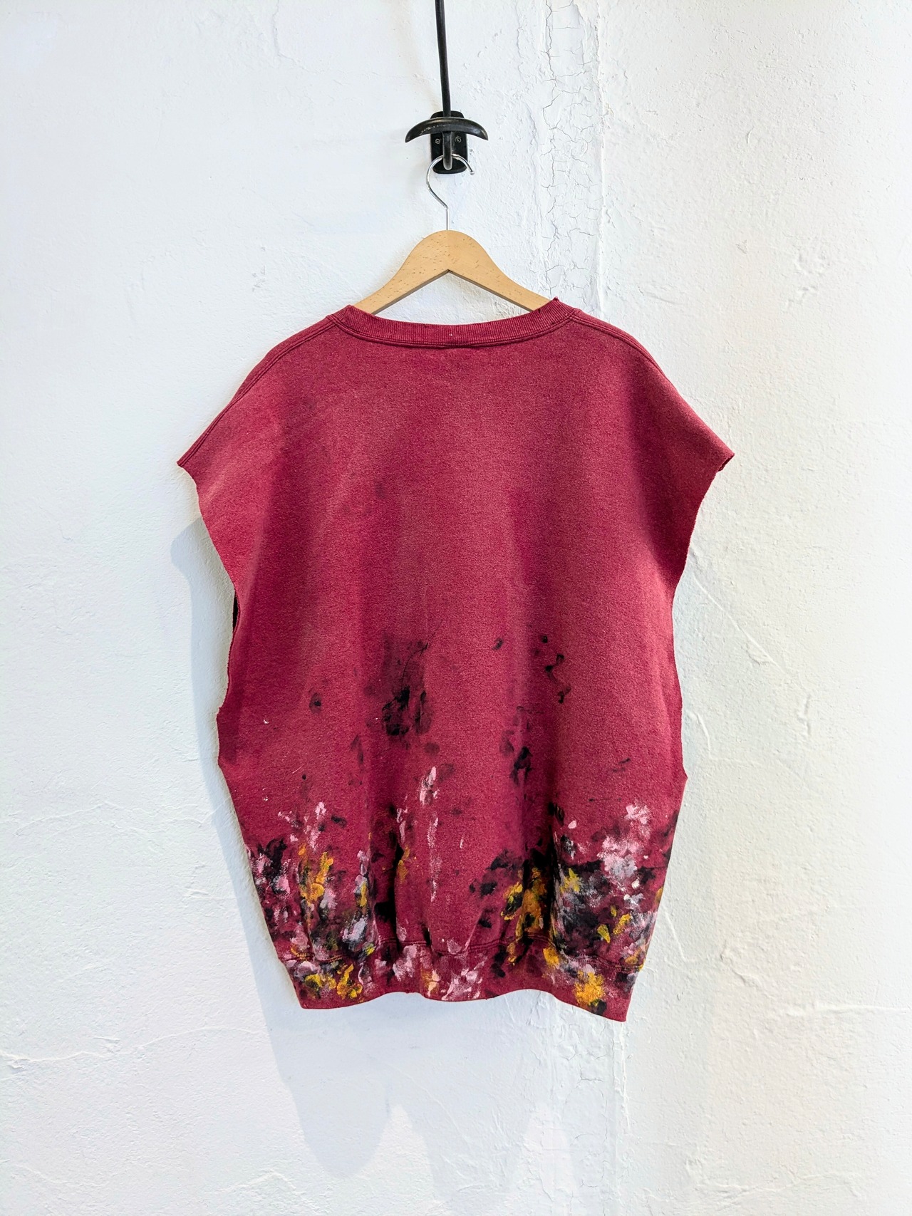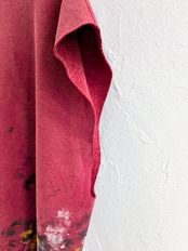 ペイント、ダメージが加えてあるアイテム。また、スリーブを切っており、ベストとなっています。腕周りはかなりゆったりめになっており、ノースリーブ、Tシャツ、シャツの上からのレイヤード以外にも、ブルゾン、ジャケットの上からでも着ていただけます。