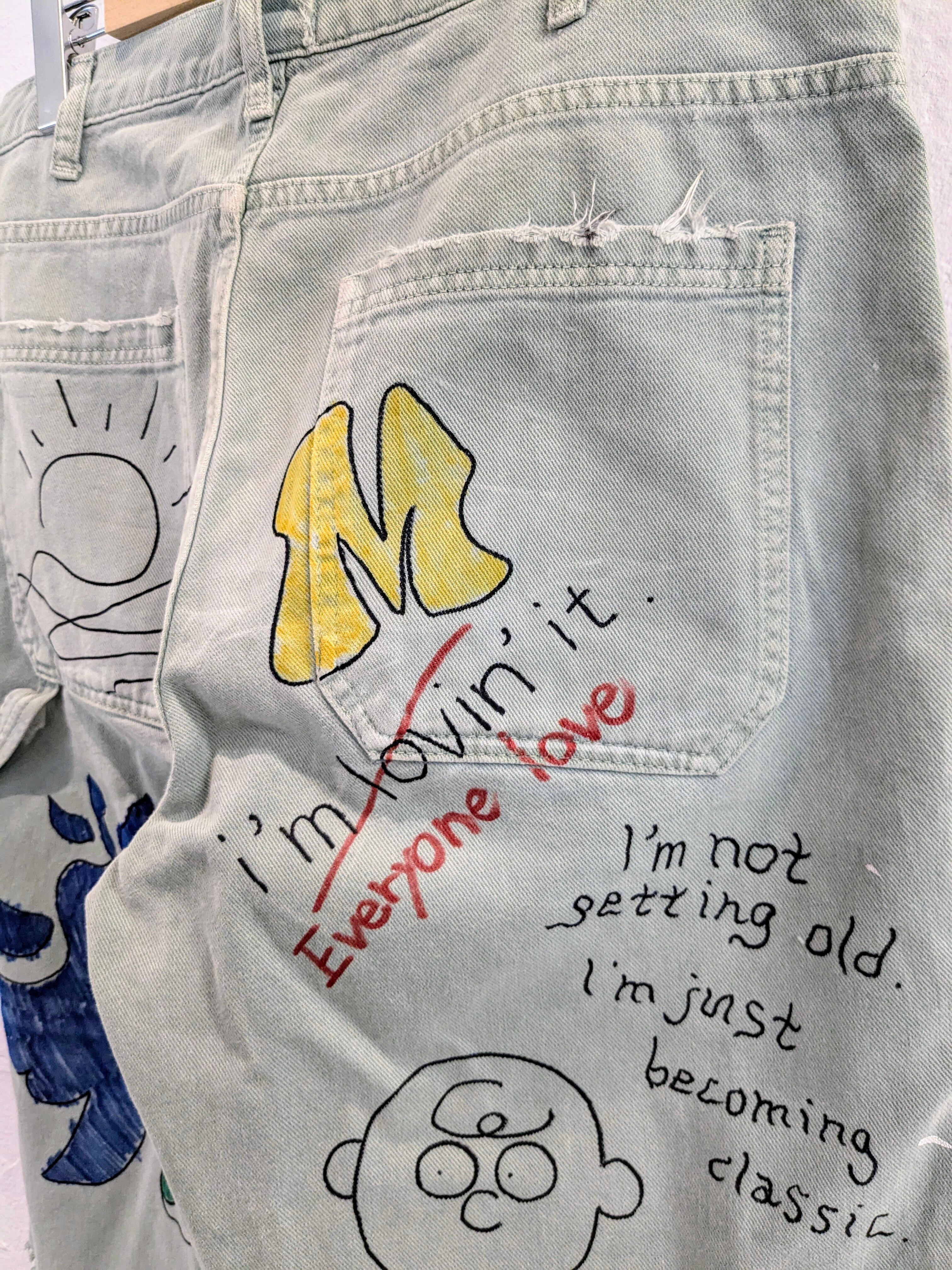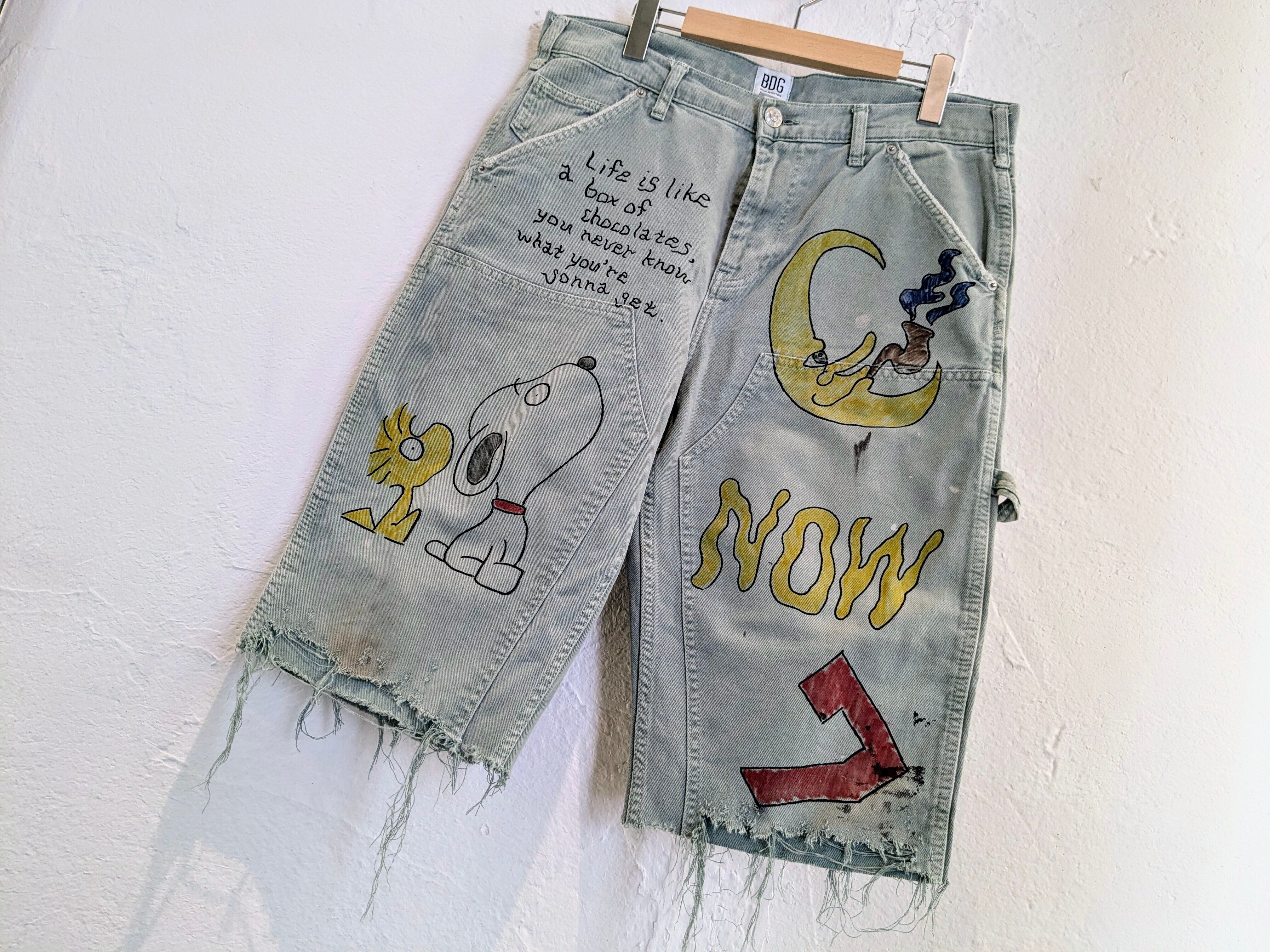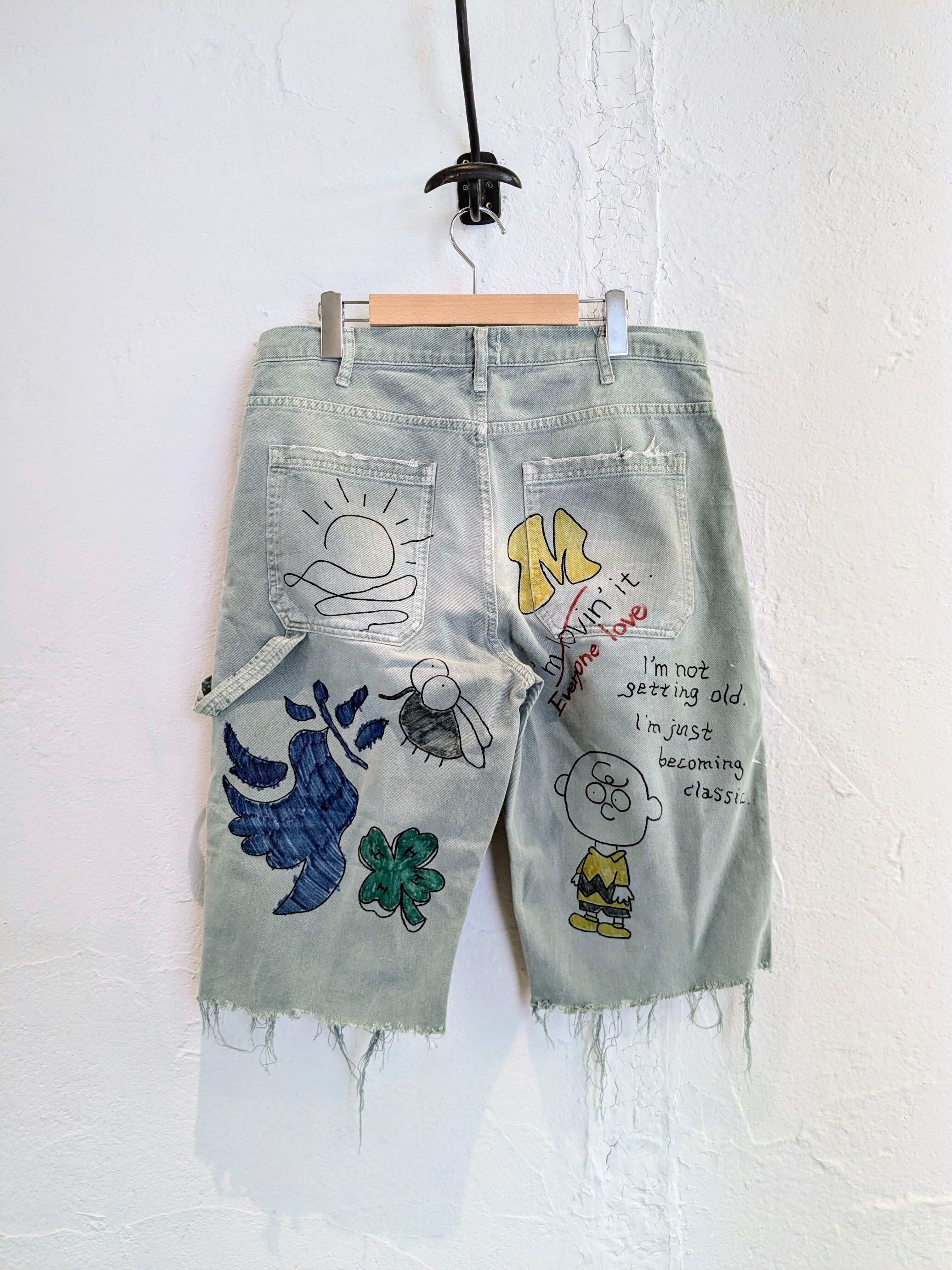 ダブルニーのショートパンツにイラストを加えております。メモリアルの要素を含み、またどこか見たことあるようなキャラクターがいたりととても可愛いアイテム。同じモノは2つと存在しない唯一無二のアイテム。元々の汚れ、ダメージあり。裾はカットオフされています。